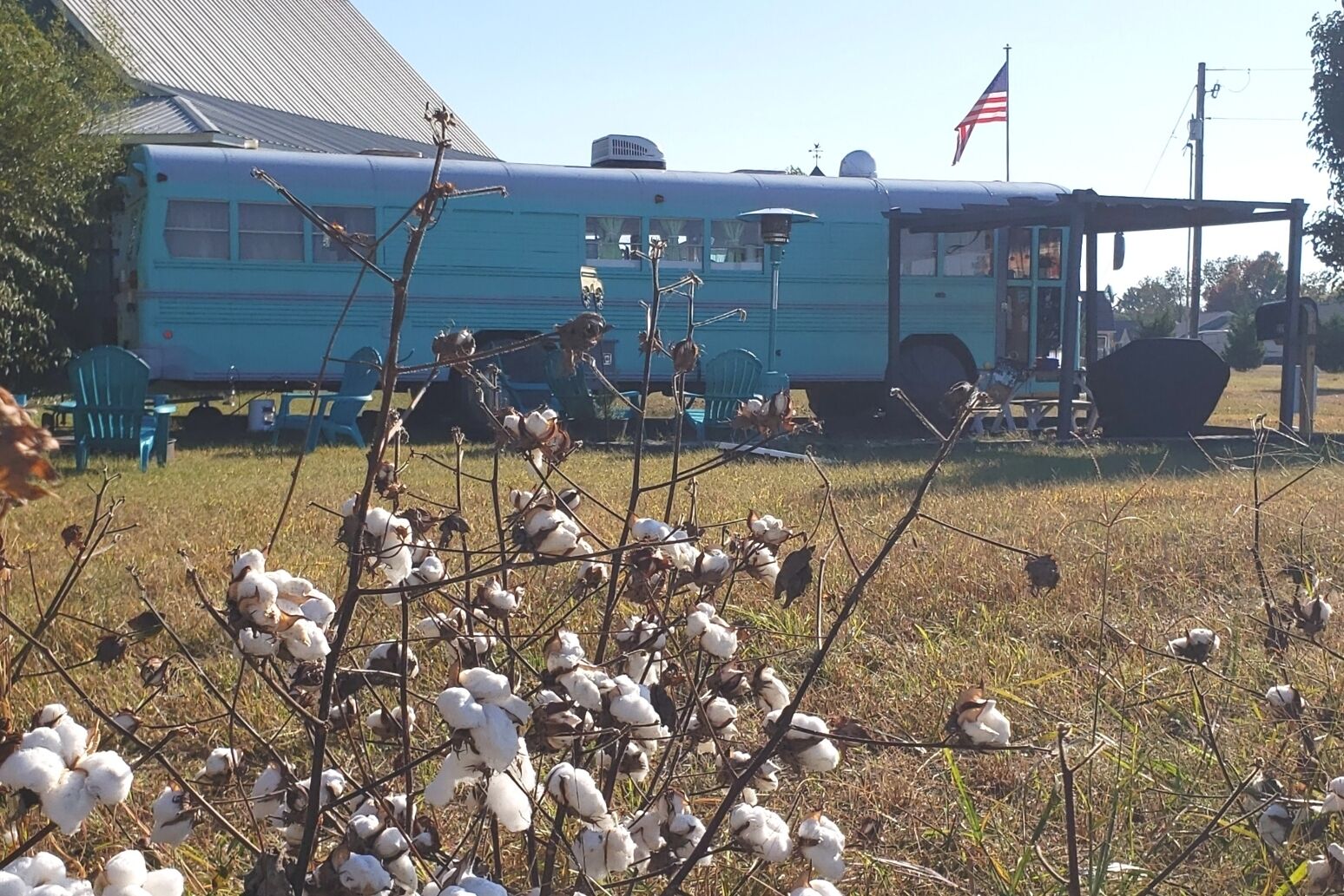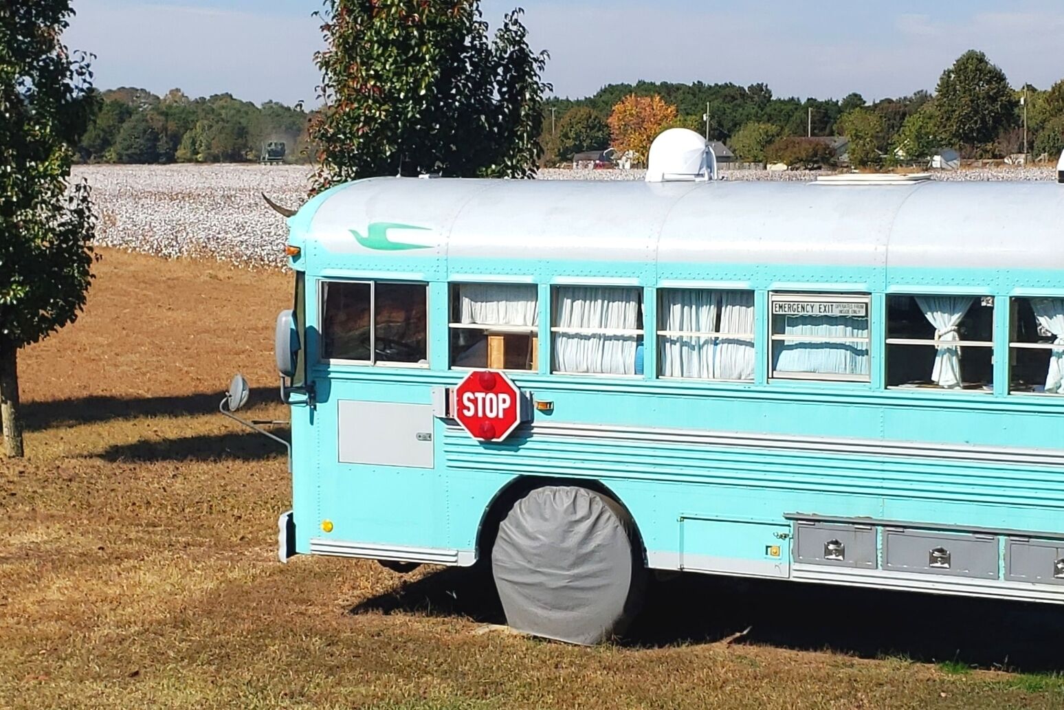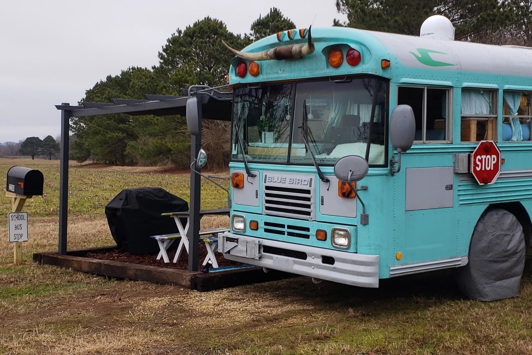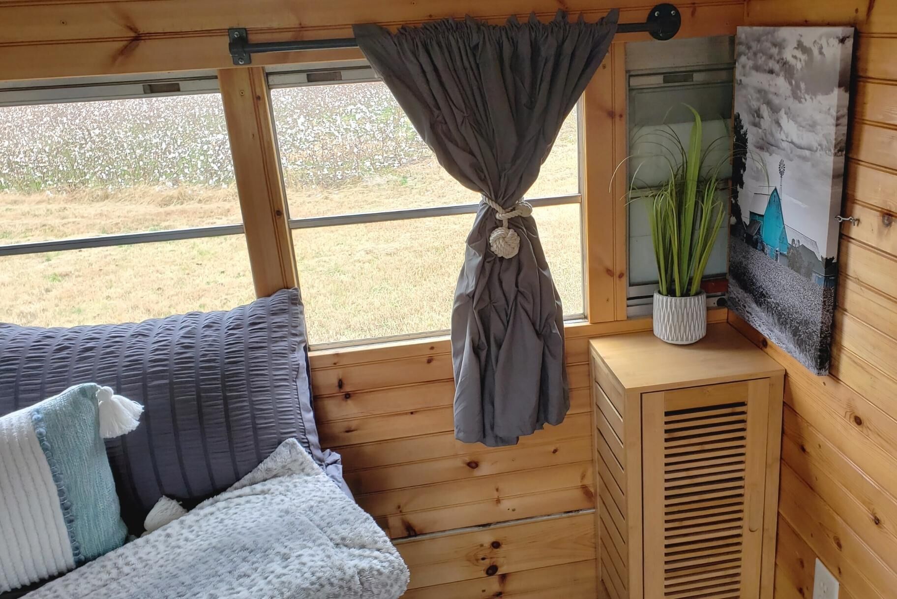 Skoolie Glamping Fleu da Coop is part of a recent revival to convert retired school buses into stylish motorhomes. These unique homes on wheels are called skoolies (or schoolies) and provide a truly unique glamping experience.Our skoolie is a 38 ft. converted 2003 Bluebird school bus and offers all of the amenities you would expect in a traditional vacation rental, but kicked up a few levels of coolness. The perfect fish camp for a guy's getaway to fish the Crappie Capital of the World, Weiss Lake. (Fish cleaning station and fish fry equipment on site too!)Enjoy farm fresh eggs delivered to your door to cook an amazing breakfast. Enjoy local honey from right here on our farm. Visit with our alpacas, emus, goats and chickens for a fun farm experience.We are on the lake, but not on deep water. (the lake is behind our house but not accessible by boat). The closest launch is less than 1 mile away on our road and we have plenty of easy and secure boat parking.SLEEPING ARRANGEMENTS:Fleu da Coop has 1 Queen memory foam bed in the back with 1 twin memory foam bed in the cabin and 1 twin memory foam bed that doubles as a couch. (Sleeps a total of 4 max). There is a TV in the queen bedroom with two small nightstands with shelves, lights, plugs/usb ports.COOKING ARRANGEMENTS:The kitchen has a 2 burner RV size propane stove top. There is also a gas grill with side burner on the patio. Need to clean those fish you caught on Weiss Lake? There is also a fish cleaning station available to guests on property. The kitchen holds a wine refrigerator and a hotel size refrigerator/freezer combo. Small appliances on board include a microwave, coffee pot, tea kettle, mixer, and all the pots/pans, cooking utensils, dishes and glassware needed to do basic cooking.BATH ARRANGEMENTS:Space is a premium on a school bus, so the bathroom is where you take it from. Fleu da Coop's bathroom is built around the school bus wheel well. This creative use of space makes for a very tight entrance, but a full stand up shower. There is a lav sink on the wall to brush your teeth and wash your face. The toilet is a standard household model and sits up on the wheel well. (We only mention this because some skoolies have composting toilets. This one does not.) Reality: if you're big on luxury bathrooms, this skoolie is not that.TV & INTERNET SITUATIONOur skoolie has one large TV in the main cabin and another small TV in the queen bedroom. Both Smart TV's have YouTube TV Premium and get all the live channels including local stations, comparable to Dish 200 package. The farm has internet with Weiss Internet and gets the best service possible for our rural area.OUTDOOR LIVING SPACEIn addition to sitting on a 23 acre farm, Fleu da Coop has it's own patio area just outside the bus. The space includes a picnic table, large outdoor space heater for those chillier evenings, a gas grill with side burner, firepit area with Adirondack chairs and a canopy covered seating area. You are free to explore our 23 acre farm anywhere outside the gates that enclose our personal living spaces and barn.SECURITYWe are on property 24/7 for any concerns. You will also have a unique code for your entry to the bus via keypad. There is a safe inside the bus to secure your valuables.When booking, please keep in mind that it is a converted school bus so it is 6'2" high for head room and 7.5 feet wide. There are also steps to climb when entering the school bus and the bathroom/shower. This is a "glamping" experience and there is a picnic table, grill, seating and firepit for outdoor relaxing.