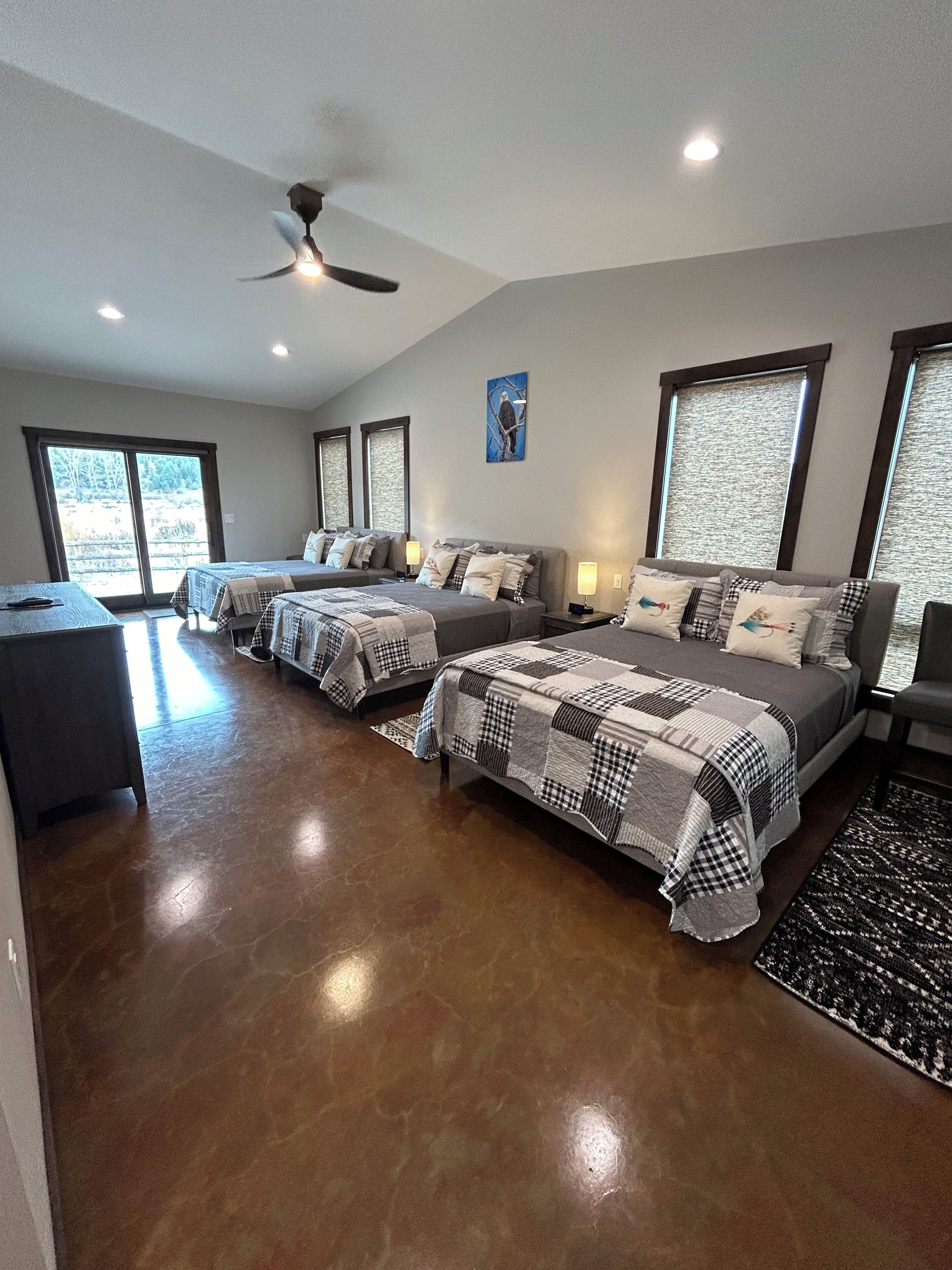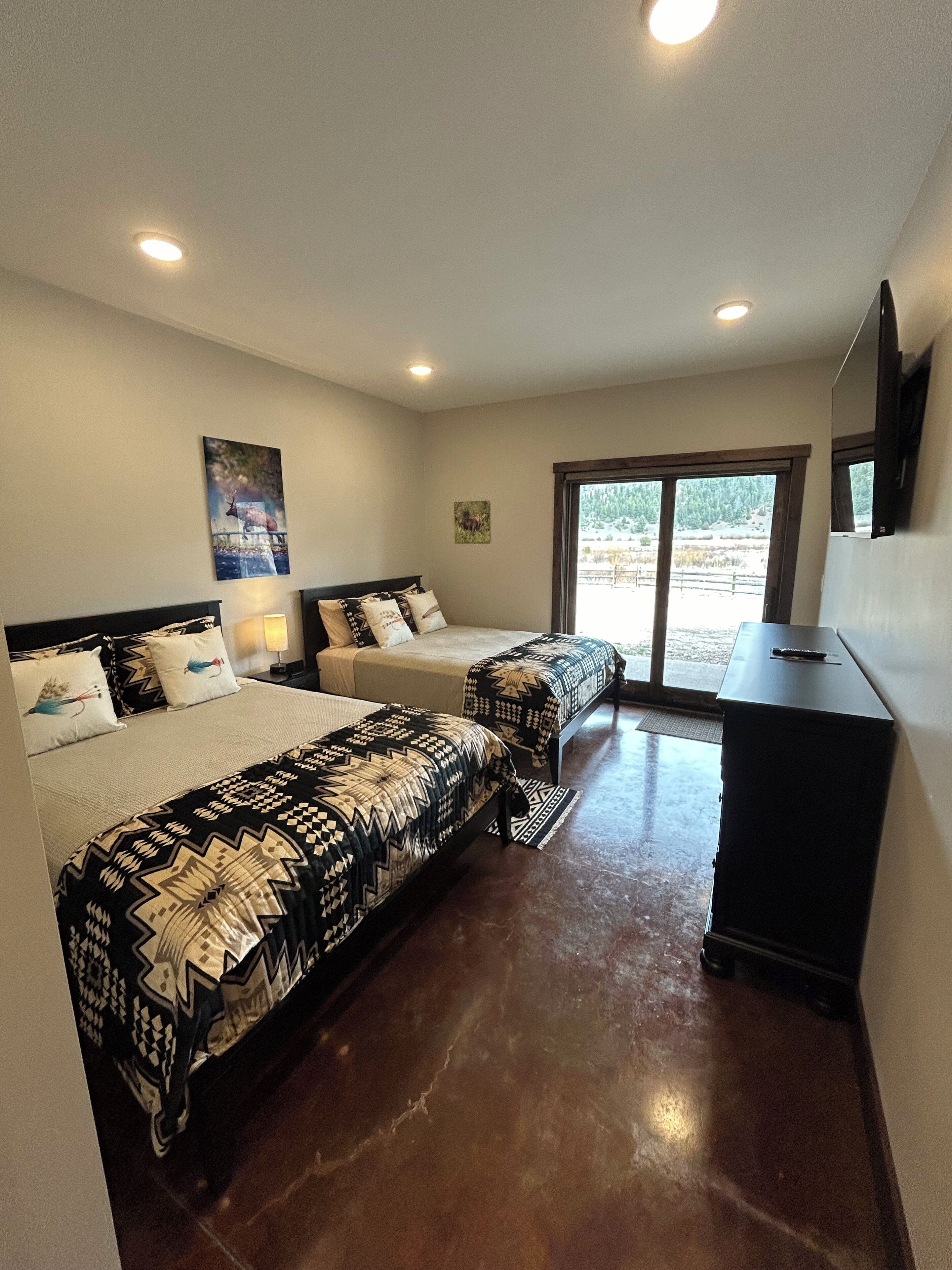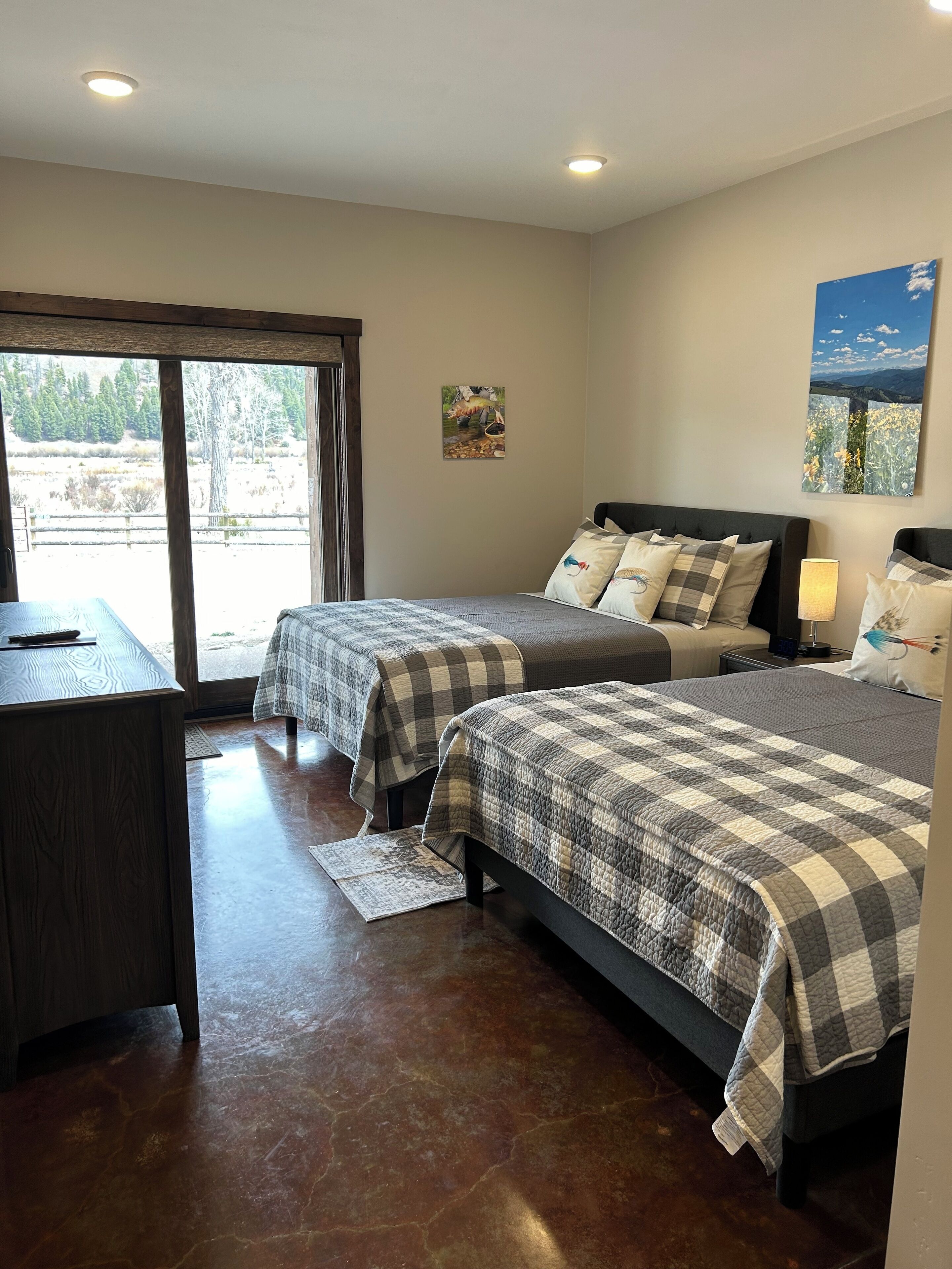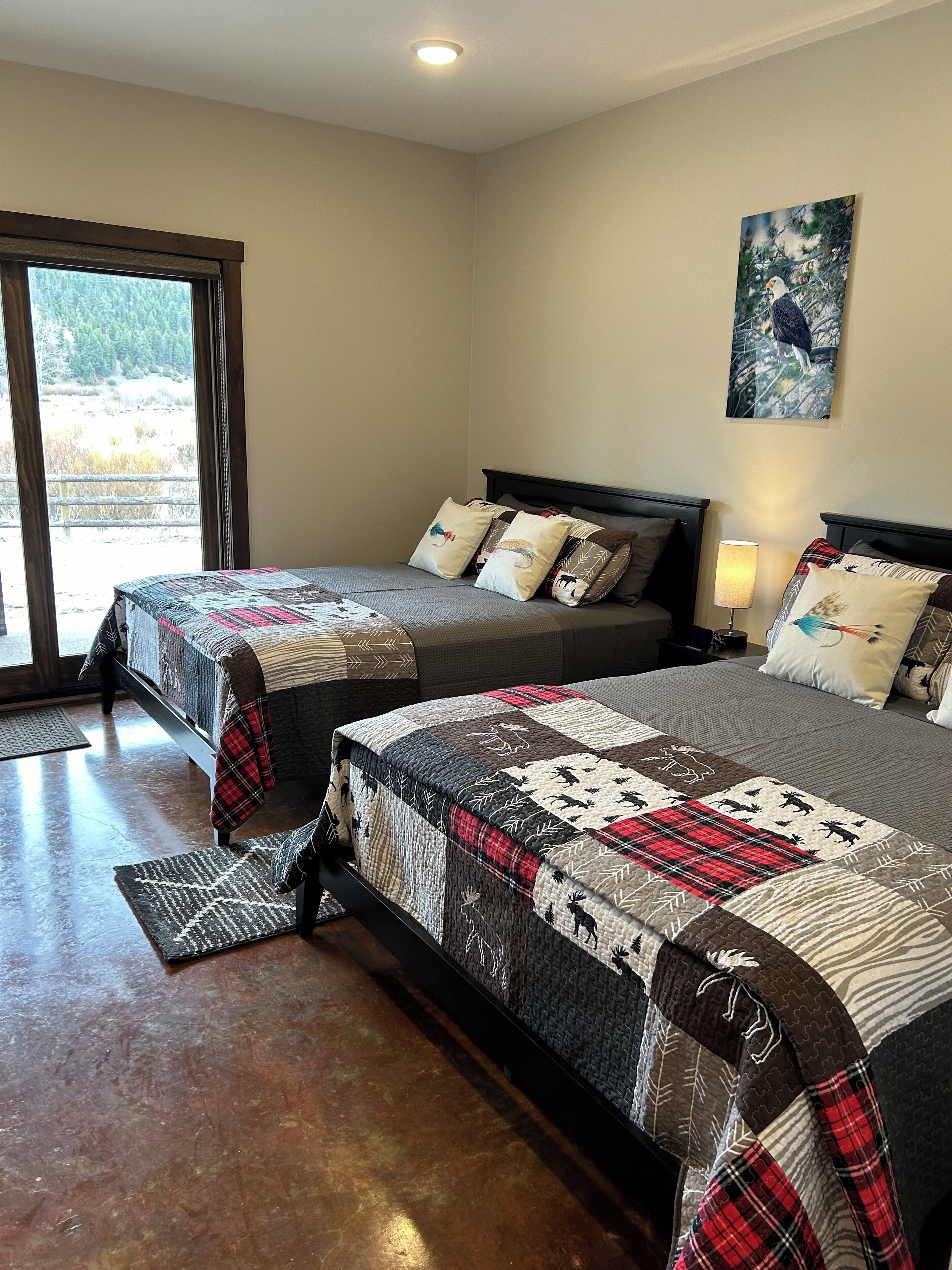 Trout House, sitting on the banks of Rock Creek, is brand new as of 2024! Stay comfortably on Rock Creek at this lovely ranch style house! This quaint property offers a cozy and marvelous retreat for guests. Trout House is brand new as of summer of 2024! It resides on the banks of Rock Creek upstream from our other cabins by several miles. Trout House is our biggest place with four bedrooms and four bathrooms. There are a total of 9 queen beds. We went all out on this incredible house and are getting excellent feedback from our first few guests that we've had. Lots of big windows on both sides of the house because wherever you look out, the views are amazing! Large kitchen and bar area for big groups. Open living room with a gas fireplace. Infloor heat, WiFi, TVs in the living room and all four of the bedrooms. Each bedroom has its own sliding door to go outside to the patio area and creek. Living room and Patio speakers for playing music. Really cool Butler's Pantry for storing all your extra things, plus it has another sink, refrigerator, and the washer and dryer. Covered seating in the front and back of the house. Beautiful landscaped yard with trees and shrubs, and concrete patios and sidewalks. Whether you're here to exploring the charming little town of Philipsburg, or here to Trout fish, or simply relaxing, this house is a great place to call homebase while you're away. We hope you enjoy your stay.