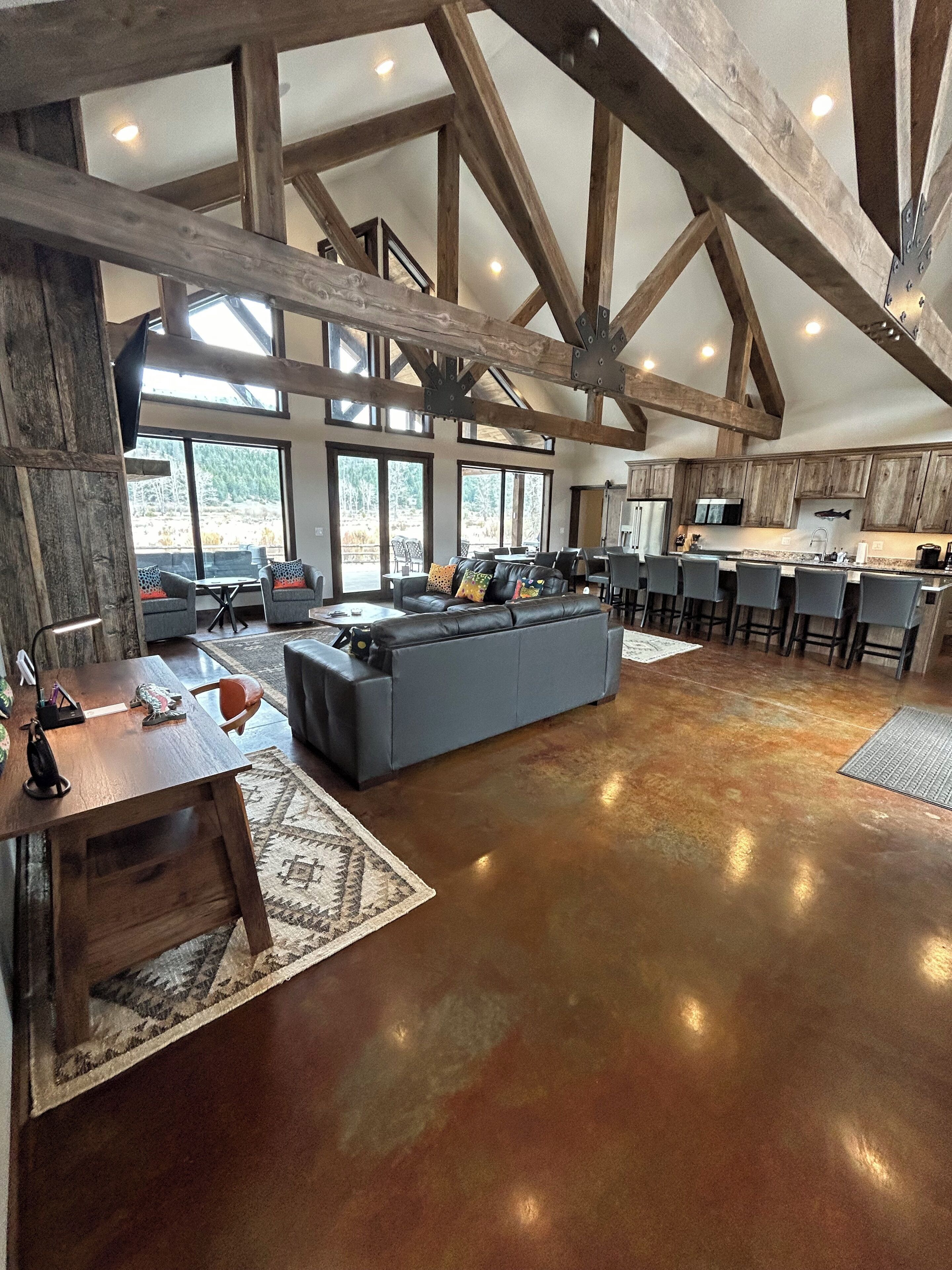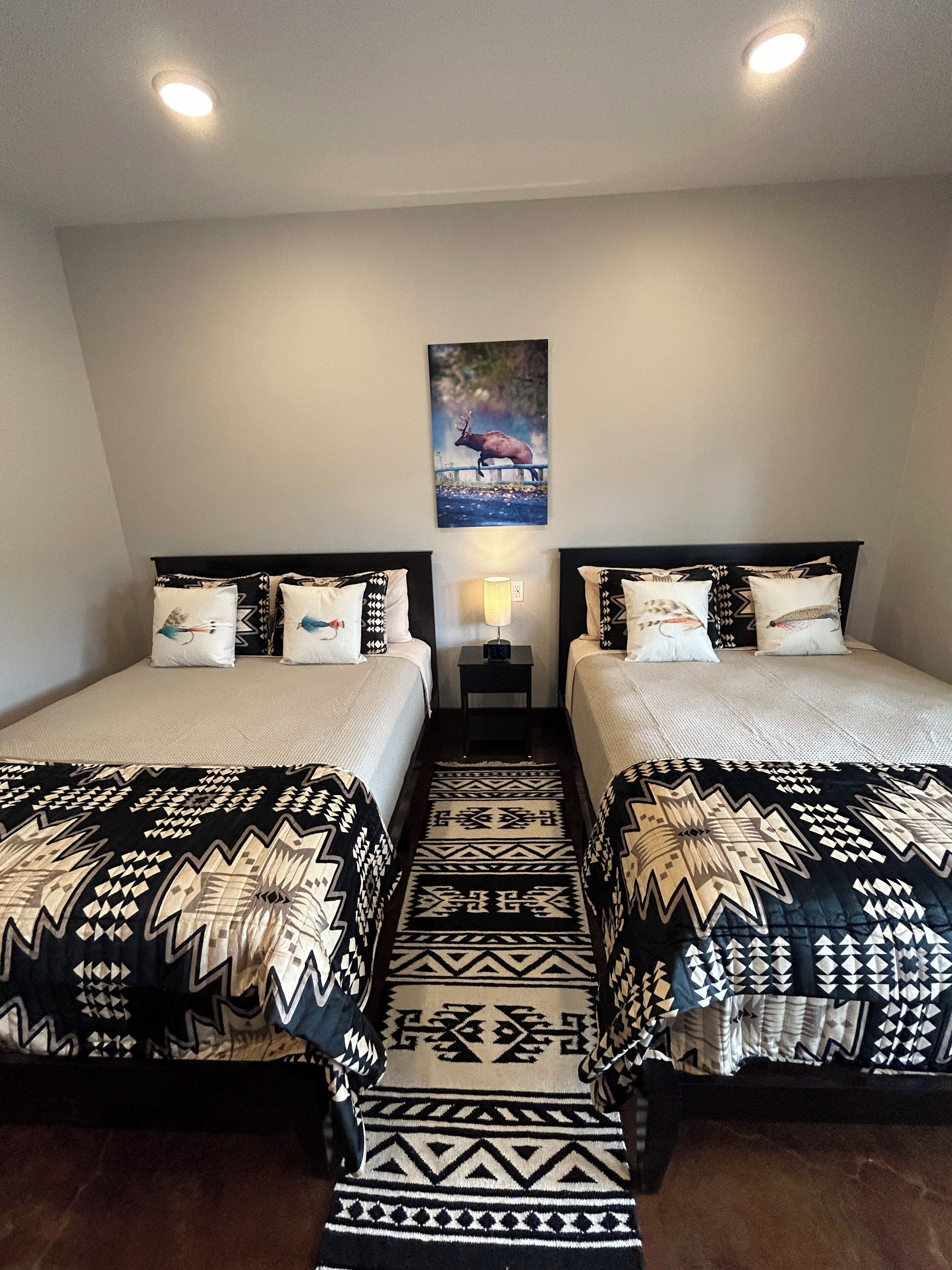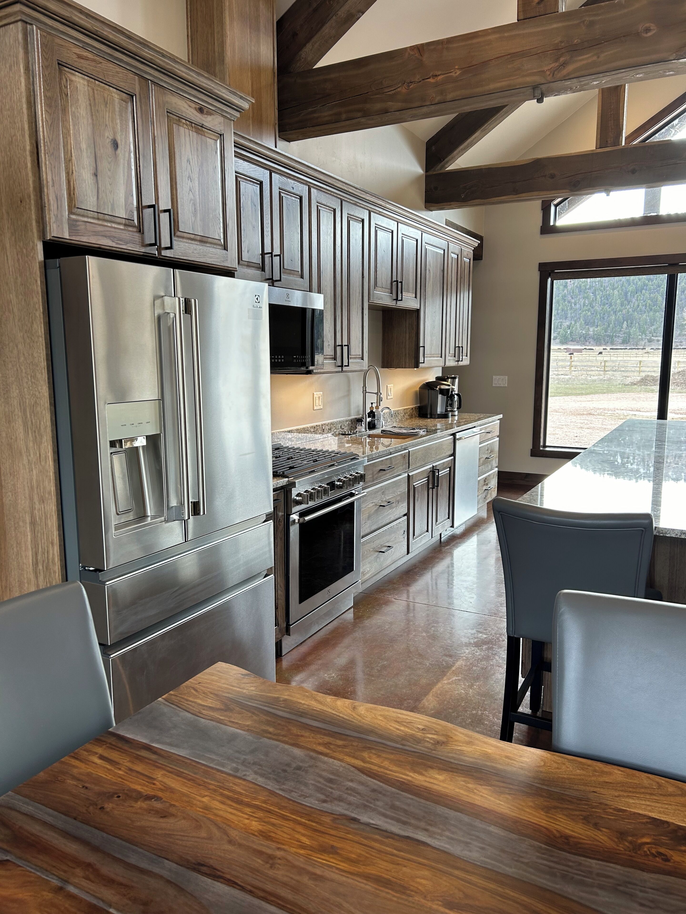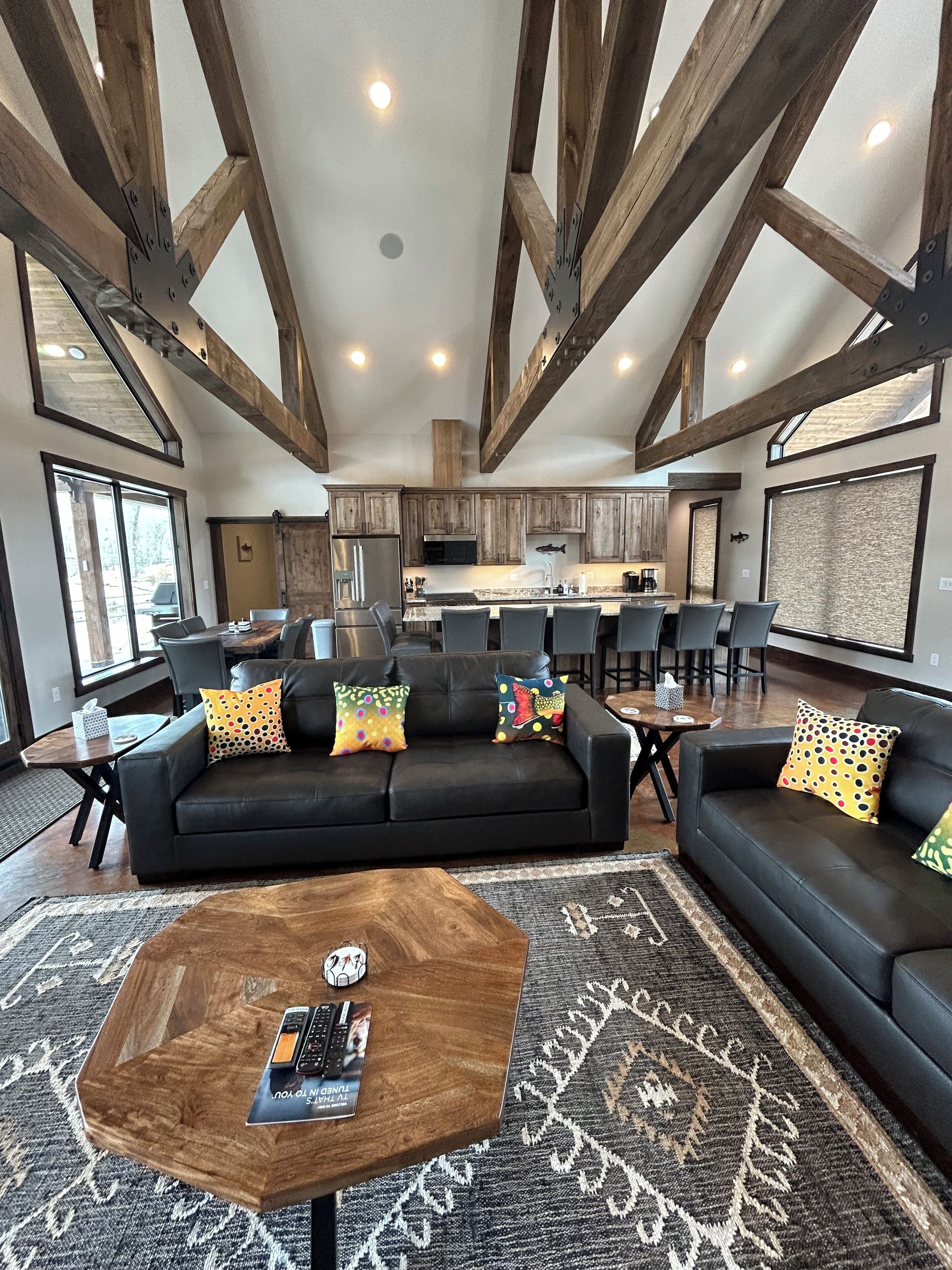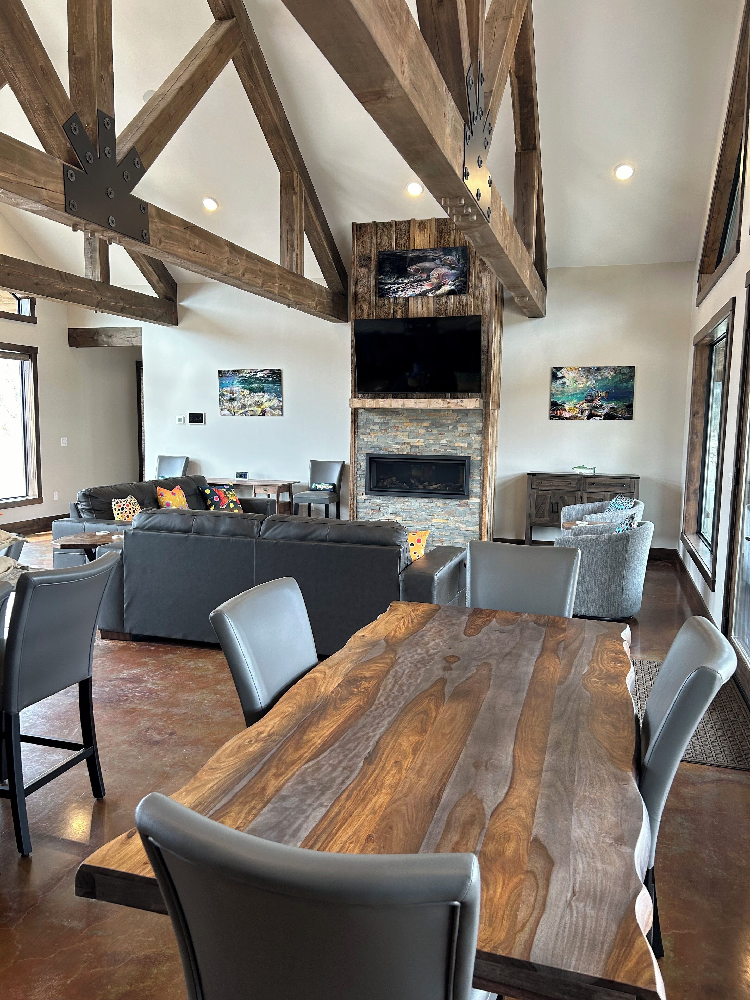 Trout House, sitting on the banks of Rock Creek, is brand new as of 2024! Stay comfortably on Rock Creek at this lovely ranch style house! This quaint property offers a cozy and marvelous retreat for guests. Trout House is brand new as of summer of 2024! It resides on the banks of Rock Creek upstream from our other cabins by several miles. Trout House is our biggest place with four bedrooms and four bathrooms. There are a total of 9 queen beds. We went all out on this incredible house and are getting excellent feedback from our first few guests that we've had. Lots of big windows on both sides of the house because wherever you look out, the views are amazing! Large kitchen and bar area for big groups. Open living room with a gas fireplace. Infloor heat, WiFi, TVs in the living room and all four of the bedrooms. Each bedroom has its own sliding door to go outside to the patio area and creek. Living room and Patio speakers for playing music. Really cool Butler's Pantry for storing all your extra things, plus it has another sink, refrigerator, and the washer and dryer. Covered seating in the front and back of the house. Beautiful landscaped yard with trees and shrubs, and concrete patios and sidewalks. Whether you're here to exploring the charming little town of Philipsburg, or here to Trout fish, or simply relaxing, this house is a great place to call homebase while you're away. We hope you enjoy your stay.