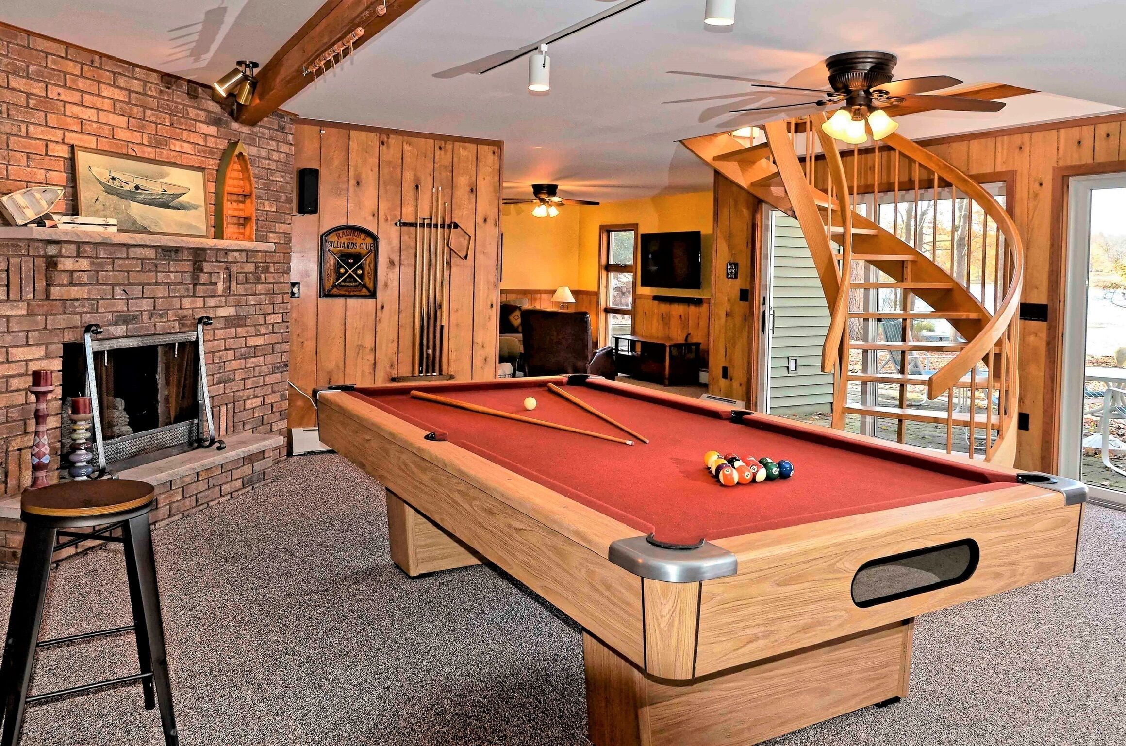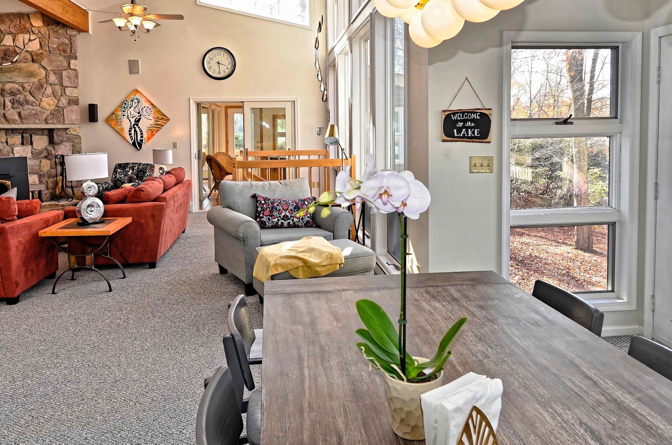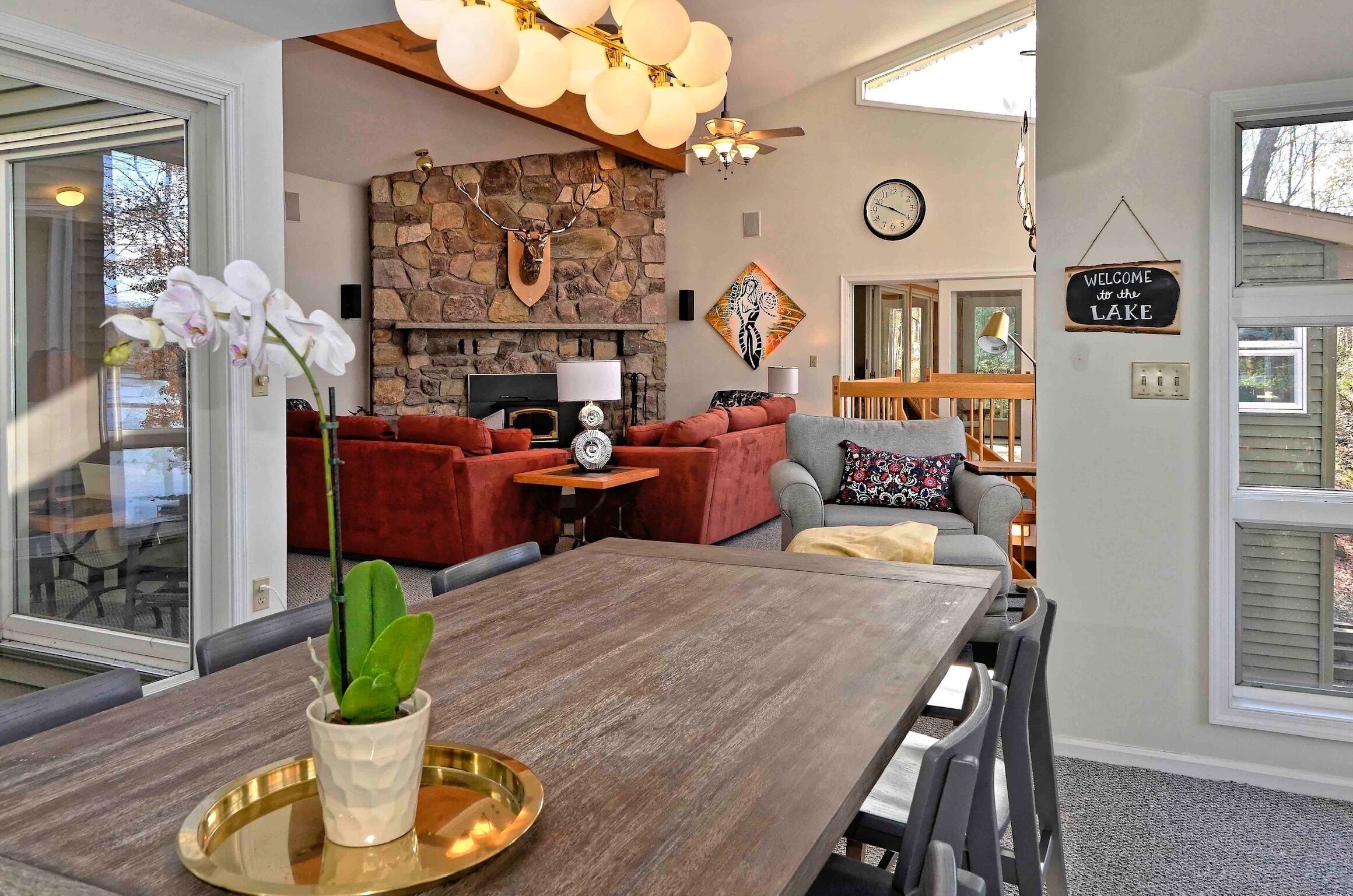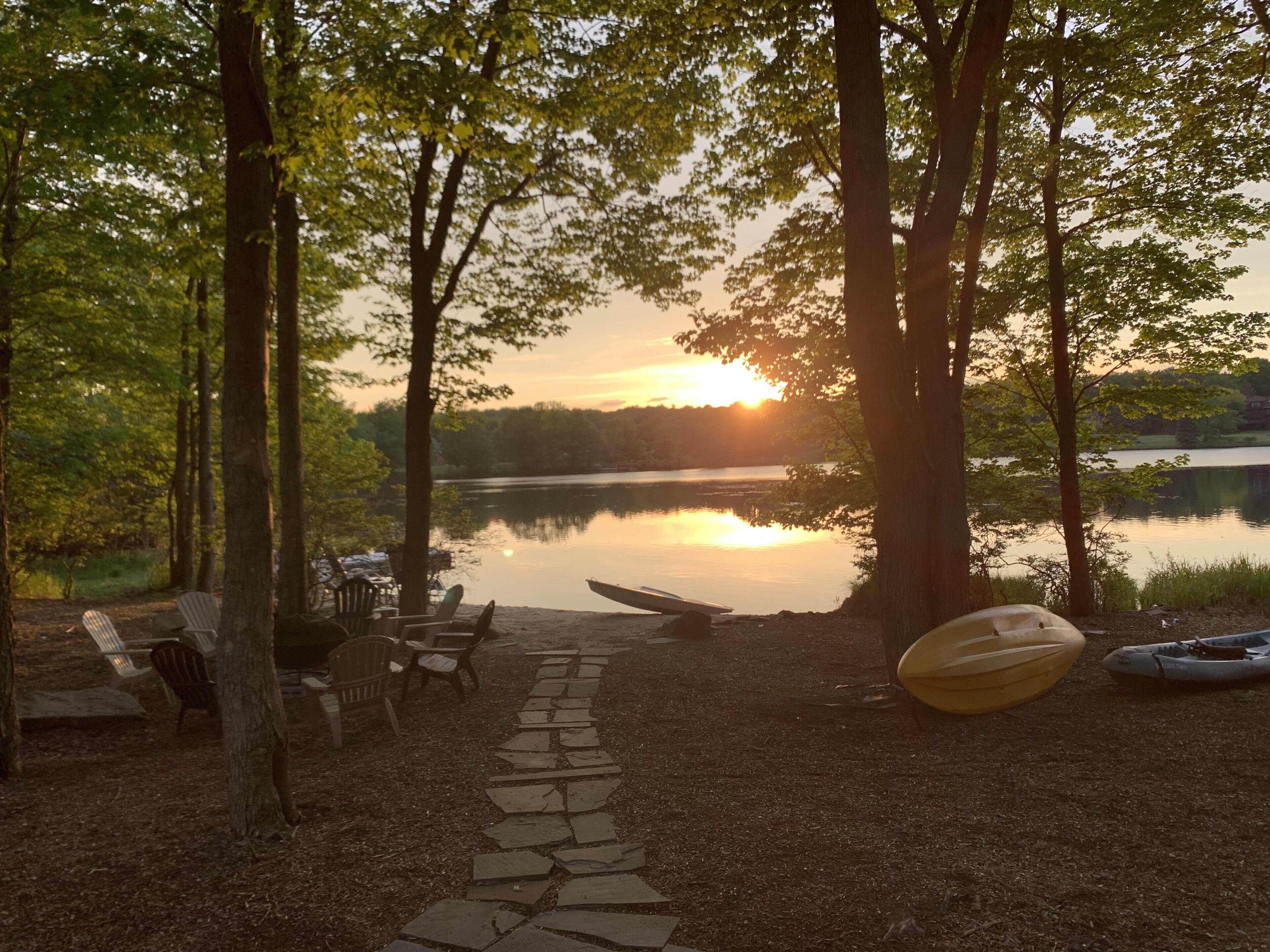 Lake Front in Poconos: Hot Tub / Sauna / Game Room / Kayaks / Private Beach Larsen Lake House- Enjoy your stay in this custom built lakefront home, including 5 comfortable bedrooms and 4 full bathrooms with something for everyone: kayaks, paddle boat, hot tub, sauna, pool table, shuffle board table, ping pong, house-wide Sonos system and large screen Smart TV with Apple TV. Take in extraordinary views from the vaulted living room with floor to ceiling windows overlooking the private dock and beach. Each floor is flooded with light by sky lights and a 2 story glass atrium & waterfall.Located in the premier community of Big Bass Lake, Larsen Lake House is situated on a quiet cul-de-sac with breathtaking views of the lake. The house features an exclusive art collection curated by NYC artist @GDMArt. The game room includes gas fireplace, pool table, shuffle board, wet bar and a room exclusively reserved for family ping pong tournaments. Bedrooms combine luxurious mattresses with non-allergen duvets and pillows for a restful night's sleep. All linens have been chosen with care (for comfort) and are provided for all guests, including beach towels. If you wish to do laundry during your stay, washer, dryer, detergent, iron and ironing board are all included.If you’re looking for an active day, try out our kayaks, paddle board, and pedal boat. If you love to fish, we have a rowboat with electric outboard motor that’s perfect for a leisurely day on the water. If all you want to do is relax, take in the scenery from our private beach steps away from the back door. We even have your morning exercise routine covered – take a morning run on the treadmill overlooking the lake or grab a yoga mat and head out to the dock for your sunrise practice.The spacious kitchen boasts two dishwashers, two full-size ovens, prep sink, loads of counter space and ample pantry. In addition to the the refrigerator in the kitchen, there is an also a full-size refrigerator in the game room wet bar. To learn more about the property contact us or find us on other platforms.