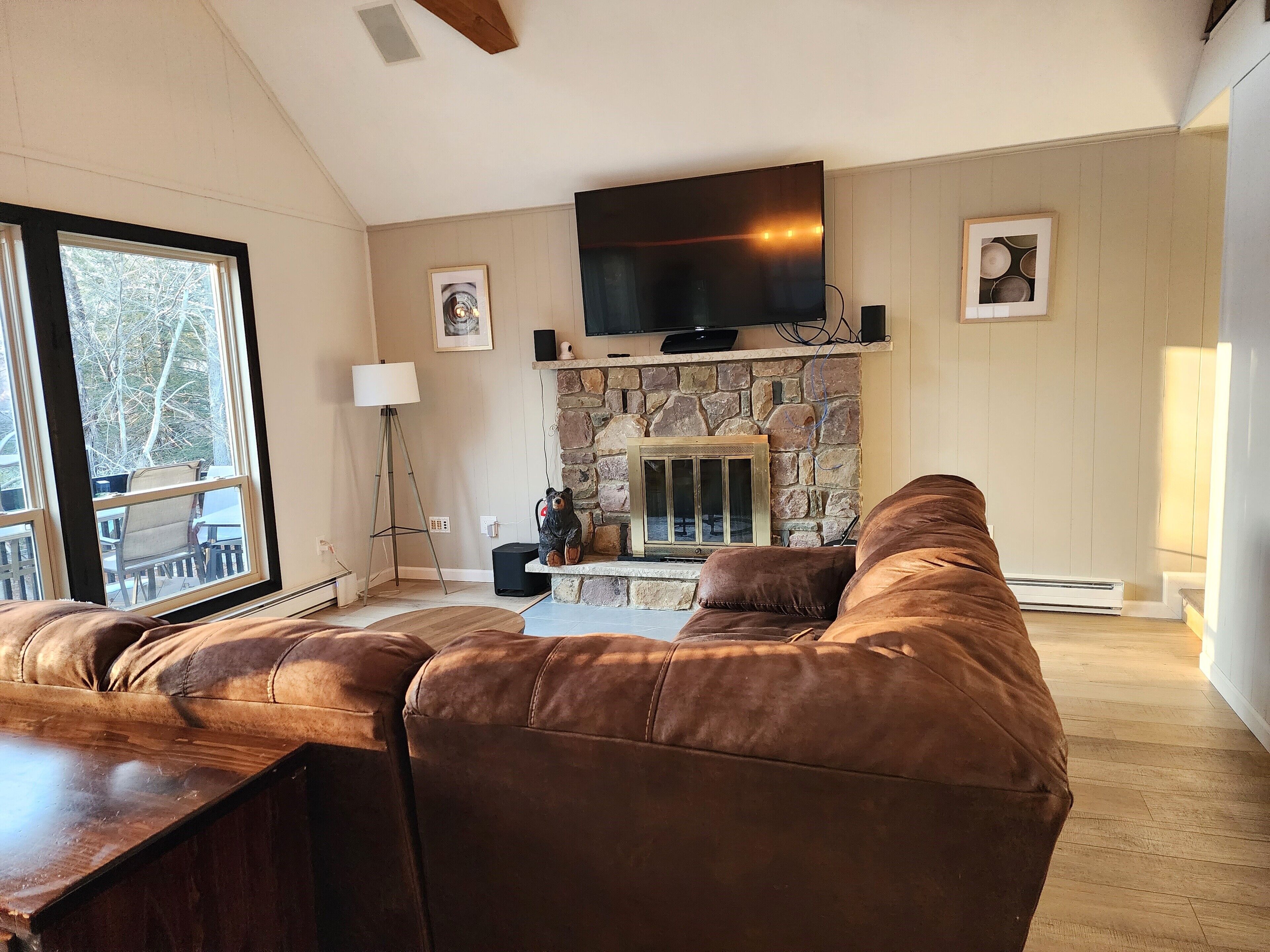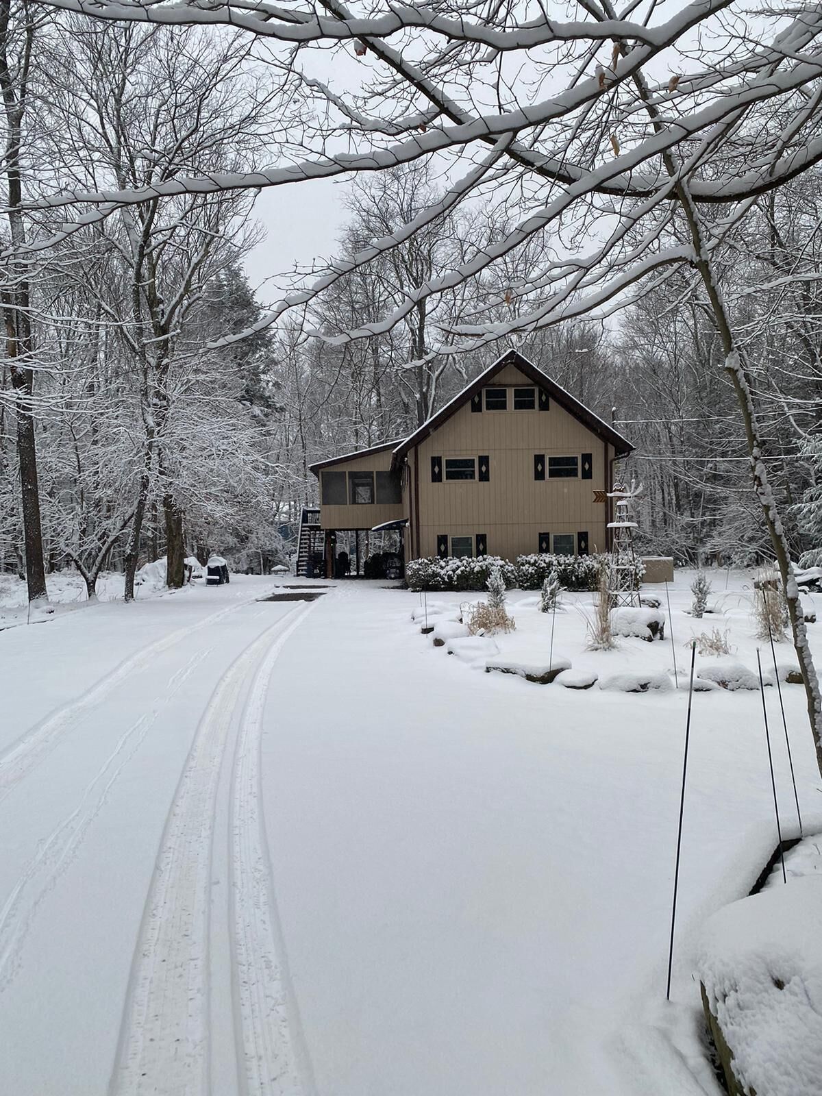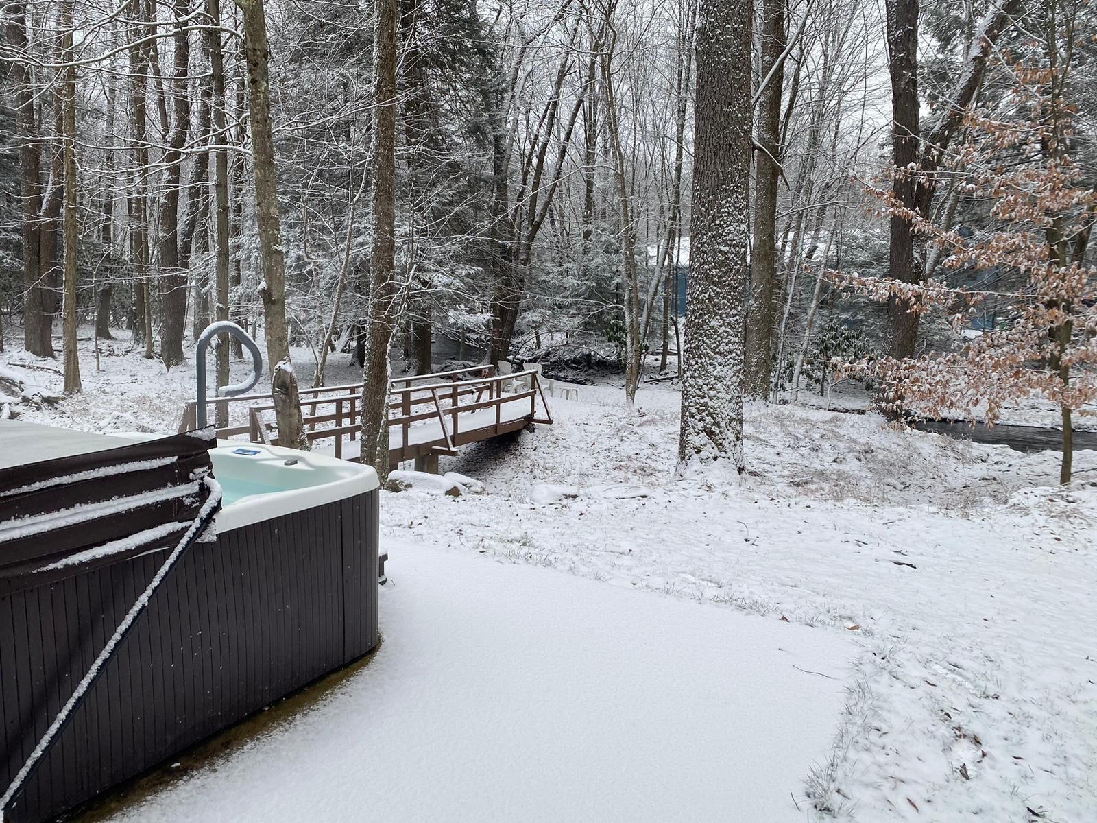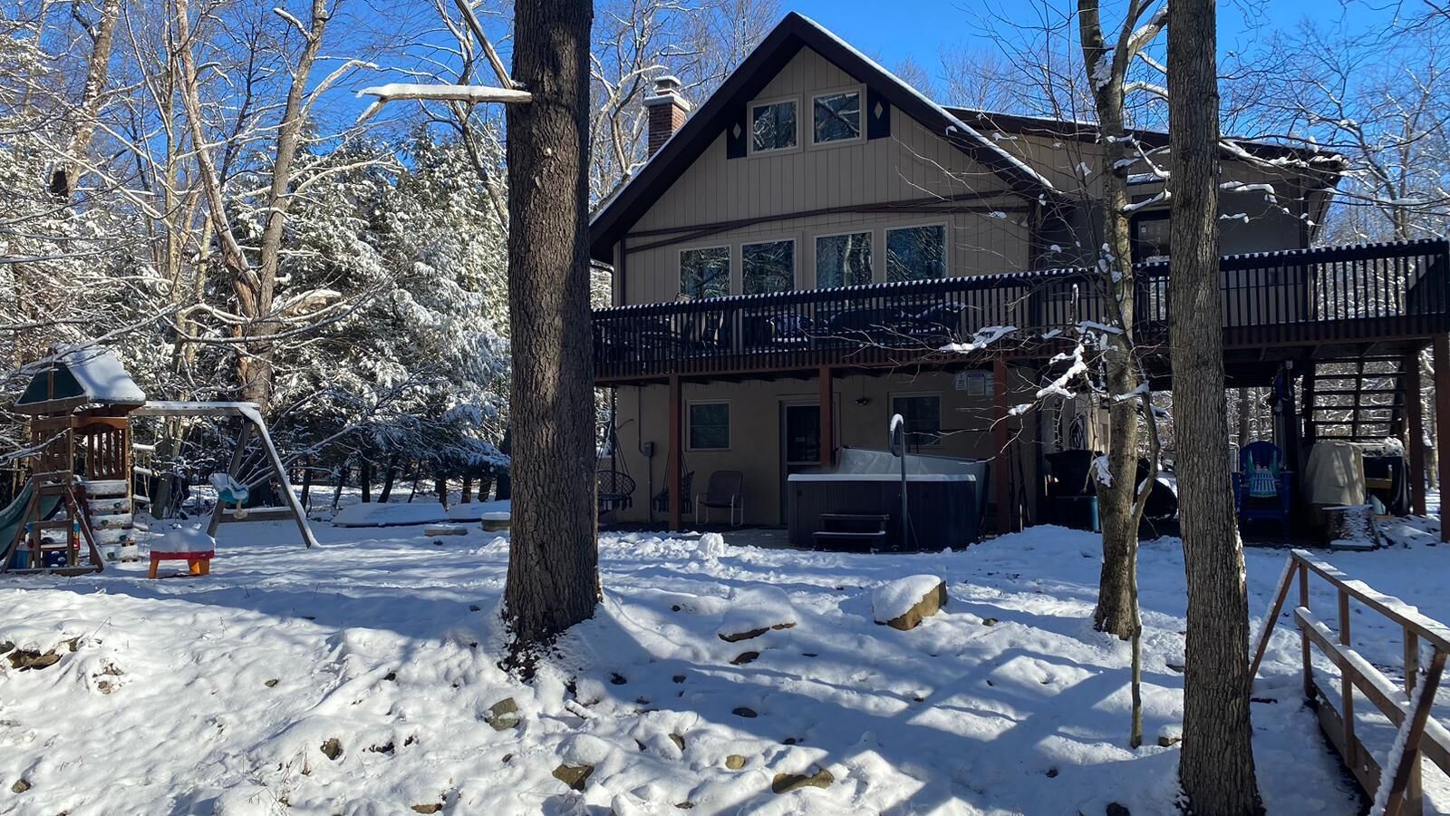 Cozy Chalet with hot tub & Lehigh River in backyard BigBass Lake Pocono Mountain Cozy, spacious and inviting chalet house facing the woods in Pocono PA in Big Bass Lake gated community (2000 sq. ft). Beginning of Lehigh River running through the backyard.While this house can accommodate up to 14 people comfortably, community allows max 12. Includes swing set in the backyard.Located 25 minutes away from Camelback ski and water park, Mount Airy Casino Resort and 15 min from Kalahari Water resorts. Big Boulder and Jack Frost mountains are just 35 minutes away.Screen room with dining table, wood burning fireplace.Bicycles may be provided upon acceptance of the use terms.Please note, that due to Corona virus regulations, community amenities may have additional restrictions. Please also make sure to check PA travel restrictions and requirements before you go.New for VRBO, however we are a Superhost with a lot of rentals and a 5 star feedback at Airbnb.
