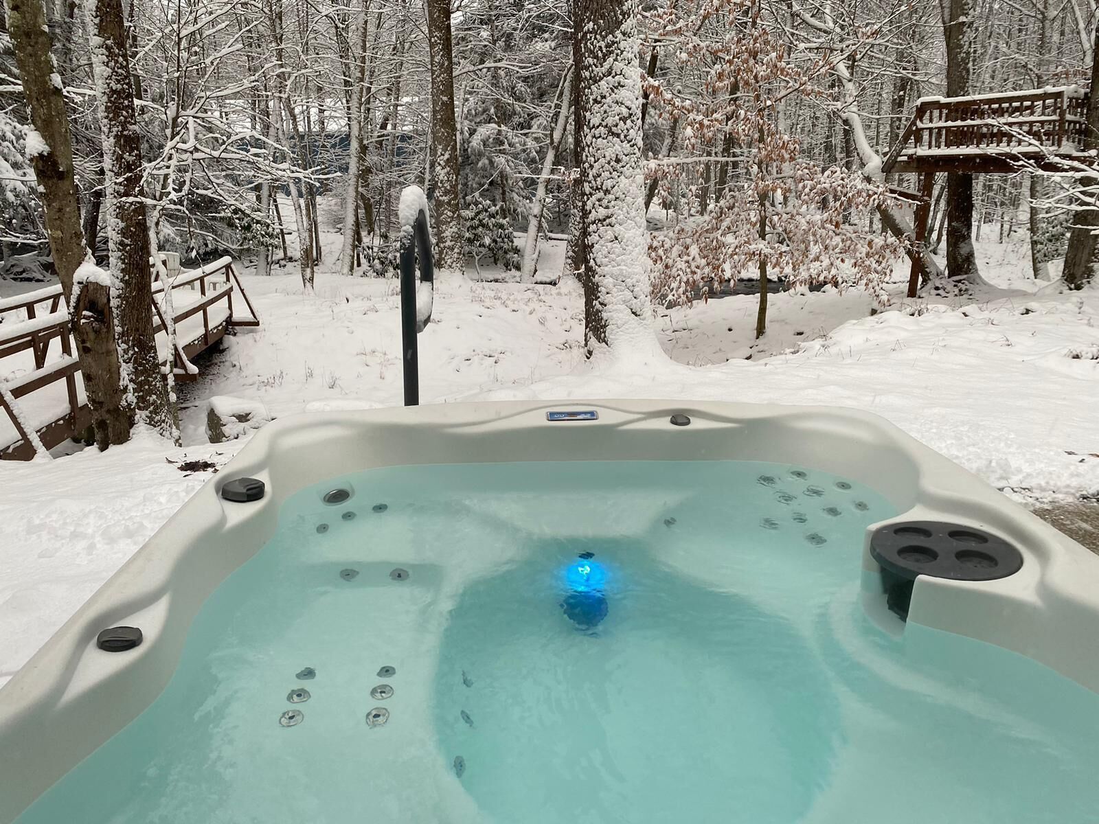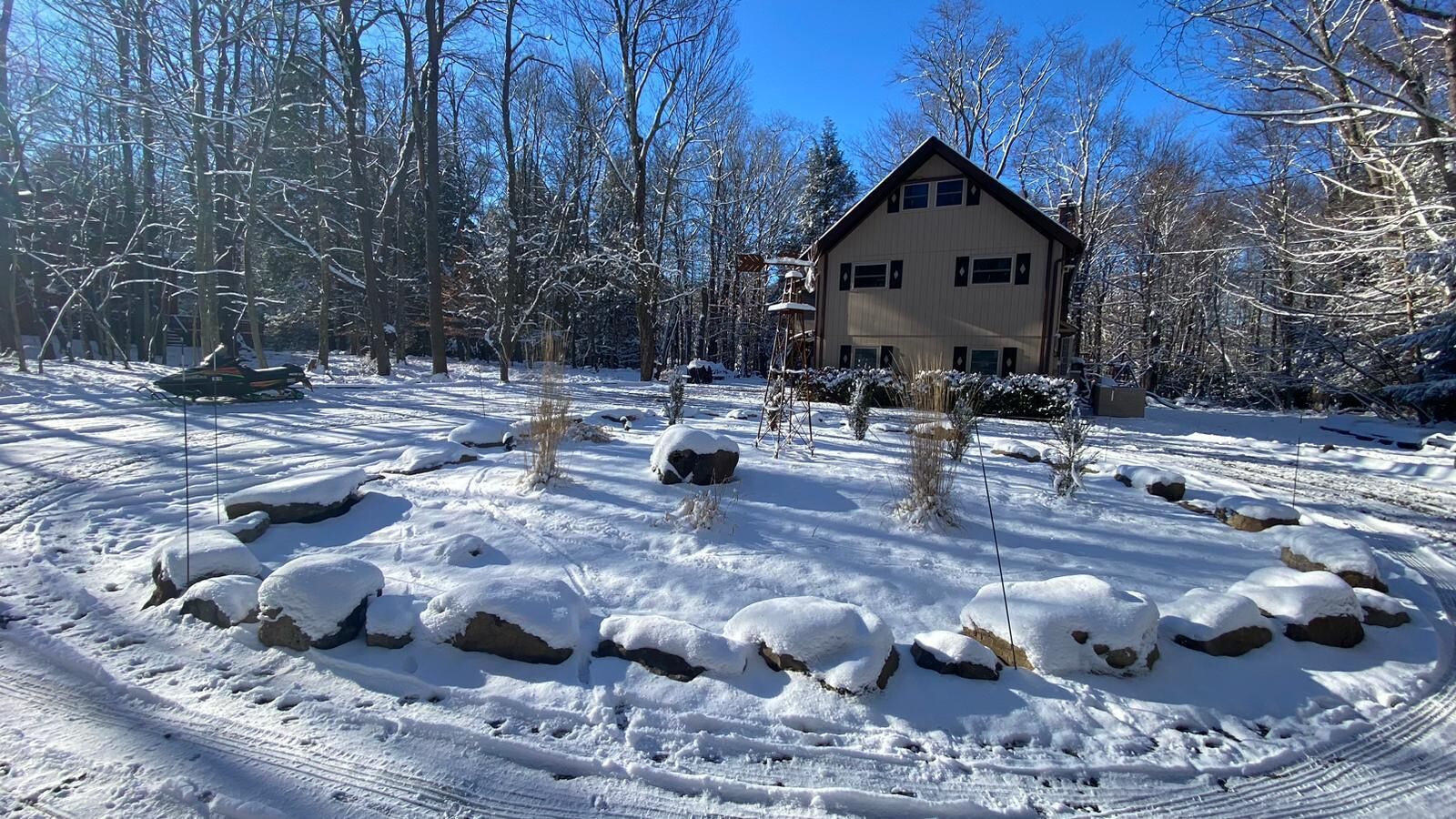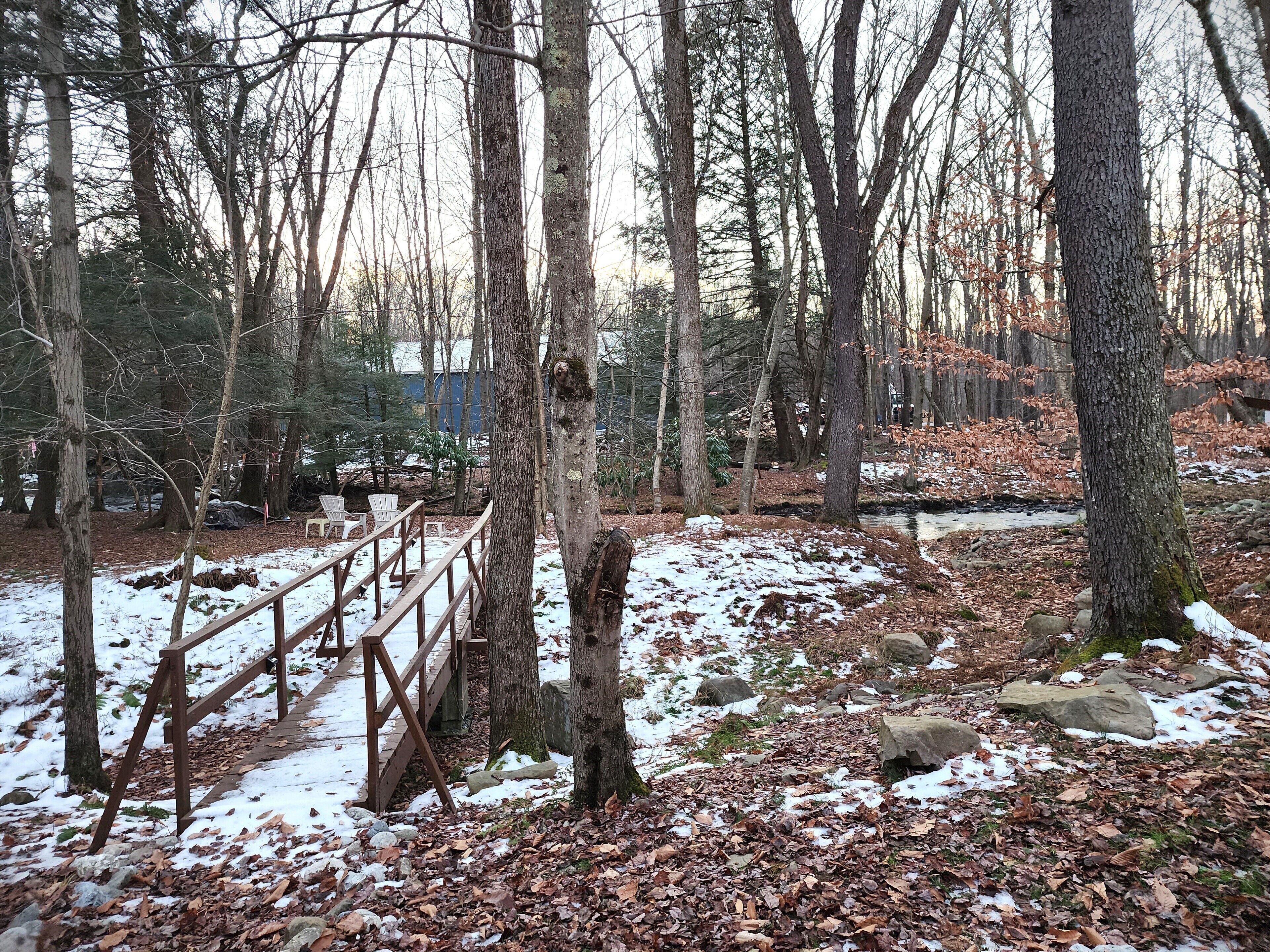 Cozy Chalet with hot tub & Lehigh River in backyard BigBass Lake Pocono Mountain Cozy, spacious and inviting chalet house facing the woods in Pocono PA in Big Bass Lake gated community (2000 sq. ft). Beginning of Lehigh River running through the backyard.While this house can accommodate up to 14 people comfortably, community allows max 12. Includes swing set in the backyard.Located 25 minutes away from Camelback ski and water park, Mount Airy Casino Resort and 15 min from Kalahari Water resorts. Big Boulder and Jack Frost mountains are just 35 minutes away.Screen room with dining table, wood burning fireplace.Bicycles may be provided upon acceptance of the use terms.Please note, that due to Corona virus regulations, community amenities may have additional restrictions. Please also make sure to check PA travel restrictions and requirements before you go.New for VRBO, however we are a Superhost with a lot of rentals and a 5 star feedback at Airbnb.