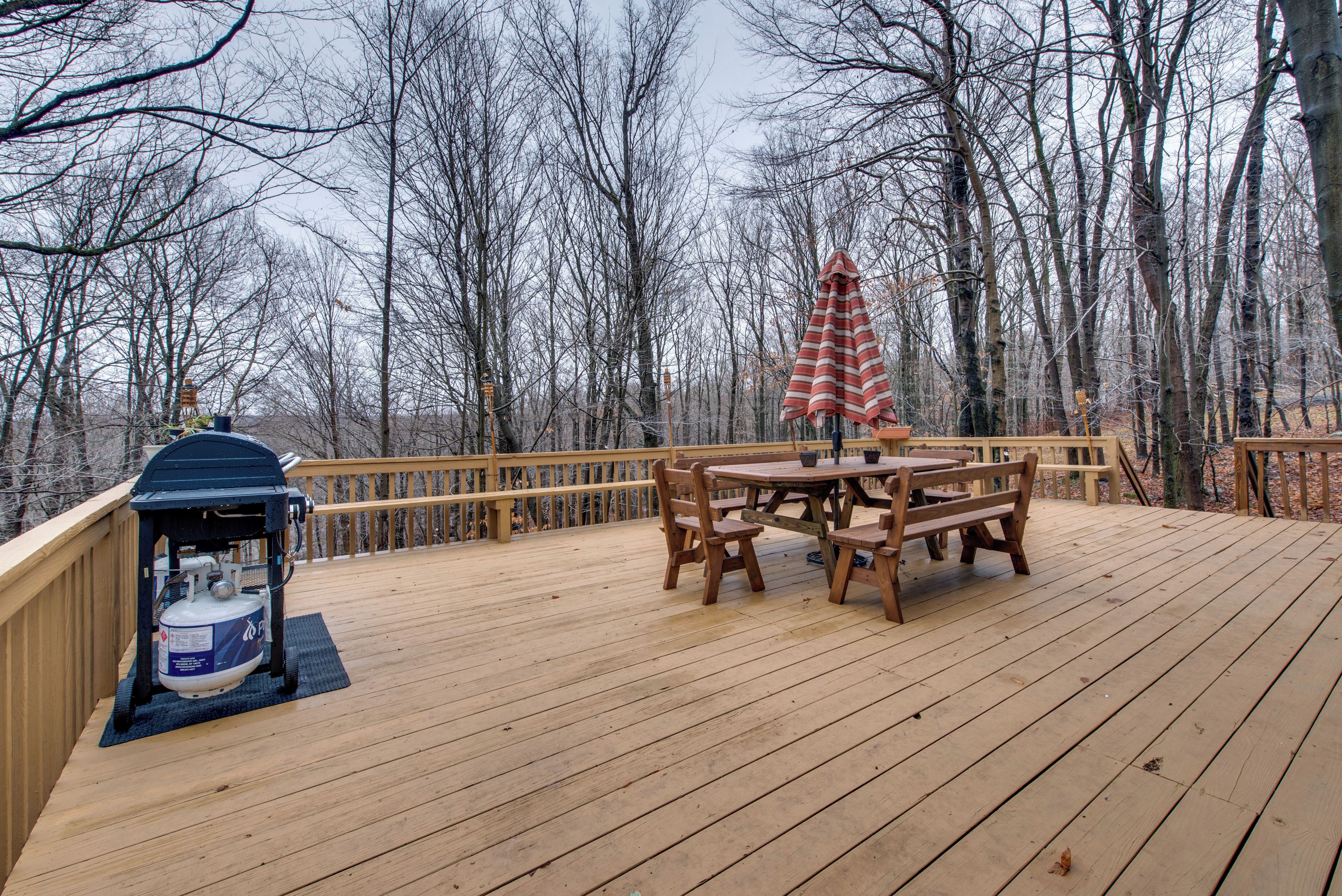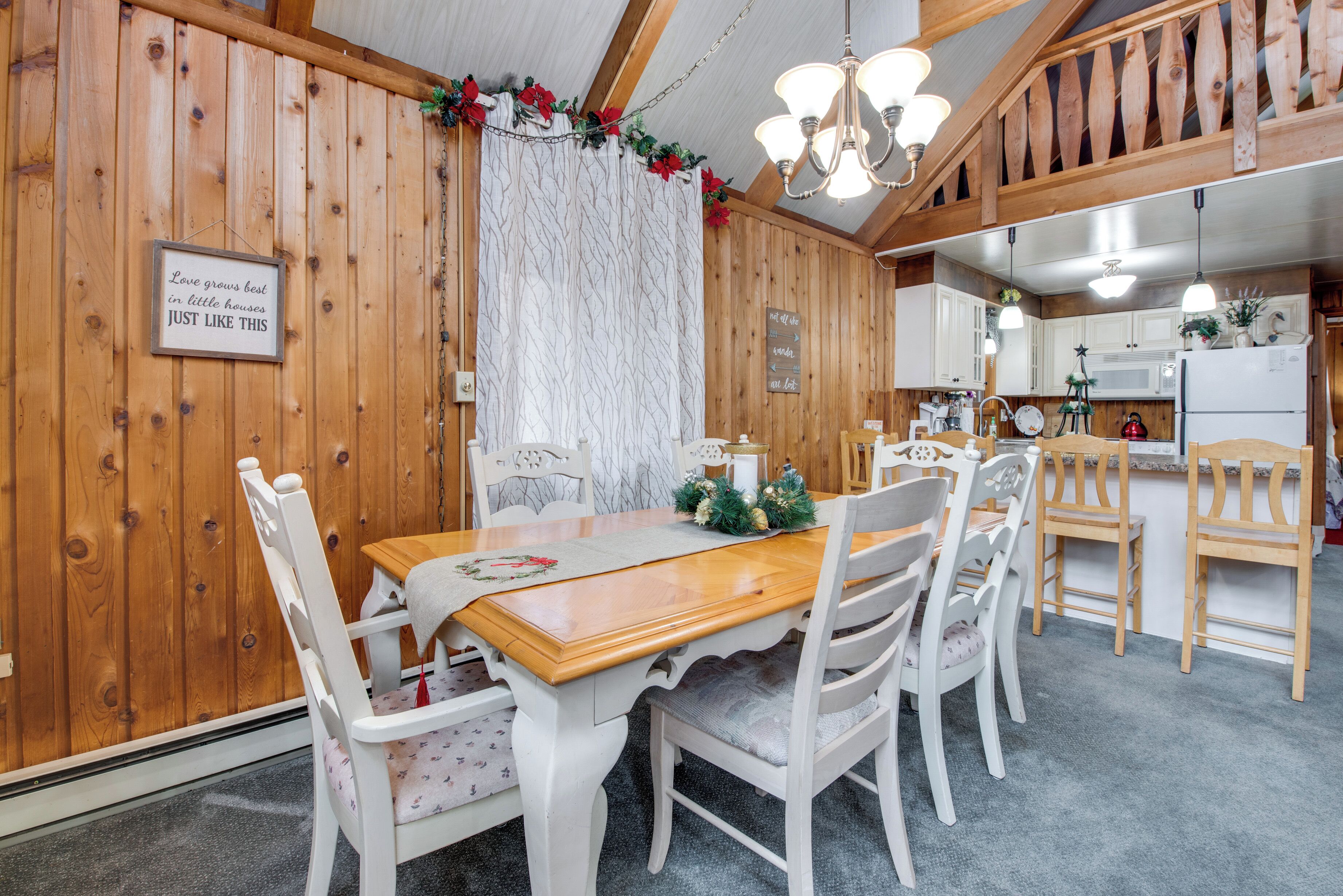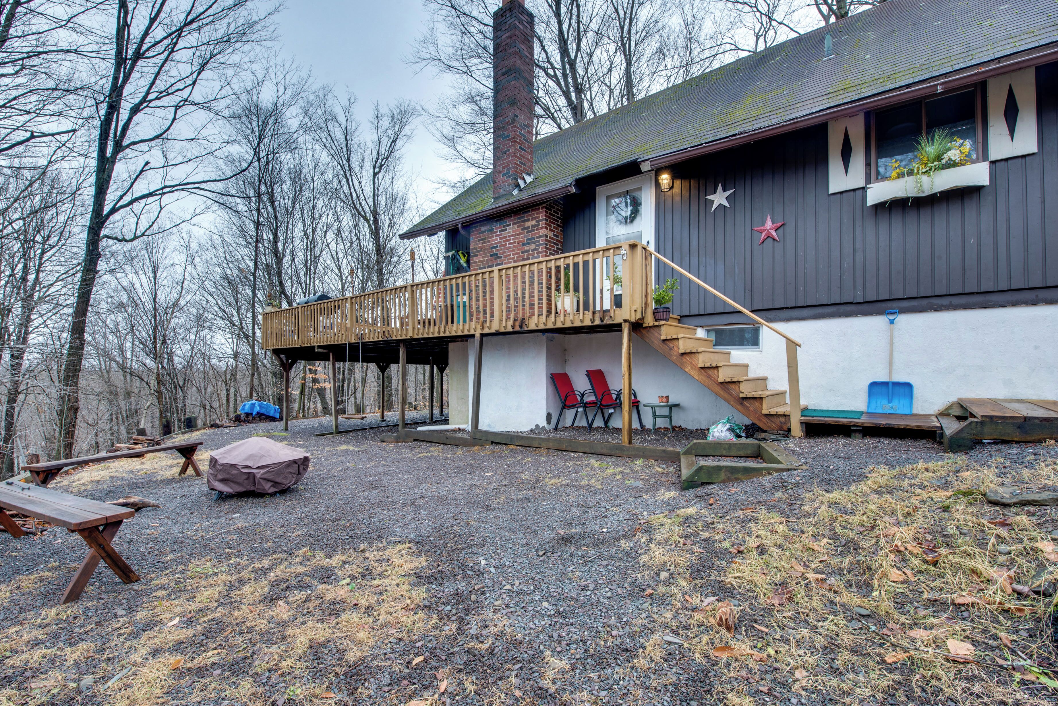 Gouldsboro Cabin w/ Fire Pit + Community Perks! Explore the best of the Pocono Mountains from this rustic woodland cabin! Well appointed with 2 bedrooms and 1.5 bathrooms, the vacation rental offers an open interior with vaulted ceilings, a complete wall of windows, and a spacious deck with ample seating. Nestled just a short drive from Camelback Moutain and Tobyhanna State Park, you'll have easy access to seemingly endless outdoor recreation. Make use of the Big Bass Lake community pool or game room before retiring home for a movie night in!-- THE PROPERTY --Oversized Patio | Charcoal Grill | Stonewall FireplaceBedroom 1: Queen Bed | Bedroom 2: 2 Twin Beds | Loft: 3 Twin Beds, Sleeper SofaCOMMUNITY AMENITIES (addt'l fee paid upon arrival): Indoor pool, outdoor pools, sauna, game room w/ pool table, fitness room, lake/beach accessOUTDOOR LIVING: Oversized deck w/ dining table, sun umbrella, forest views, bench seating, fire pitINDOOR LIVING: Vaulted ceilings, exposed beams, open layout, L-shaped sofa, formal dining table, high-top counter seating, 3 flat-screen Smart TVsKITCHEN: Granite countertops, stove, refrigerator, dishwasher, blender, drip coffee maker, teapot, cutting boards, cooking basics, dishware, flatwareGENERAL: Free WiFi, linens, complimentary toiletries, hair dryer, first aid kit, trash bags, paper towelsFAQ: Towels not provided, 2 exterior security cameras (facing front & side entrances), strict max occupancy, no A/CACCESSIBILITY: 2-story house, exterior staircase to enterPARKING: Gravel driveway (3 vehicles)-- THE LOCATION --LAKES: Gouldsboro Lake (1.9 miles), Big Bass Lake (2.1 miles), Larsen Lake (2.2 miles)OUTDOOR ACTIVITY: Gouldsboro State Park (1.4 miles), State Game Lands Number 312 (5.1 miles), Tobyhanna State Park (11.2 miles), Pinchot State Forest (11.8 miles)WINTER ADVENTURE: Camelback Mountain Resort (21.8 miles), Jack Frost Ski Resort (31.1 miles), Big Boulder Ski Area (30.5 miles), Blue Mountain Resort (48.4 miles)LOCAL ATTRACTIONS: The Ranch at Pocono Manor (14.6 miles), Kalahari Water Park (15.0 miles), The Crossing Premium Outlets (20.4 miles), Pocono Raceway (21.8 miles), Great Wolf Lodge (22.4 miles), Camelbeach Mountain Waterpark (23.3 miles)AIRPORT: Wilkes-Barre/Scranton International Airport (8.2 miles)-- REST EASY WITH US --Evolve makes it easy to find and book properties you'll never want to leave. You can relax knowing that our properties will always be ready for you and that we'll answer the phone 24/7. Even better, if anything is off about your stay, we'll make it right. You can count on our homes and our people to make you feel welcome — because we know what vacation means to you.-- POLICIES --- No smoking- No pets allowed- No events, parties or large gatherings- Must be at least 25 years old to book- Additional fees and taxes may apply- Photo ID may be required upon check-in- This property has a strict maximum occupancy of 8 guests. Exceeding the maximum occupancy will result in a $500 fine- NOTE: Your safety matters. This property features 2 exterior security cameras, above the front door and side entrance, all facing outward. They do not look into interior spaces- NOTE: Due to the height of the deck and the wide openings on the fence surrounding the property, this property may not be suitable for young children- NOTE: Towels are not provided. It is recommended you supply your own- NOTE: The property does not have air conditioning- NOTE: This 2-story house requires an exterior staircase to enter