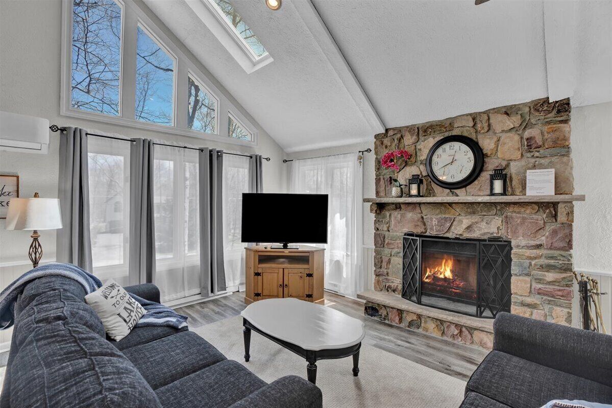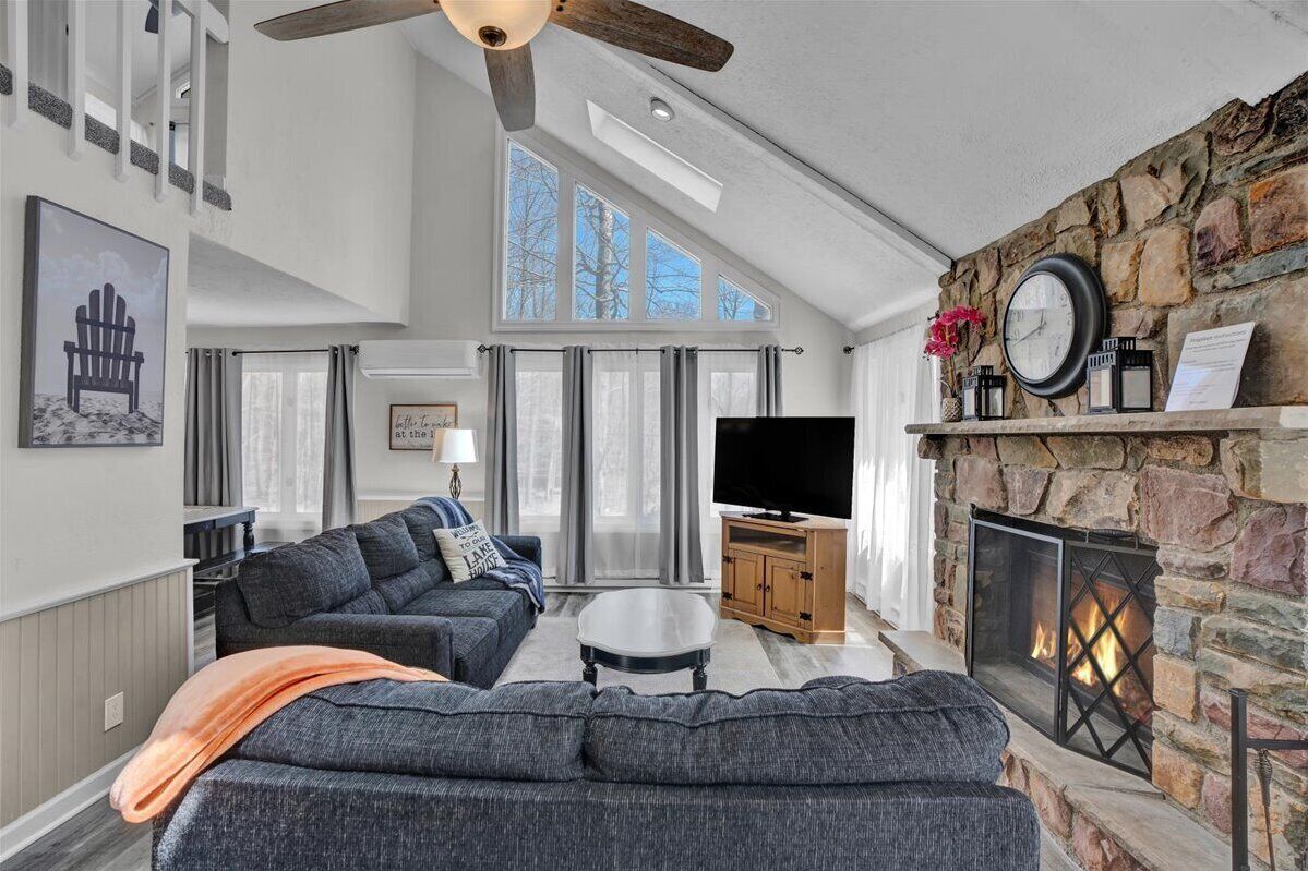 Renovated Escape in Mountain Resort. Lake, Pool, Kayak, Family and Pet Friendly! The whole family will be relaxing in style at our spacious and newly renovated 4 bedroom 3 bath home in a gold star resort with outdoor pool (open summer), indoor pool (open winter), 2 lakes, beaches, playgrounds, beach volleyball, basketball, tennis and more. It features an open concept design, wood burning fireplace...