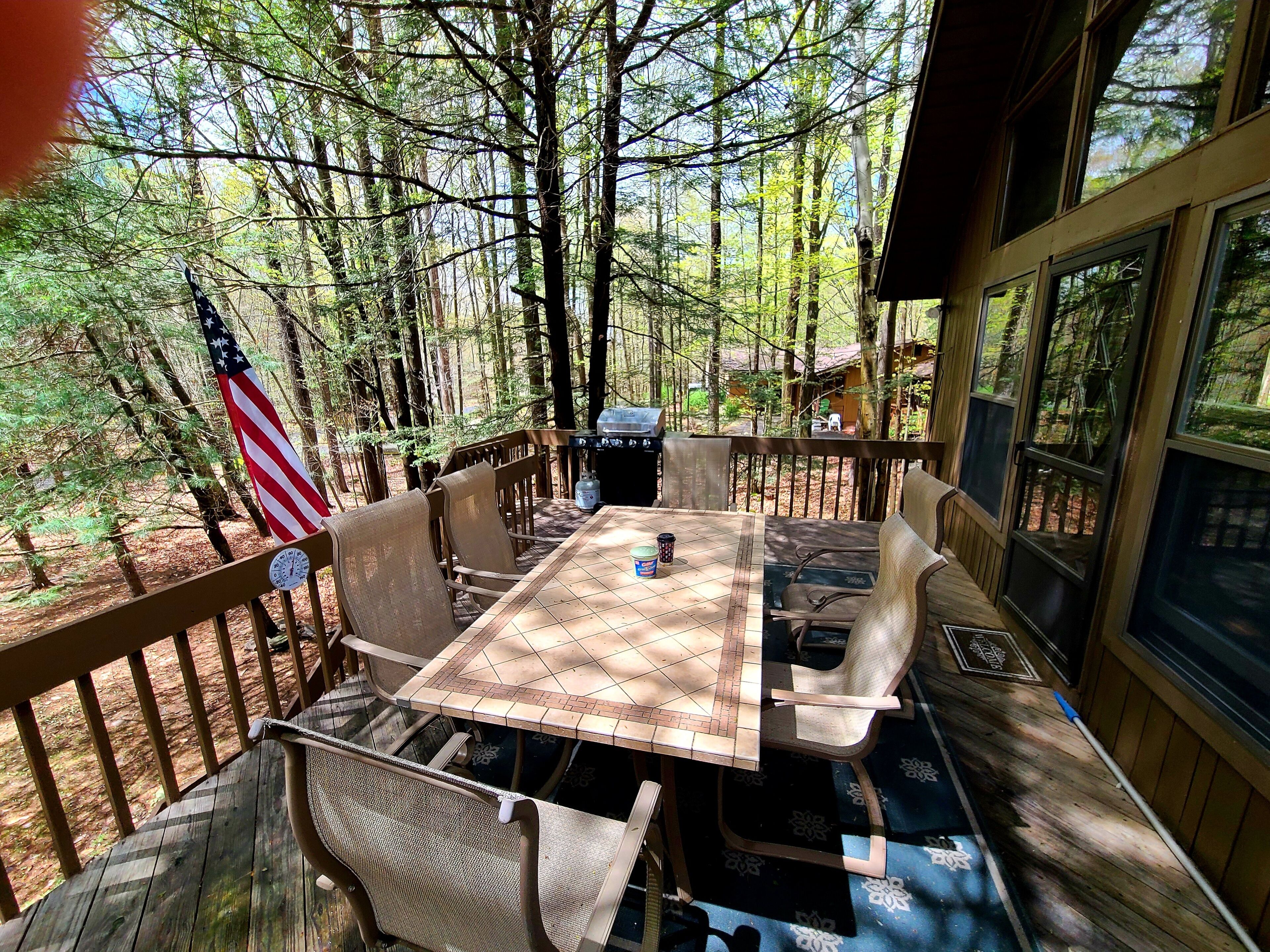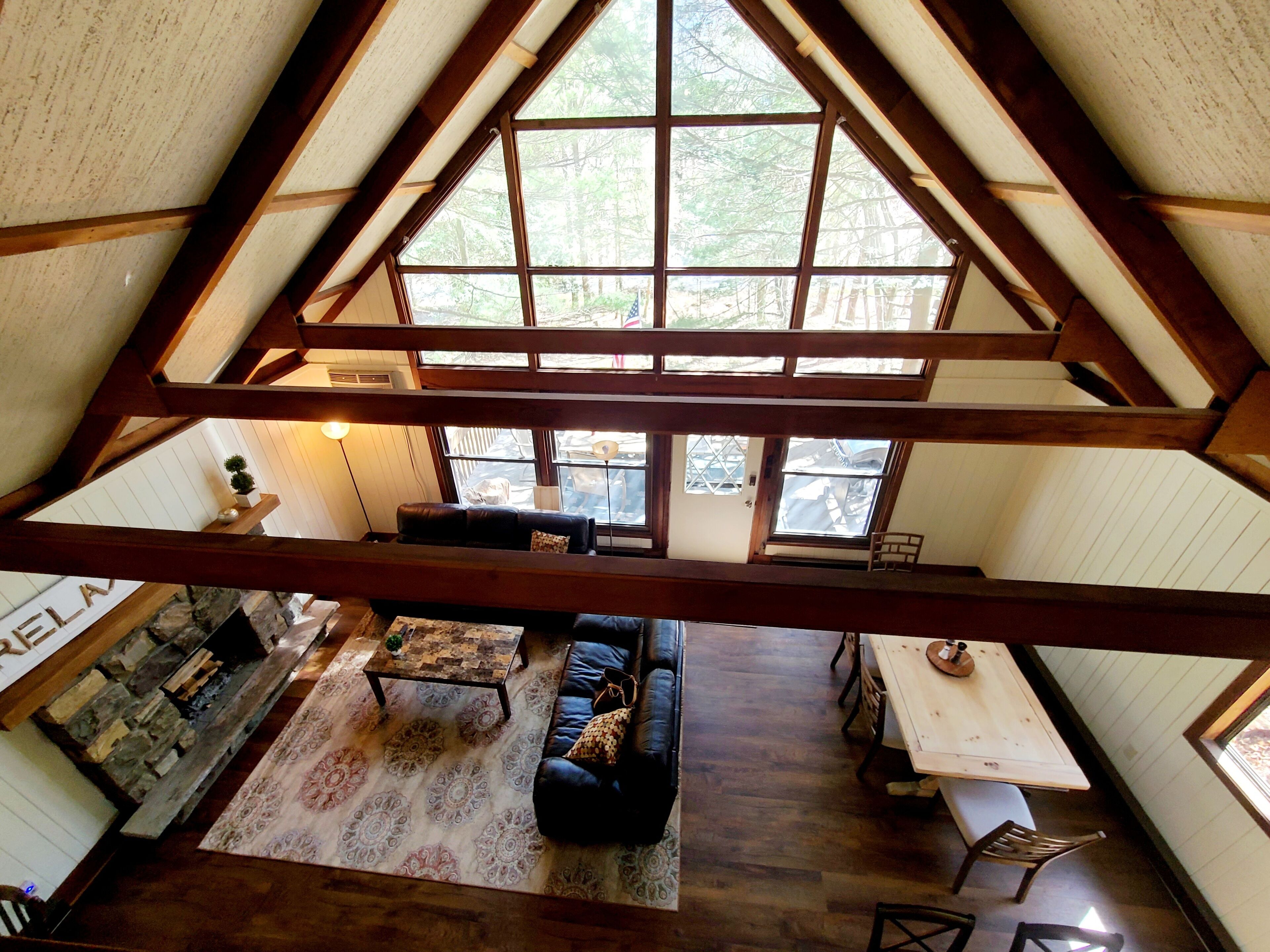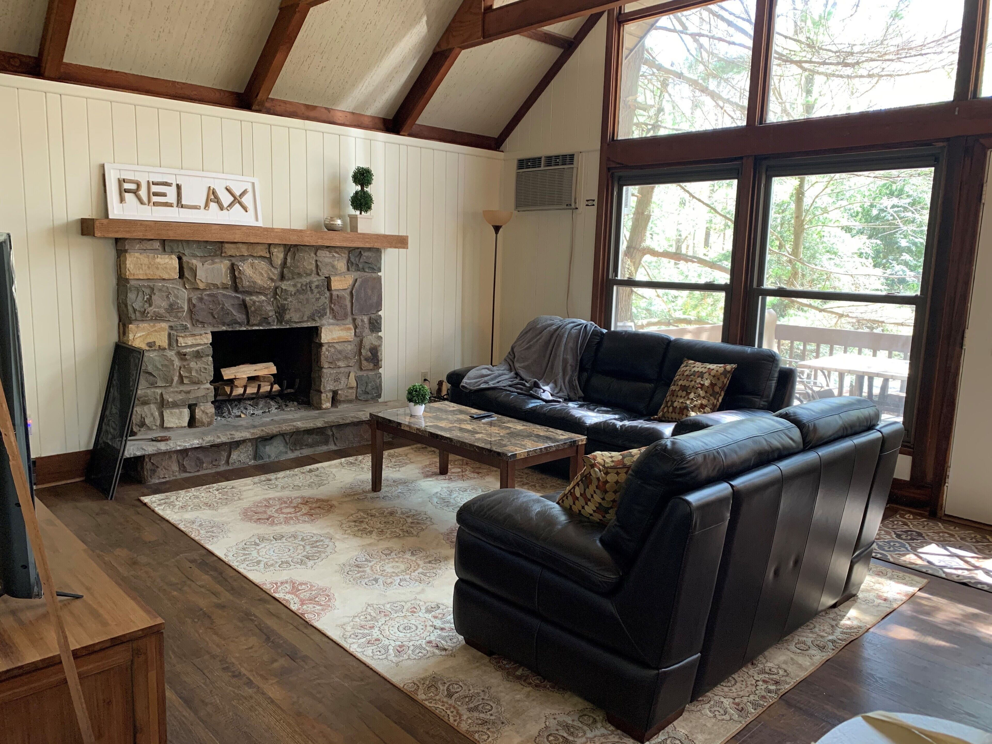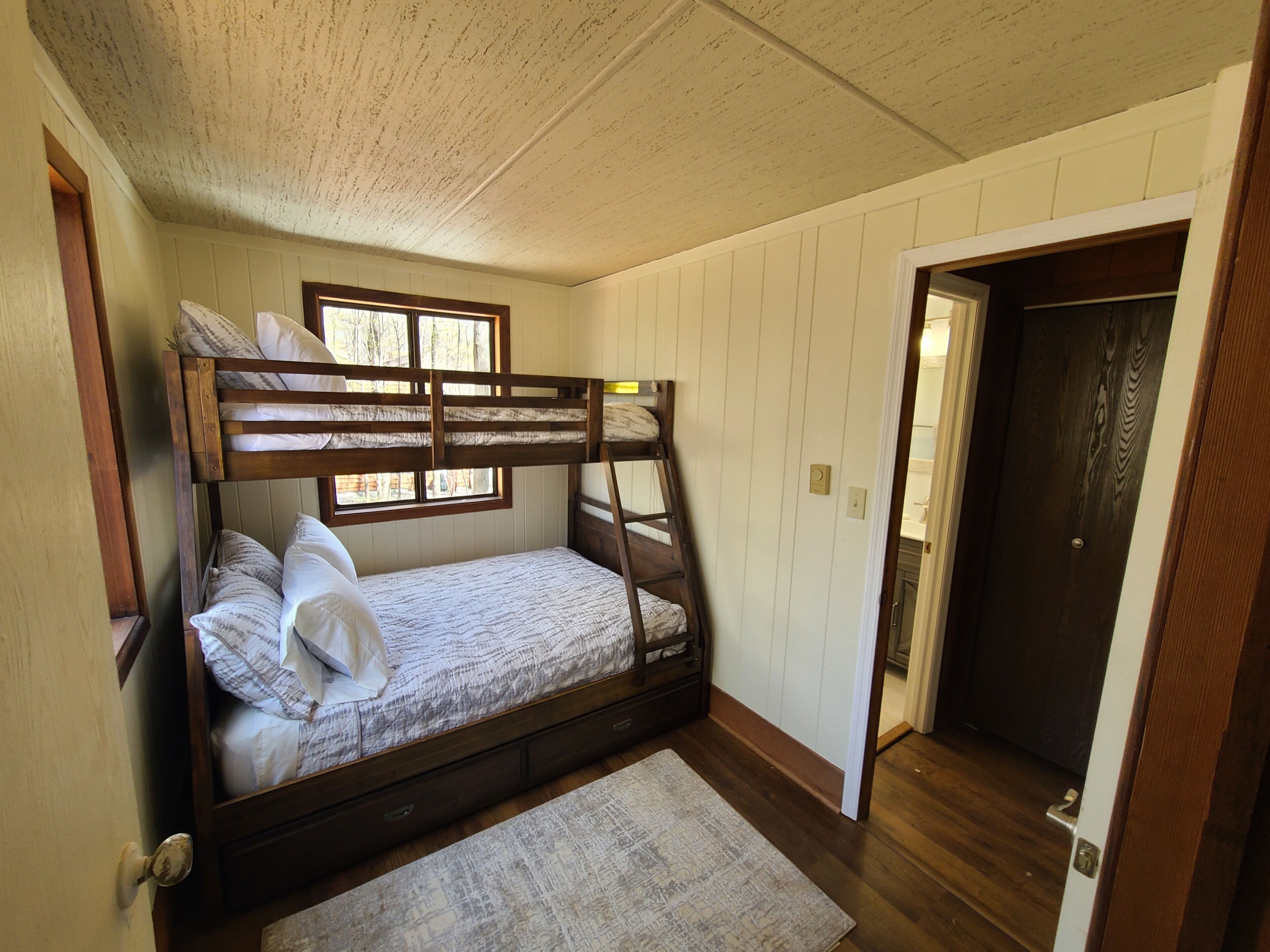 Cozy Cabin - Renovated 2021 - Big Bass Lake Charming and inviting chalet style house set far off the road in the gated community of Big Bass Lake. This house features 2 bedrooms plus a large loft with a King-sized bed. Bathrooms and flooring are brand new.Enjoy our spacious deck that runs the width of the home for morning coffee, afternoon relaxation, or a glass of wine at the end of the day. The Kitchen is equipped with all of your favorite essentials to entertain or prepare a home cooked meal. Chalet has access to community amenities such as 2 beaches, indoor and outdoor pools, tennis courts, basketball courts and boat rentals. Camelback Resort and Kalahari Resort are only 25 and 15 minutes away, respectively. Gouldsboro State Park is within 2 miles with over 2,800 acres and countless hiking trails. After a day of exploring, return home to unwind in front of the stone fireplace and large Smart TV. There is a second living room downstairs with couches and a Smart TV to enjoy as well. With activities available in all seasons, your stay at our home will be one for the books!The RoomsBedroom 1: Queen BedBedroom 2: Bunk Beds (Full Bottom) + Trundle BedBedroom 3 (Loft): King Bed Things to note: - Linens will not be provided, but we would be happy to organize Pocono Linen Rental if you wish which delivers right to your door day of arrival for a charge of $55- Bath towels will be available -In order to use Big Bass Lake Community amenities, there is a $6 fee per person per day that you will pay at the administration office, clubhouse or recreation center. Children under 7 are free with a paying adult. -Rental requires a completed application for Big Bass Lake detailing all guests for access through gated security.