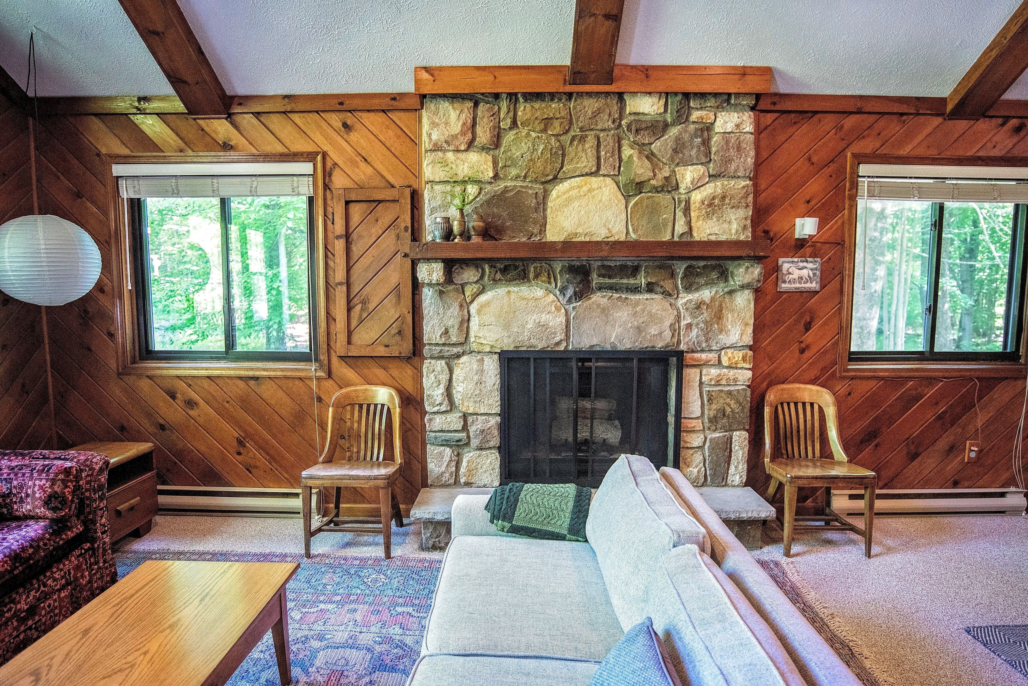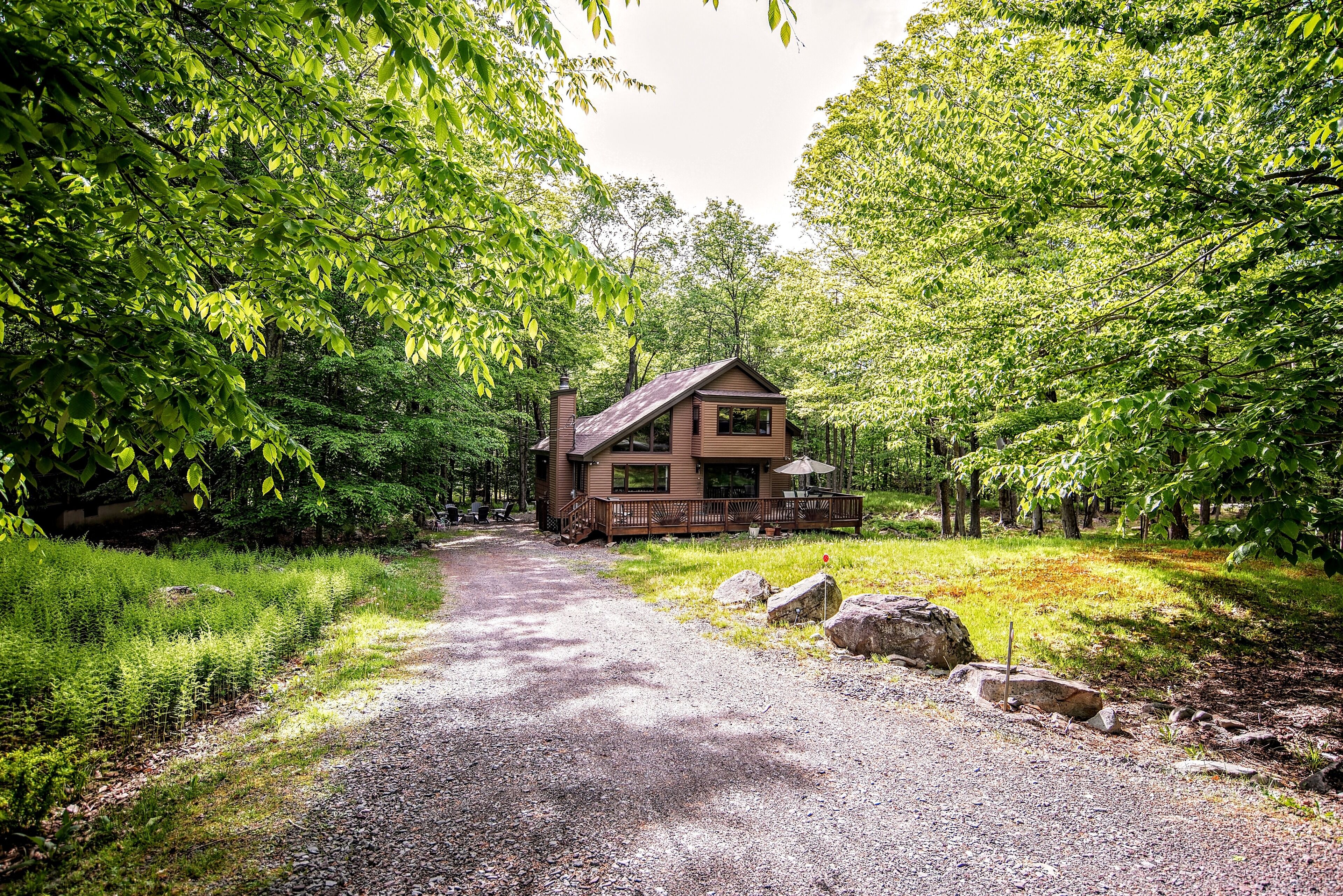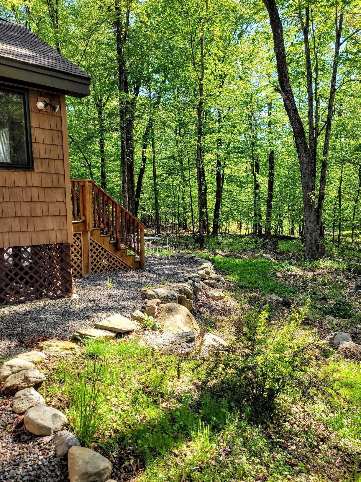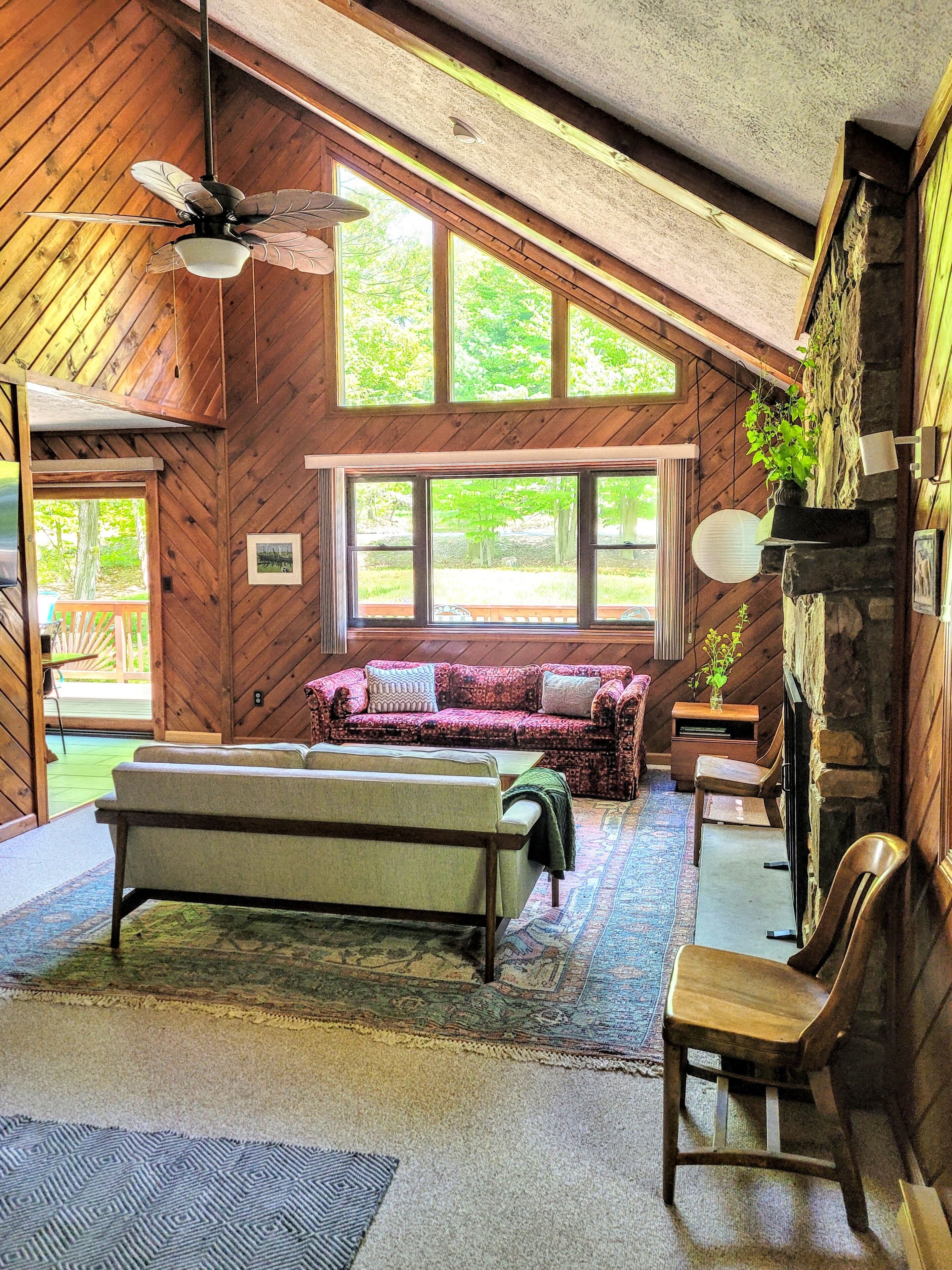 Bohemian Cabin in the Woods by the Lake Nestled among tall trees and wild flowers, in the family-friendly, gated Poconos resort community of Big Bass Lake, sits our Bohemian cabin. The Community: Our cabin is steps away from the heated outdoor pool, splash pad, tennis courts, basketball courts, playground, and a great restaurant/grill. The Clubhouse includes billiards, shuffleboard, and table tennis. Our cabin is a short walk from Big Bass Lake, a clean swimming and boating/fishing lake, the largest of our community's 3 lakes. It includes bbq grills and playground right on the guarded beach. Larsen Lake is also nearby and offers a playground, tennis courts, and a basketball court. by the beach. Family-friendly events, activities, and live music all summer long make it so that it's difficult to leave the community. Our Community also boasts a large baseball/soccer field, bocce courts, and frisbee golf. In winter, a 5 min. drive to our Recreation Center offers an indoor pool and sauna, along with tubing hills. The Cabin: Beautifully appointed cabin, filled with light and original art, features an expansive deck and a built-in firepit. Our house is family friendly, equipped with scooters, a tricycle, beach toys, basketball, and a game cabinet with games for young and old. We have a high chair and a Pack N' Play for your little one. Our kitchen is fully stocked with cooking supplies and new appliances, across from a long kitchen table and counter seating. On the deck is a Weber grill and sturdy modern patio furniture. From the deck you'll see every form of wildlife in the Poconos (except fish-you'll have to walk to the lake for that). Soft cotton linens give our cabin a touch of luxury and strong internet and WiFi make it perfect for movie nights and remote working. In winter, our fireplace is easy to turn on and will keep you cozy, while it snows and snows and snows....