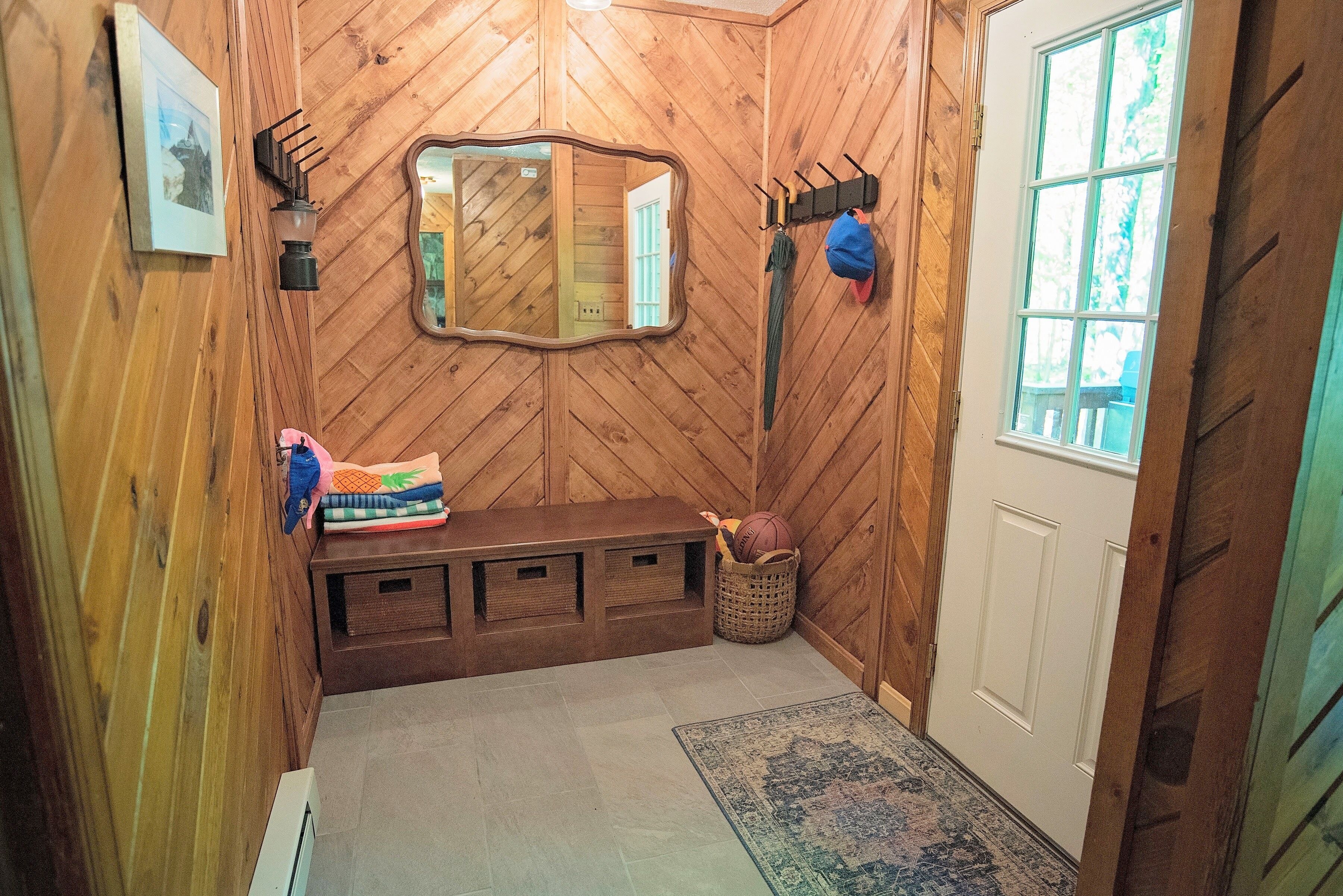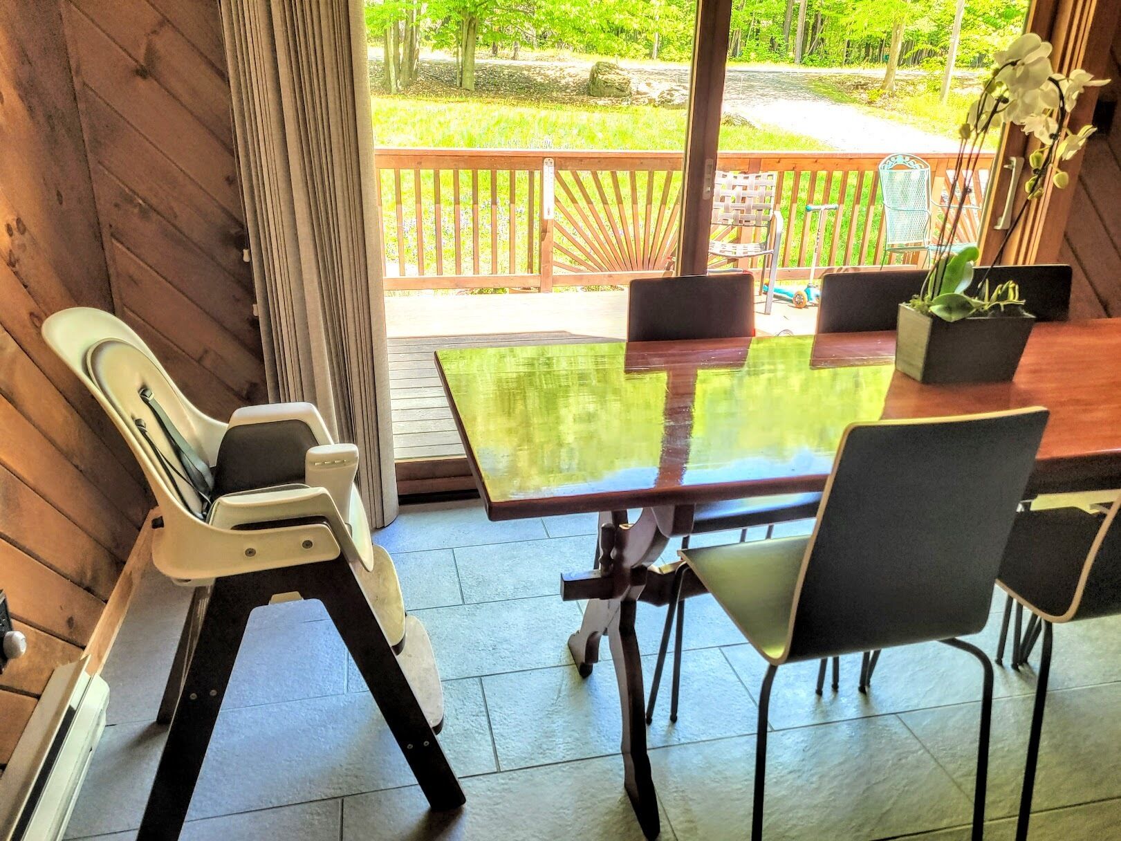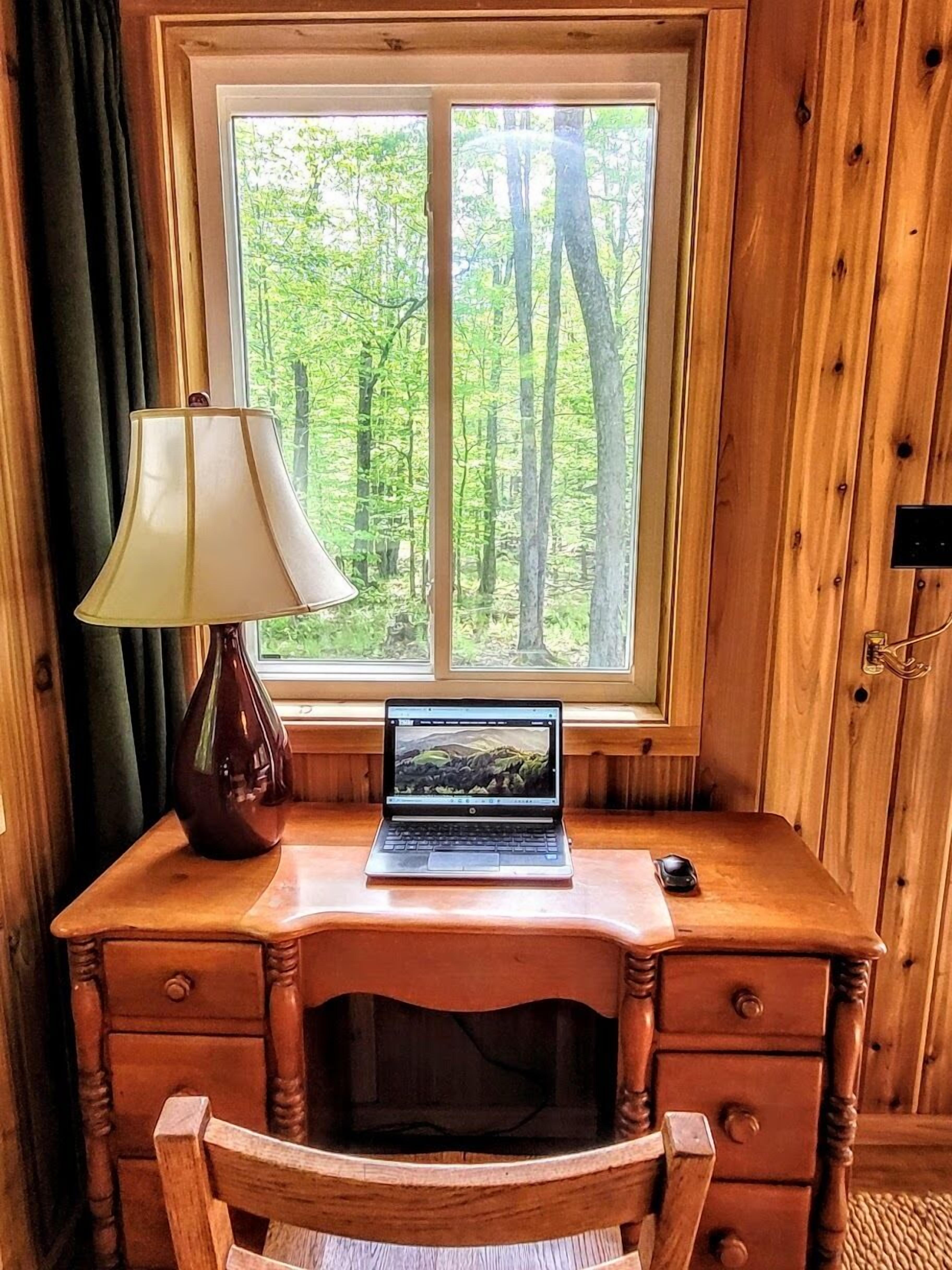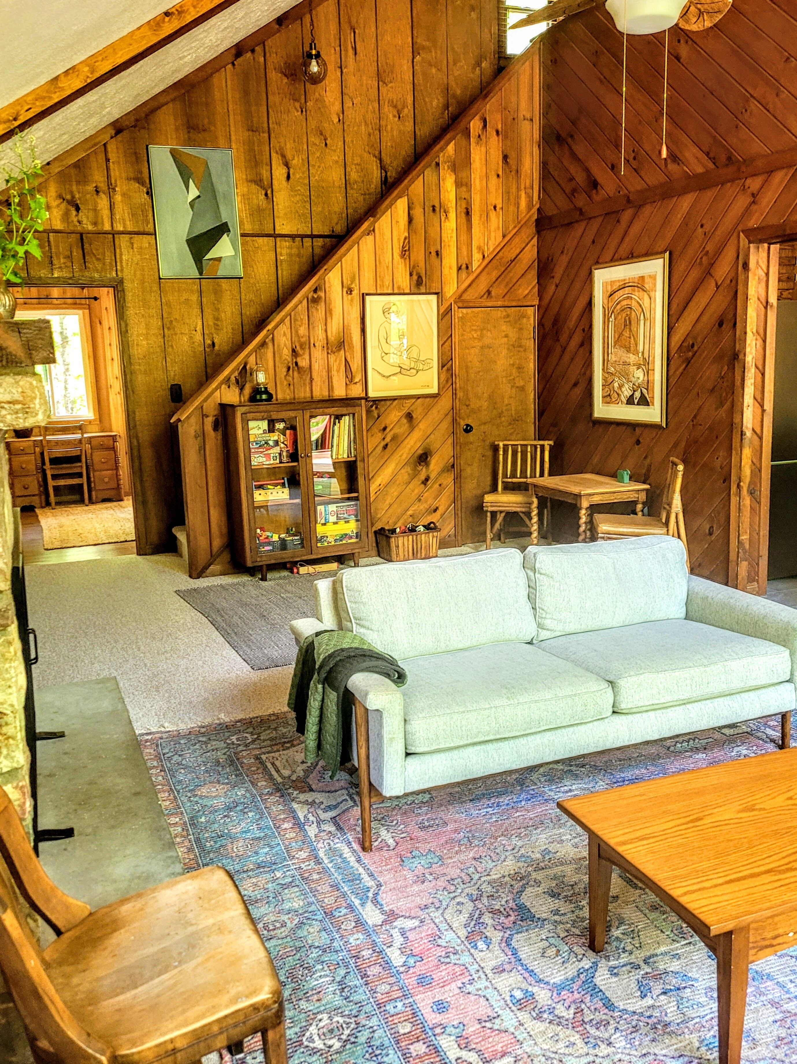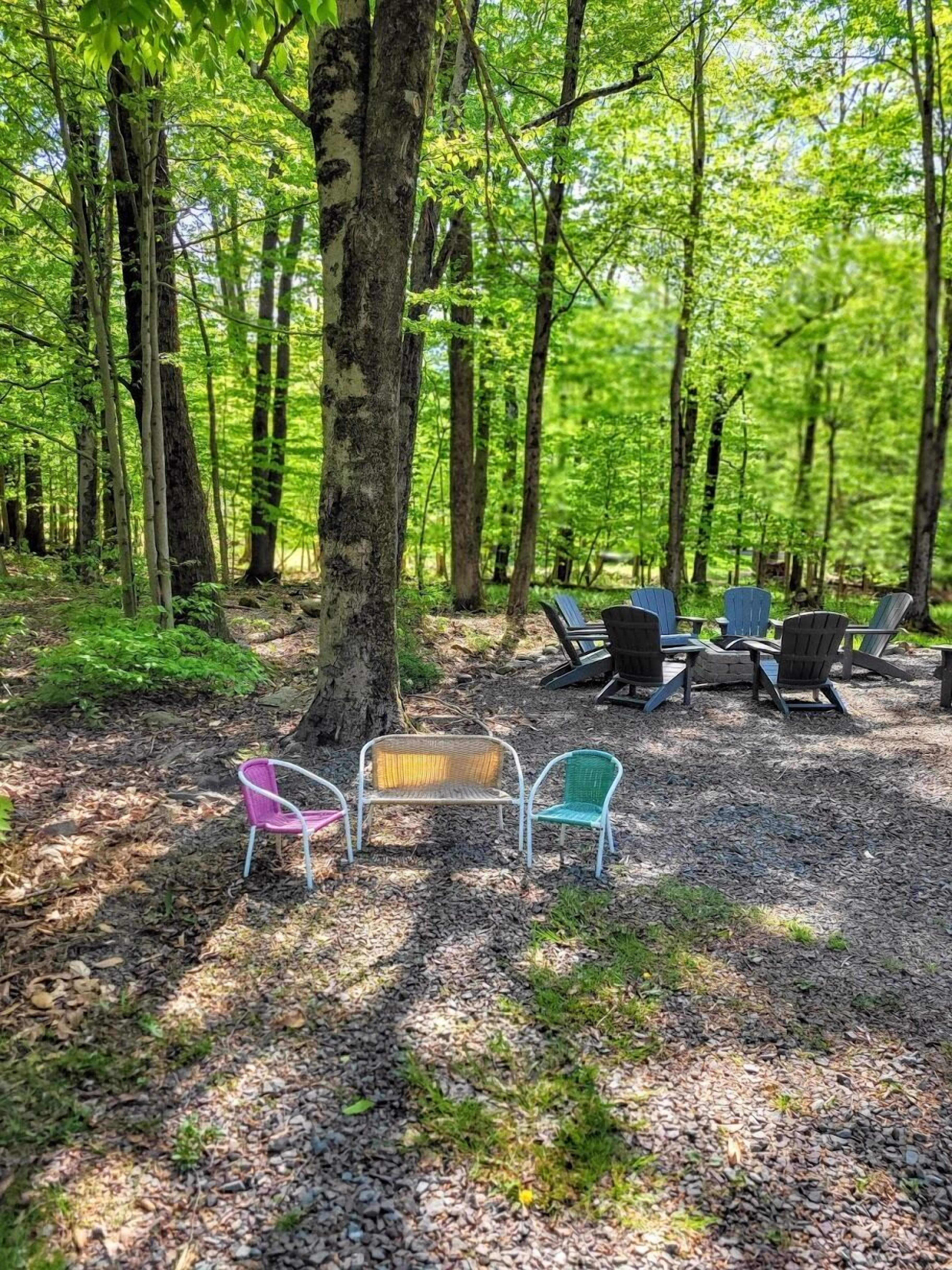 Bohemian Cabin in the Woods by the Lake Nestled among tall trees and wild flowers, in the family-friendly, gated Poconos resort community of Big Bass Lake, sits our Bohemian cabin. The Community: Our cabin is steps away from the heated outdoor pool, splash pad, tennis courts, basketball courts, playground, and a great restaurant/grill. The Clubhouse includes billiards, shuffleboard, and table tennis. Our cabin is a short walk from Big Bass Lake, a clean swimming and boating/fishing lake, the largest of our community's 3 lakes. It includes bbq grills and playground right on the guarded beach. Larsen Lake is also nearby and offers a playground, tennis courts, and a basketball court. by the beach. Family-friendly events, activities, and live music all summer long make it so that it's difficult to leave the community. Our Community also boasts a large baseball/soccer field, bocce courts, and frisbee golf. In winter, a 5 min. drive to our Recreation Center offers an indoor pool and sauna, along with tubing hills. The Cabin: Beautifully appointed cabin, filled with light and original art, features an expansive deck and a built-in firepit. Our house is family friendly, equipped with scooters, a tricycle, beach toys, basketball, and a game cabinet with games for young and old. We have a high chair and a Pack N' Play for your little one. Our kitchen is fully stocked with cooking supplies and new appliances, across from a long kitchen table and counter seating. On the deck is a Weber grill and sturdy modern patio furniture. From the deck you'll see every form of wildlife in the Poconos (except fish-you'll have to walk to the lake for that). Soft cotton linens give our cabin a touch of luxury and strong internet and WiFi make it perfect for movie nights and remote working. In winter, our fireplace is easy to turn on and will keep you cozy, while it snows and snows and snows....