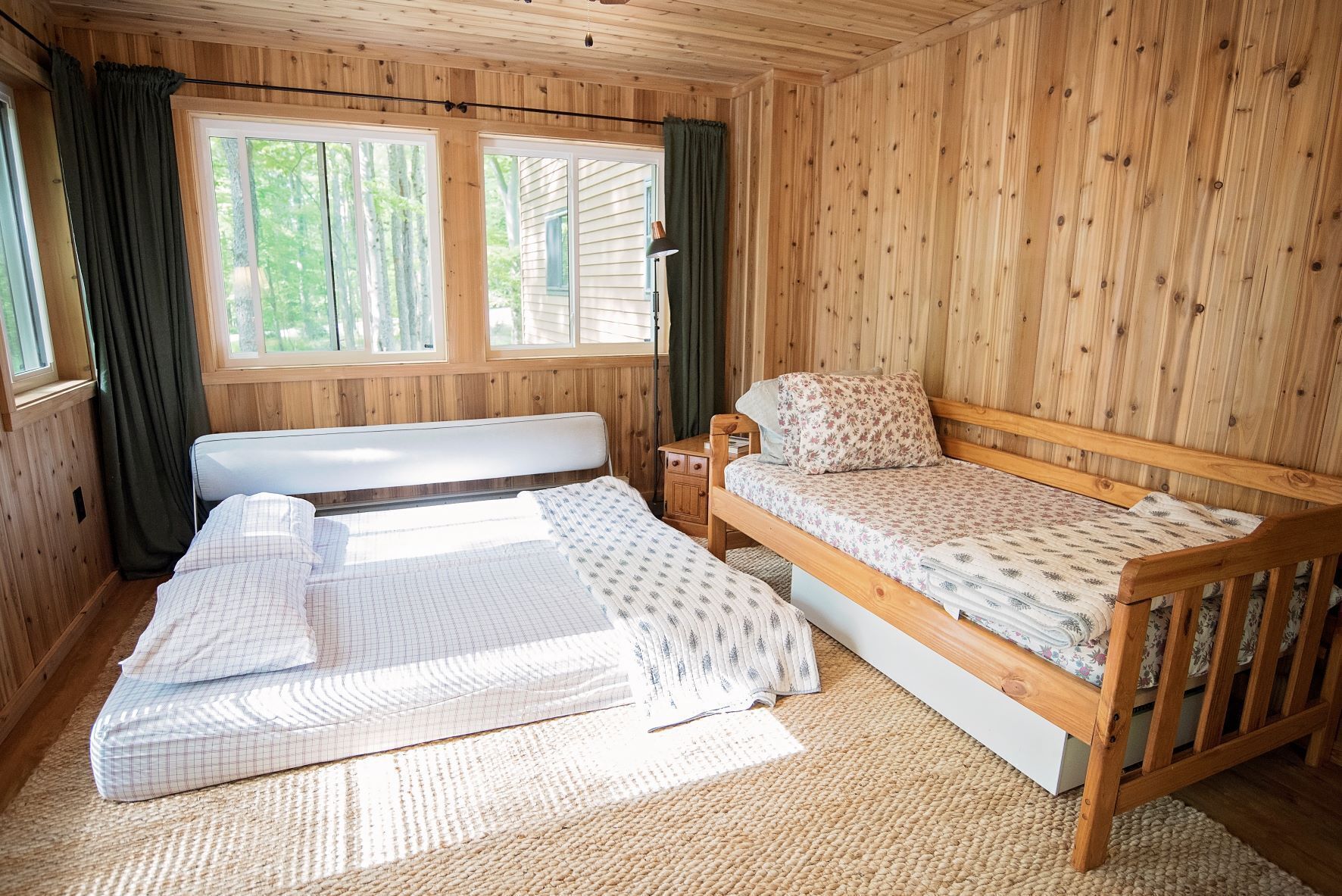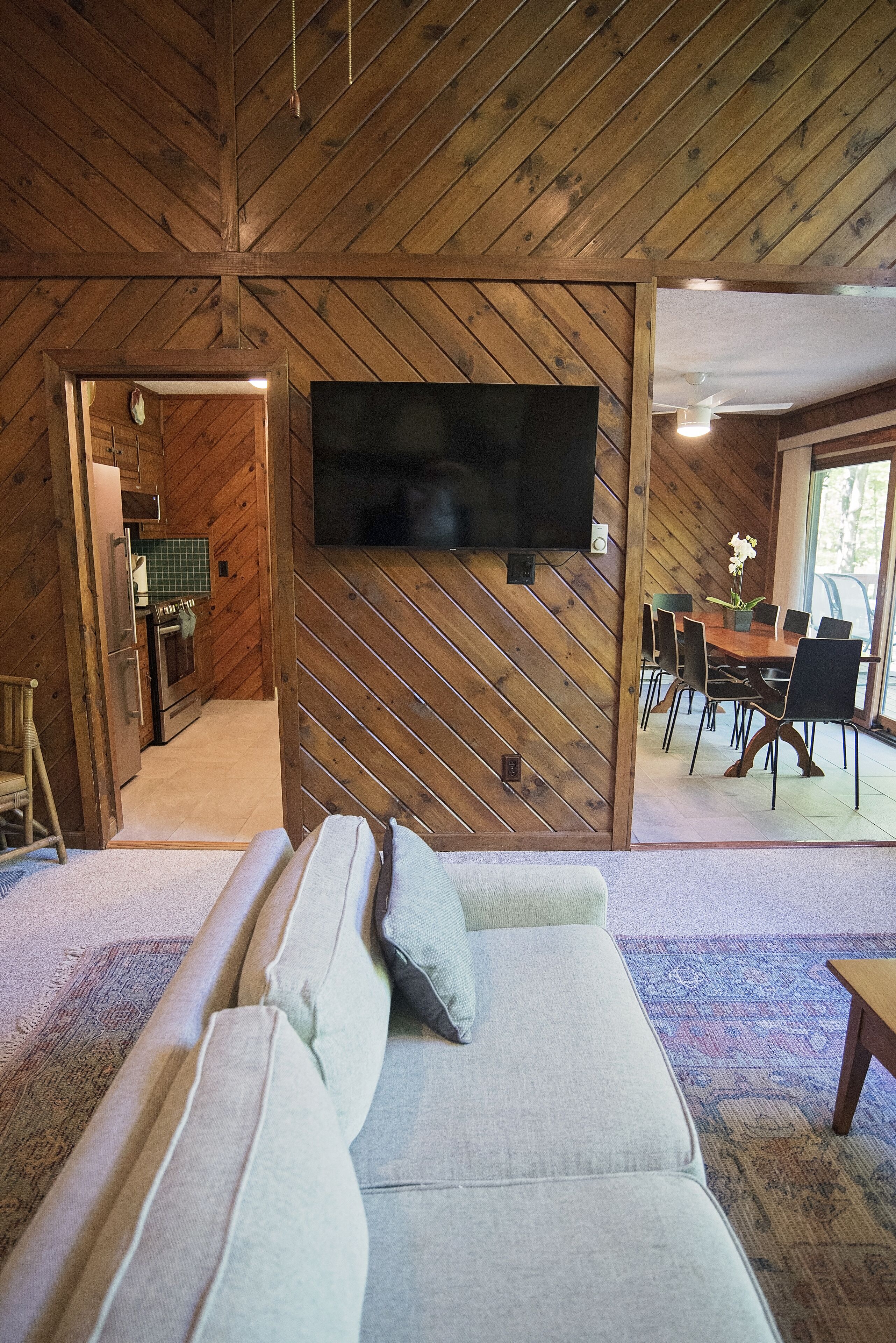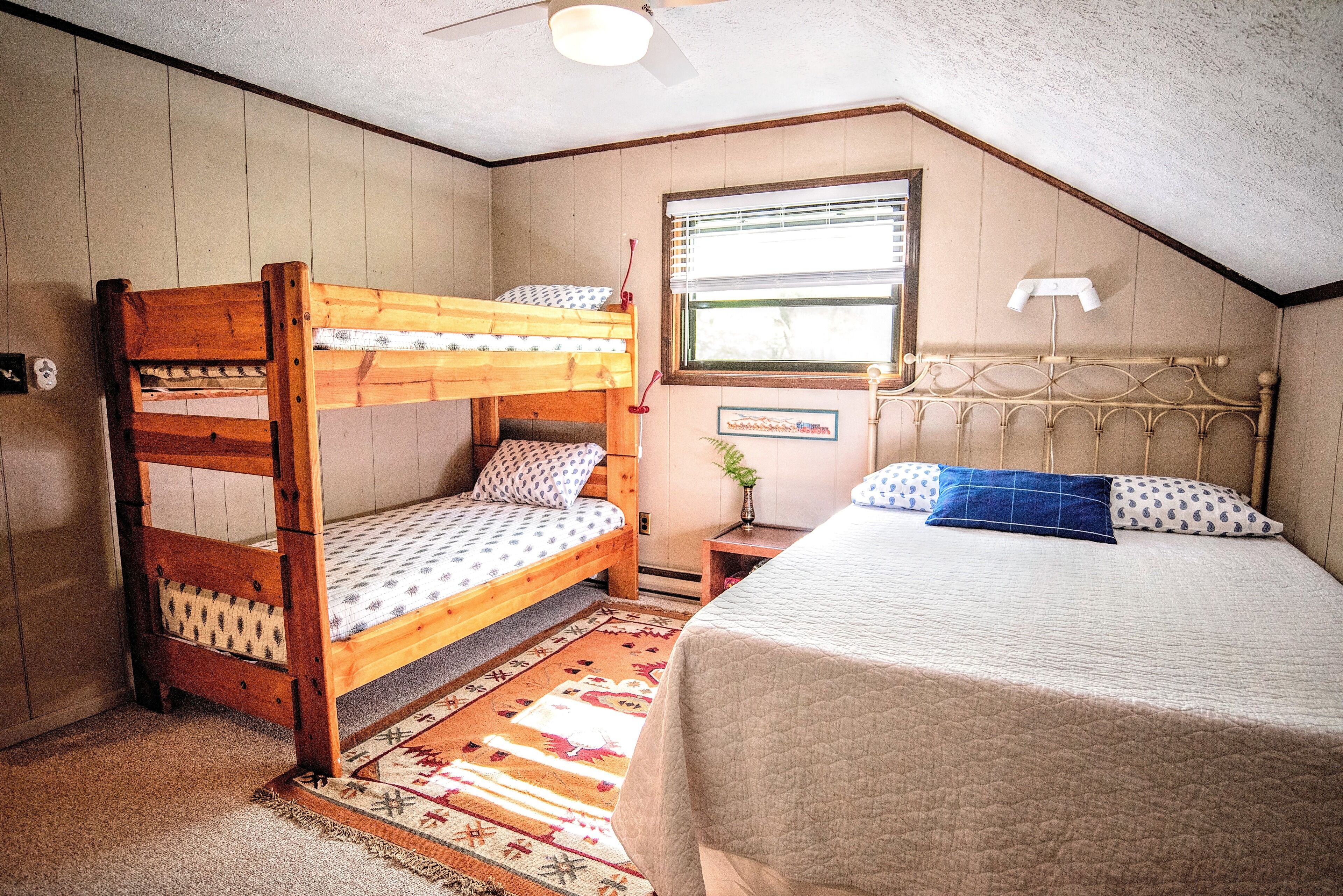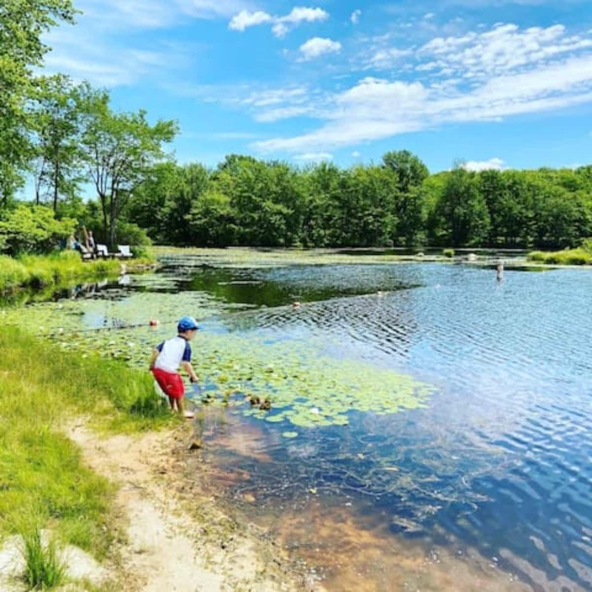 Bohemian Cabin in the Woods by the Lake Nestled among tall trees and wild flowers, in the family-friendly, gated Poconos resort community of Big Bass Lake, sits our Bohemian cabin. The Community: Our cabin is steps away from the heated outdoor pool, splash pad, tennis courts, basketball courts, playground, and a great restaurant/grill. The Clubhouse includes billiards, shuffleboard, and table tennis. Our cabin is a short walk from Big Bass Lake, a clean swimming and boating/fishing lake, the largest of our community's 3 lakes. It includes bbq grills and playground right on the guarded beach. Larsen Lake is also nearby and offers a playground, tennis courts, and a basketball court. by the beach. Family-friendly events, activities, and live music all summer long make it so that it's difficult to leave the community. Our Community also boasts a large baseball/soccer field, bocce courts, and frisbee golf. In winter, a 5 min. drive to our Recreation Center offers an indoor pool and sauna, along with tubing hills. The Cabin: Beautifully appointed cabin, filled with light and original art, features an expansive deck and a built-in firepit. Our house is family friendly, equipped with scooters, a tricycle, beach toys, basketball, and a game cabinet with games for young and old. We have a high chair and a Pack N' Play for your little one. Our kitchen is fully stocked with cooking supplies and new appliances, across from a long kitchen table and counter seating. On the deck is a Weber grill and sturdy modern patio furniture. From the deck you'll see every form of wildlife in the Poconos (except fish-you'll have to walk to the lake for that). Soft cotton linens give our cabin a touch of luxury and strong internet and WiFi make it perfect for movie nights and remote working. In winter, our fireplace is easy to turn on and will keep you cozy, while it snows and snows and snows....