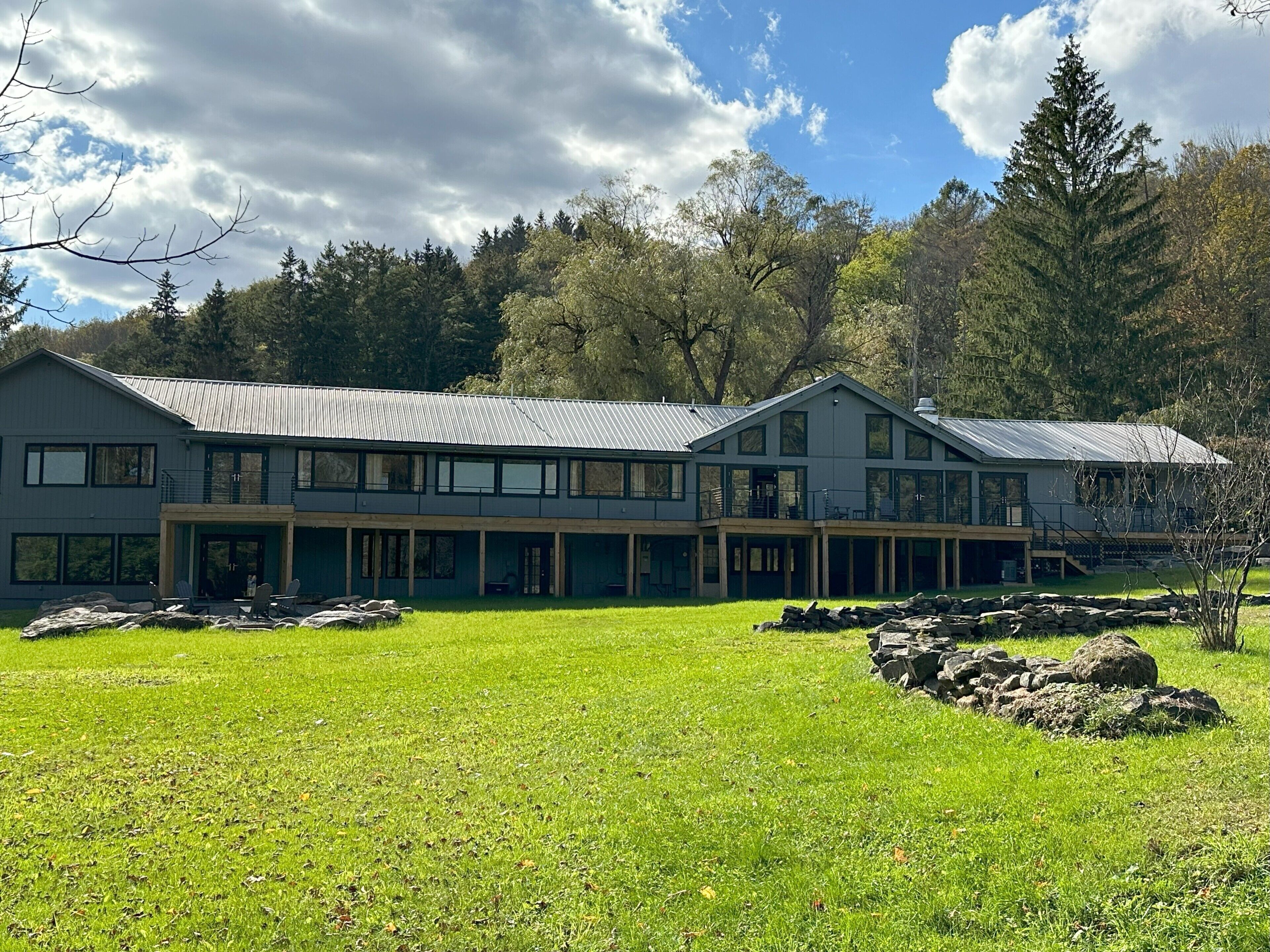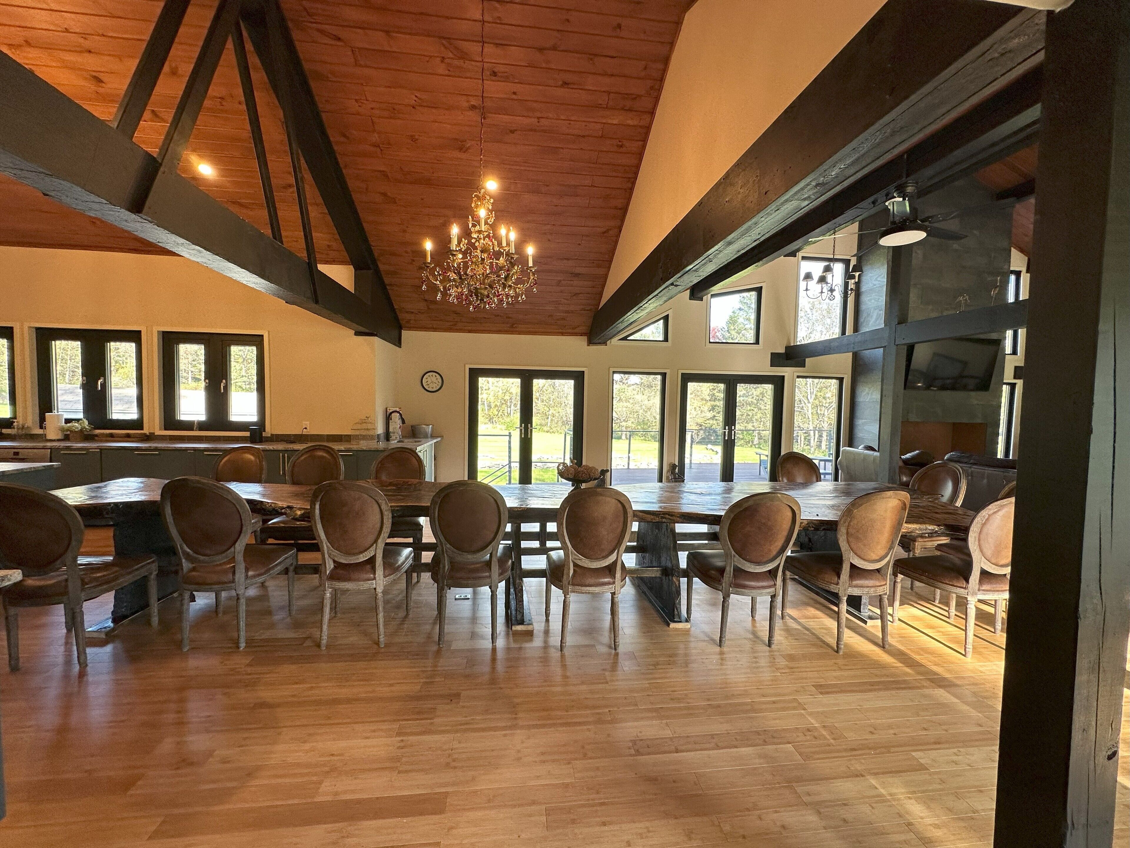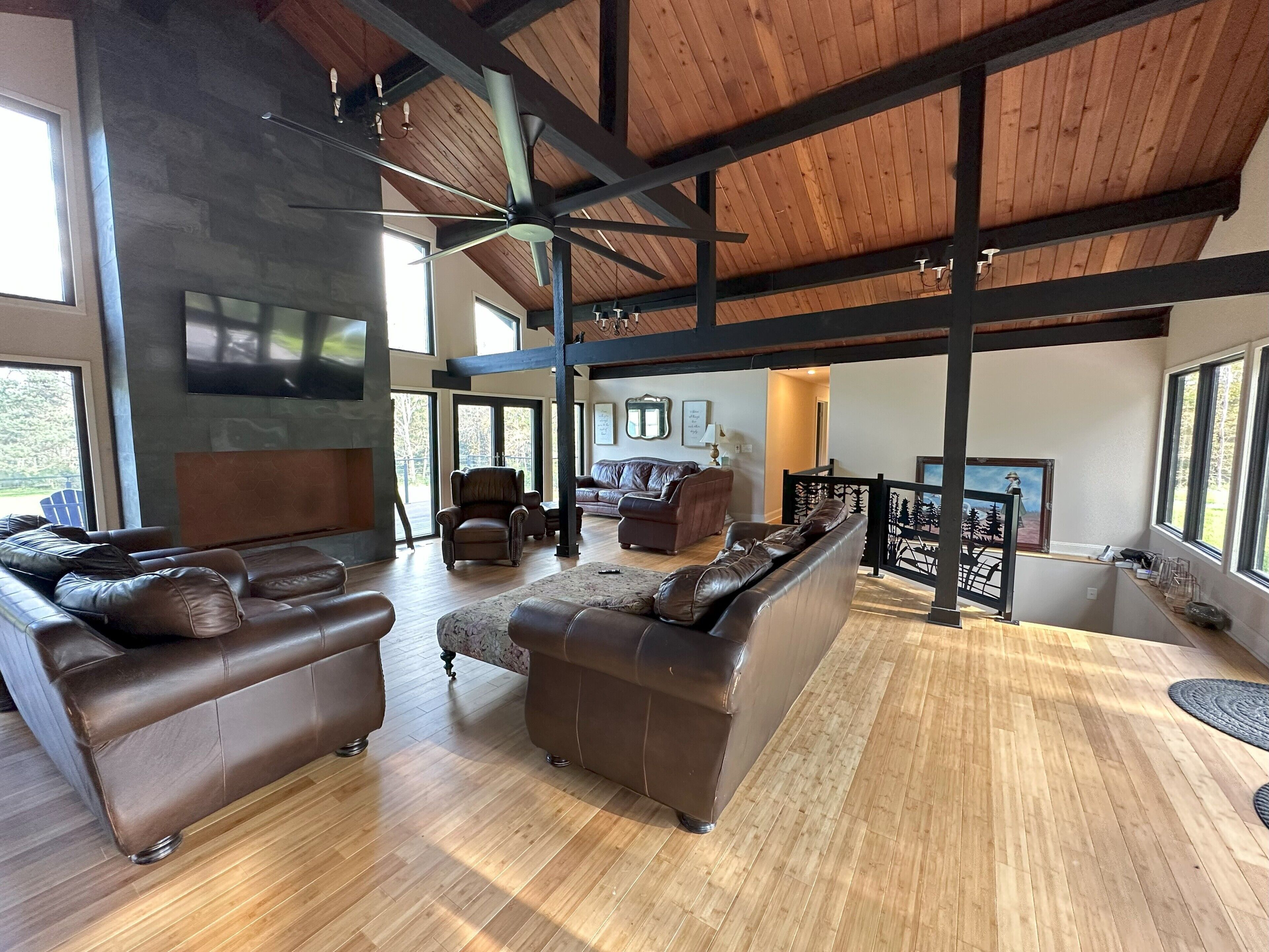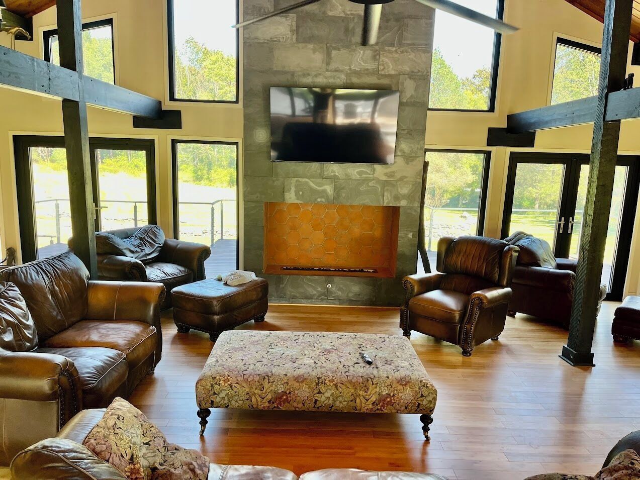 Otter Lodge - Private Pond! French country elegance meets rustic Pennsylvania charm!Located on 16+ acres, Otter Lodge is the perfect multi-family vacation destination! Over 7000 sq ft, the lodge boasts 8 bedrooms & 8.5 baths (including a handicapped friendly ensuite & elevator). A 1/2 acre pond provides fishing & boating for adventurers, while the home theater, game room & whiskey lounge provide indoor fun!Lake Tobyhanna, Lake Wallenpaupack, the Promised Land, Skytop resort & ski resorts are only 10-20 minutes away.The spaceThe Otter Lodge provides a retreat for multiple families to gather and create cherished memories. Whether you are generations of a single family, a group of friends, or celebrating a special event; Otter Lodge provides so many ways for you to engage each other and the world around you! Explore the 16 acre property, boat on the pond, teach the kids how to fish, tell stories around the fire, play games, or journey outside of the property to find your own adventure!Book 7 days and receive a 10% discount!We want to make your stay as carefree as possible, so we supply most everything you will need, including:• Bedroom Essentials: Each bedroom contains linens, a comforter, and pillows. There is also a ceiling fan and closet with ample space for hanging & folded clothes. A desk, chair and free wi-fi are provided to allow ‘work from home’ in all bedrooms (other than the children rooms).• Bathroom Essentials: Each bathroom contains towels and wash clothes, toilet paper (3 rolls), hair dryer, air freshener, hand soap, shampoo, conditioner and body wash. Note: The upstairs bathrooms include a shower only, but the downstairs bathroom contains a tub to bathe young children. Please do not leave children unattended!• Kitchen: Our well-appointed kitchen includes appliances and tools to feed and clean up a full house of 20+ guests! There are 2 electric ovens with stovetops, a full refrigerator and full freezer, 2 dishwashers, 3 sinks, an ice machine (up to 100 lbs of ice/day), microwave, air fryer, blender, 14 cup drip coffee machine, single use pod coffee machine, and tea kettle. We also provide dishware, utensils, cooking & baking supplies, an array of spices and much more. A full list of kitchen supplies will be provided after booking to help you plan your trip!• Our 20 foot live edge table allows families to dine together!• Whiskey Lounge: Seating for 8-10, beverage cooler, rocks glasses (12), sink w cutting board & glass washer.• Media Room: 90 inch SMART TV, reclining theater seats (8), full-size futons (2)• Fitness Room: Our fitness room is outfitted with rubber/foam flooring and wall mirrors, yoga mats (4), resistance bands (3), and jumping rope. We ask that you please do not wear shoes on the mats and monitor children.• Laundry room: You will find 2 washers and 2 dryers, laundry detergent, clothes hamper, first aid kit, fishing poles (5), a tackle box, paddle boat seats and anchor, life vests, and basic cleaning tools (broom, dustpan, vacuum)• Family Games: We provide a variety of board games suitable for all ages plus shuffleboard and billiards on the lower level.• Dog Wash: Dogs are part of our family too! So we want yours to be as comfortable as ours when they visit. If your fur-babies are like ours, they love to get muddy and smelly. For this reason, we’ve installed a dog wash. It has a separate entrance so muddy paws don’t get inside the house. Also included are shampoo/conditioner, drying towels (2), food & water bowls (2 each), and rosemary/mint spray to help prevent ticks. Please notify us of your pet(s) at time of booking. There is a $75/dog cleaning fee. Undeclared dogs and damage caused by pets will incur an additional $300 fee.Guest accessFront door key pad for self check-in.Gate access code provided just prior to arrival. Gate remote available during stay for easy in/out.Other things to noteMax Overnight Occupancy: 30 peopleMinimum Age to Rent: 25Available to host events such as wedding receptions, family reunions, corporate events/meetings, church retreats, etc* No smoking or vaping inside the home ** No Prom Parties ** No commercial photography or filming *Short-Term Rental Permit: 20240450