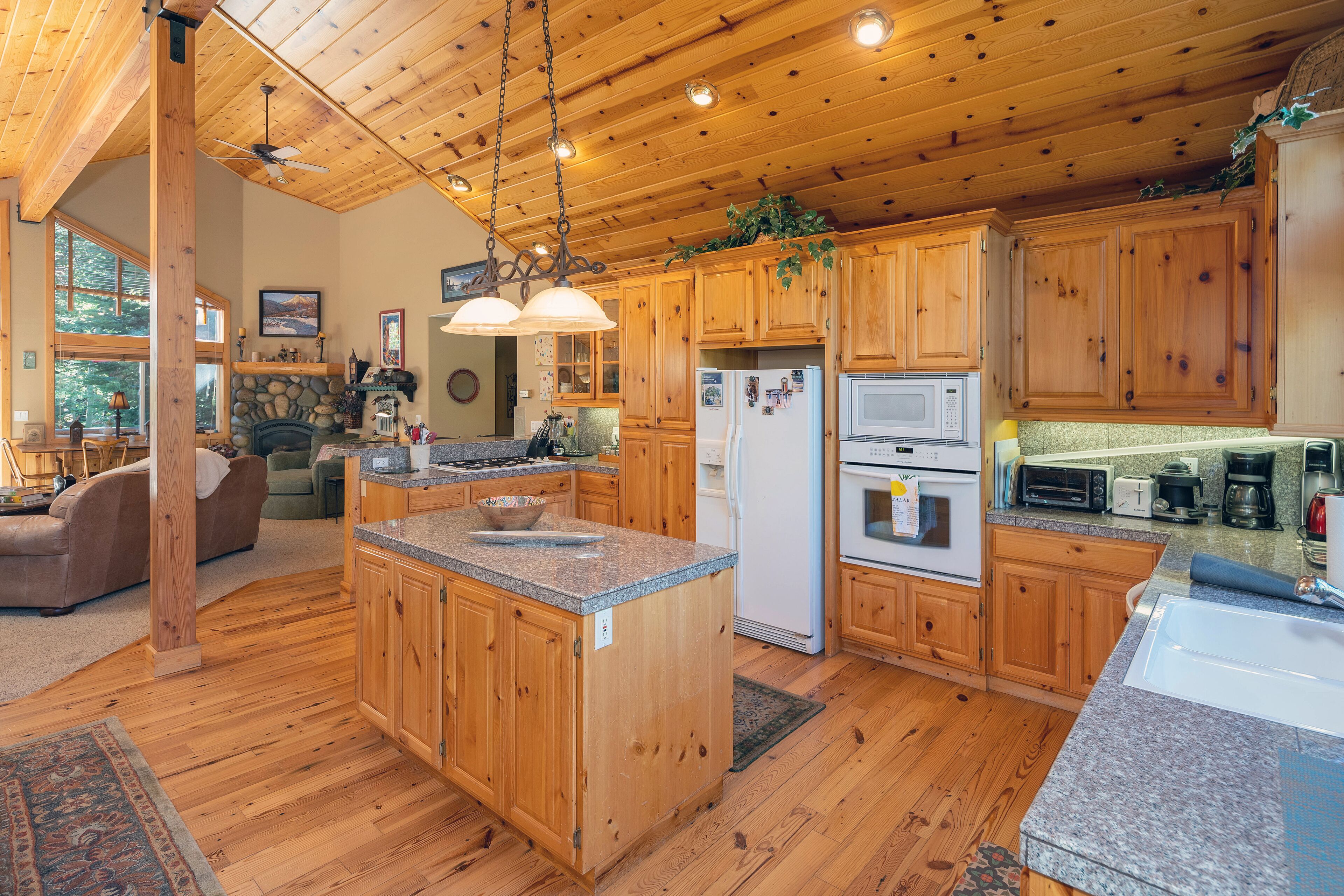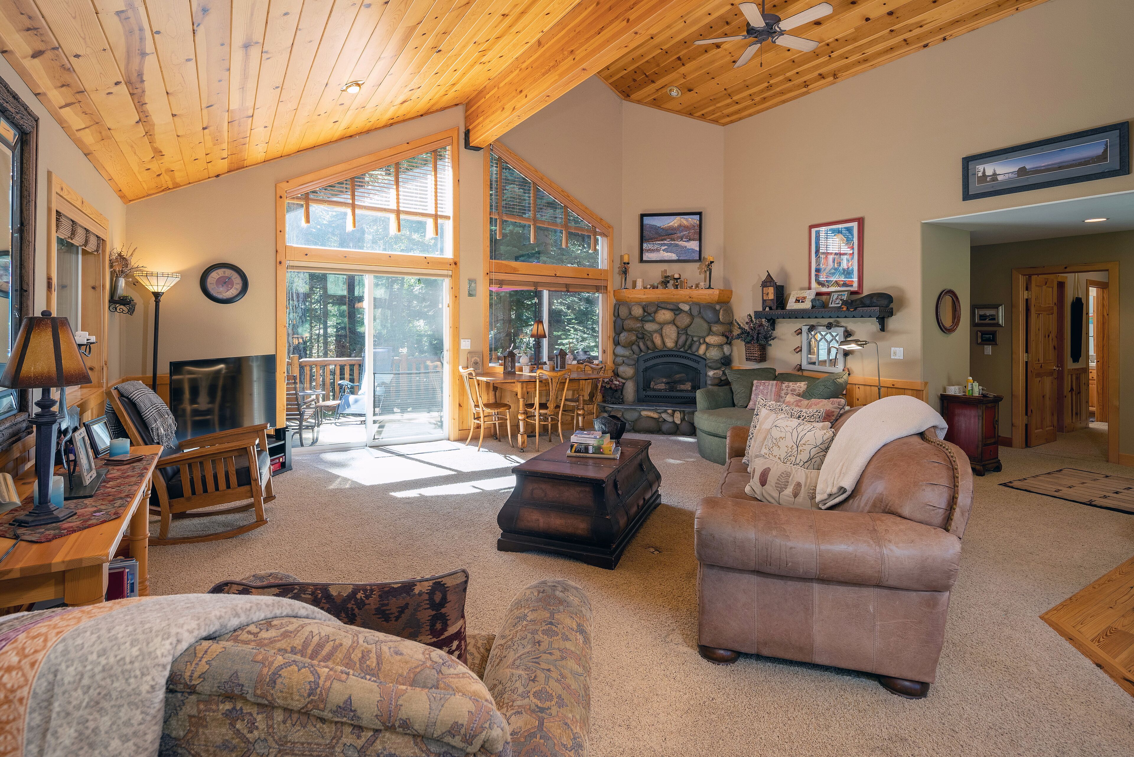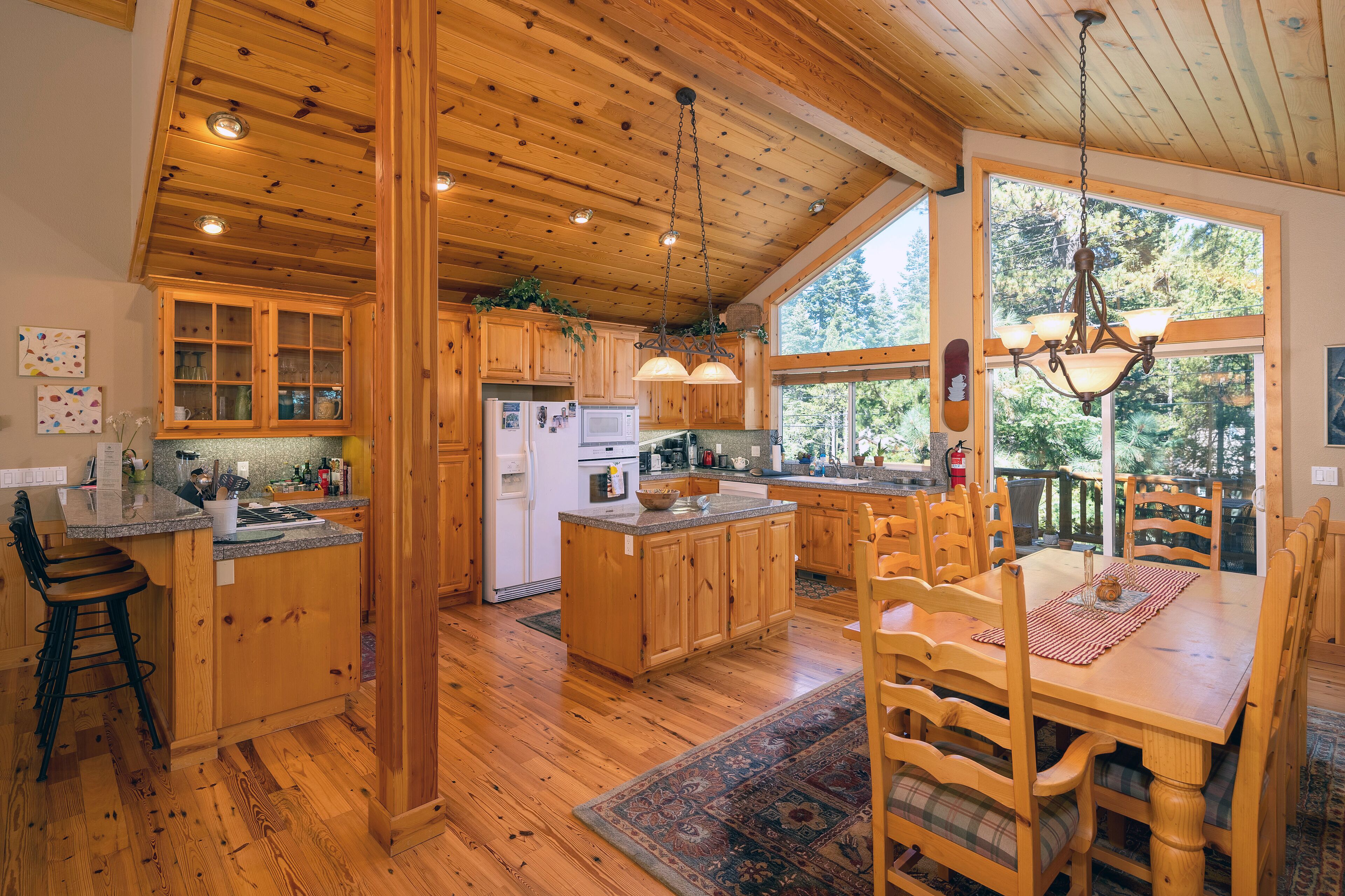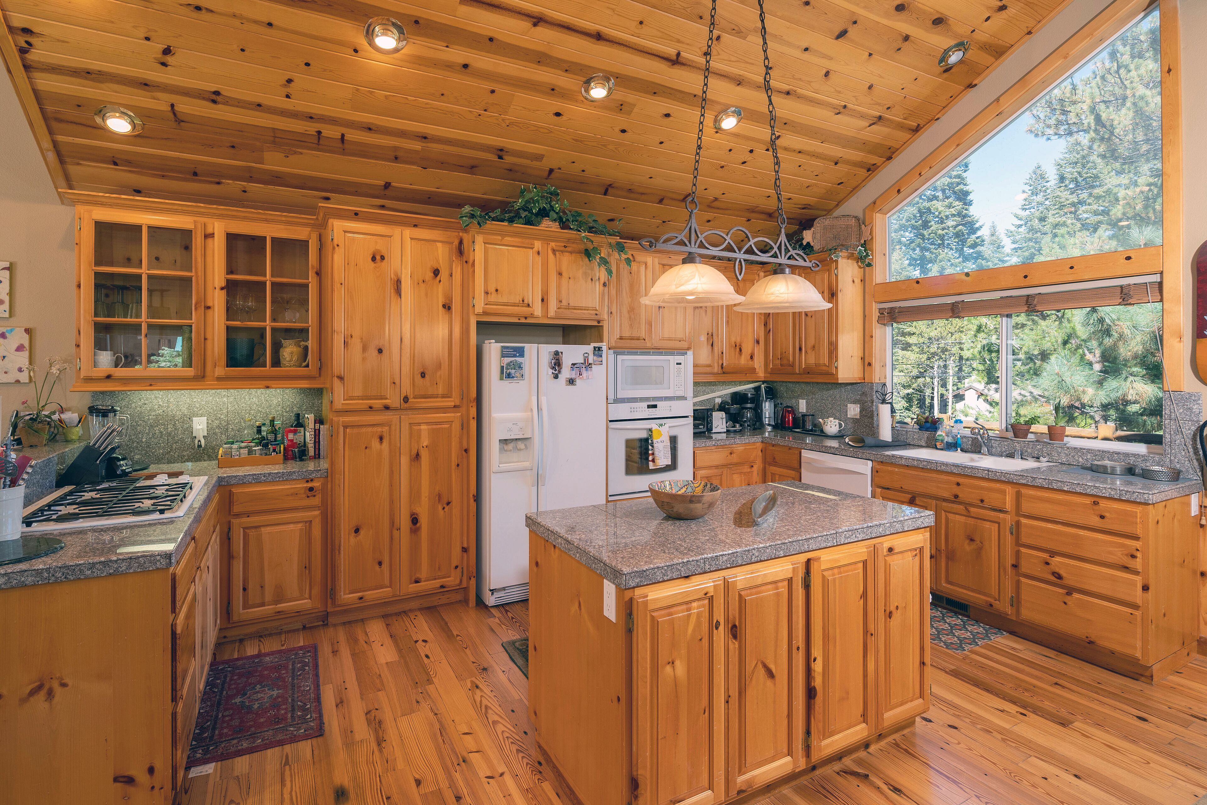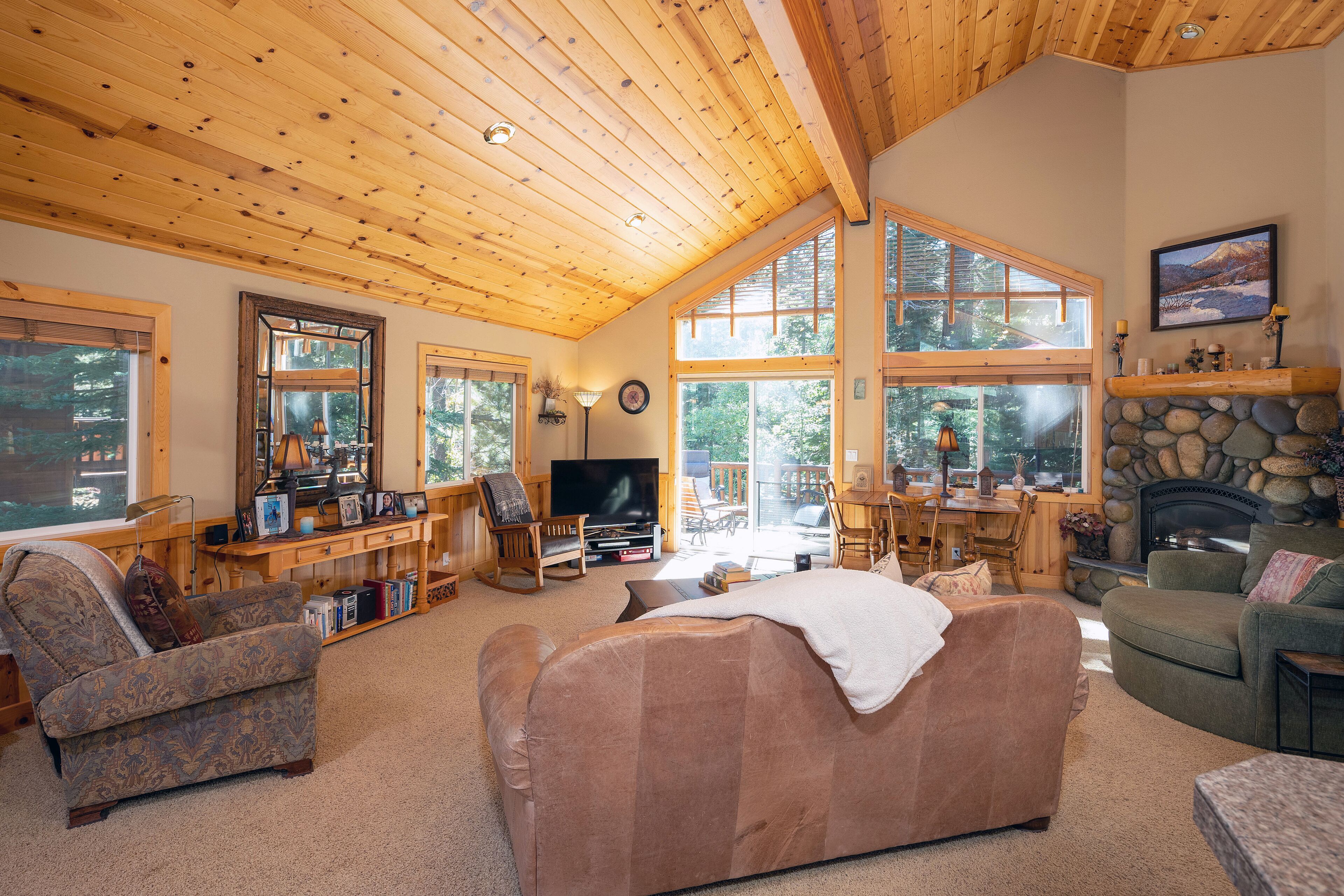 Homewood Heaven: Picturesque Classic Tahoe Cabin on West Shore ***PETS PROHIBITED**Peaceful, warm and open home in wonderful location. Custom mountain finishes include cathedral pine ceilings, pine trim throughout, gas fireplace surrounded by river rocks, granite counter tops in kitchen with island and separate counter for eating, natural autumn-color slate tile in bathrooms and many more lovely t...