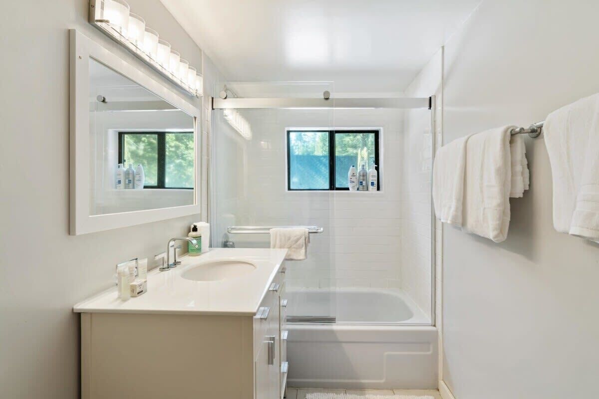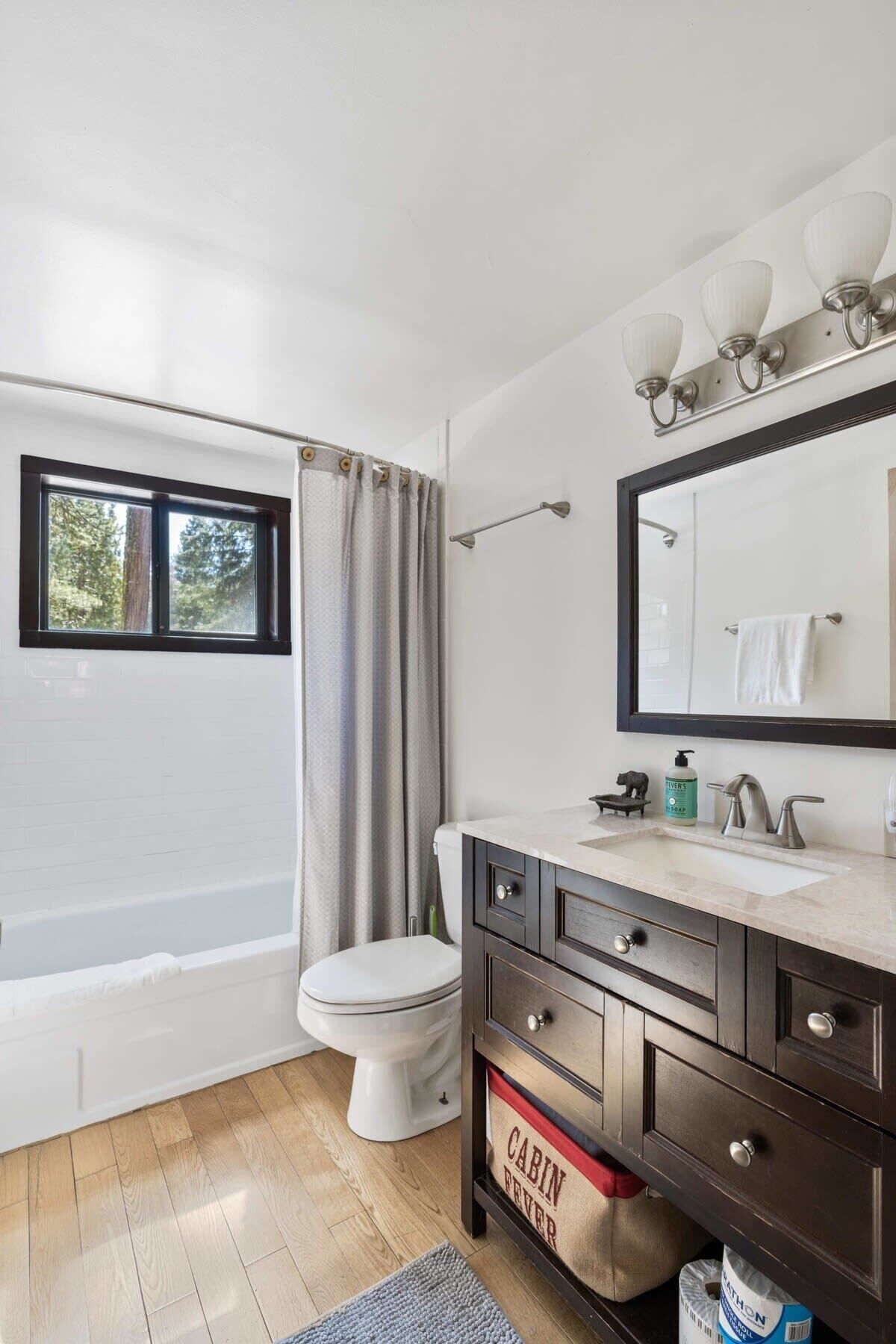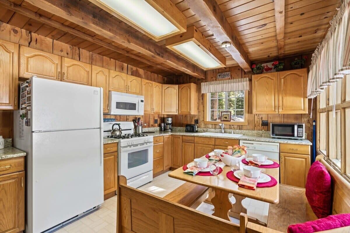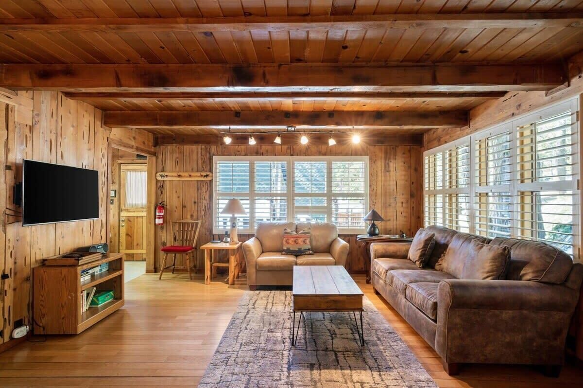 3BR Mountain Cabin Near Beach Slopes Summary:Escape to this classic 3-bedroom Tahoe cabin, a home brimming with rustic charm and all the comforts you need for a mountain retreat. Tucked away amidst the trees, you are just a 10-minute drive to the beach or city and less than 20 minutes from three ski resorts. Enjoy the convenience of being close to outdoor activities galore! Unwind in the spacious living room or bask in the sun on the inviting deck, the perfect abode to recharge after a day filled with adventure.The Space:Surrounded by trees in a tranquil setting, this charming three-bedroom, two-bathroom cabin has all the comforts you need for a mountain retreat for your group of up to 8. You will love looking out the large windows found throughout the home, filling the rooms with natural light and views overlooking the surrounding trees. Return to the home after a busy day of adventures where you will find a spacious kitchen and dining area, a large living room for socializing, cozy bedrooms, and a great private outdoor space.When you enter the home you will arrive at the bright and inviting living room where you will find a space filled with charm from the exposed wood beams lining the ceiling to the stone hearth wood fireplace. In the living room, you will find two 3-person couches, a loveseat, and a sofa chair. One of the couches doubles as a queen pull-out bed, providing additional sleeping accommodations if needed. The large room is a great, dynamic space for your group to socialize in while you warm up by the lovely fireplace. Or, enjoy a cozy movie night on the 44” TV while you snuggle up on the couches.Just off the living room is the fully equipped kitchen, where you will find everything you need to cook a great meal with your friends and family. The kitchen features a full range of appliances, spacious countertops, and a cozy dining space tucked next to a wall of windows. The dining table features bench seating with space for 6 and great views overlooking trees. A hallway off the living room leads to one full bathroom for shared use. This bright, all-white bathroom features a large single-sink vanity, under-the-sink cabinet space, and a shower/bathtub combo.When you are ready to settle in for the night, you will find three comfortable bedrooms in the home. The first bedroom is located downstairs in the hallway off the living room. This bedroom features a queen-size bed and beautiful floor-to-ceiling windows, making you feel as if you are sleeping outside under the trees. Head upstairs, and you will find two more bedrooms, providing a great separation of space between the bedrooms. The home’s master bedroom is located at the top of the stairs to the left and boasts a comfortable king-size bed in a log-bed frame, a cozy chair for reading, a mounted TV, and a large window overlooking the trees. The second upstairs bedroom features a full-size and a twin-size bed, making it a great room for families or little ones to share. A second full bathroom is comfortably located between the two upstairs bedrooms and features a large single-sink vanity with ample drawer storage space and a shower/bathtub combo.In the summer months, you will love utilizing the spacious wrap-around outdoor deck and private backyard. Sit outside at the bistro-style table with two chairs, or prepare a meal outside on the BBQ. The private backyard is perfect for those traveling with children, giving them an additional space to run and play while you relax on the deck.STR Permit Number: STR22-6798Guest Access:Guests will have access to the entire home and outdoor spaces, which include a private unfenced backyard. Guests will also have access to three parking places in the driveway in front of the home.The Neighborhood:Located on a quiet road surrounded by a beautiful forested area, this home is in an excellent location for enjoying everything Lake Tahoe has to offer. In the winter months the home places you near some of the best slopes in the area with both Alpine Meadows Ski Resort and Tahoe Ski Resort a 20-minute drive away, Tahoe Nordic Cross Country Center 15 minutes away, and Homewood Ski Resort just 6 minutes away. If you are looking for some great XC skiing or snowshoeing, you are just minutes away from the popular trails at Paige Meadows.During the summer months, head to Commons Beach, a popular four-acre beach and park less than 10 minutes away. Here you can rent any type of watercraft imaginable, and enjoy great swimming, and BBQ areas. Or, make a quick 5-minute drive up the road to the famous Sunnyside Restaurant and Marina, where you can find great food and watercraft rentals. You are also nearby the Lake Tahoe Bike Path, or if some high alpine hiking is what you are into, Paige Meadows is only an 8-minute drive up the hill where you will find beautiful meadows lined with a vast network of trails that connect you to the Pacific Crest Trail and the Tahoe Rim Trail.For those in your group looking for a little less outdoor time, Tahoe City is less than a 10-minute drive where you will find many cute boutique shops, a wide variety of bars and restaurants, farmers markets, and live music. When it comes to a great location for everything Lake Tahoe has to offer, this house cannot be beaten!Getting Around:Guests at this home can easily explore all the area has to offer even without a vehicle thanks to the public transportation TART stop that is just a few minutes walk from your front door! Less than half a mile from the home is the TART stop HWY 89 Timberland DR Lakeside which runs every hour. Be in Tahoe City with an under 10-minute bus ride and be able to easily connect to other routes taking you around the surrounding areas and to the ski resorts. For those with a vehicle, enjoy the home’s close driving proximity to Tahoe City where you can drive to in 8 minutes, and even use the FREE park-and-ride to reach locations such as Olympic Park and Northstar California Resort. With HWY 89 just minutes away, 