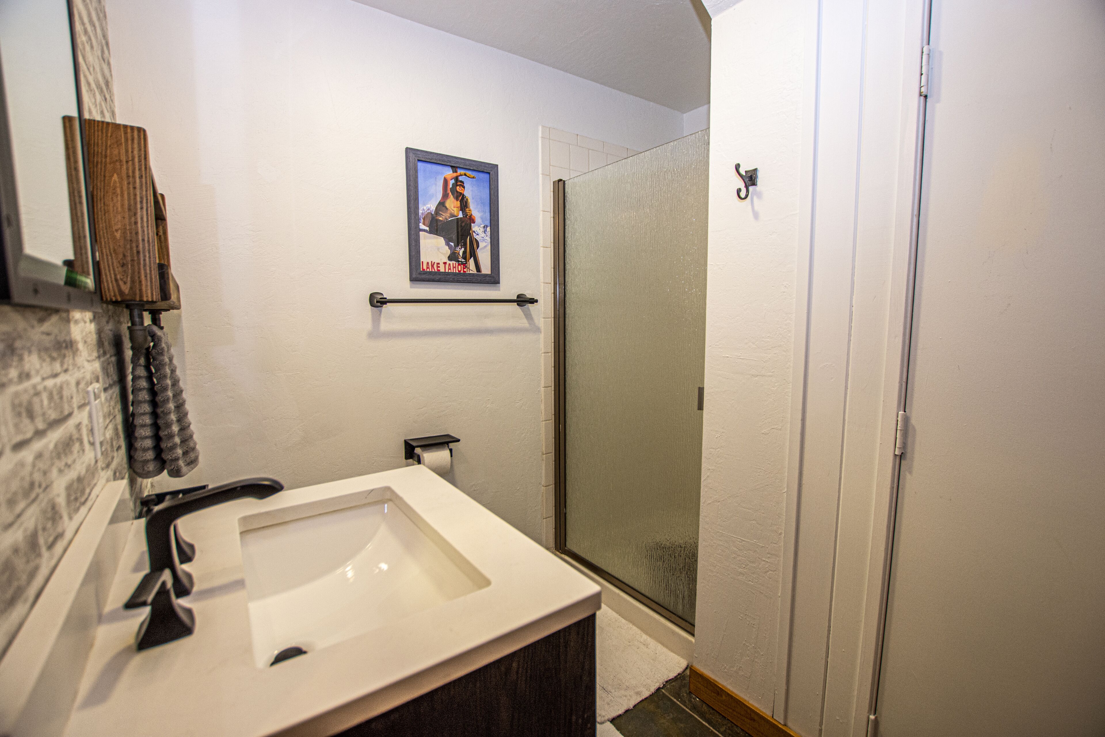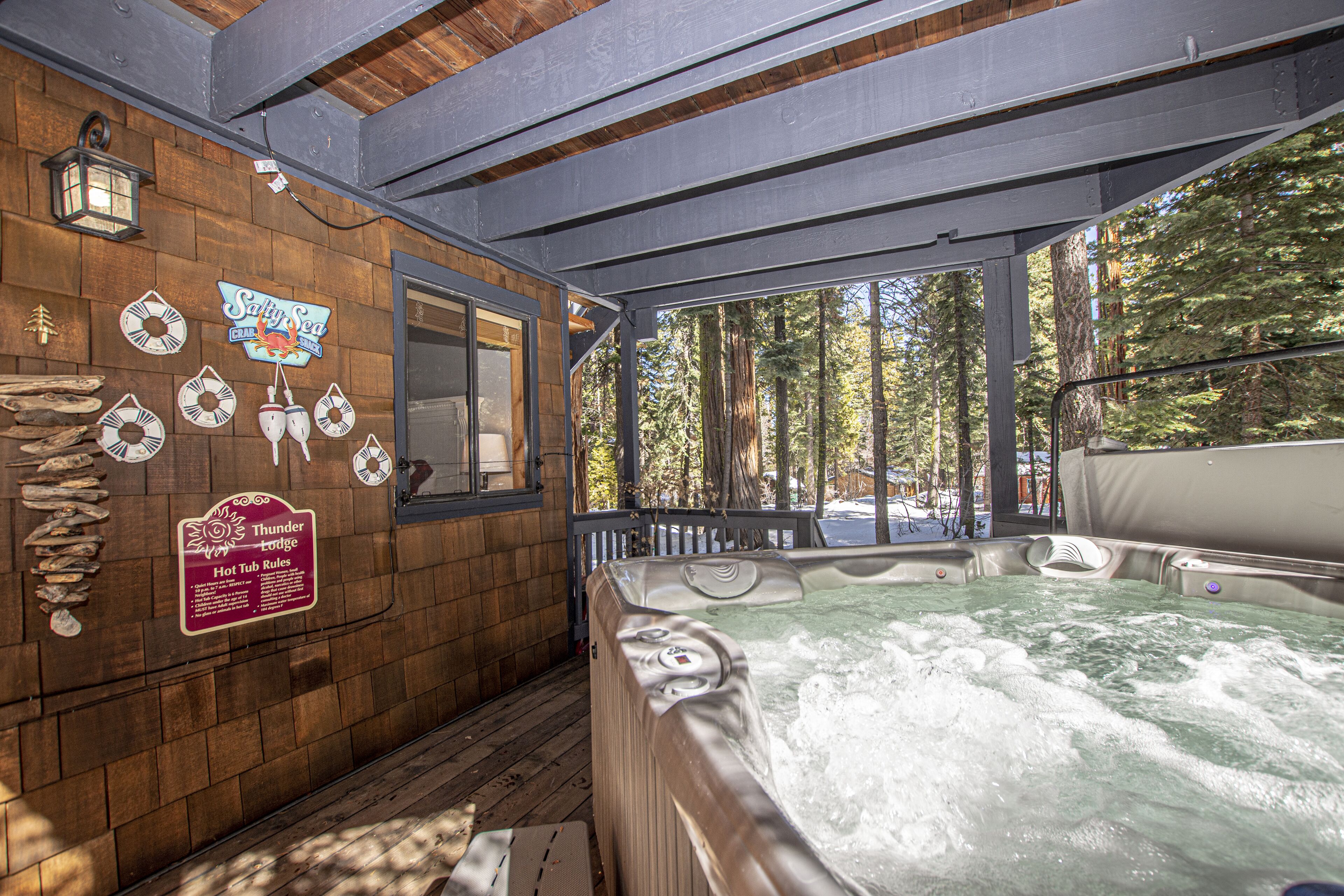 Thunder Lodge: 3 BR / 2.5 BA cabin on West Shore, Sleeps 6. Hot tub & sauna! **PETS PROHIBITED**Welcome to Thunder Lodge, a luxe mountain retreat on the West Shore of Lake Tahoe. Centrally located for easy access to all your Tahoe adventures, this beautiful 3 bedroom, 2.5 bathroom home is a perfect getaway for up to 6 guests. All 3 bedrooms are on the lower level; one with a King, one with a Queen...