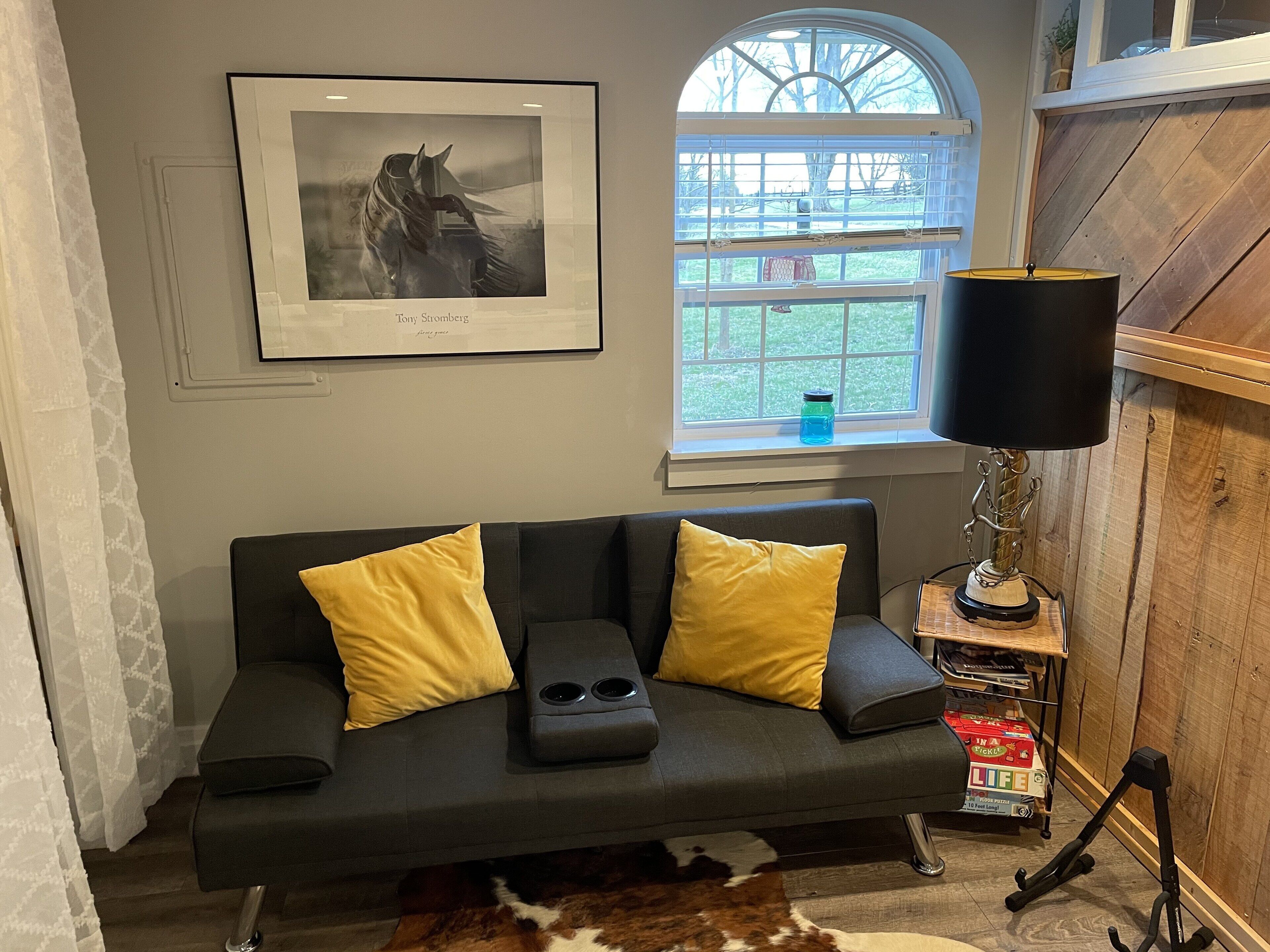 Beautiful Cottage in Gorgeous Rural Setting This quaint little cottage is located on the Bourbon Trail of Kentucky on a historic property. A mere 9 minutes from Six-Mile Distillery, it is also in close proximity to a gas station, grocery and library. Located in the heart of an Amish community, you will hear horses and buggies clip-clopping past as you sip your morning coffee. This cottage is on a functioning farm with horses, cats, goats and a donkey, with overnight housing facilities for your own equines as well.It has a queen sized bed and a twin sized futon. ***Our friends with service animals should be aware we have a livestock guardian for keeping our goats safe from coyotes. She takes her job seriously and cannot differentiate between a coyote or a service dog. We cannot guarantee the safety of your service animal should you choose to book this location.