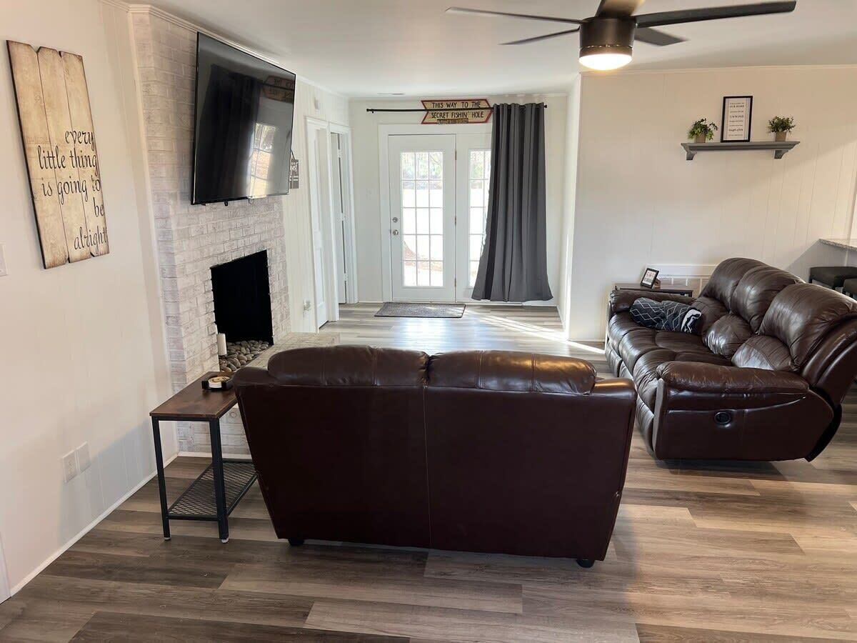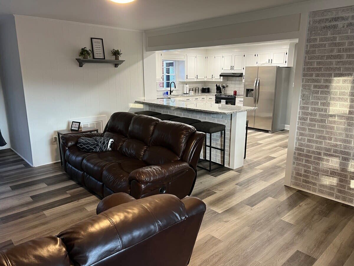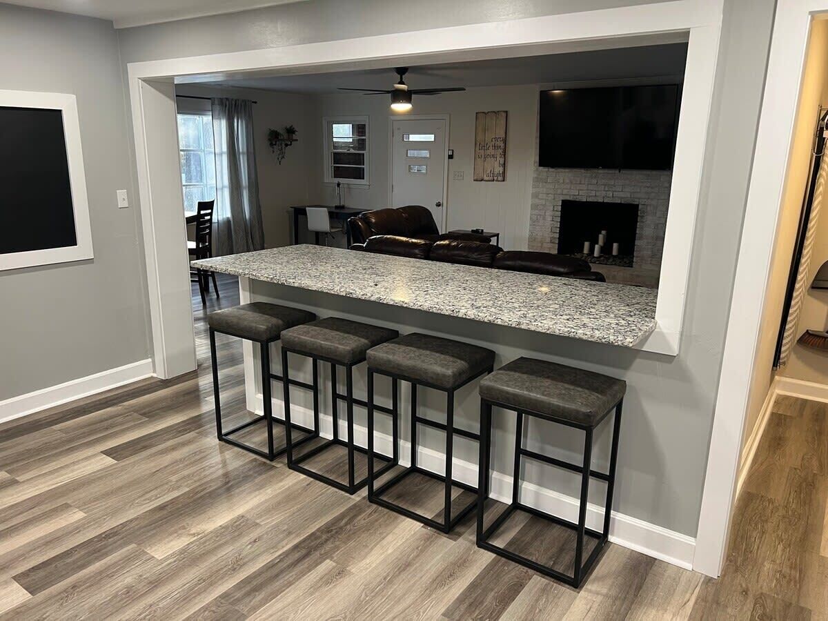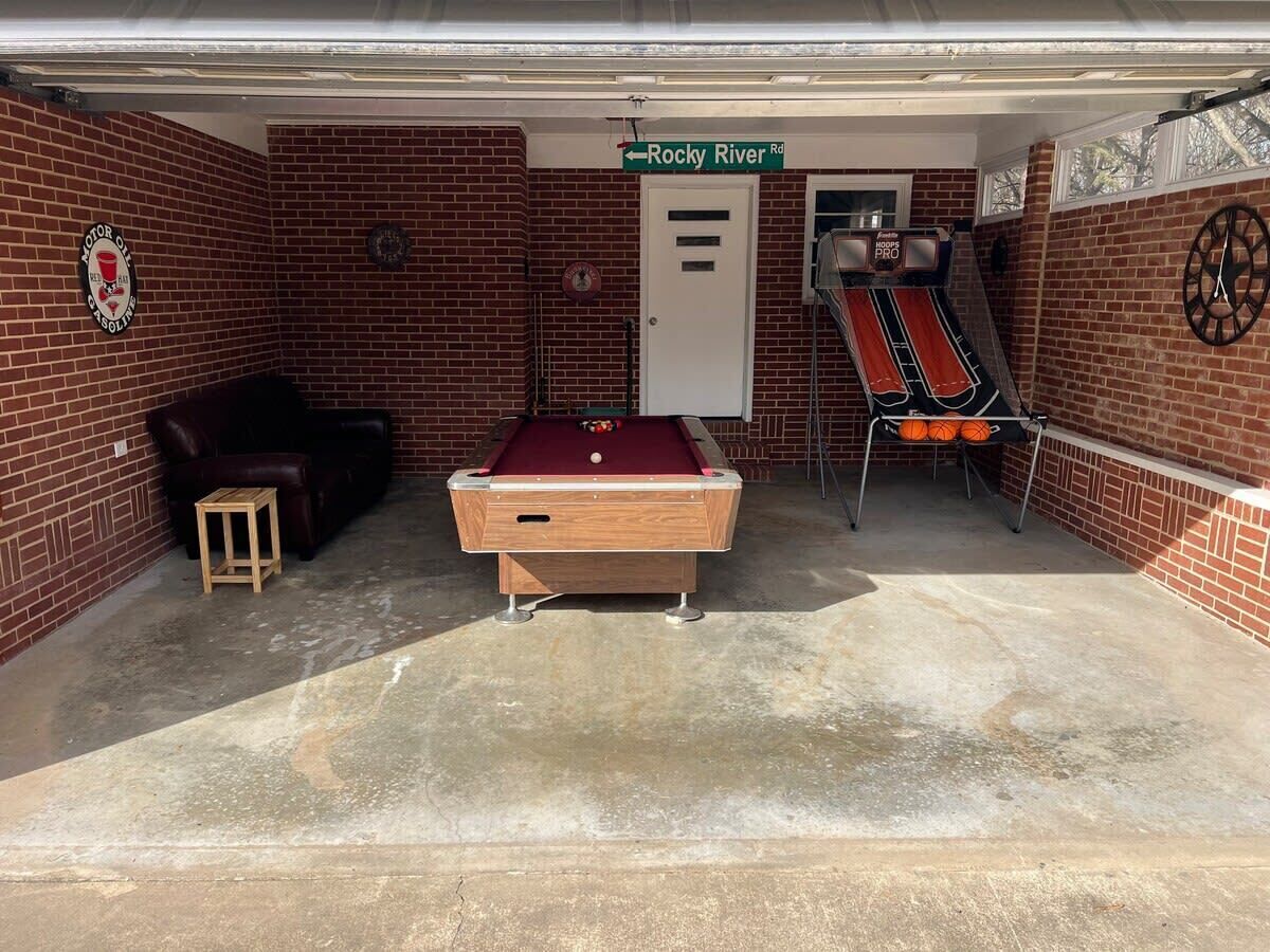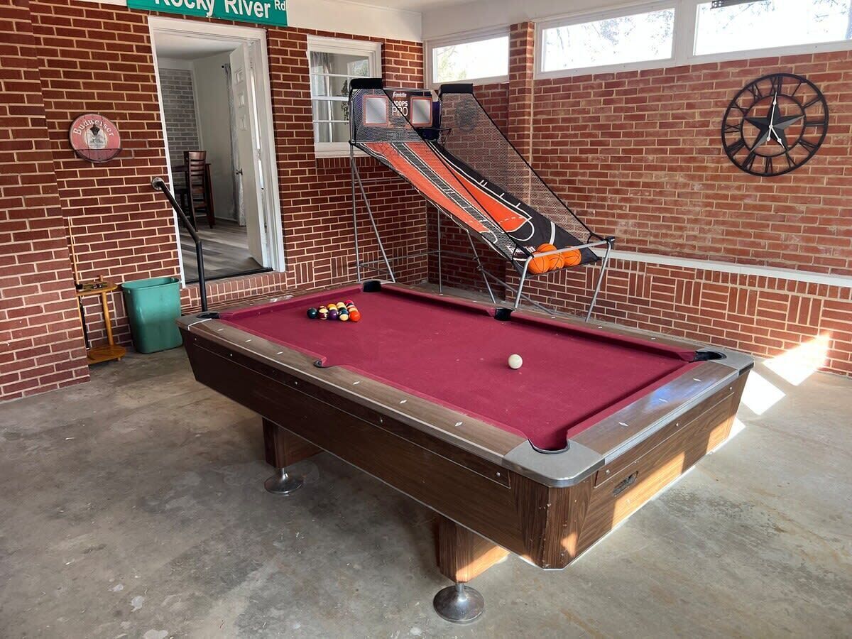 Spacious ranch in the country that has it all. This brick ranch is newly renovated and ready for guests. It offers 3 acres with tons of room for family get togethers. A creek runs beside the property and you can relax on the patio and enjoy a cup of coffee and watch the deer each morning and afternoon. The house has 5 bedrooms, 3 full baths, two living rooms and a game room with a roll up door so you can bring the outside in.The Rocky River house offers 5 bedrooms including a master bedroom with an ensuite bathroom, tv, ceiling fan and french doors leading to the patio. Bedrooms 2, 3 and 4 offer Queen bedrooms, ceiling fans and tv's while the 5th bedroom offers two twin beds and a tv. There are 3 full bathrooms in the house; the master ensuite and hall bathroom feature bathtubs while the third bathroom offers a walk-in shower. There is a large fully stocked kitchen, laundry room, a bar that seats 8 as well as a pub table that seats 4. There is a large living room off the kitchen featuring a 70" tv as well as another large living room with a 58" tv. The garage has been converted to a game room and includes a pool table. The large back patio includes a patio table, gas grill, charcoal grill, string lights and a fire pit. While the house is pet friendly (must be pre-approved first) the yard is NOT fenced. There is also a small swing set for the little ones.