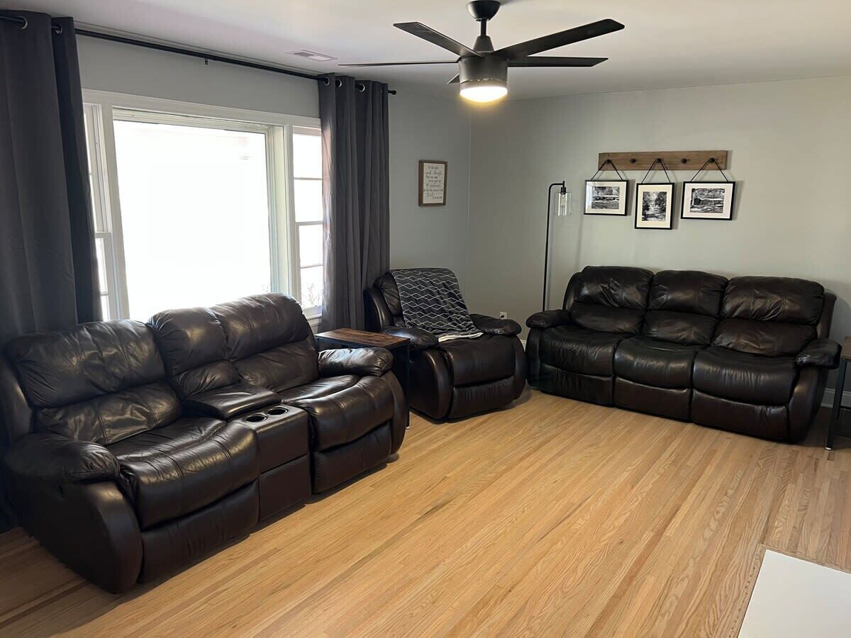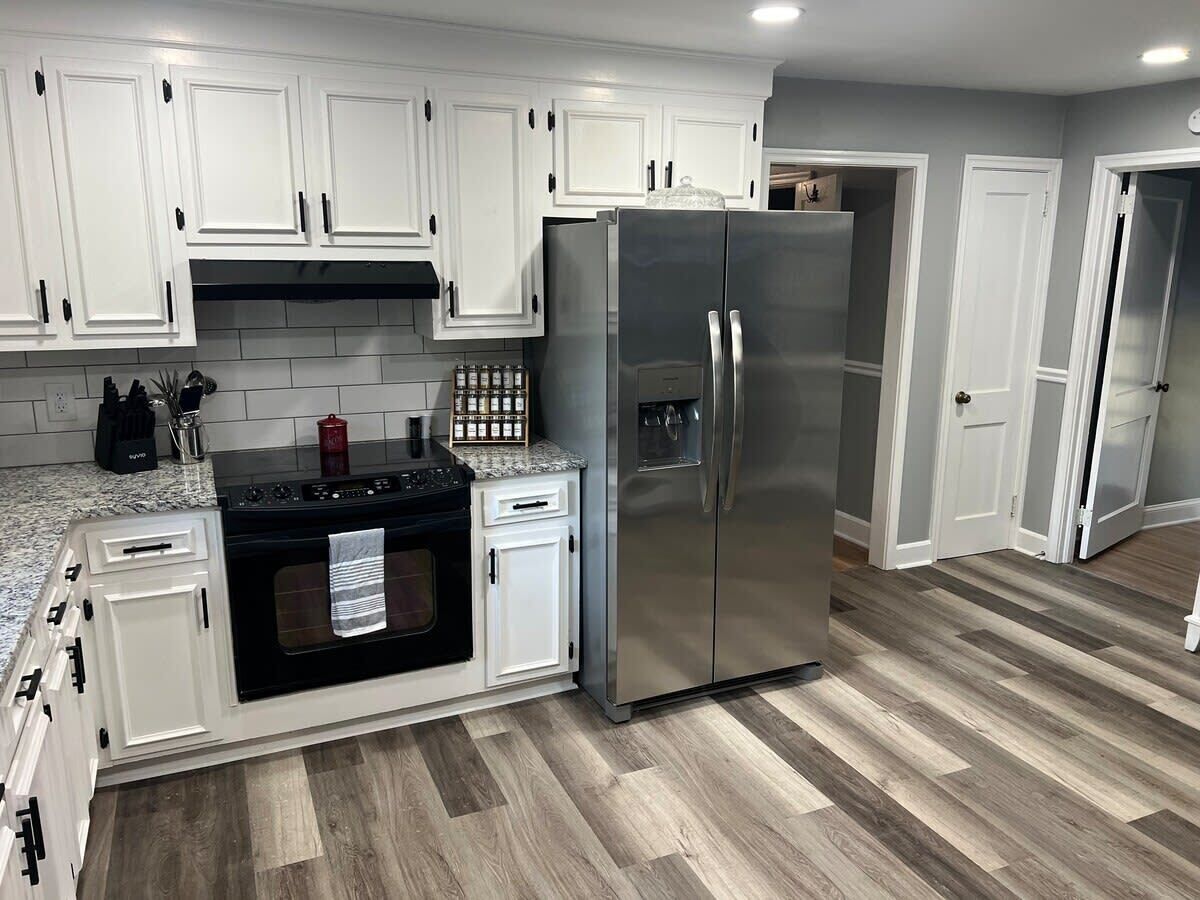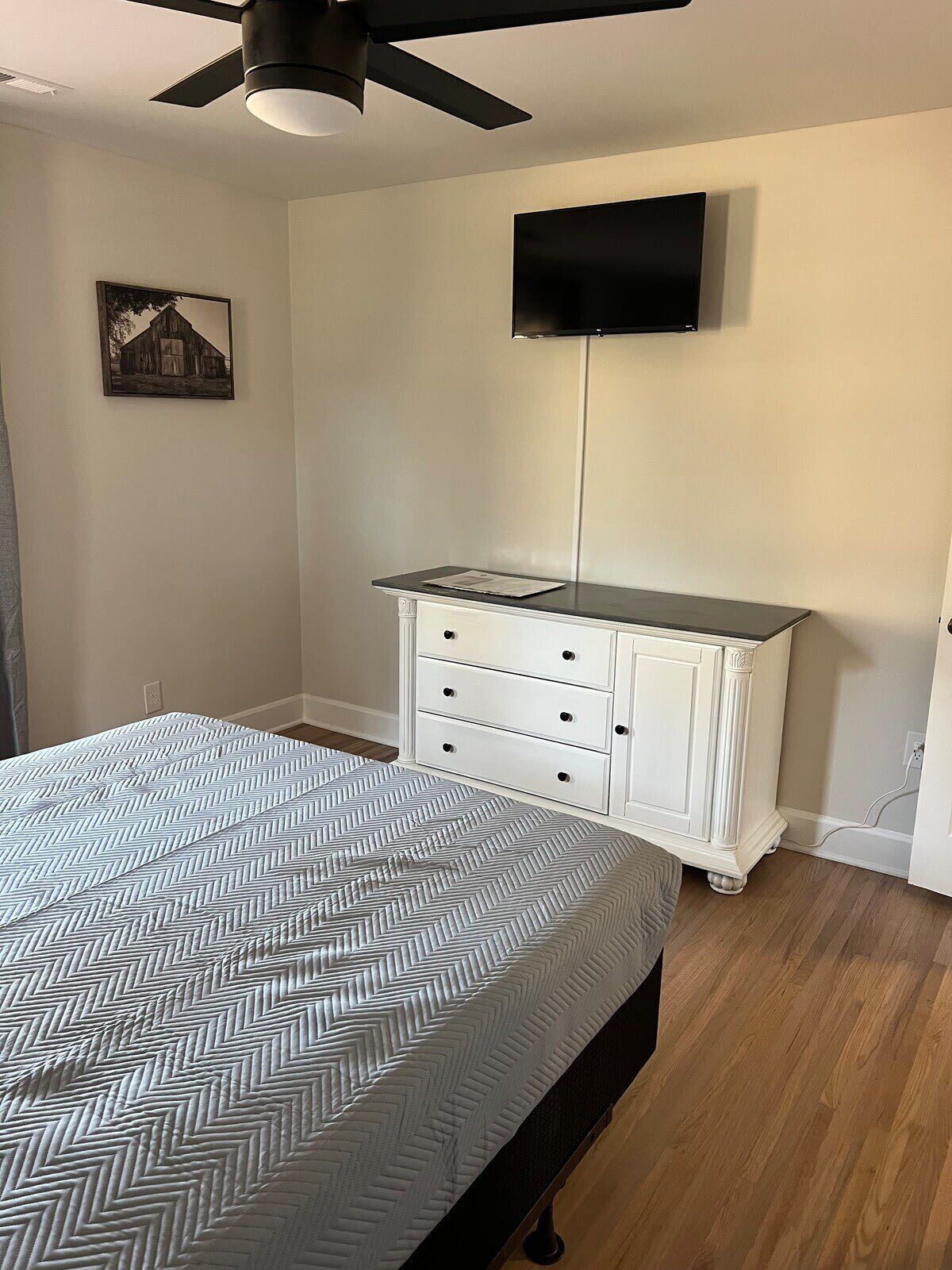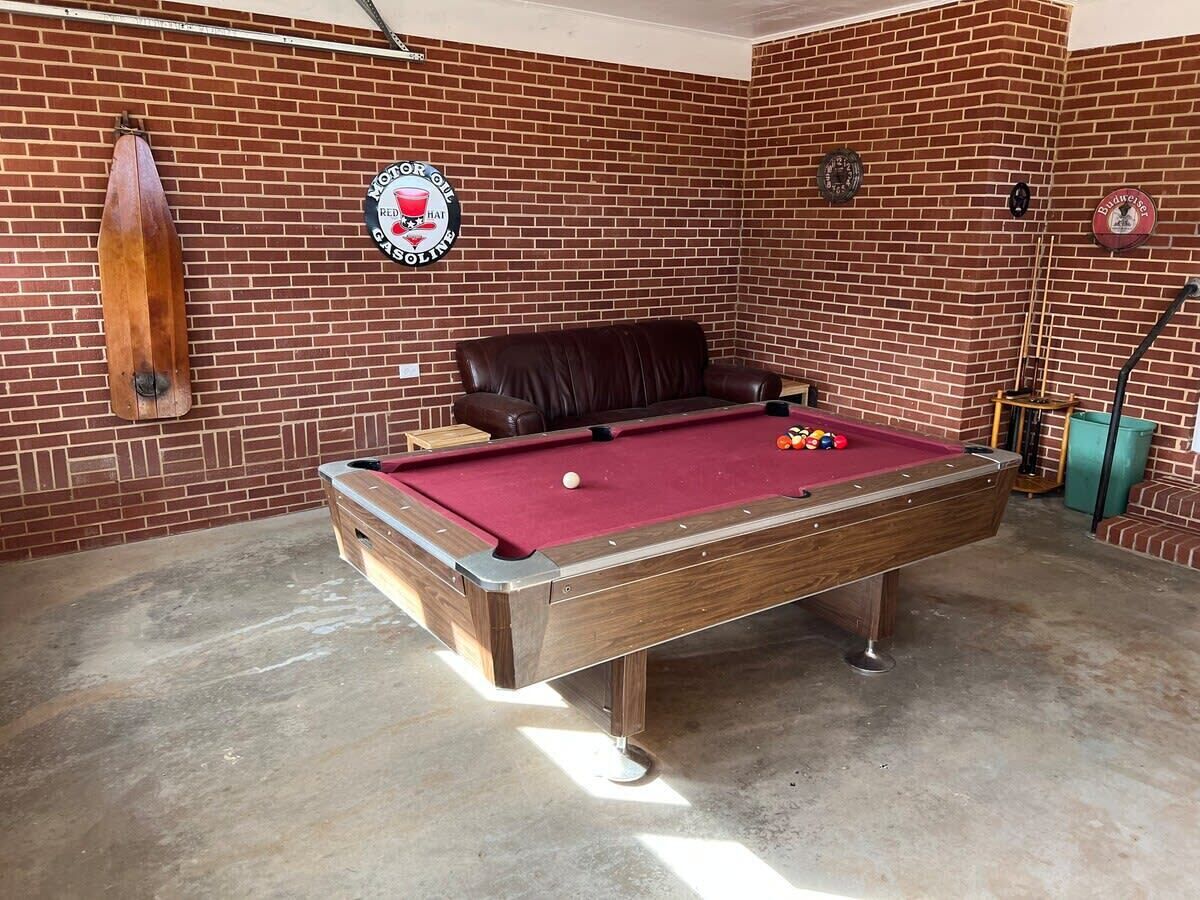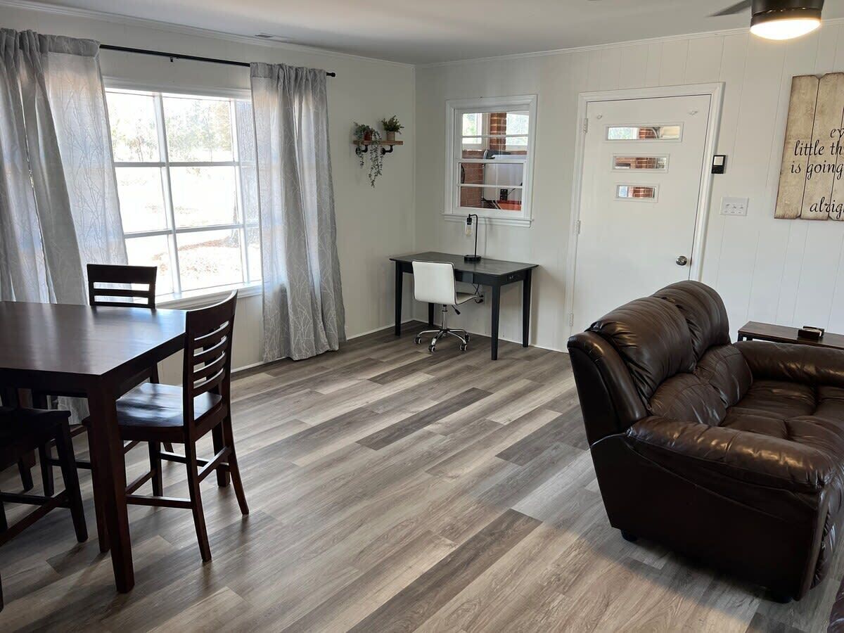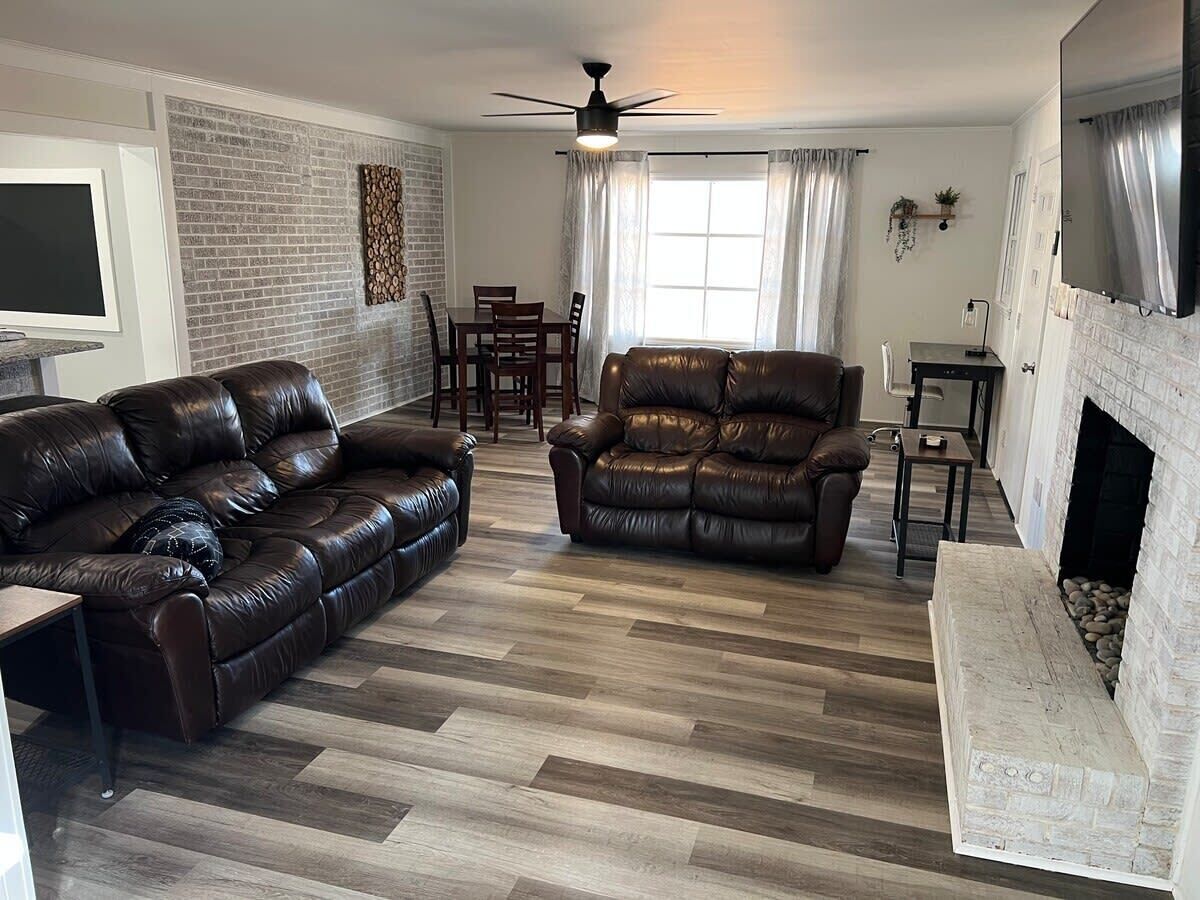 Spacious ranch in the country that has it all. This brick ranch is newly renovated and ready for guests. It offers 3 acres with tons of room for family get togethers. A creek runs beside the property and you can relax on the patio and enjoy a cup of coffee and watch the deer each morning and afternoon. The house has 5 bedrooms, 3 full baths, two living rooms and a game room with a roll up door so you can bring the outside in.The Rocky River house offers 5 bedrooms including a master bedroom with an ensuite bathroom, tv, ceiling fan and french doors leading to the patio. Bedrooms 2, 3 and 4 offer Queen bedrooms, ceiling fans and tv's while the 5th bedroom offers two twin beds and a tv. There are 3 full bathrooms in the house; the master ensuite and hall bathroom feature bathtubs while the third bathroom offers a walk-in shower. There is a large fully stocked kitchen, laundry room, a bar that seats 8 as well as a pub table that seats 4. There is a large living room off the kitchen featuring a 70" tv as well as another large living room with a 58" tv. The garage has been converted to a game room and includes a pool table. The large back patio includes a patio table, gas grill, charcoal grill, string lights and a fire pit. While the house is pet friendly (must be pre-approved first) the yard is NOT fenced. There is also a small swing set for the little ones.