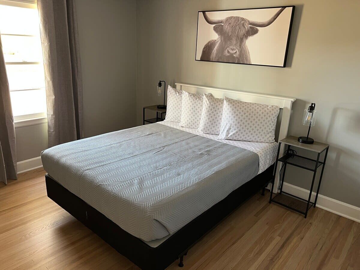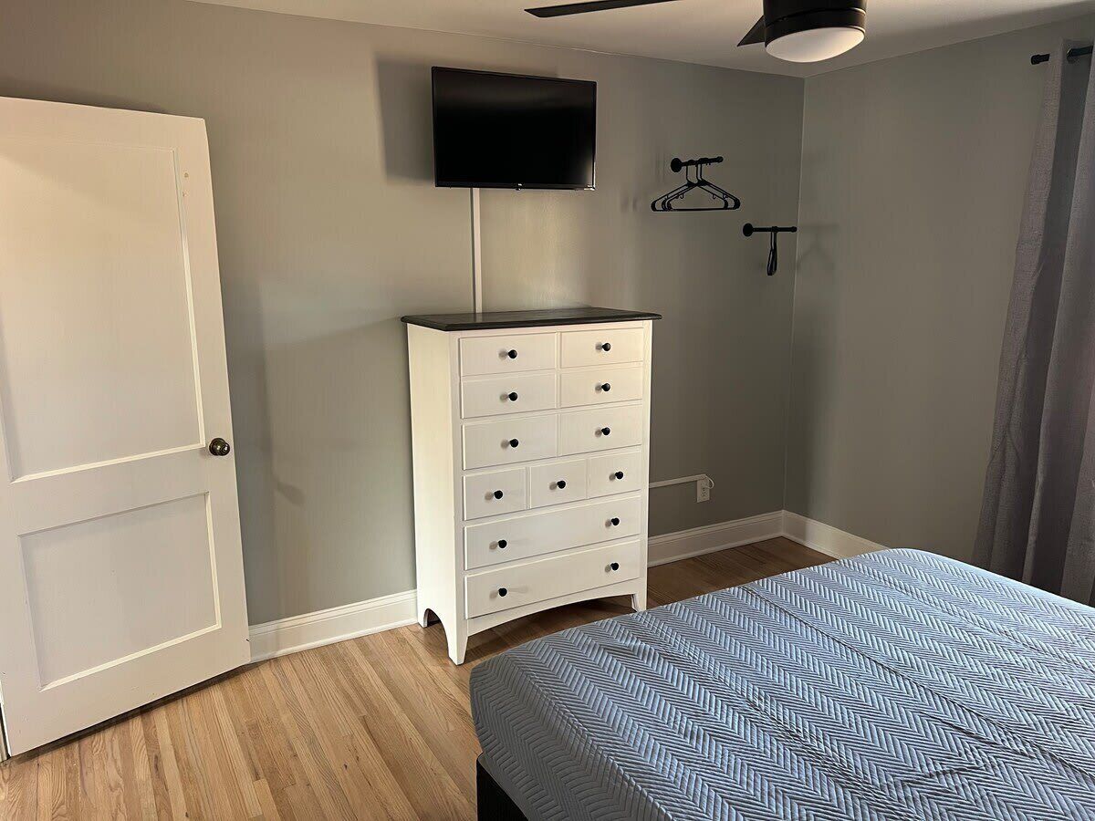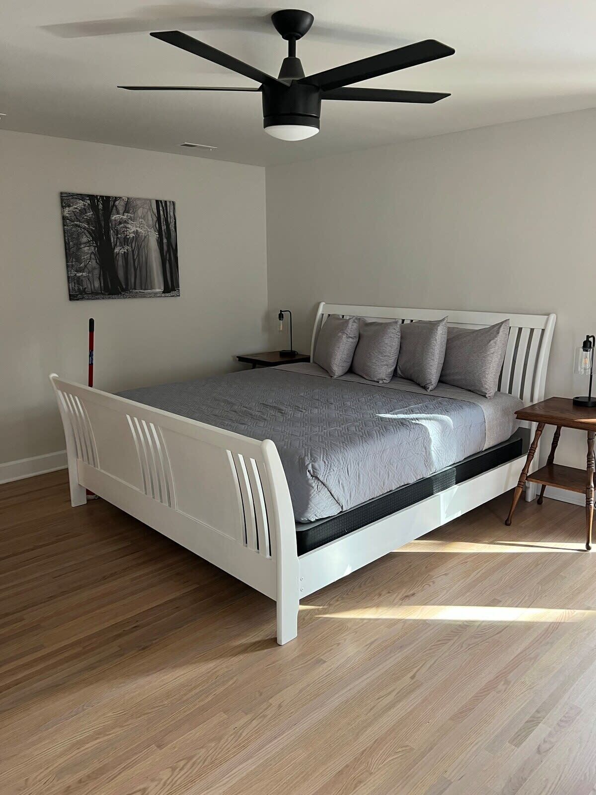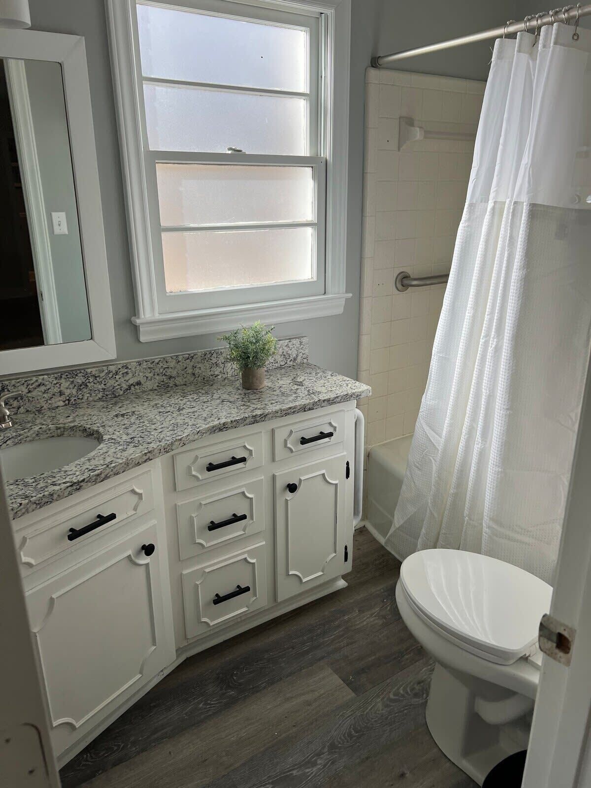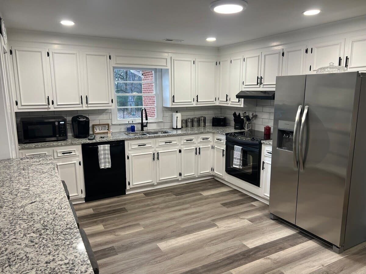 Spacious ranch in the country that has it all. This brick ranch is newly renovated and ready for guests. It offers 3 acres with tons of room for family get togethers. A creek runs beside the property and you can relax on the patio and enjoy a cup of coffee and watch the deer each morning and afternoon. The house has 5 bedrooms, 3 full baths, two living rooms and a game room with a roll up door so you can bring the outside in.The Rocky River house offers 5 bedrooms including a master bedroom with an ensuite bathroom, tv, ceiling fan and french doors leading to the patio. Bedrooms 2, 3 and 4 offer Queen bedrooms, ceiling fans and tv's while the 5th bedroom offers two twin beds and a tv. There are 3 full bathrooms in the house; the master ensuite and hall bathroom feature bathtubs while the third bathroom offers a walk-in shower. There is a large fully stocked kitchen, laundry room, a bar that seats 8 as well as a pub table that seats 4. There is a large living room off the kitchen featuring a 70" tv as well as another large living room with a 58" tv. The garage has been converted to a game room and includes a pool table. The large back patio includes a patio table, gas grill, charcoal grill, string lights and a fire pit. While the house is pet friendly (must be pre-approved first) the yard is NOT fenced. There is also a small swing set for the little ones.