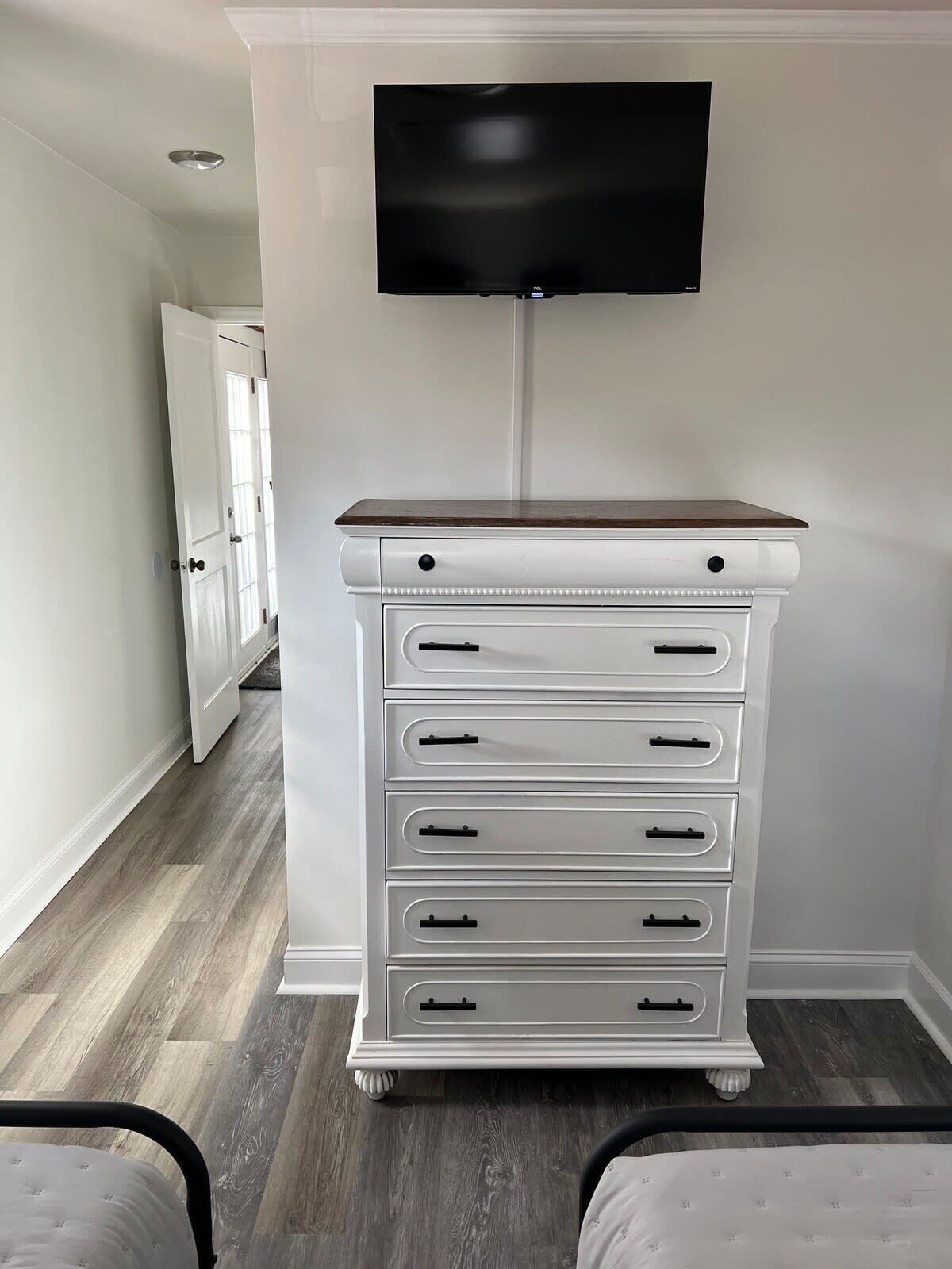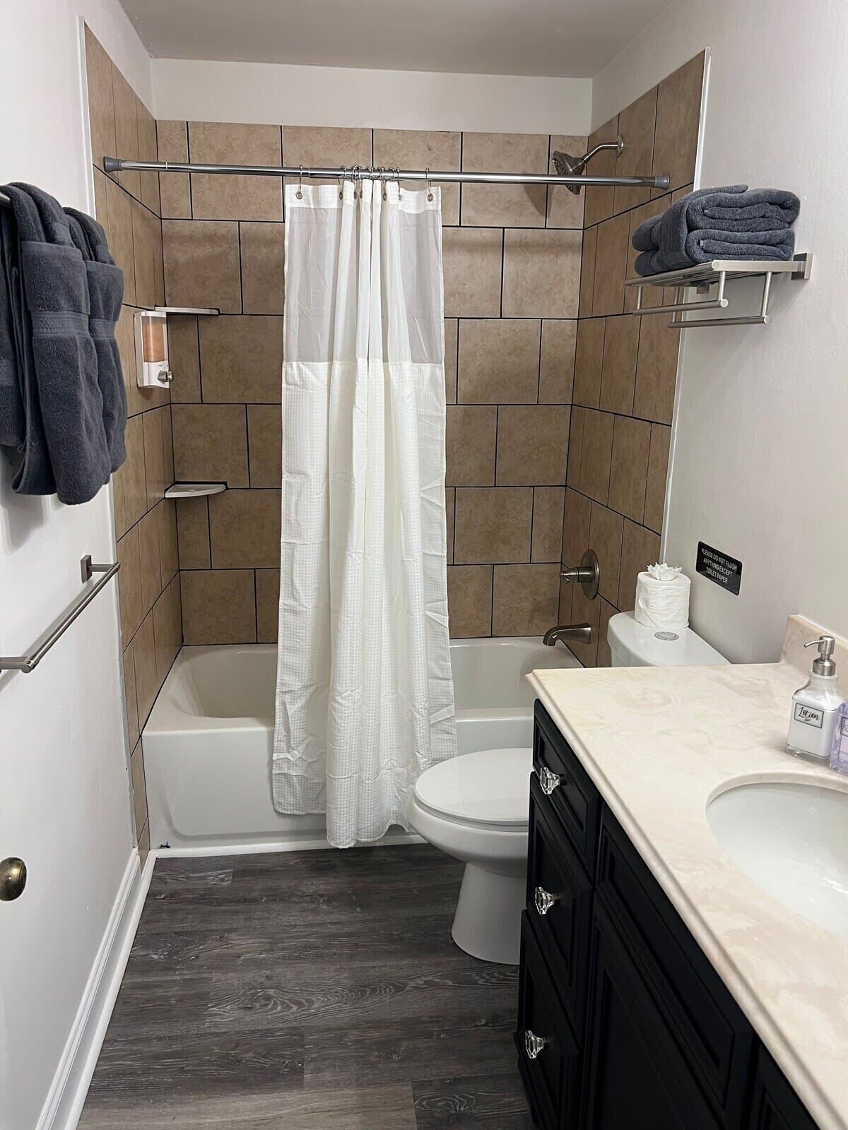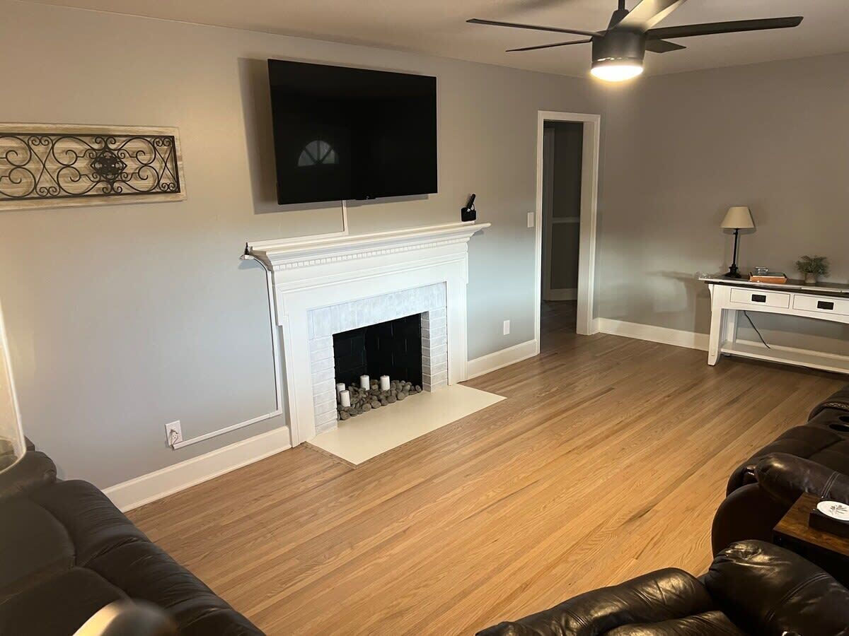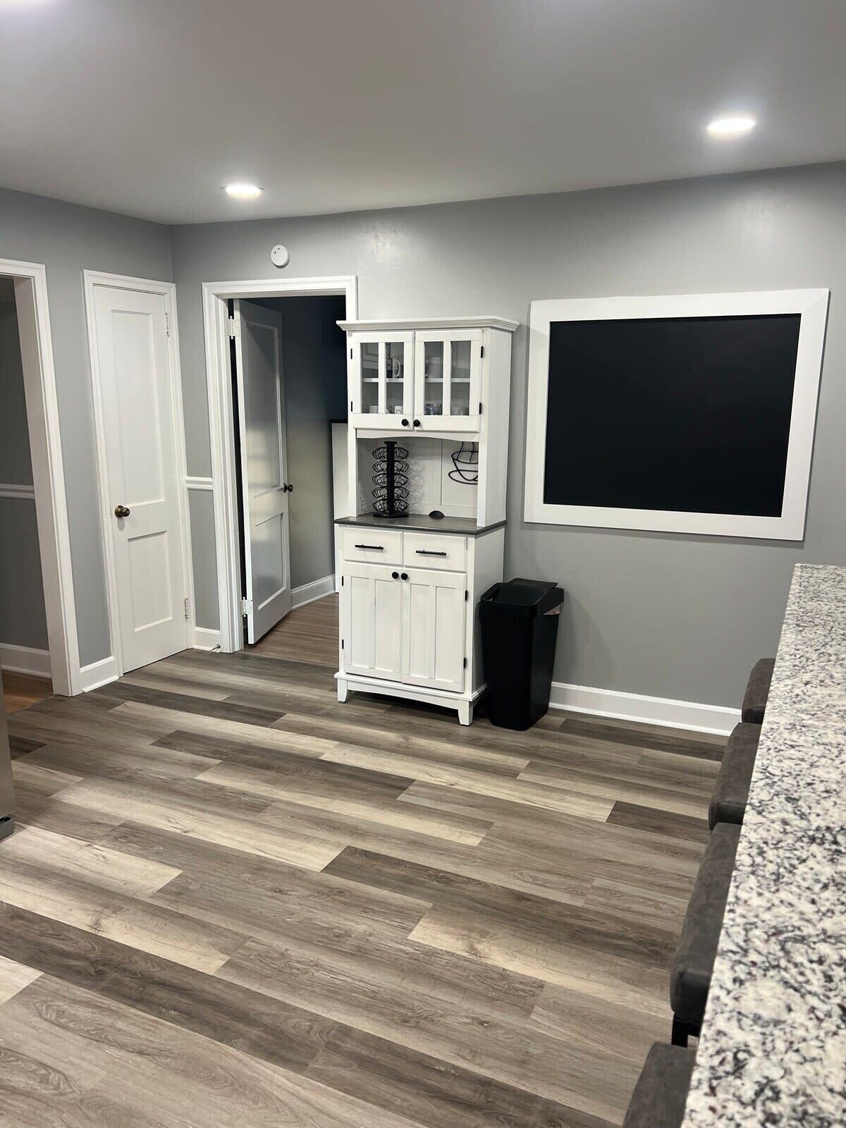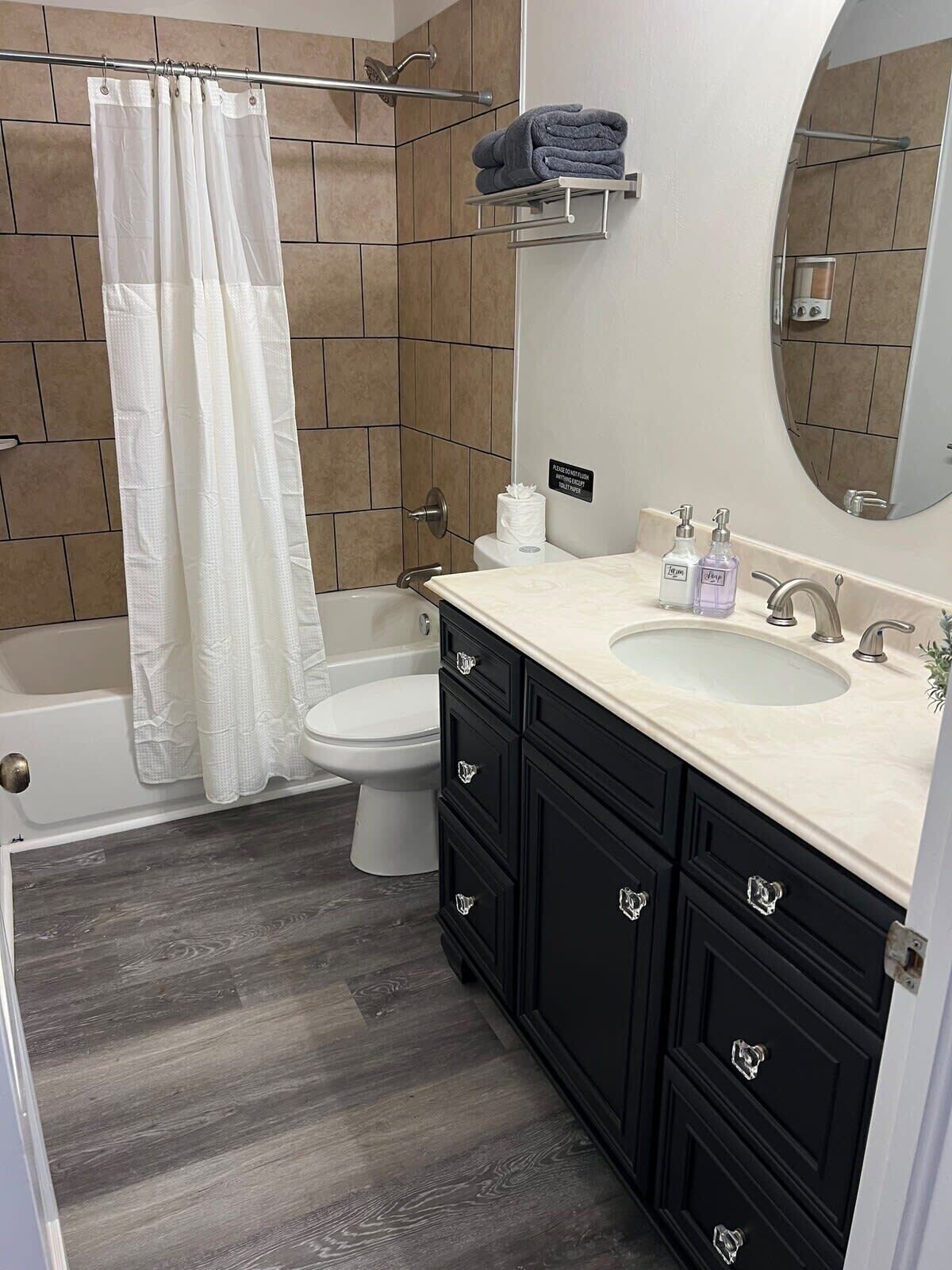 Spacious ranch in the country that has it all. This brick ranch is newly renovated and ready for guests. It offers 3 acres with tons of room for family get togethers. A creek runs beside the property and you can relax on the patio and enjoy a cup of coffee and watch the deer each morning and afternoon. The house has 5 bedrooms, 3 full baths, two living rooms and a game room with a roll up door so you can bring the outside in.The Rocky River house offers 5 bedrooms including a master bedroom with an ensuite bathroom, tv, ceiling fan and french doors leading to the patio. Bedrooms 2, 3 and 4 offer Queen bedrooms, ceiling fans and tv's while the 5th bedroom offers two twin beds and a tv. There are 3 full bathrooms in the house; the master ensuite and hall bathroom feature bathtubs while the third bathroom offers a walk-in shower. There is a large fully stocked kitchen, laundry room, a bar that seats 8 as well as a pub table that seats 4. There is a large living room off the kitchen featuring a 70" tv as well as another large living room with a 58" tv. The garage has been converted to a game room and includes a pool table. The large back patio includes a patio table, gas grill, charcoal grill, string lights and a fire pit. While the house is pet friendly (must be pre-approved first) the yard is NOT fenced. There is also a small swing set for the little ones.