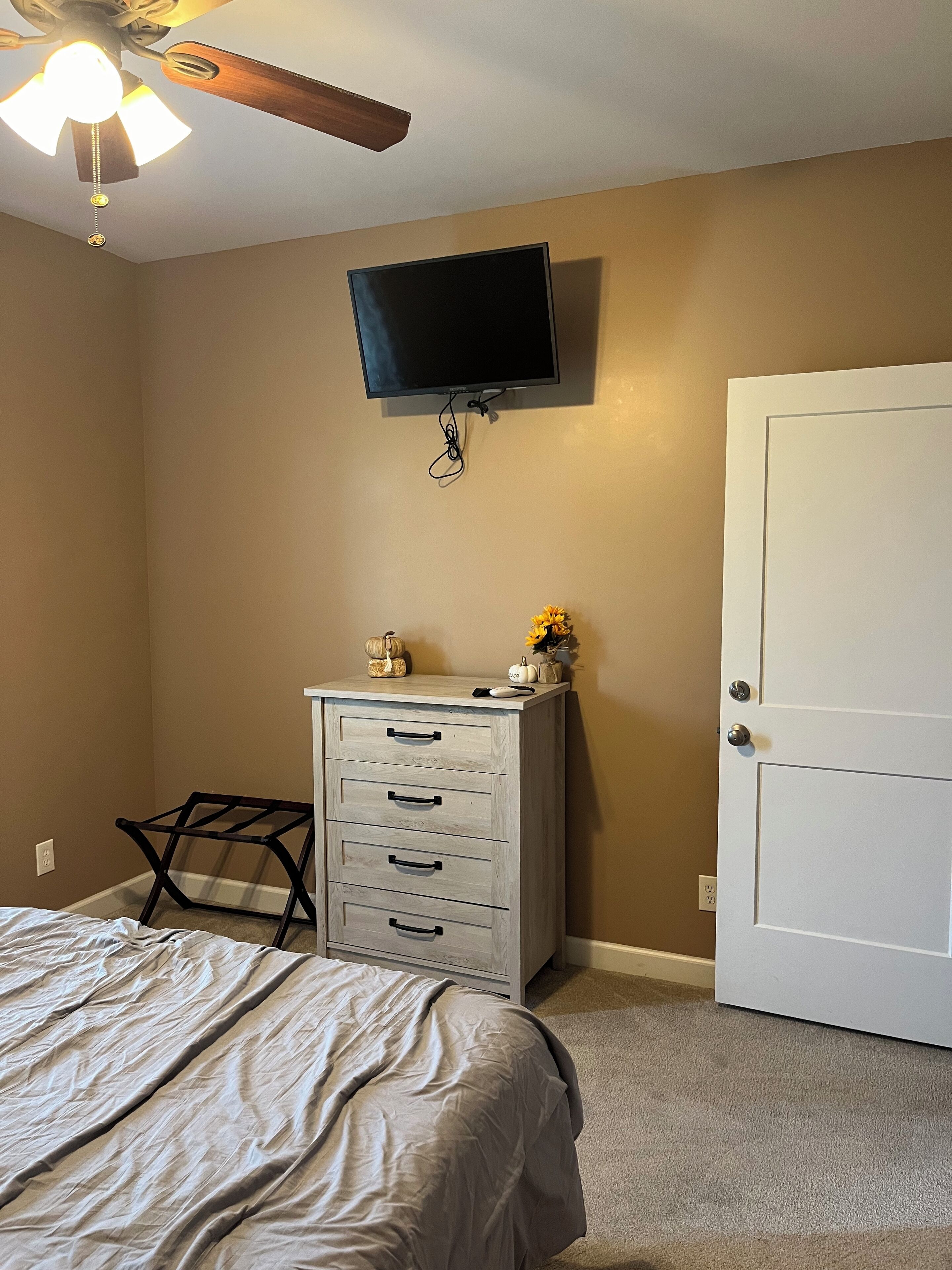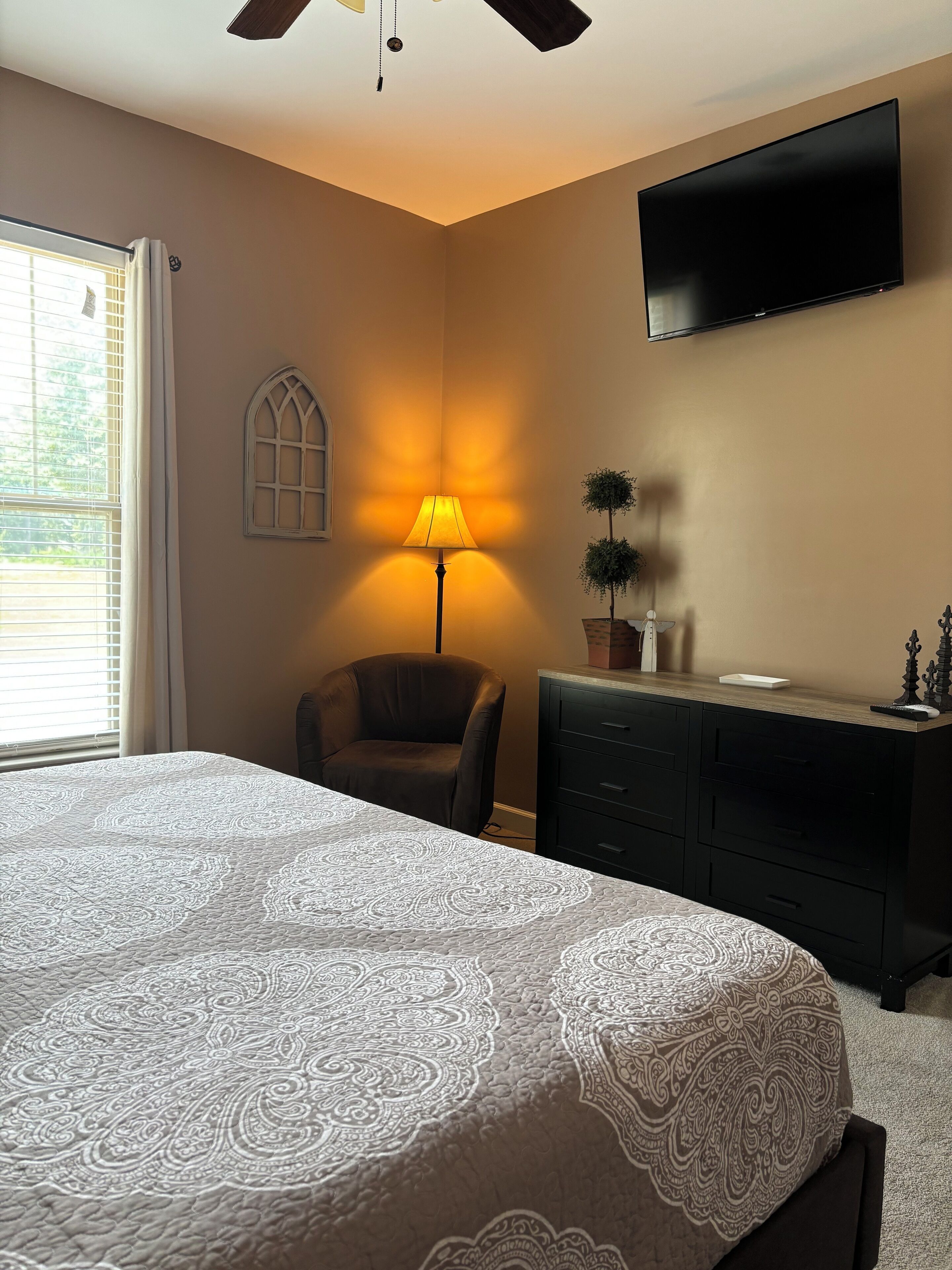 The Dogwood - Cozy, spacious & Luxurious open floor plan A cozy yet modern home away from home. Living room & Each bedroom with TV. Master has king bed with separate tub and shower. Spacious open floor plan with electric fireplace. Covered back porch, great privacy, large yard with 1/2 mile of trails & attached carport. Both guest bedrooms have queen beds. Desk available for work or to just w...