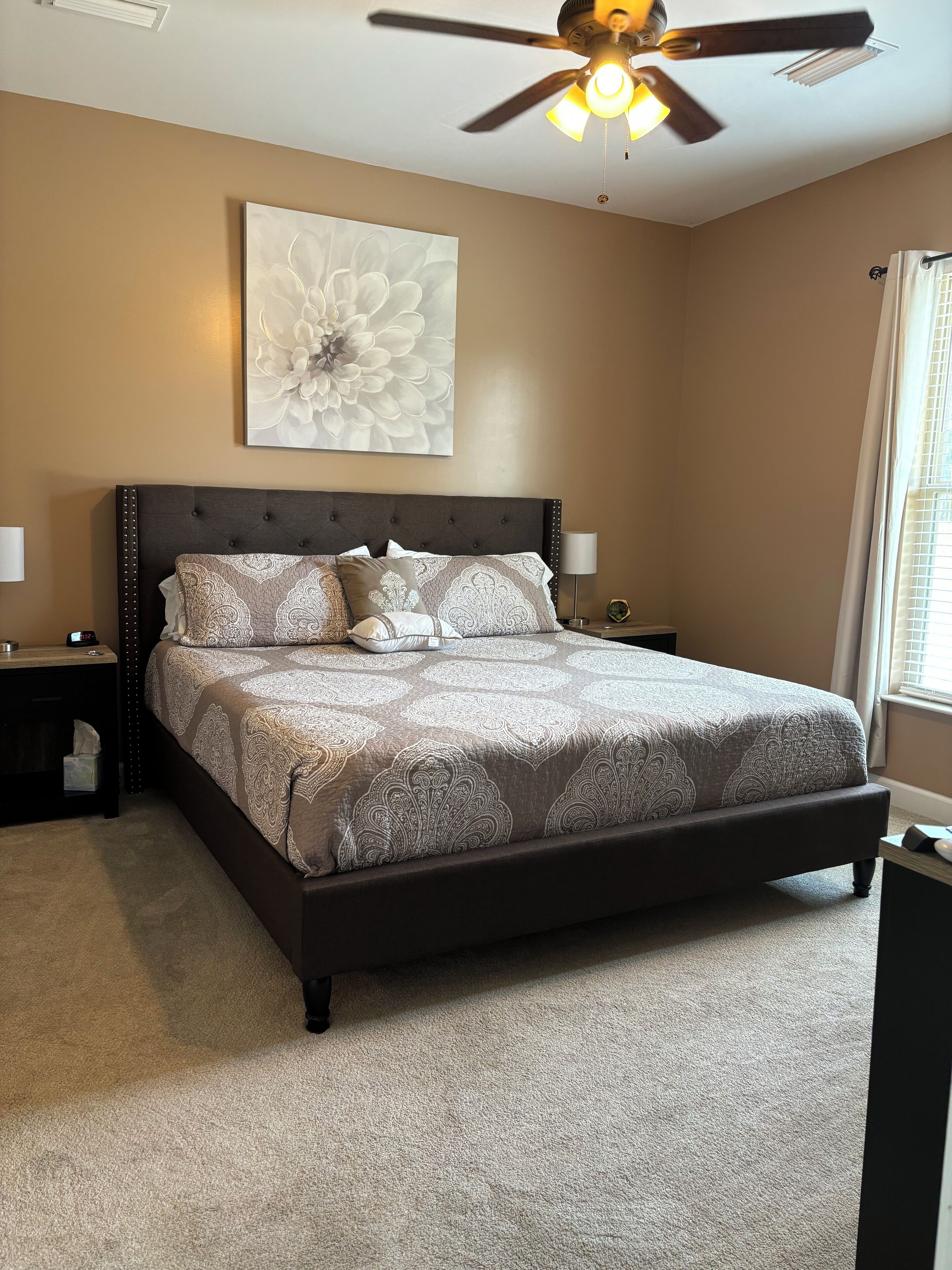 The Dogwood - Cozy, spacious & Luxurious open floor plan A cozy yet modern home away from home. Living room & Each bedroom with TV. Master has king bed with separate tub and shower. Spacious open floor plan with electric fireplace. Covered back porch, great privacy, large yard with 1/2 mile of trails & attached carport. Both guest bedrooms have queen beds. Desk available for work or to just write a note about your relaxing getaway. Full laundry and fully stocked kitchen included. 1 adult/guest must be 25 years old to book this house.