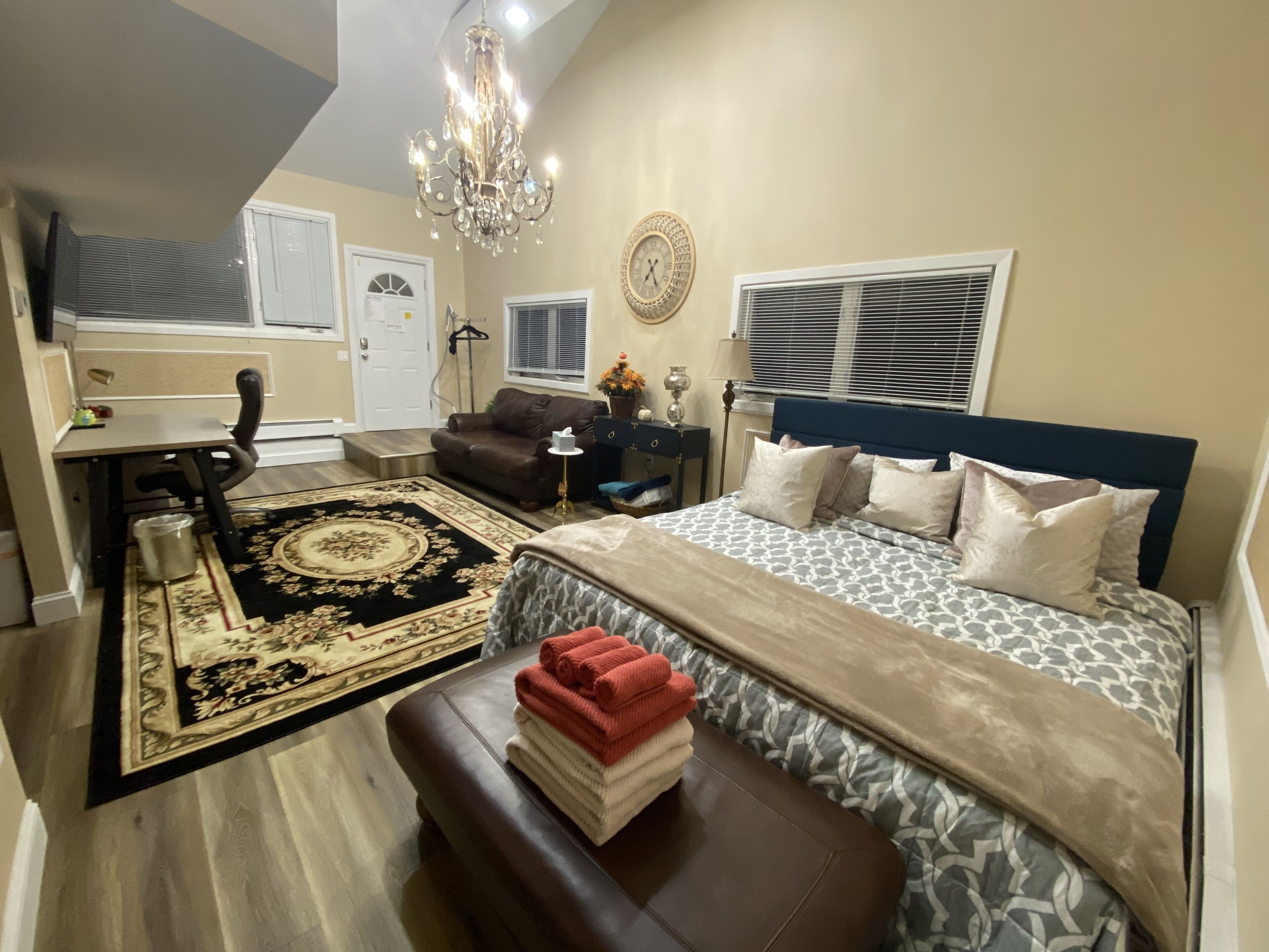 Beautiful Stamford Loft! Near Downtown+Parking+45min to NYC Beautiful newly renovated space adorned with a chandelier and high ceilings. Equipped with a private bathroom, a dedicated workspace, a loft area for sleeping as well as sleeping arrangements on the first floor. Newly built kitchenette available with microwave, electric induction stove, gas stove, and closets full of utensils and supplies for your use. Keurig and coffee/tea supplies also provided.This guest suite is just a few mins away from the highway and is 10 minutes to the heart of downtown Stamford. You'll have your own space attached to the house with a separate entrance and 2-3 spots for parking space.