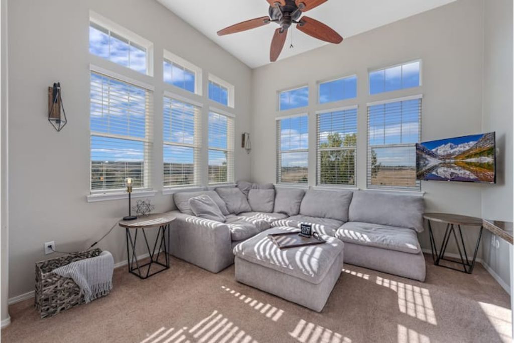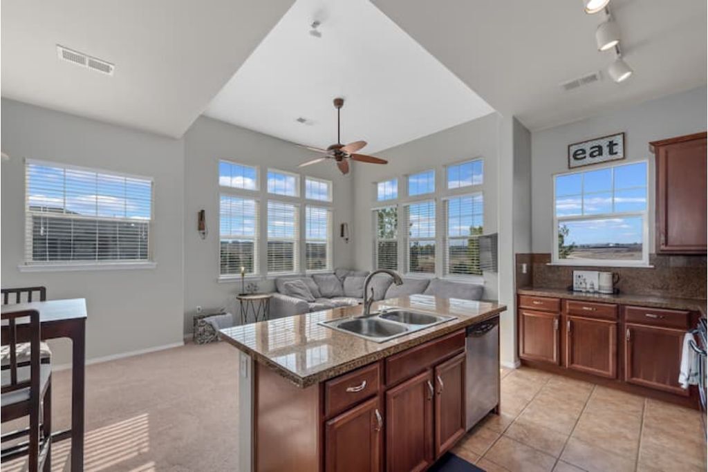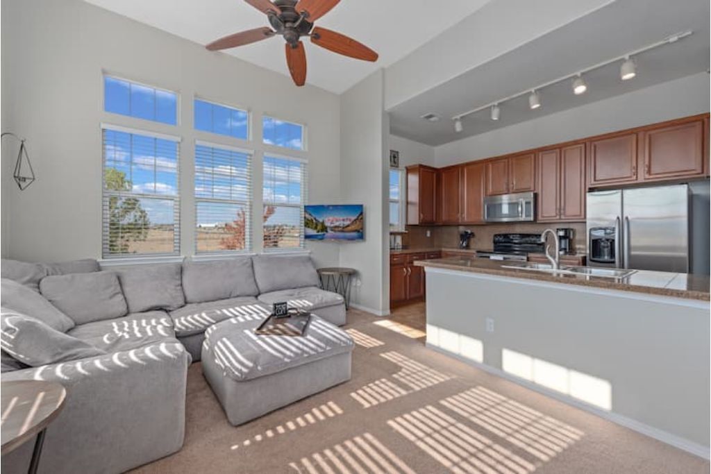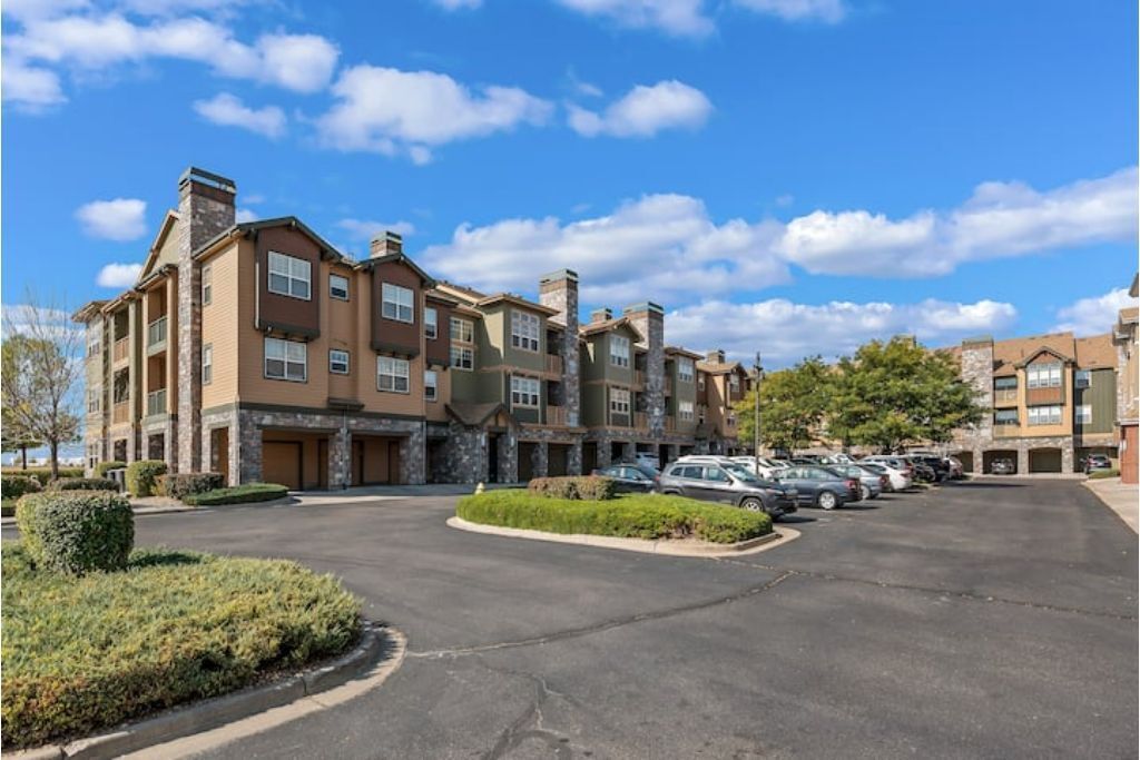 Penthouse Comfort in Dove Valley! Mountain privacy with city convenience-The large windows, high ceilings, spacious kitchen with stainless steel appliances, queen-sized memory foam mattresses and a smart TV in each room can’t convince you, maybe the 5-piece en-suite and walk-in closet main bedroom can. Focus in your separated office, disinfect with an in-unit washer and dryer, and breathe fresh air on the private balcony. Need to get out? Located off of Chambers Rd and E-470, you're about 15 minutes from shopping and restaurants. Linens, toiletries and necessities included. Warning: If you sit on the living room couch, you may not want to leave!
