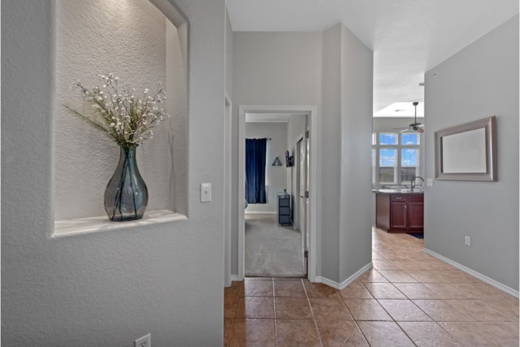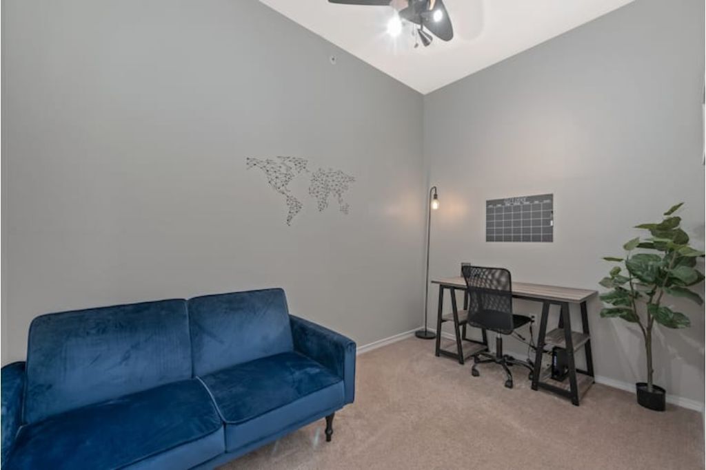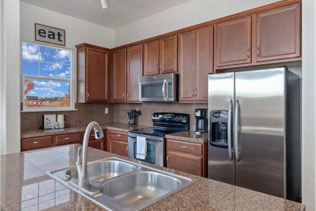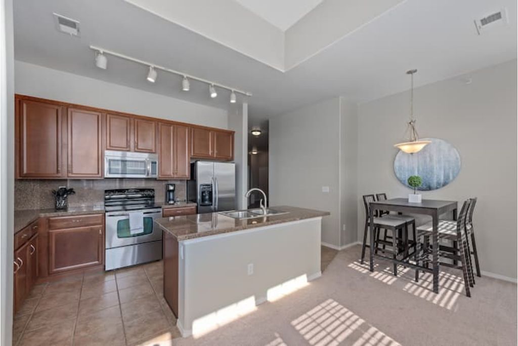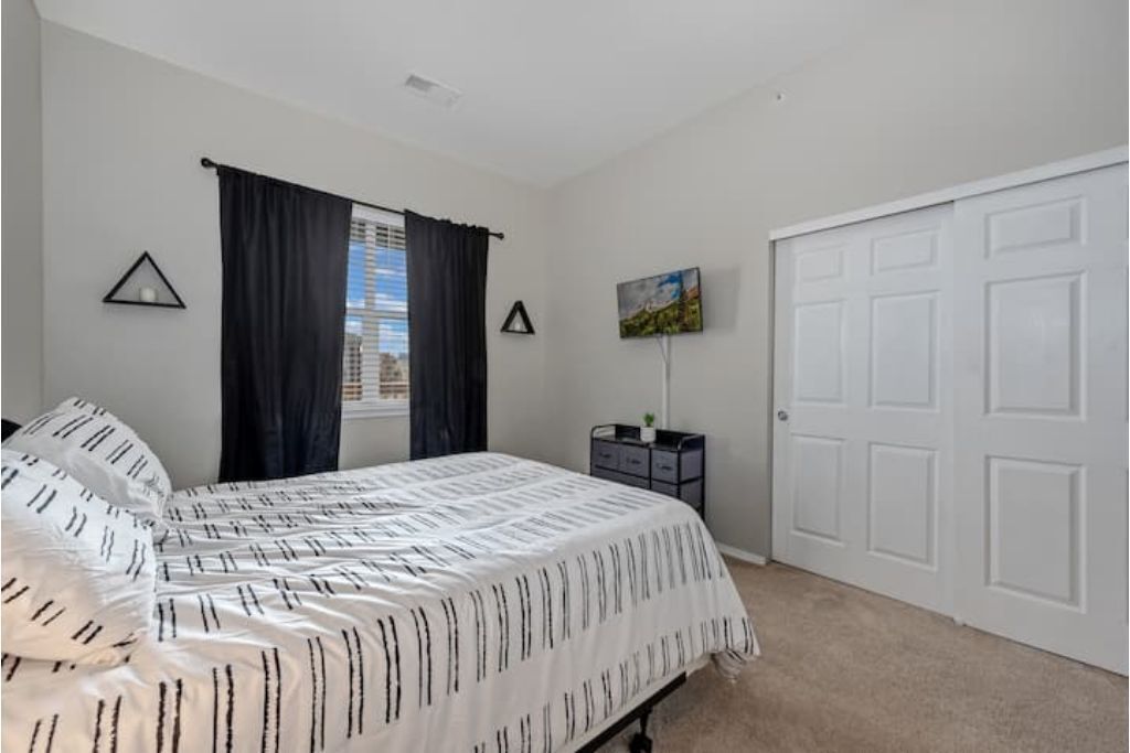 Penthouse Comfort in Dove Valley! Mountain privacy with city convenience-The large windows, high ceilings, spacious kitchen with stainless steel appliances, queen-sized memory foam mattresses and a smart TV in each room can’t convince you, maybe the 5-piece en-suite and walk-in closet main bedroom can. Focus in your separated office, disinfect with an in-unit washer and dryer, and breathe fresh air on the private balcony. Need to get out? Located off of Chambers Rd and E-470, you're about 15 minutes from shopping and restaurants. Linens, toiletries and necessities included. Warning: If you sit on the living room couch, you may not want to leave!