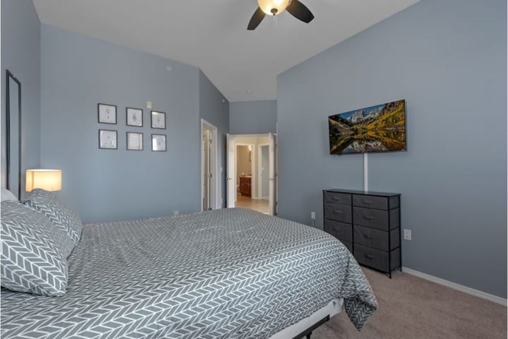 Penthouse Comfort in Dove Valley! Mountain privacy with city convenience-The large windows, high ceilings, spacious kitchen with stainless steel appliances, queen-sized memory foam mattresses and a smart TV in each room can’t convince you, maybe the 5-piece en-suite and walk-in closet main bedroom can. Focus in your separated office, disinfect with an in-unit washer and dryer, and breathe fresh ai...