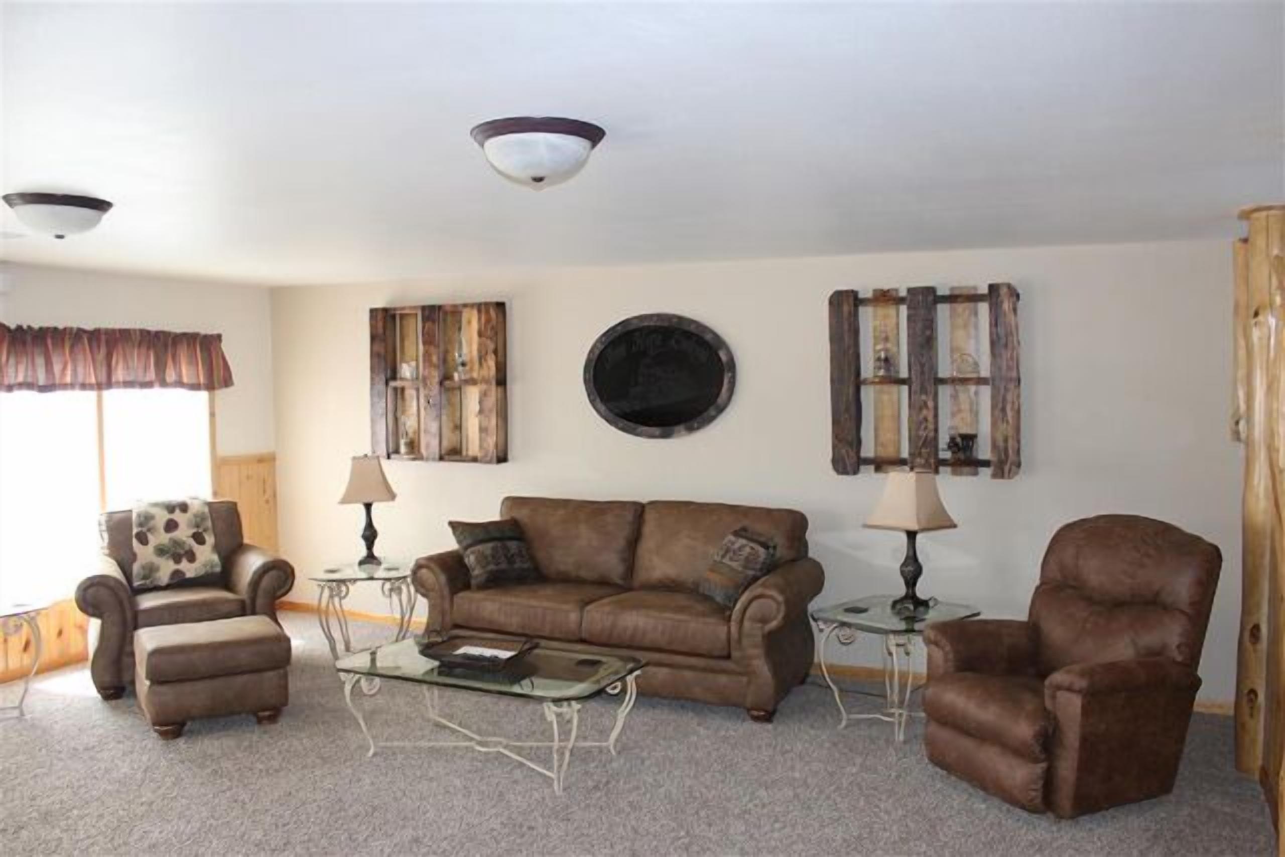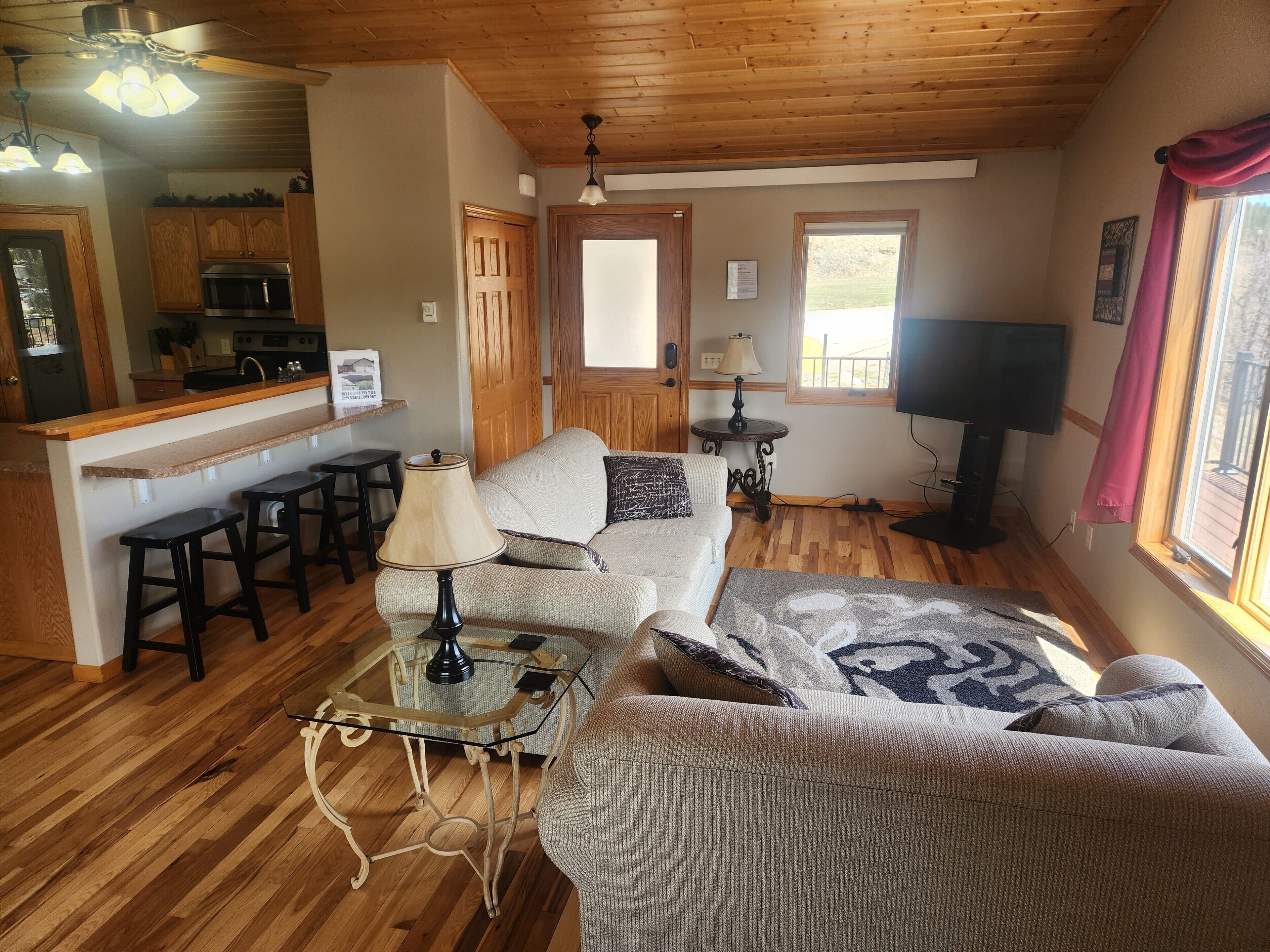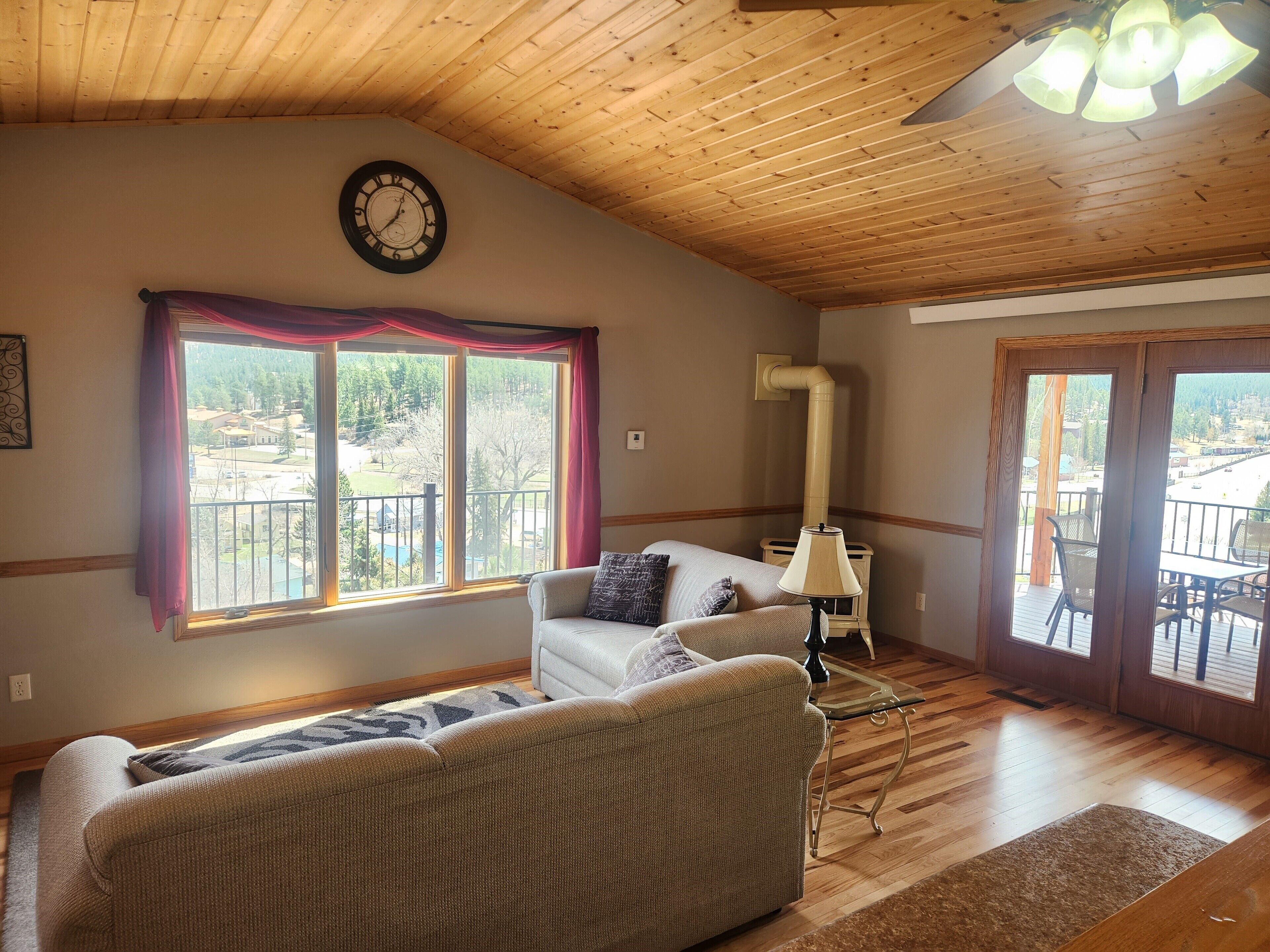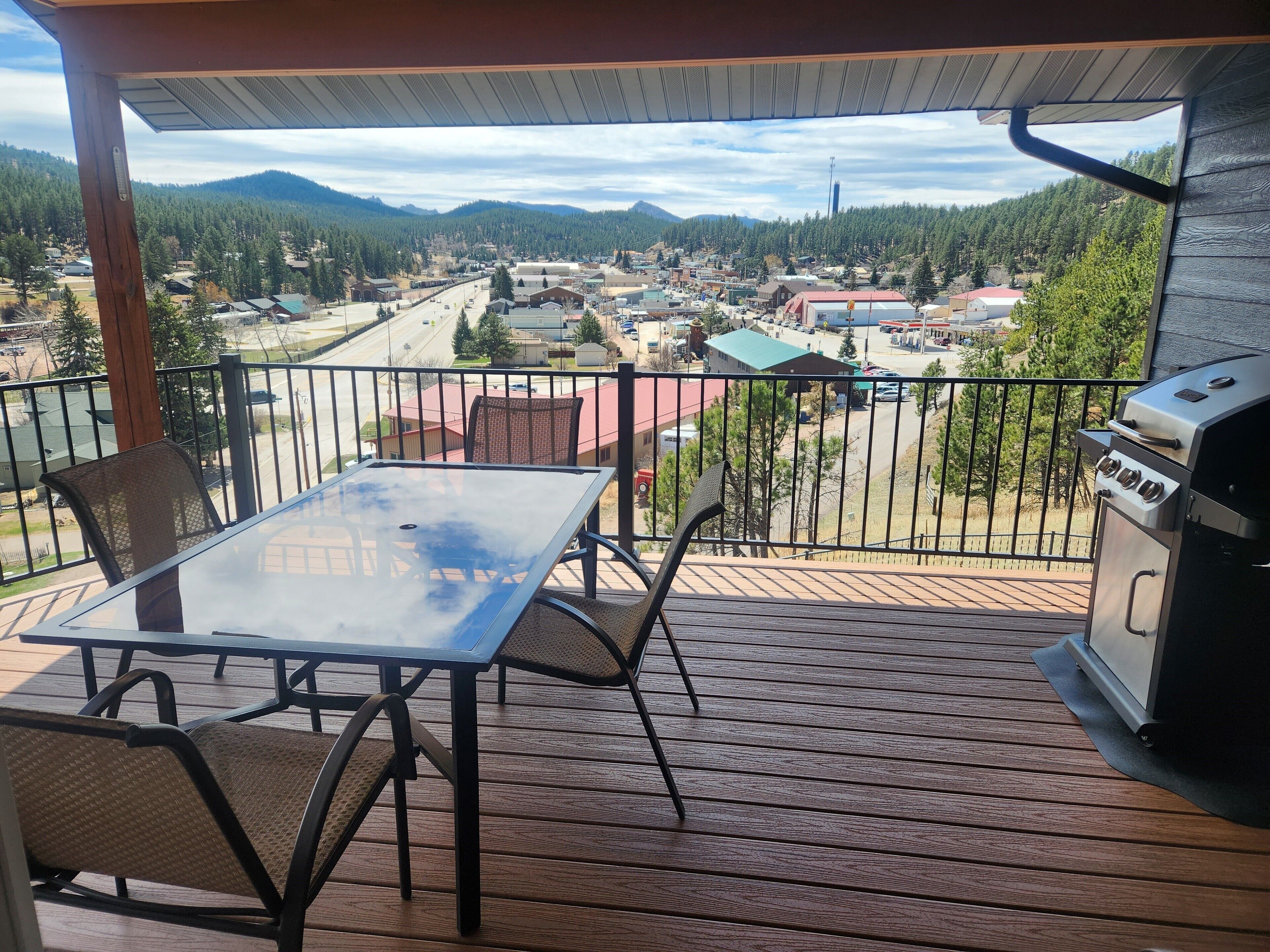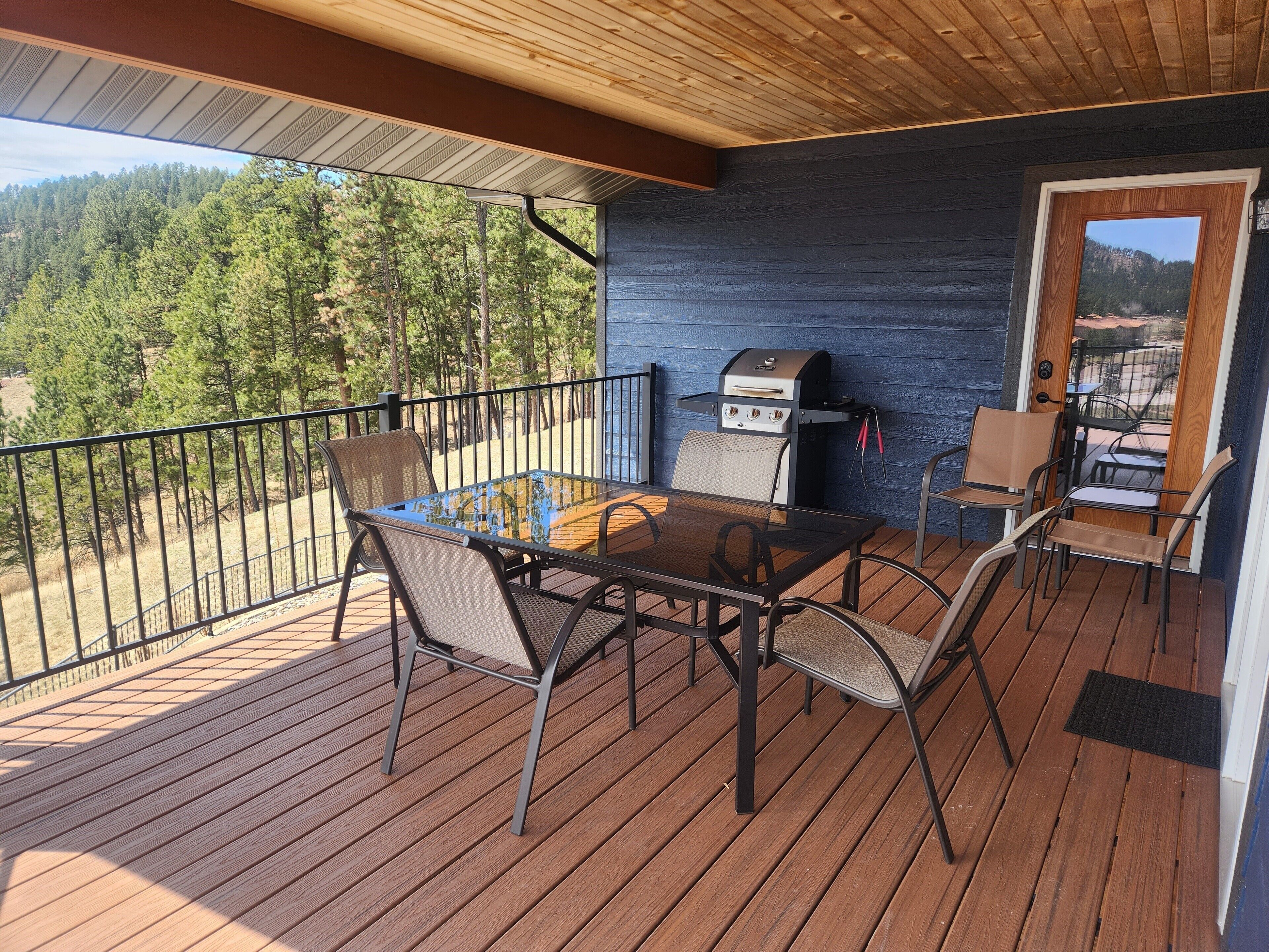 GREAT VIEWS FROM THE DECK. Accommodates 8 people. Maximum 6 adults. Sleeper sofa for children ONLY. Be sure to place an inquiry with any questions before “clicking BOOK NOW” to reserve online. We are happy to answer any questions before you commit with payments.This 3 bedroom, 2 bath home was built in 2008. it is located on Prospector Mountain on a ridge overlooking Main Street Hill City and the Black Hills Central Railroad (1880 Tourist Train). Enjoy the beautiful views of the surrounding mountains and nearby Harney Range. Paved roads lead all the way to this home with a double garage. It is just a stroll down the hill to “Major Lake” for fishing, or to access the Mickelson Hiking/Biking Trail and Hill City’s Main Street.On the main floor: Primary bedroom with king size bed and an adjoining bathroom with tub & shower. Fully furnished kitchen with side by side refrigerator and plenty of cabinets and walk-in storage for your supplies. Kitchen/dining with seating for 6 at the table and 4 at the kitchen counter. Living room with queen sleeper sofa, love seat, TV and gas log stove. The upper wrap-around deck has a table, deck chairs and gas grill.Included on the lower level with walk out to the patio: Large 26X20 family room with sofa, recliner, oversize chair with ottoman, flat screen TV and a round bar height table with chairs…perfect for playing cards or a laptop spot. The 2nd and 3rd bedrooms both with a queen bed are also on this level as well as the 2nd bathroom with tub & shower. The laundry room has a washer and dryer. The walk out patio has additional outdoor seating.Other amenities: Central air conditioning, cable TV, and wireless internet access. No pets, no smoking2200 sq feet Terms: Iron Horse and Sluice Run:Iron horse: The invention of coal and steam powered locomotives replaced horse drawn wagons to expedite the transport of goods across the plains. They were dubbed “iron horses”.Sluice run: During the Black Hills gold rush of the 1870’s miners ored the gold and washed it down gullies by the way of a water channel controlled by a gate called a sluice.