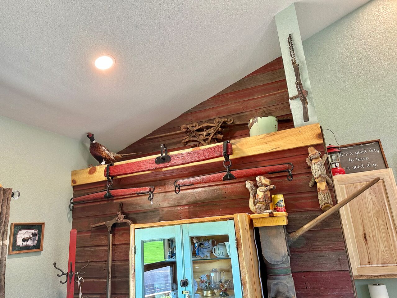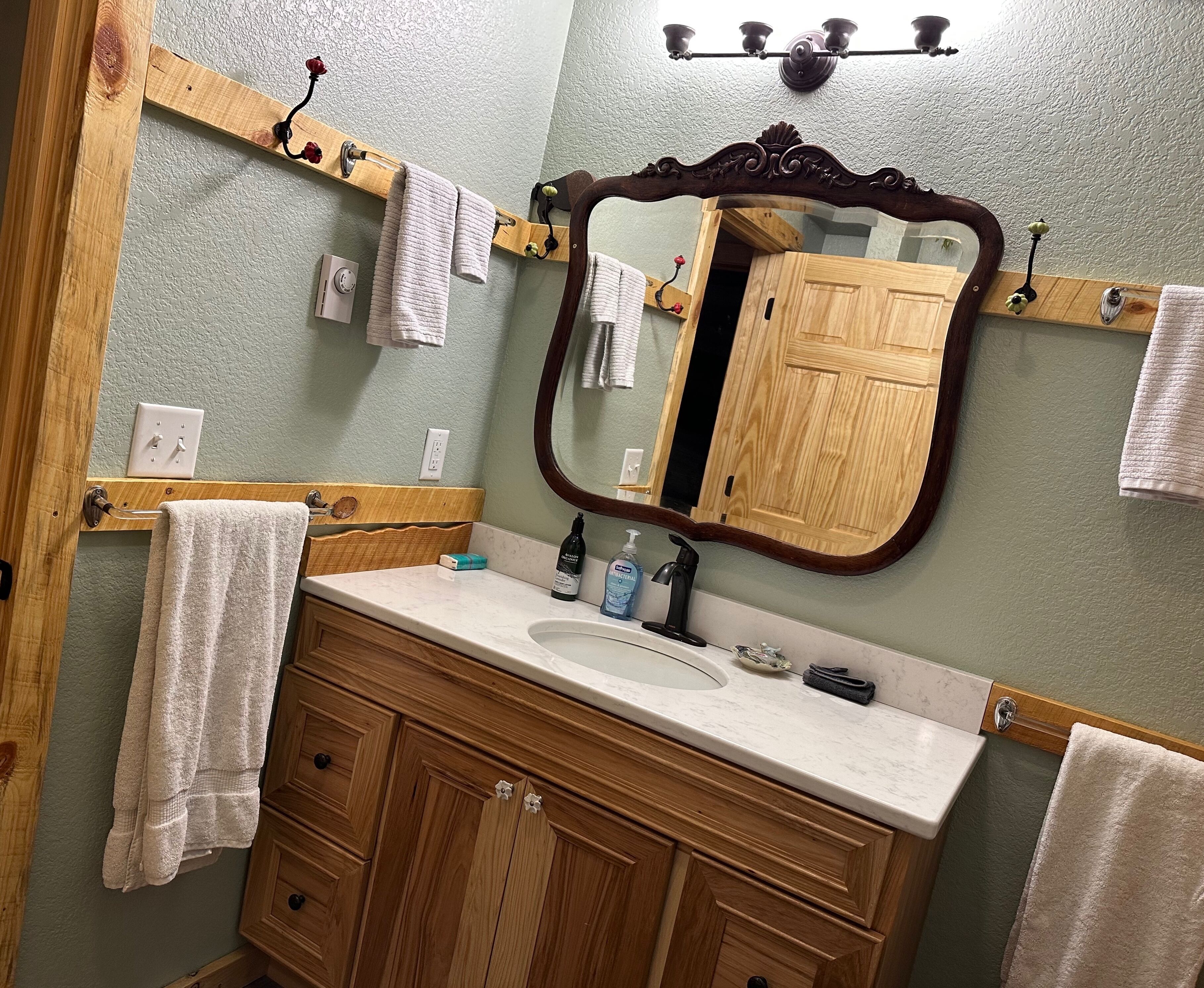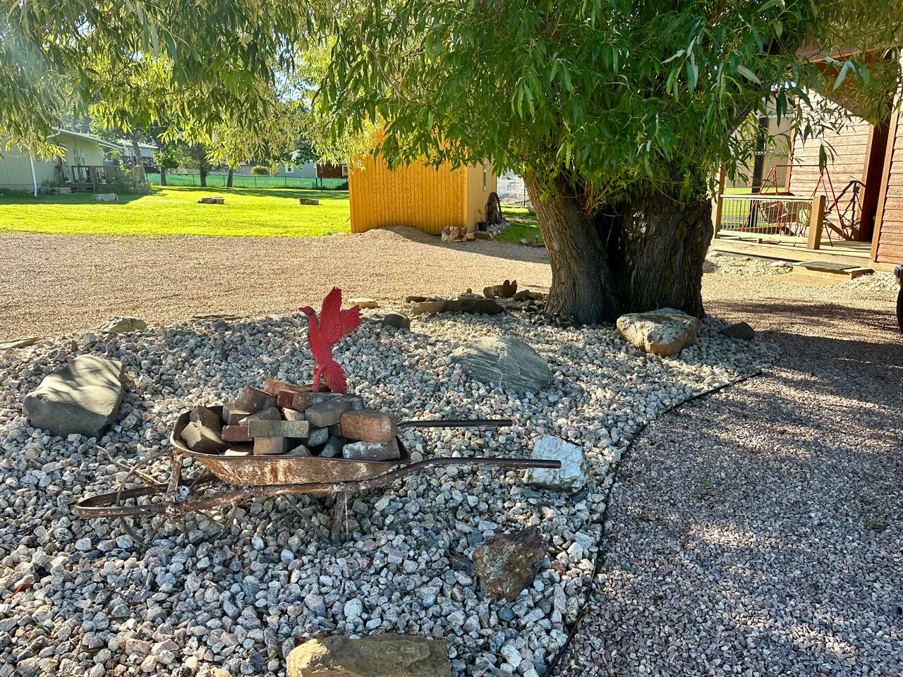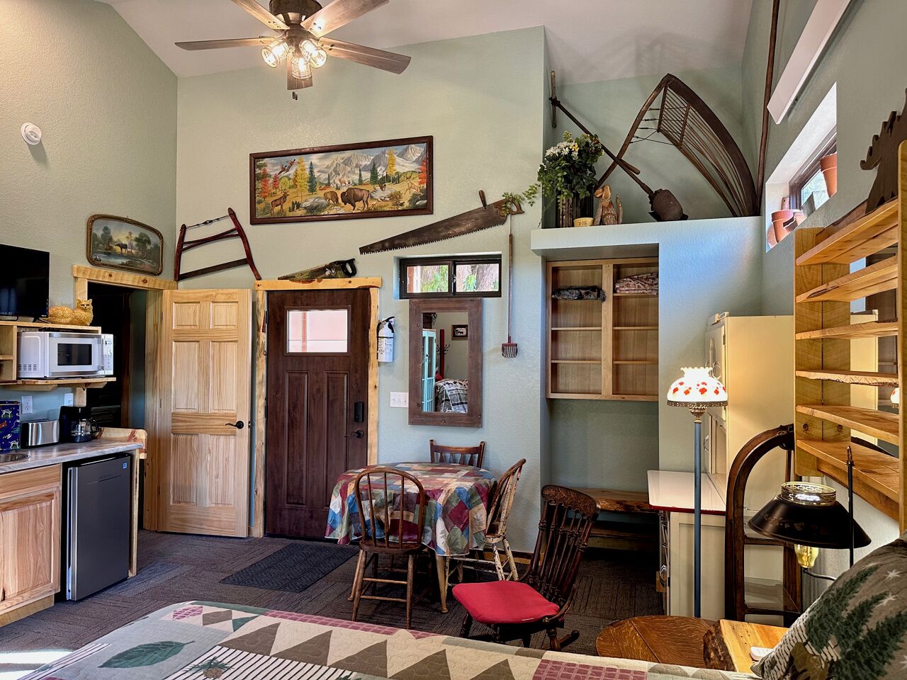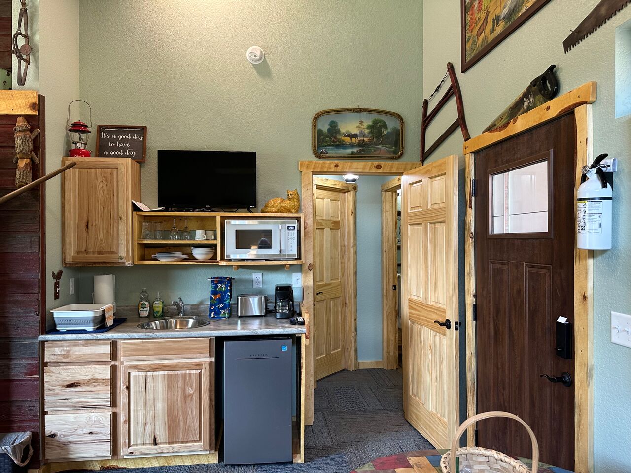 Black Hills Home Cabins—ELOOSIVE MOOSE—in Hill City, near Lake, Mickelson Trail! Black Hills Home Cabins at Chokecherry BnB, located IN Hill City (a neighborly very likable mountain town), features 2 in-home cabin style nightly vacation rentals, under the one roof of our NEW modern mountain cottage. This listing offers ELOOSIVE MOOSE, spacious, thought-out carefully for your comfort and convenience, and the rates are easy going while the benefits are exceptional! Owners Sam and Linda live in the all new hospitality residence, separately from your ‘moose farm’ (…said tongue-in-cheek, because the decor, besides faux moose sightings, includes an eclectic variety of farm artifacts, gleaned from the childhoods of your host and hostess.) The overall BnB cottage consists of three individual distinct units: owner quarters; Eloosive Moose (in-home cabin); and Chokecherry Hideout (in-home cabin Vrbo ID 3539428). Yes, you do have your own personal porch entrance, with the inviting look of a good-natured cabin!NOTE 1—Our Vrbo calendar is set for showing availability from present to six months out, and adjusts automatically to always show six months availability.NOTE 2—Please take time to read the House Rules/Policies (at bottom) provided with this listing, as well as to look at the amenities available or not available. It is IMPORTANT to do so before sending a Reservation Request. For instance, we are firm on renting to NON-SMOKERS only [people who do NOT smoke]. Under no circumstances can we accommodate people who smoke, even if off-property. (If this policy is relevant to you, please read About Our Non-Smokers Only Policy at bottom of this description page.) Again, please read the rules and policies, and check the amenities shown elsewhere in this listing. Thank you.CHECKIN window between 4:00-6:00 p.m.—The checkin window is to let you know that we are not ready to receive guests before 4:00, so that isn’t an option; however, after 6:00 we usually have more flexibility. (The morning of your arrival date we will email to ask if you must be later than 6:00, and approximately what time to anticipate your arrival.) CHECKOUT by 11:00 a.m.—Necessary particularly when we have guests arriving later the same day as your checkout.A suggestion—if you are three or four adults traveling together, you may check to see if Chokecherry Hideout is also available and, if so, you could rent both in-home cabins! We have accommodated guests who did just that. The benefits include two full bathrooms, privacy between the in-home cabins, two places to spend time together, a picnic table, two grills (one electric and one charcoal), and probably you could think of other benefits as well. Please inquire if you have questions.2006-2021 (Vrbo since 2013) — With the experience of 15 years as host and hostess in our first owner-occupied BnB, we have acquired a strong sense of what works for and appeals to travelers. Our stack of guest books, filled with happy satisfied expressions from former thousands of guests, attests to our earnest desire to extend hospitality that shows you are on our minds. As we look forward cheerfully to meeting all our future vacationers who will be visiting the beautiful Black Hills and choose to book here, we are reminded of our gratitude for those past wonderful years which we were blessed to enjoy, and for all the new friends we made because they chose to stay with us, some of whom followed us forward!Let’s explore a variety of benefits you may expect from Black Hills Home Cabins. ~ First of all, and importantly, we are near Mt. Rushmore, in the Central Black Hills, which is ideal for adventurous day-trips into unparalleled diverse scenic vistas everywhere in the length and breadth of the Black Hills. ~ No less advantageous, the in-town location of Black Hills Home Cabins provides easy access, even on foot, to everything Hill City has to offer. ~ Black Hills Home Cabins is in near proximity to the George S. Mickelson Trail, for exercise, or bird and wildlife viewing out in nature. The ever-popular trail strides through town along Railroad Avenue. We are situated across the football field from Major Lake, where there is access to the trail from the lake (and a fishing/resting pier!) ~ Don't miss the iconic tourist attraction, Black Hills Central Railroad's 1880 Train, stationed along the trail. ~ Bike rentals are locally available as well. ~ For your grocery needs, Hill City's full service Krull's Market is only a few blocks away. ~ There are two laundromats in town. ~ And several churches grace this small community. ~ Probably you will devote some leisurely time to historic downtown Hill City. That's where you will find everything from a hair salon to filet mignon to dreamy ice cream and homemade fudge to a world class dinosaur museum, and Dahl’s Chainsaw Art. Many local artists make their offerings available for purchase at Art Forms downtown! Savor the choices of cafes, grills and restaurants for breakfast, lunch and dinner. Track down fine gifts, as well as trinkets, t-shirts and antiques. ~ Also available for purchase are antiques displayed in a special log cabinet in your cabin, direct from our former retail shop Smiling Bear Antiques. ~ And our Smiling Bear-verage menu will be provided to you, reminiscent of Smiling Bear’s Espresso Bar, highlighting our exclusive and popular Wild Chokecherry Latte and other original tasty creations of Smiling Bear’s. ~ When time permits, Smiling Bear also may whip up some award winning jams and jellies, sold as Black Hills Wild Fruit.Please review all the PHOTOS provided with this listing, and we recommend that you indulge in reading the informative captions. You will see your private full bath, with a 5’ curved tub with a shower having 6 handy shelves; and an assortment of amenities throughout—linens and towels are provided, as well as shampoo, conditioner, body wash, hand soap, dish soap. The bed is a queen-size pillowtop.