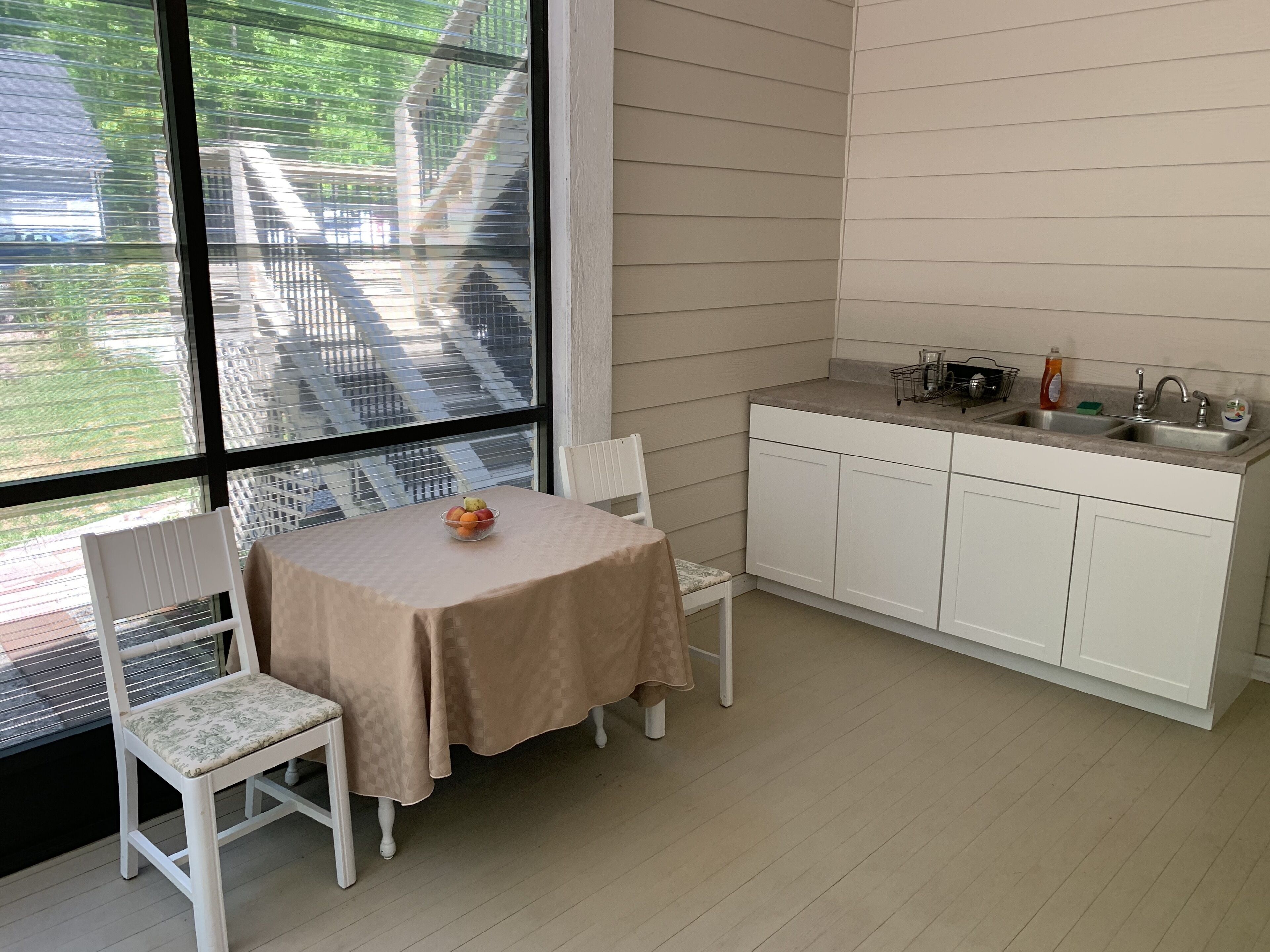 Fireside Apartment The Fireside apartment is located in a beautiful Sewanee subdivision close to the Equestrian Center. The apartment has a private entrance with a covered patio and kitchenette, its own private bedroom and bathroom, and can accommodate two people very comfortably. No pets are allowed inside the apartment for allergy reasons, but we have a covered 12x4 feet kennel that can accommodate dogs and cats. Also for the safety of our guests, the fireside is being turned off.For your safety and security, there is a video camera monitoring the parking lot.
