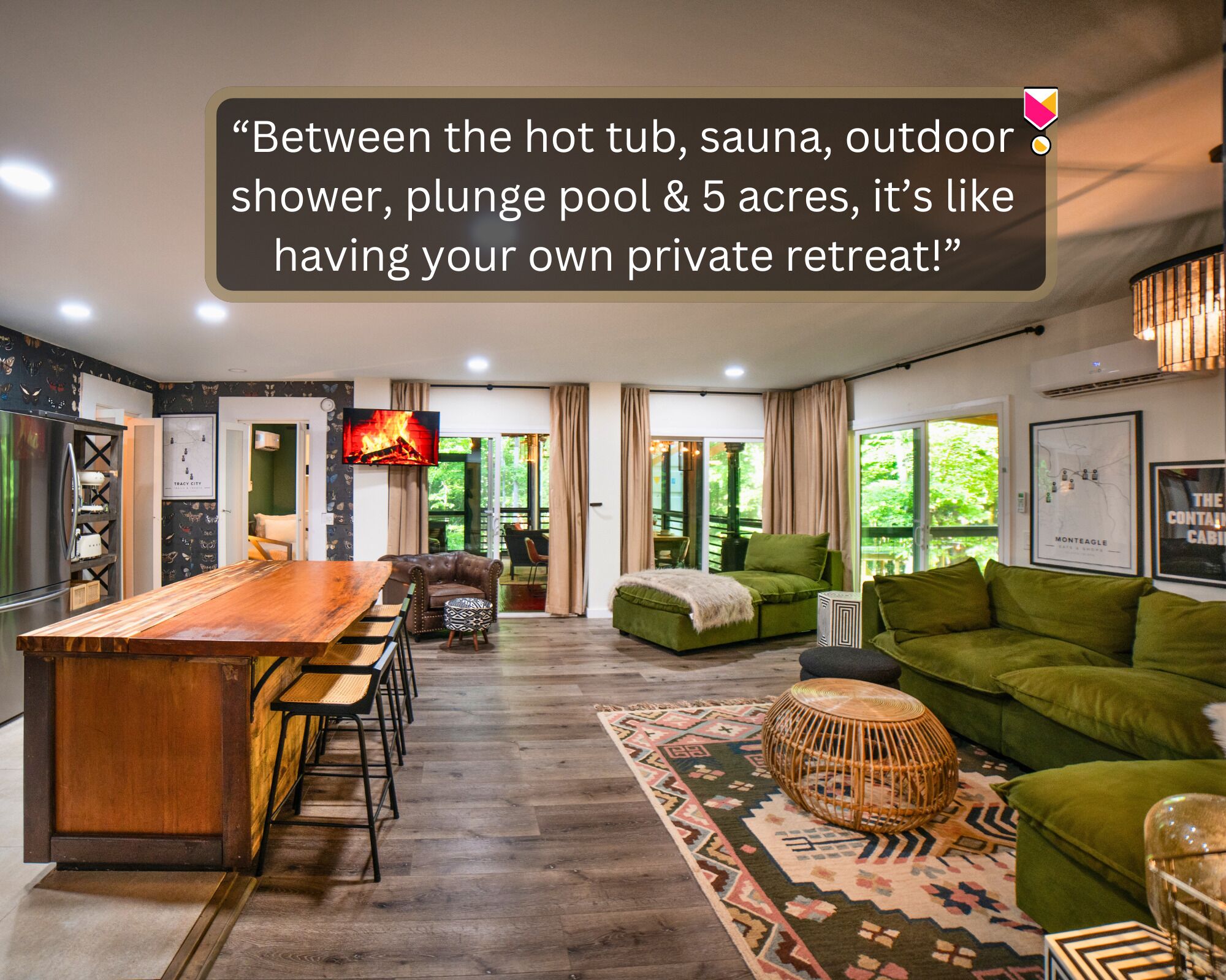 Private Multi Family Retreat on 5 Acres! Create lifelong memories at the most unique & plush nature retreat you will ever experience!Imagine watching deer stroll through forest from the plunge pool or sauna after hiking one of 30 trails within 20 min of our 5 acre oasis....Imagine watching the sunset from the hot tub with a glass of wine, while the grandkids play ping pong in earshot. If you need...