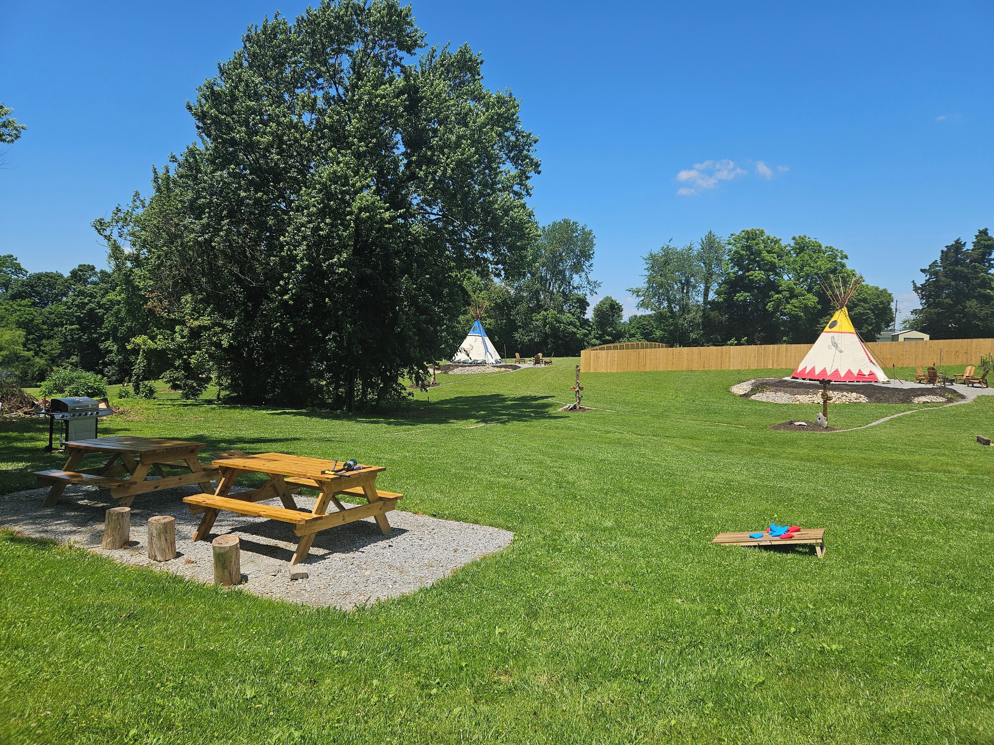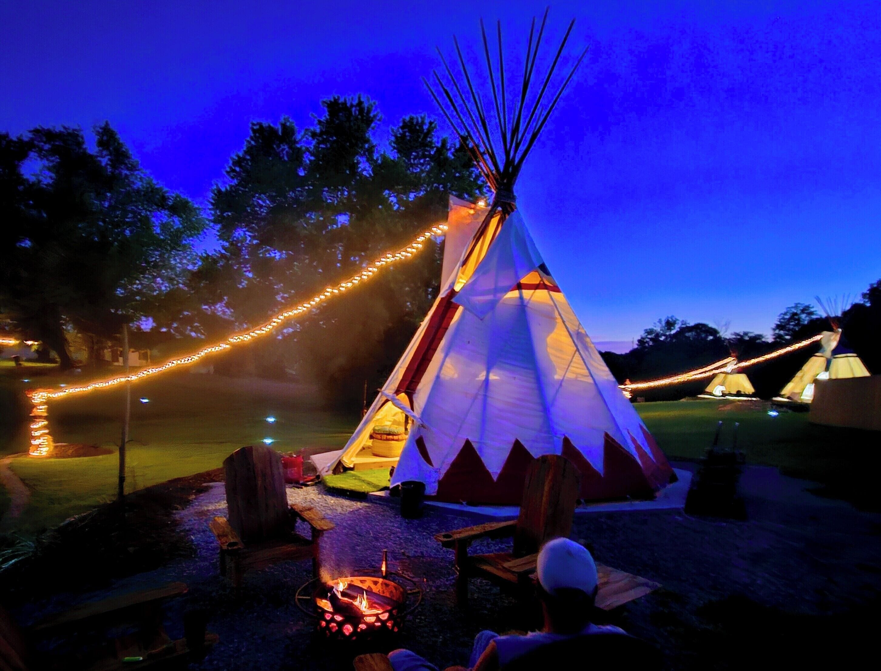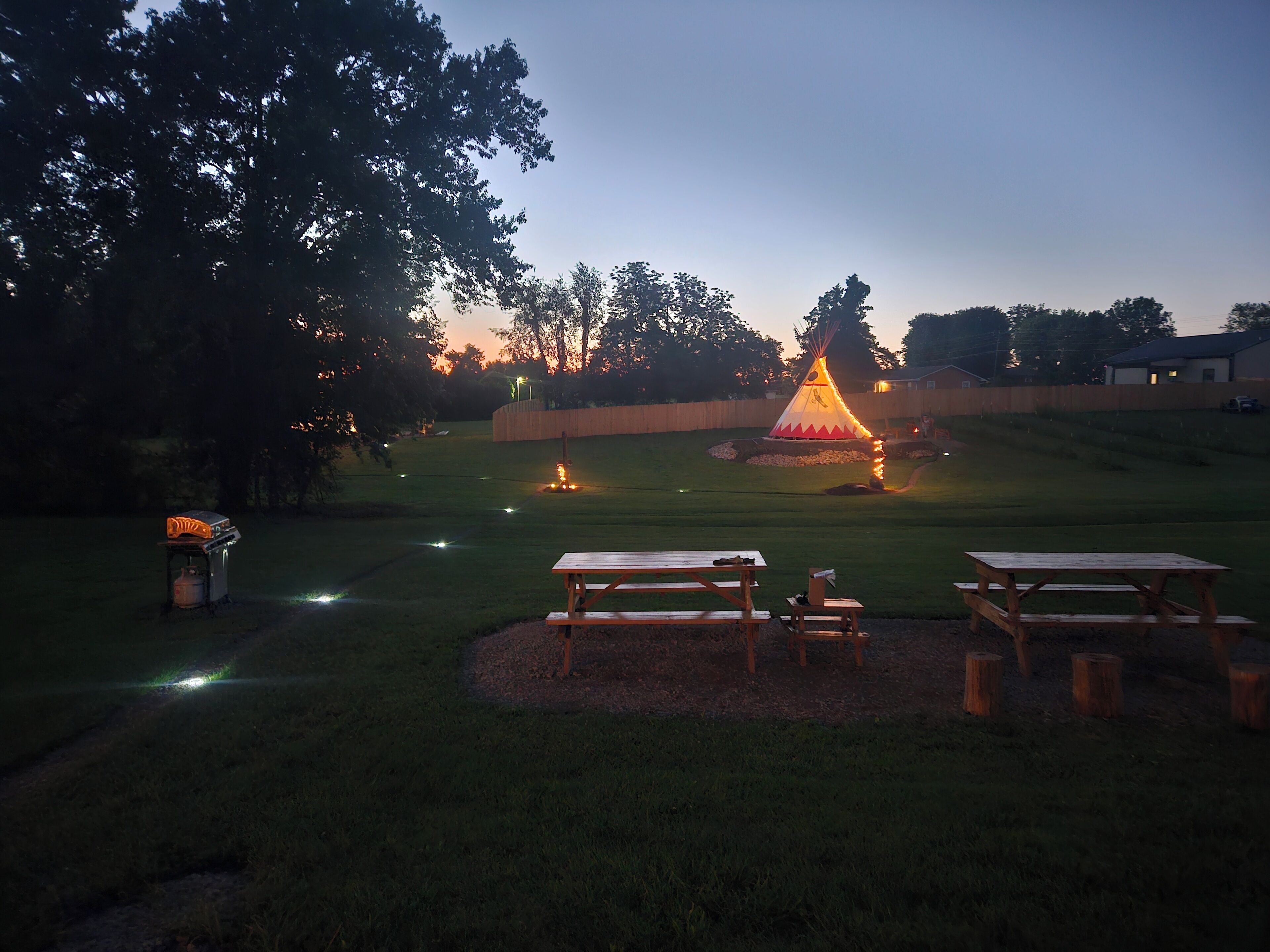 Flyin' High Sleep in a tipi! Rent the entire campground of three tipi's for parties and family get togethers! Located in the heart of Kentucky, located between Mammoth Cave, Green River Lake, the Kentucky Bourbon Trail, and the childhood home of Lincoln, this little campground may be the unique space you have been looking for. We feature three, stunning 18 foot tall Sioux-styled tipi's! Beds, heat and air are included, along with free firewood! On-site bathroom and kitchen are located in our small cabin.