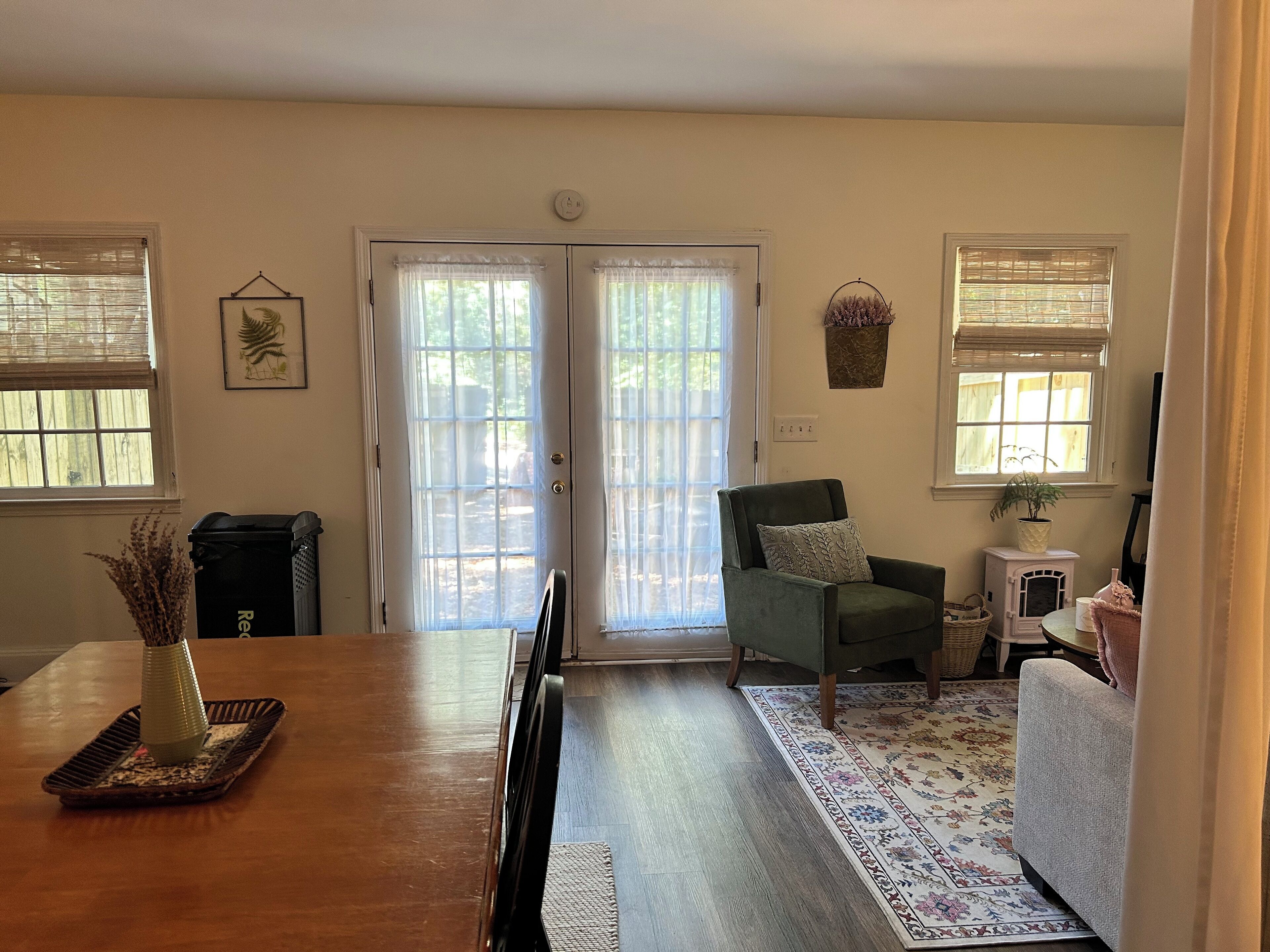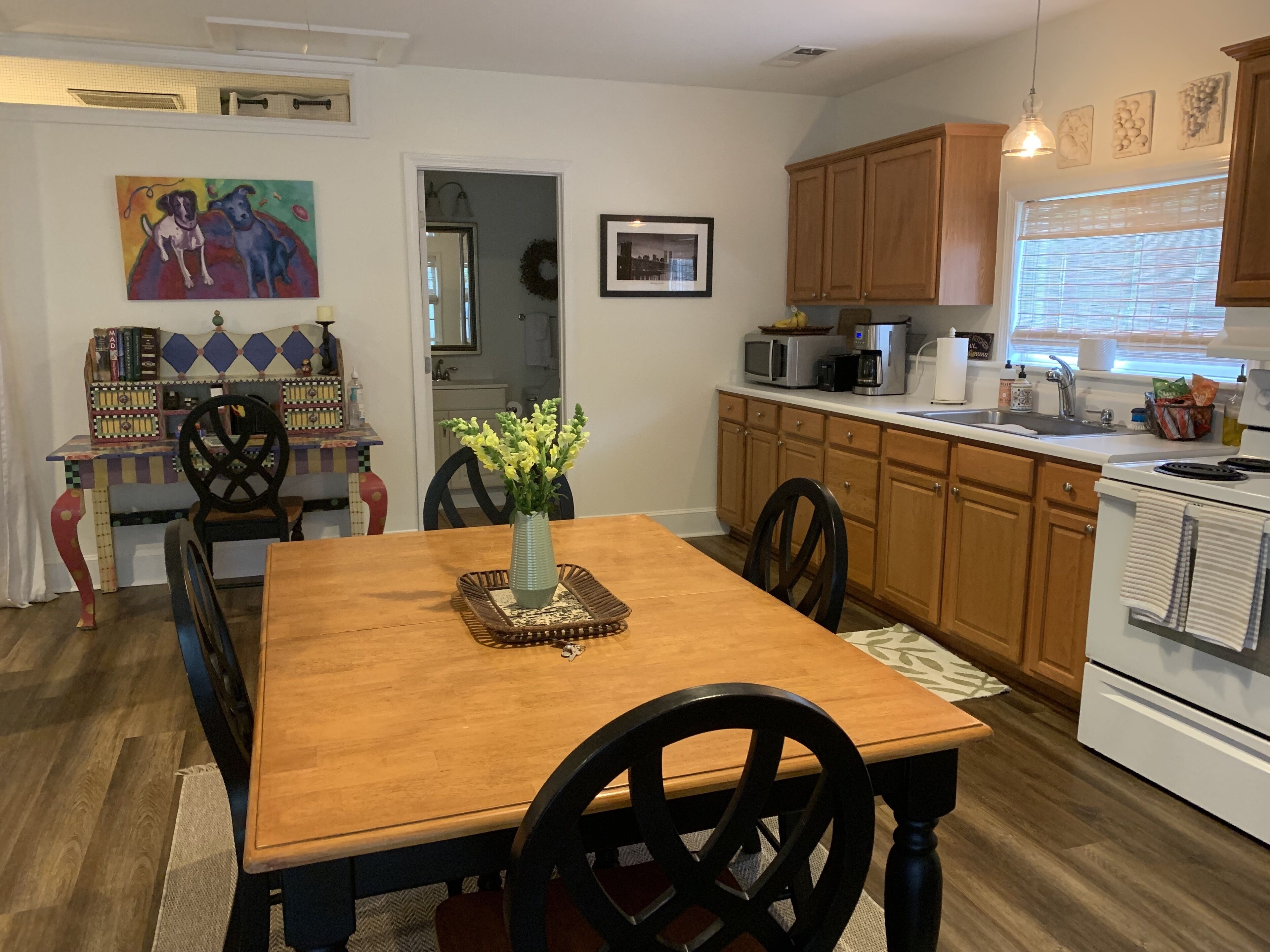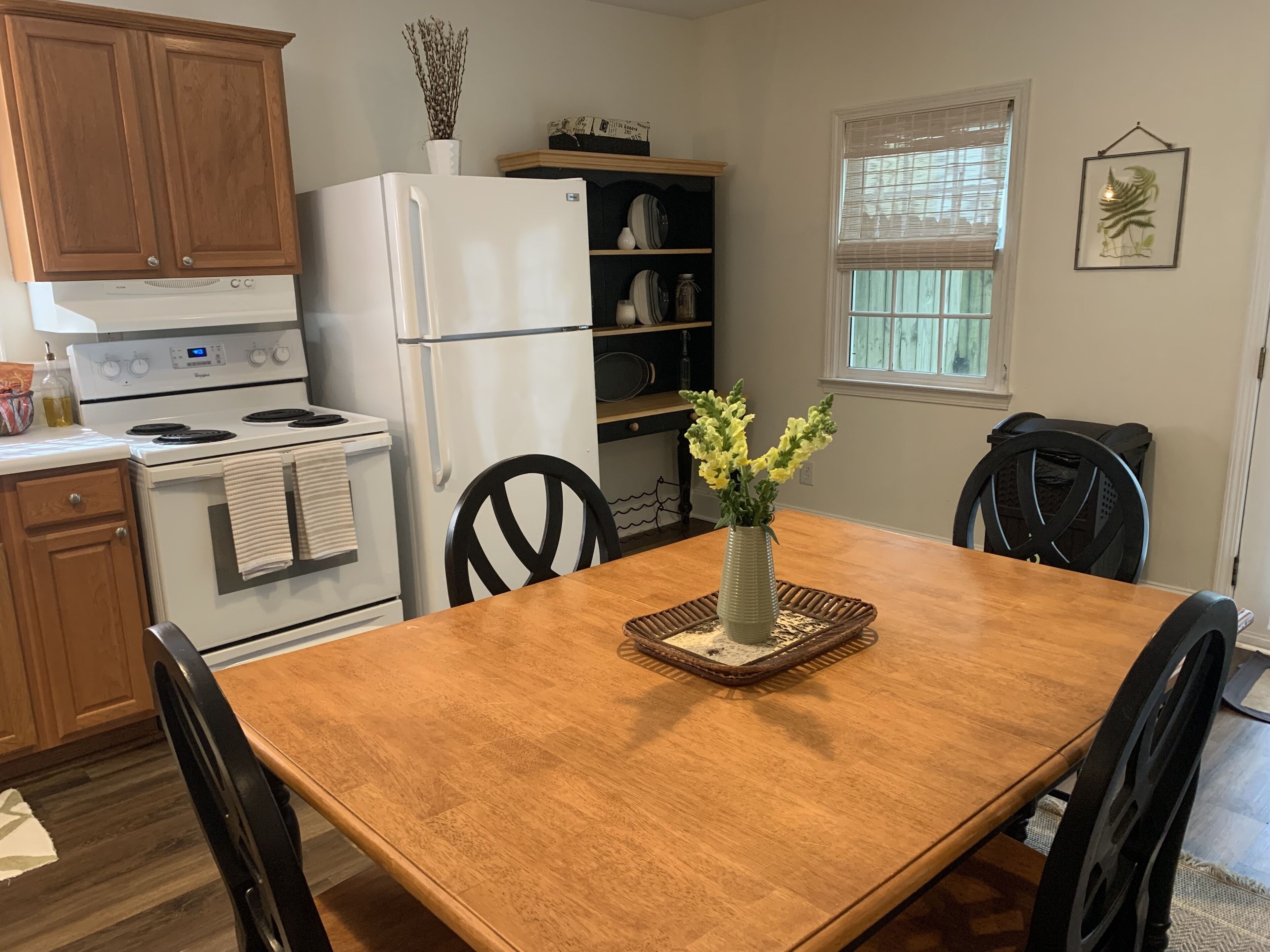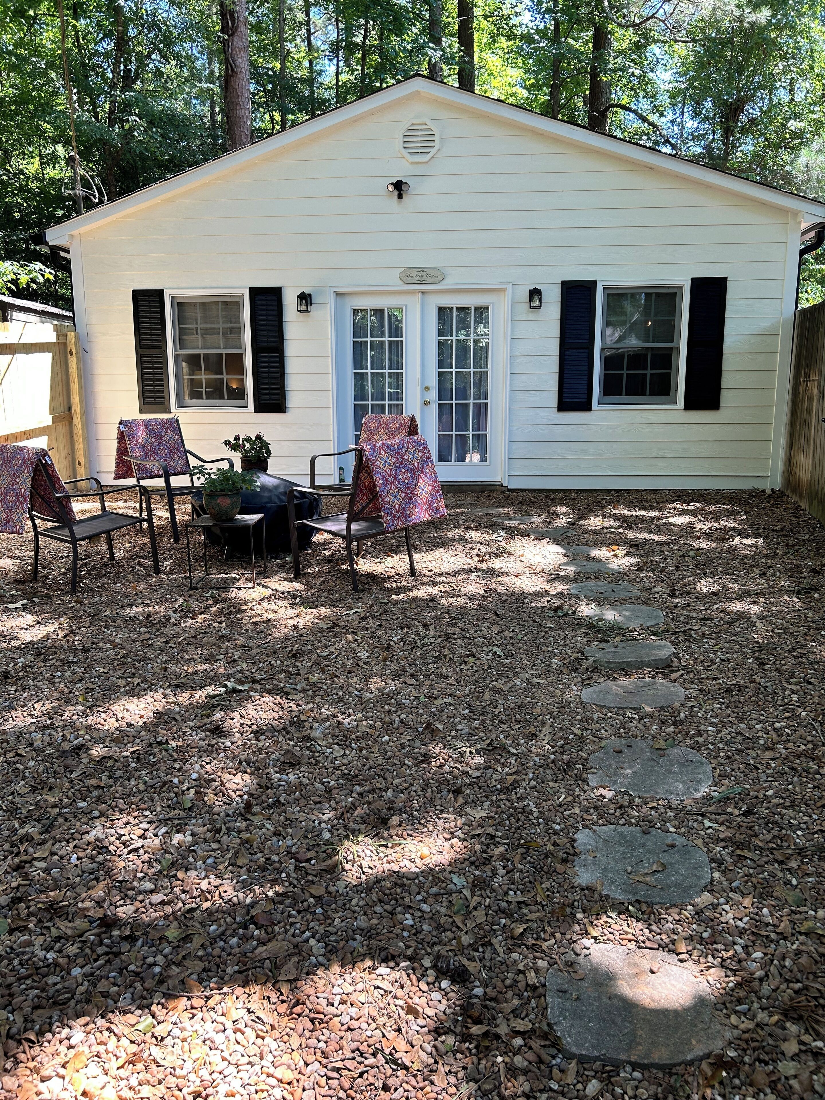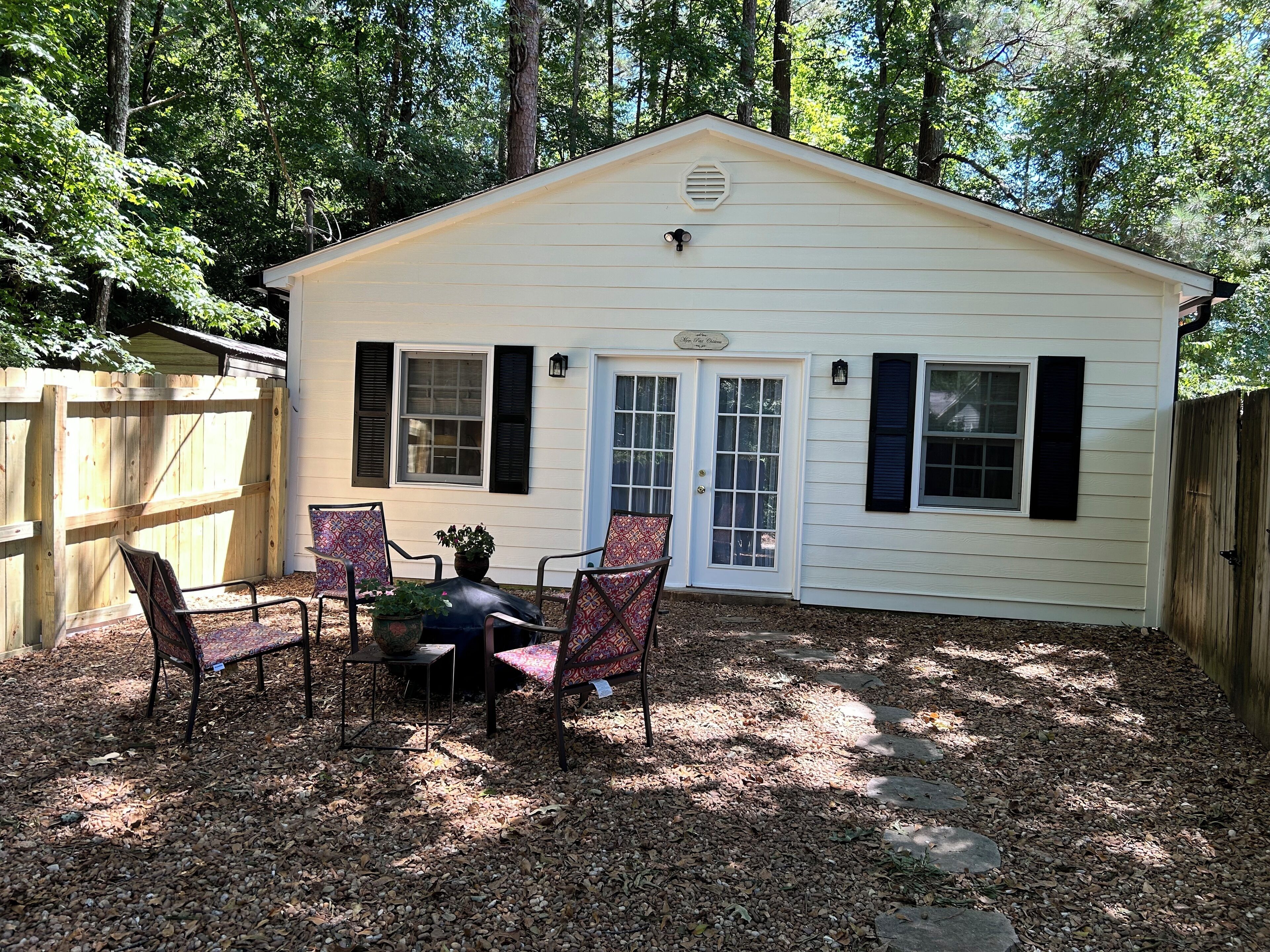 Private Pet Friendly Cottage Our cottage is a private, quiet retreat. It has a queen sized bed with privacy curtains, a living room sitting area, dining area, kitchen, bathroom with shower (hand held and stationary) and tub. Also a large closet with washer and dryer. Set back off the road at the end of long driveway. Small fenced in area with privacy fence to keep kids and pets safe. Suitable for 2 or 3 people and possible pet. All cooking utensils are provided. Twin foldaway bed for an addition guest. Minutes from the Avenues of West Cobb and the Marietta Square.