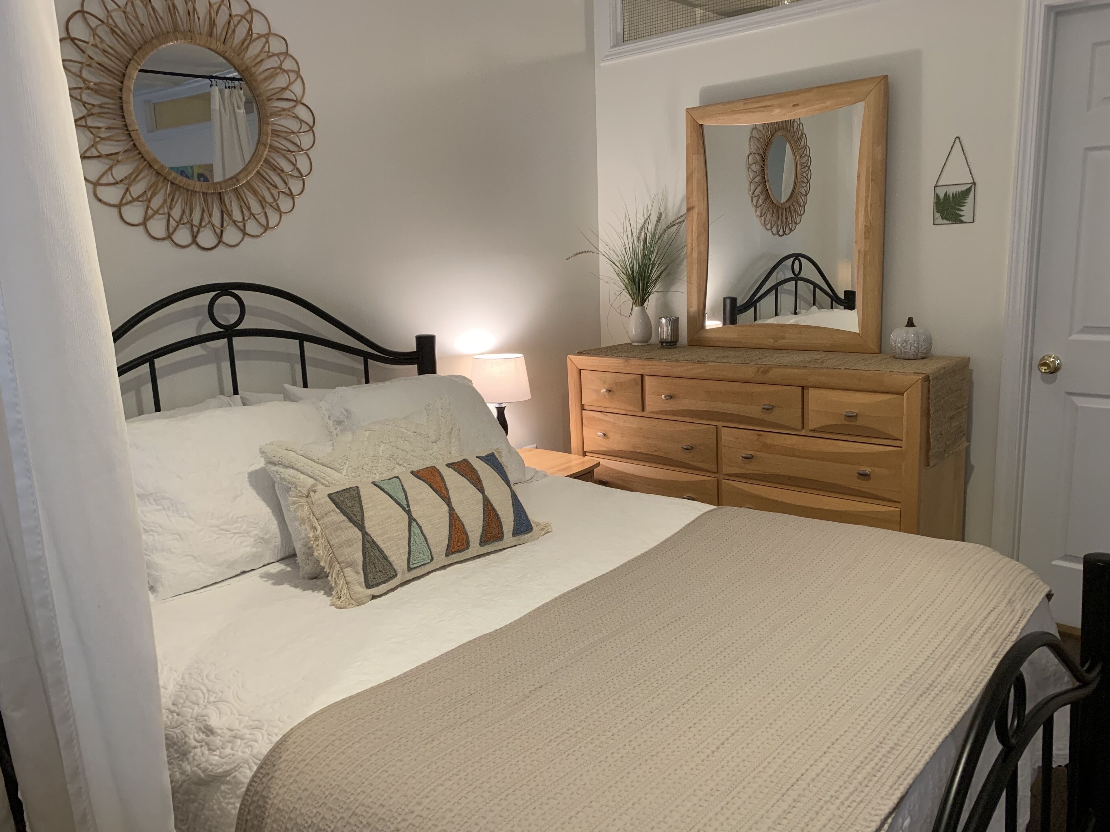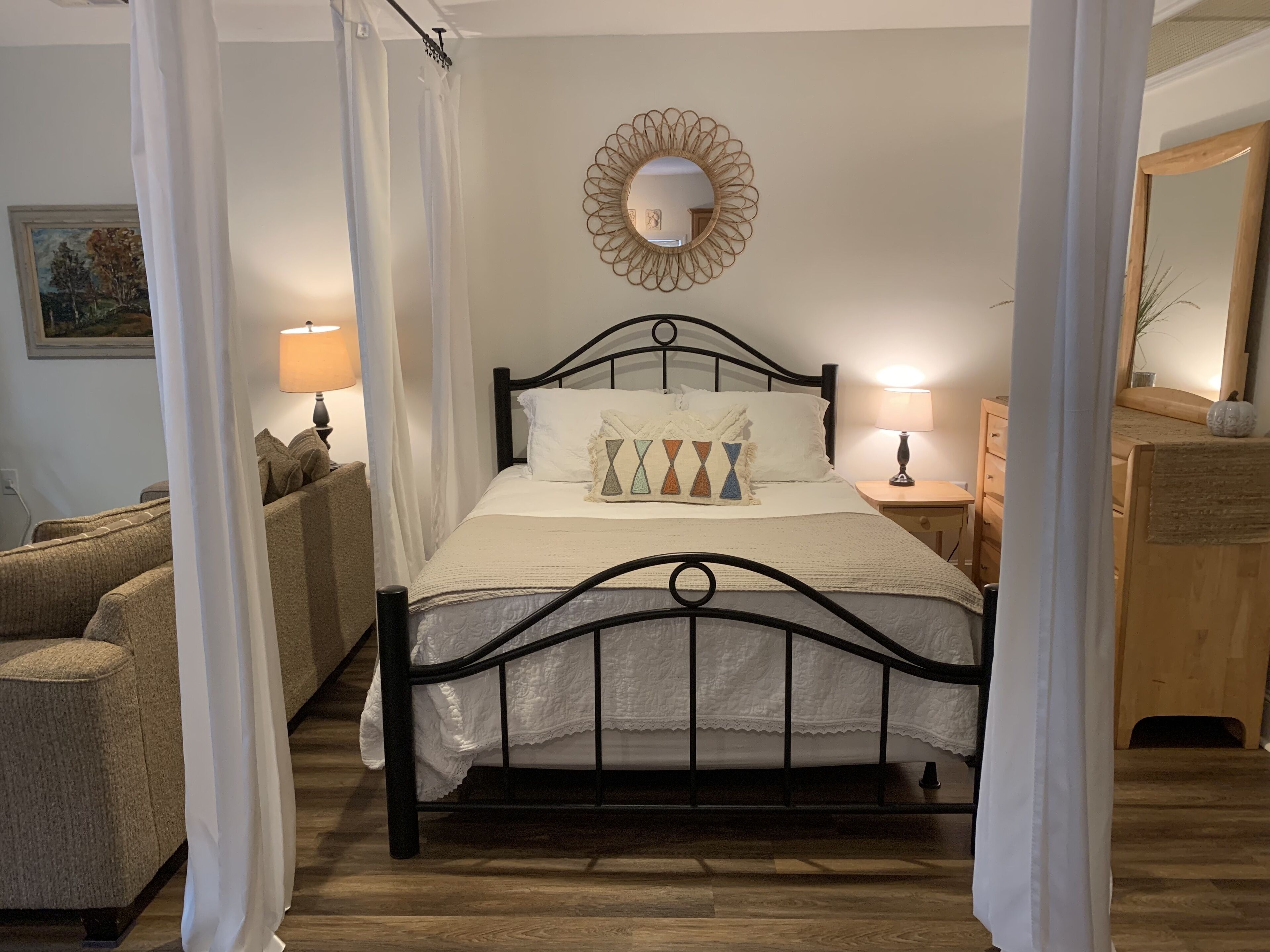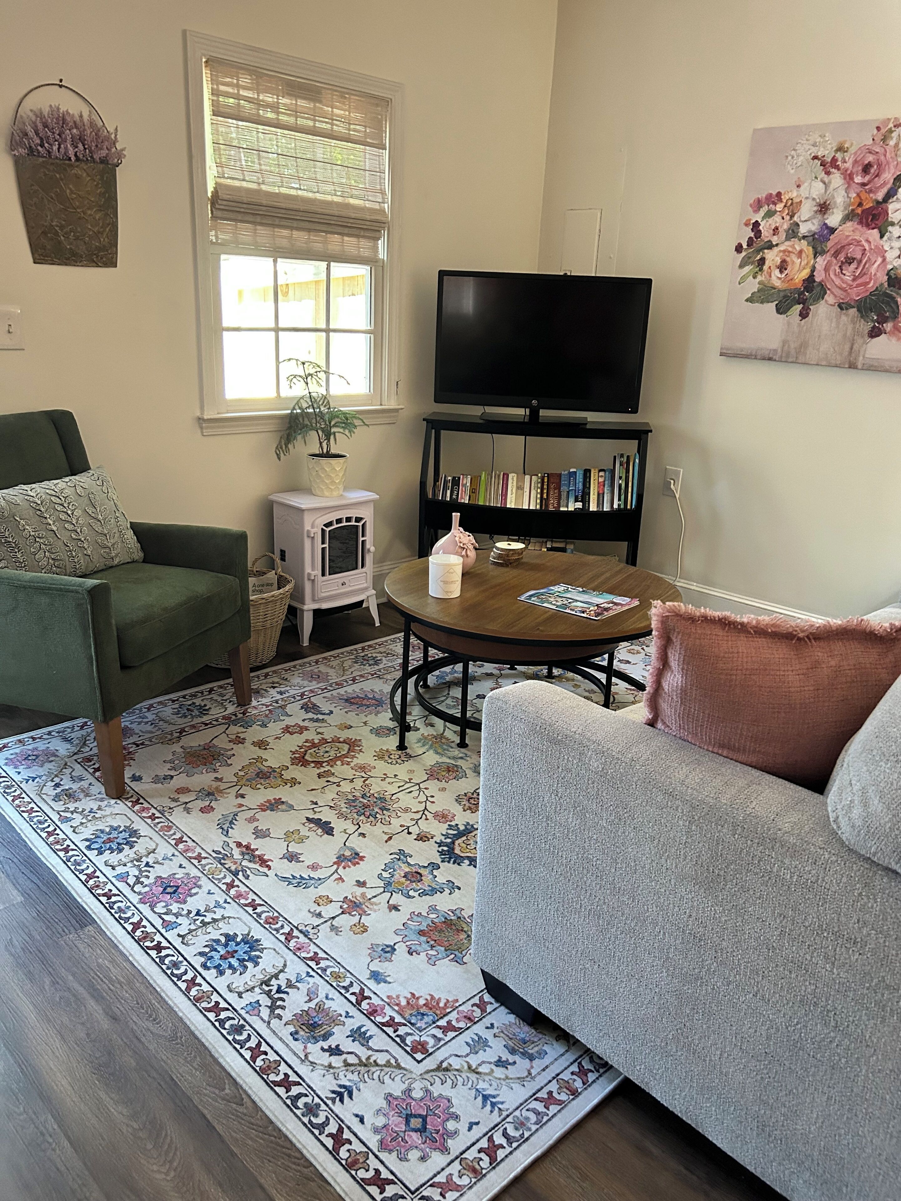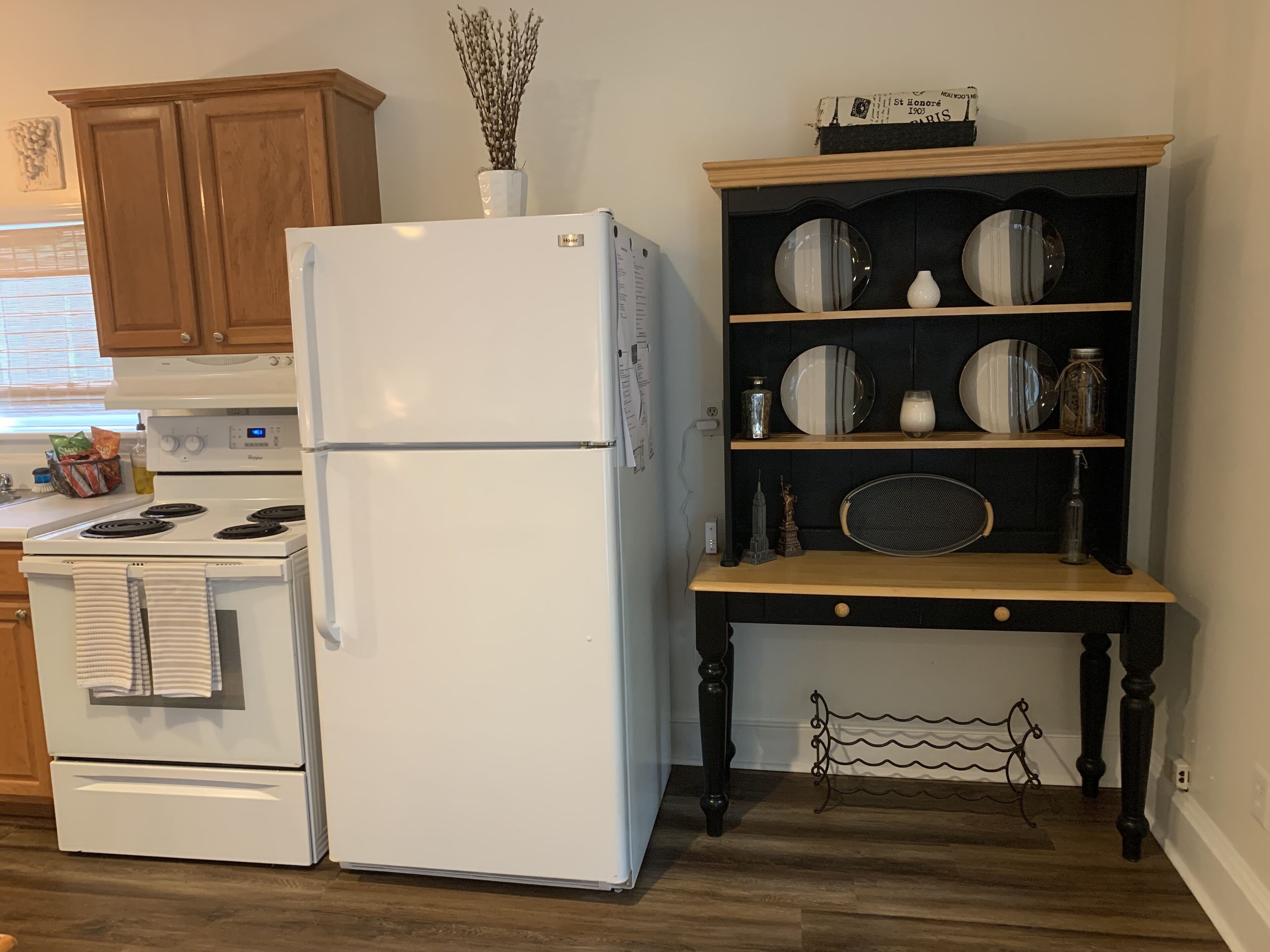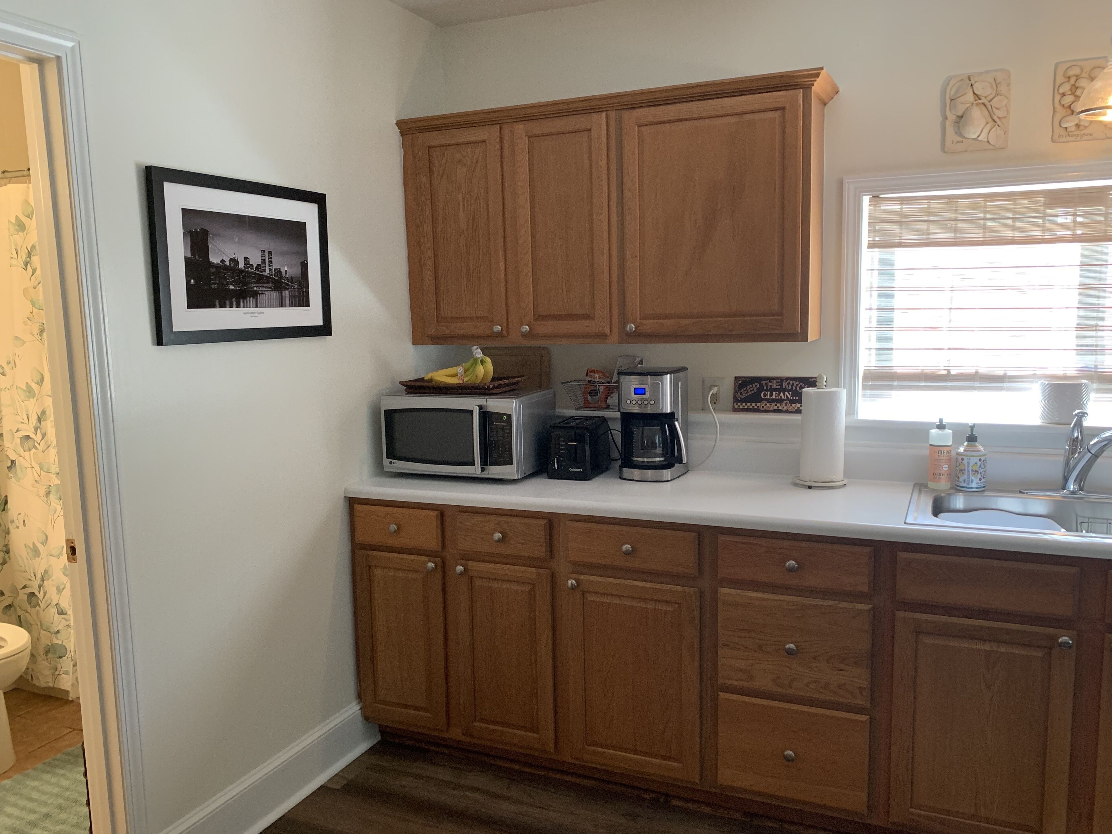 Private Pet Friendly Cottage Our cottage is a private, quiet retreat. It has a queen sized bed with privacy curtains, a living room sitting area, dining area, kitchen, bathroom with shower (hand held and stationary) and tub. Also a large closet with washer and dryer. Set back off the road at the end of long driveway. Small fenced in area with privacy fence to keep kids and pets safe. Suitable for 2 or 3 people and possible pet. All cooking utensils are provided. Twin foldaway bed for an addition guest. Minutes from the Avenues of West Cobb and the Marietta Square.