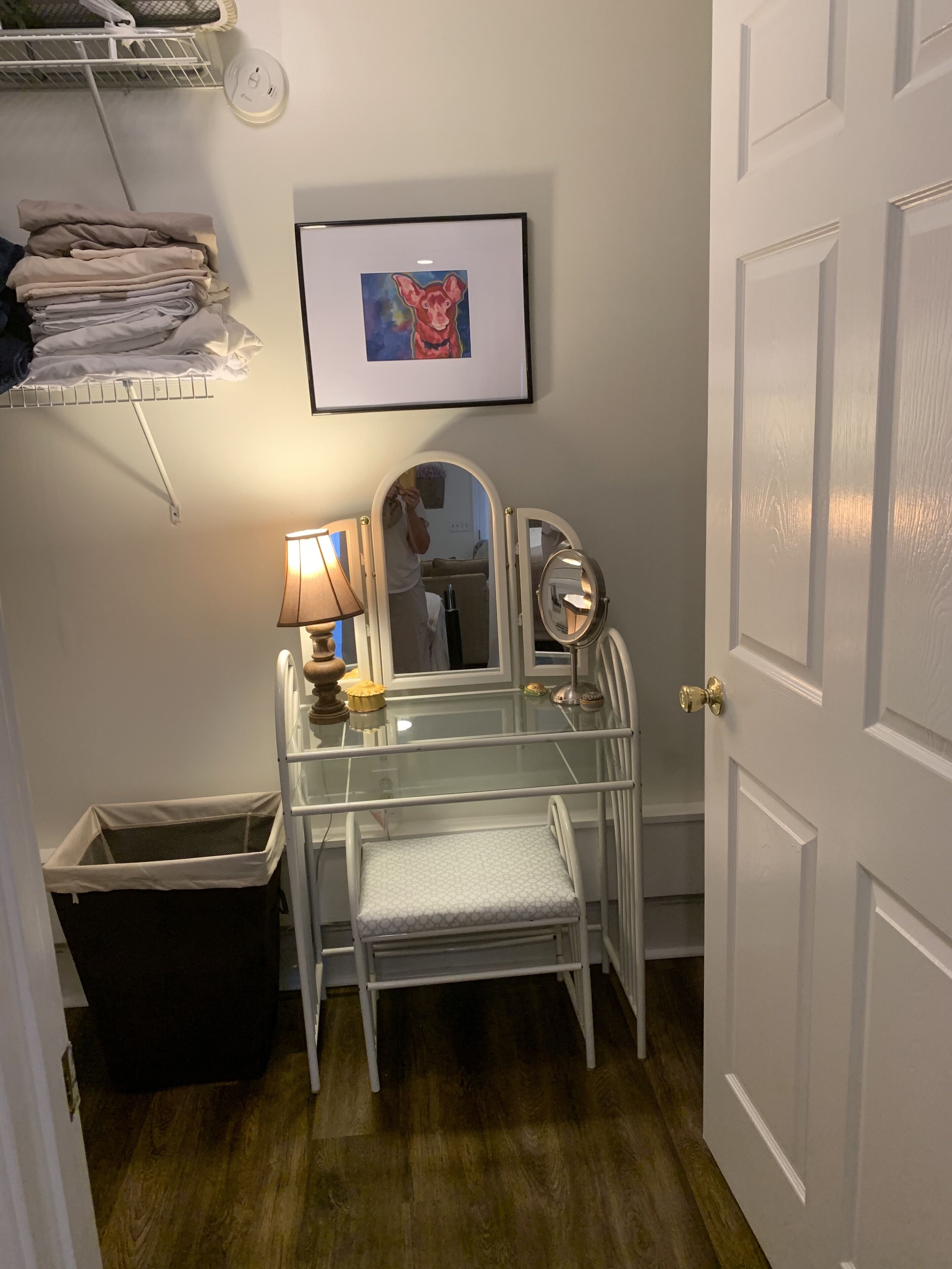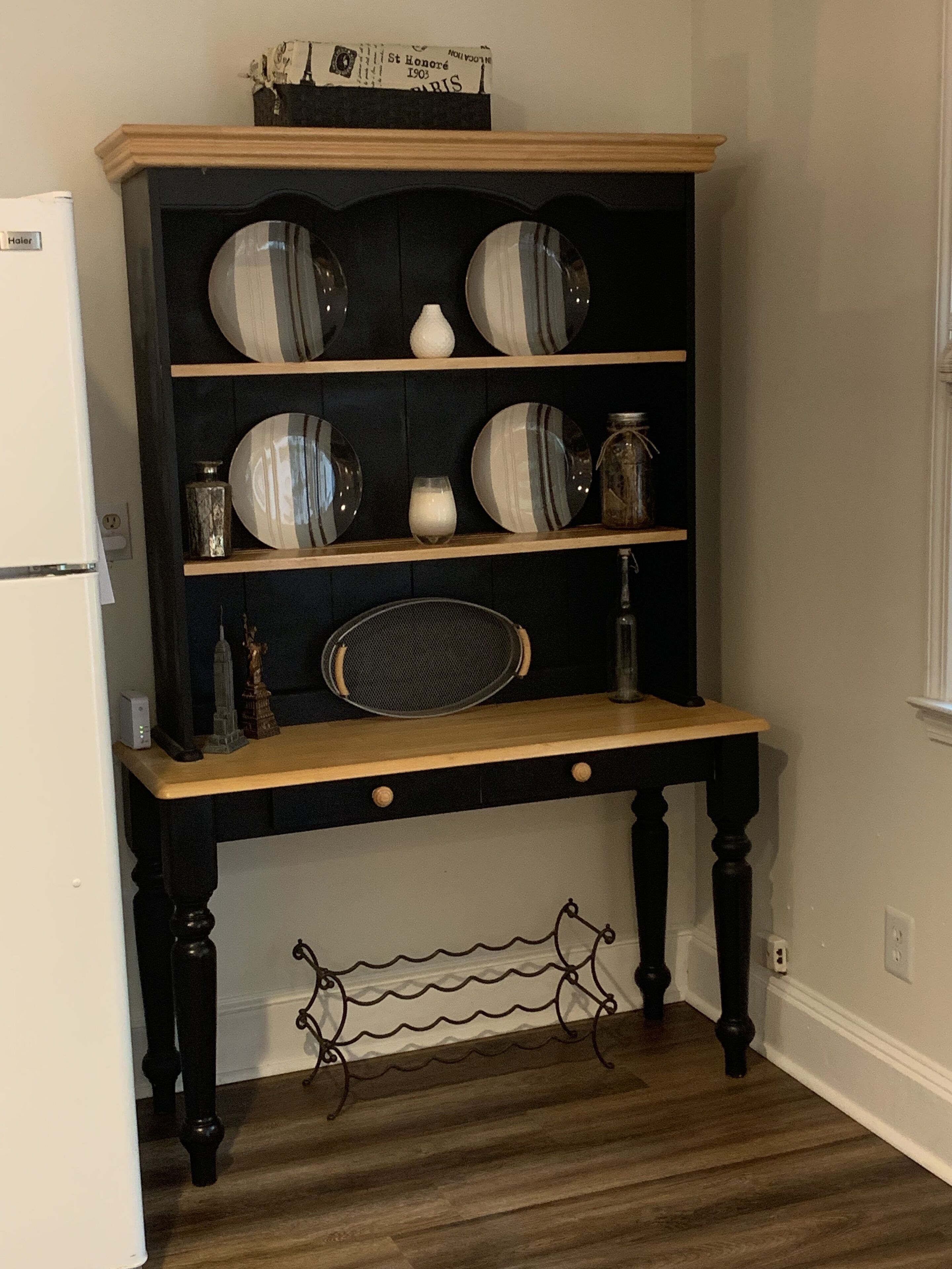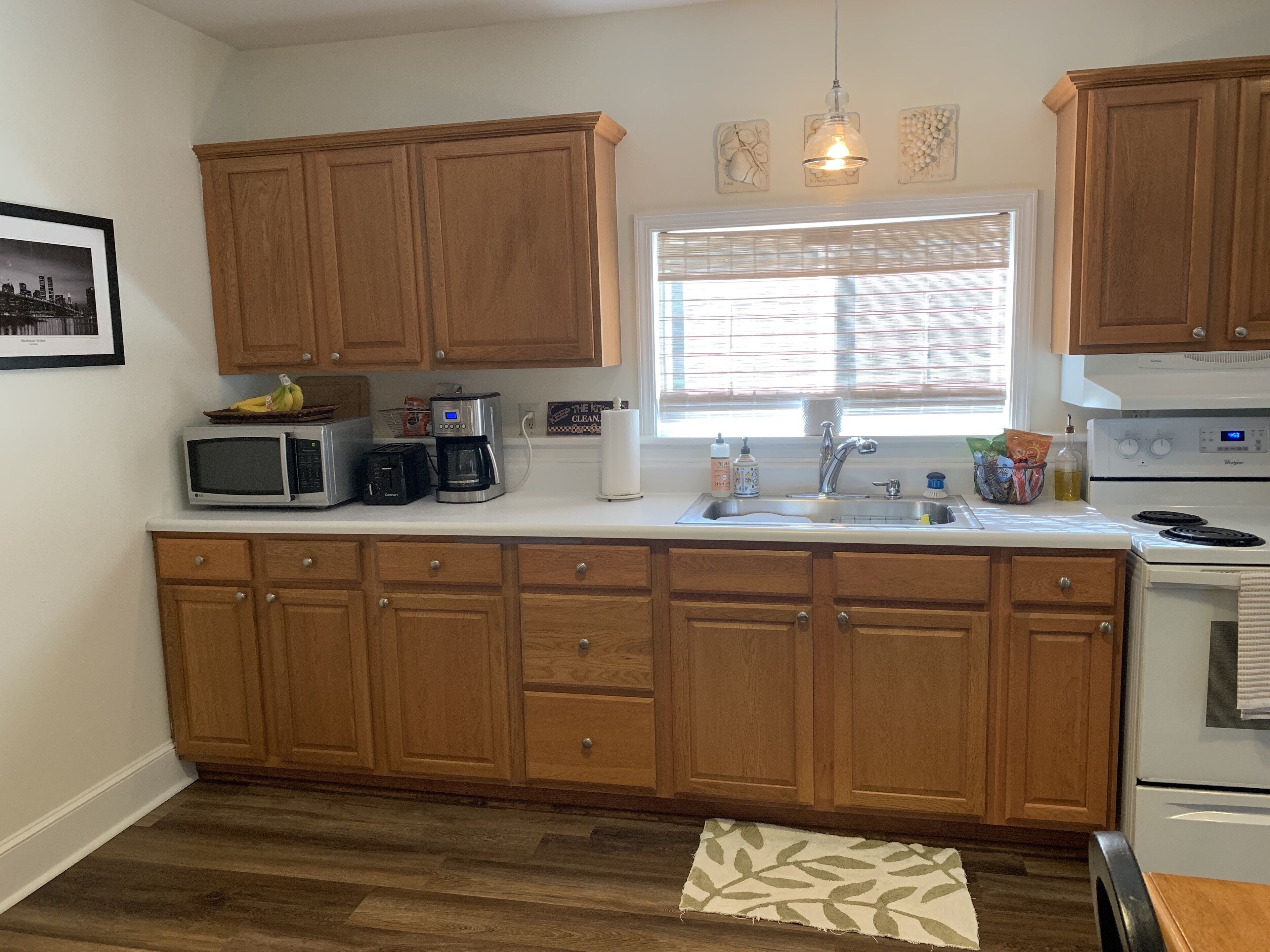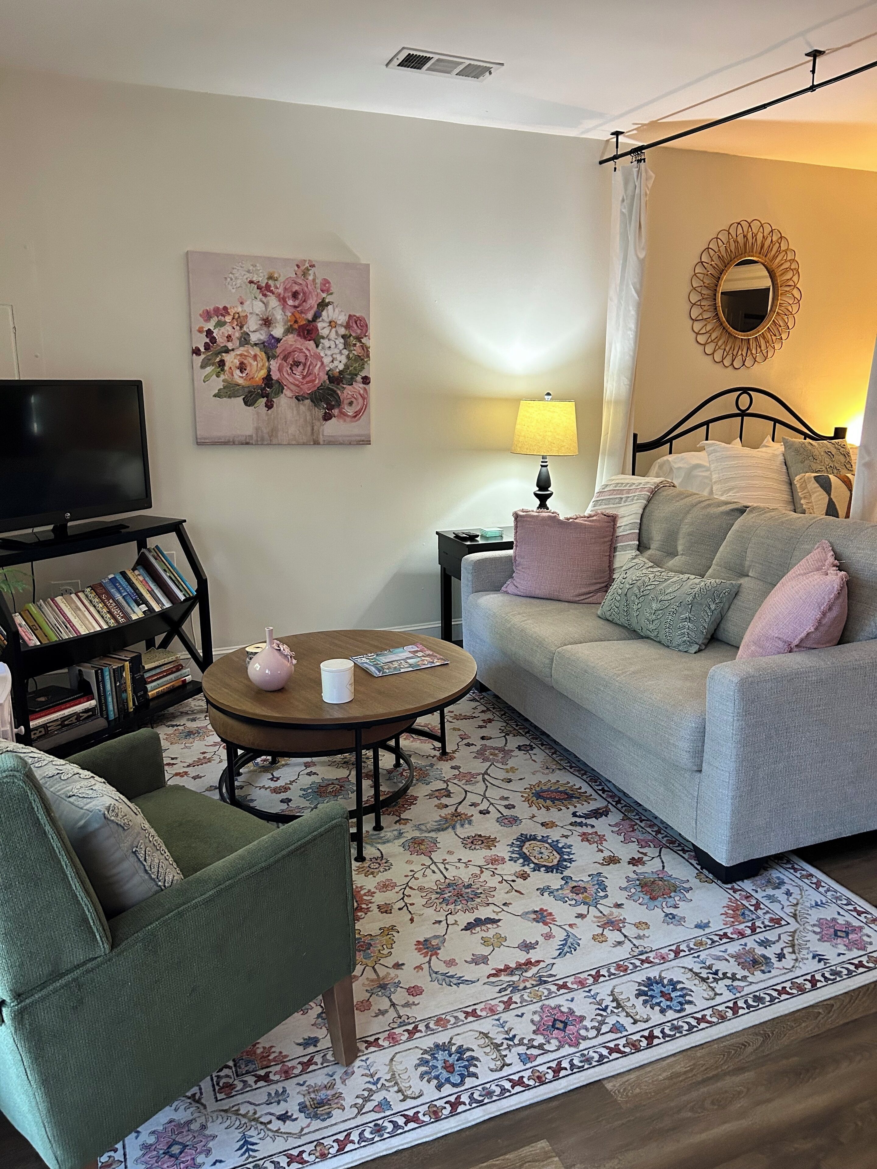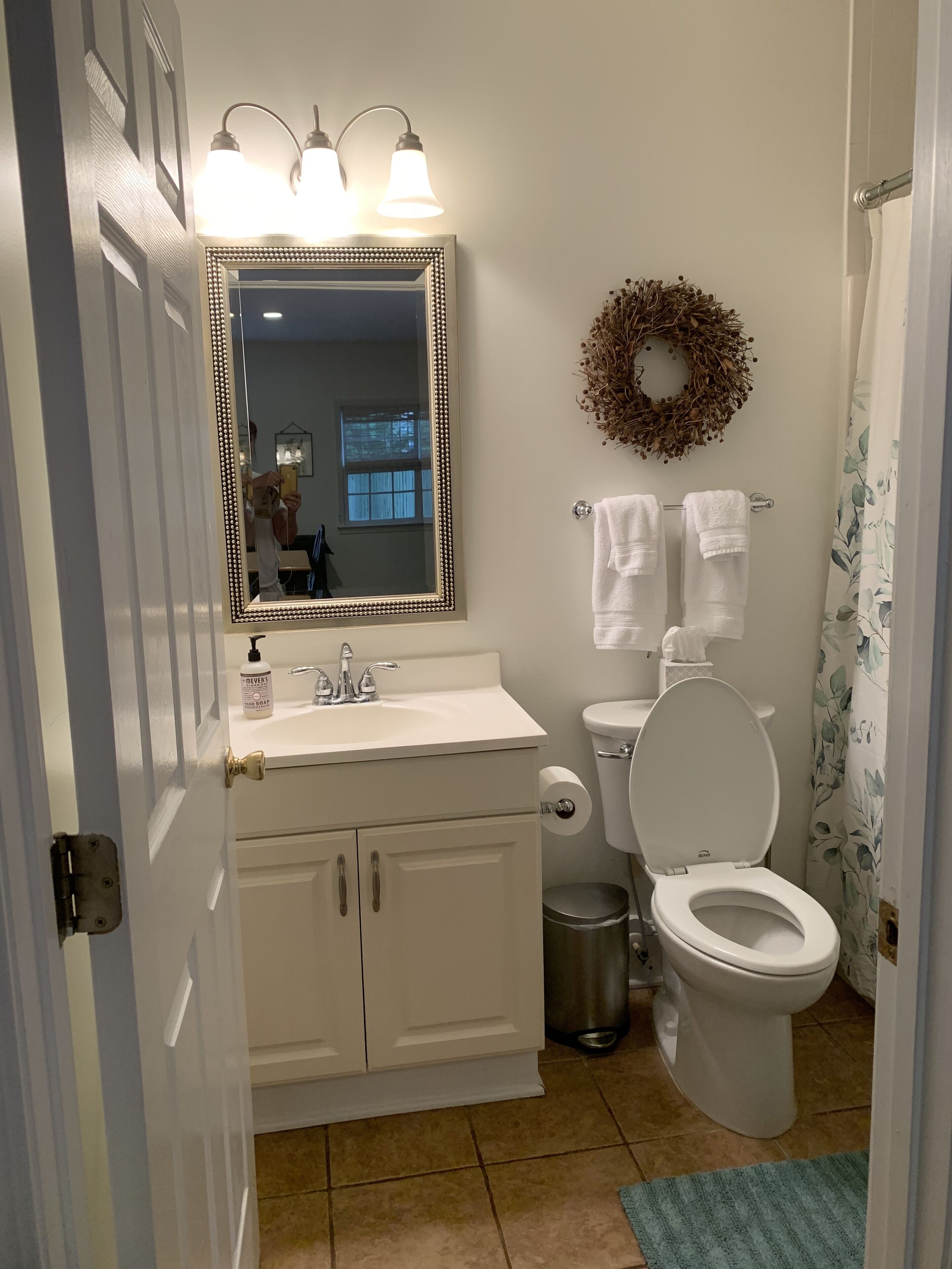 Private Pet Friendly Cottage Our cottage is a private, quiet retreat. It has a queen sized bed with privacy curtains, a living room sitting area, dining area, kitchen, bathroom with shower (hand held and stationary) and tub. Also a large closet with washer and dryer. Set back off the road at the end of long driveway. Small fenced in area with privacy fence to keep kids and pets safe. Suitable for 2 or 3 people and possible pet. All cooking utensils are provided. Twin foldaway bed for an addition guest. Minutes from the Avenues of West Cobb and the Marietta Square.
