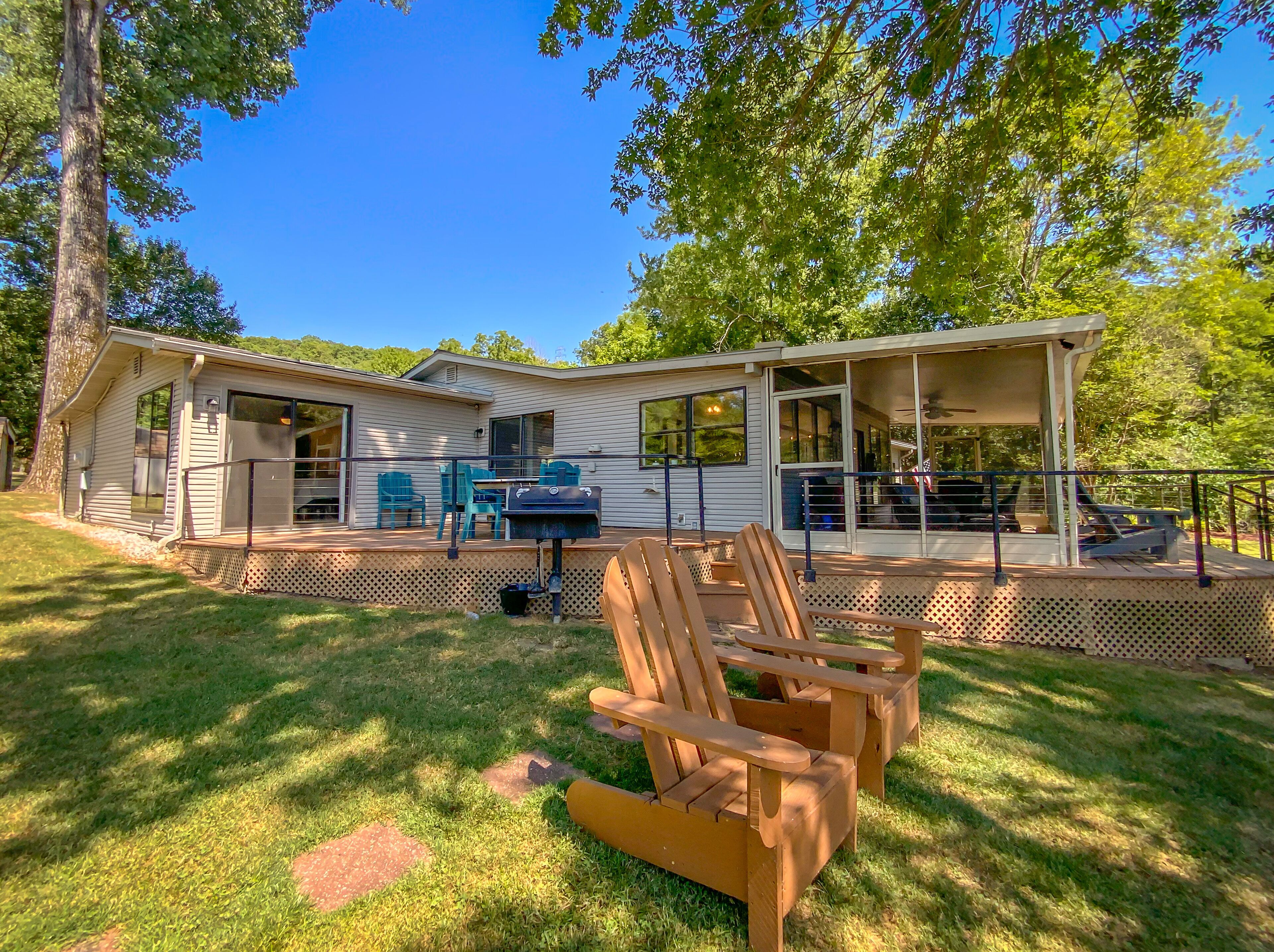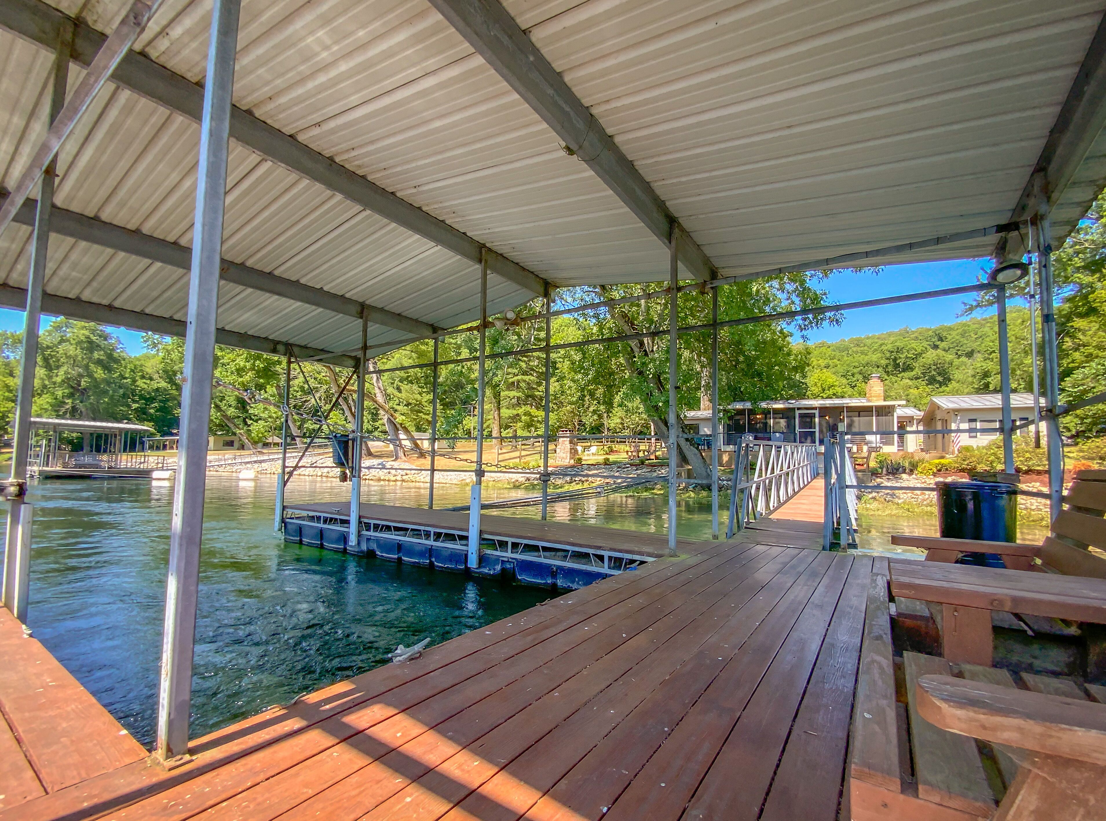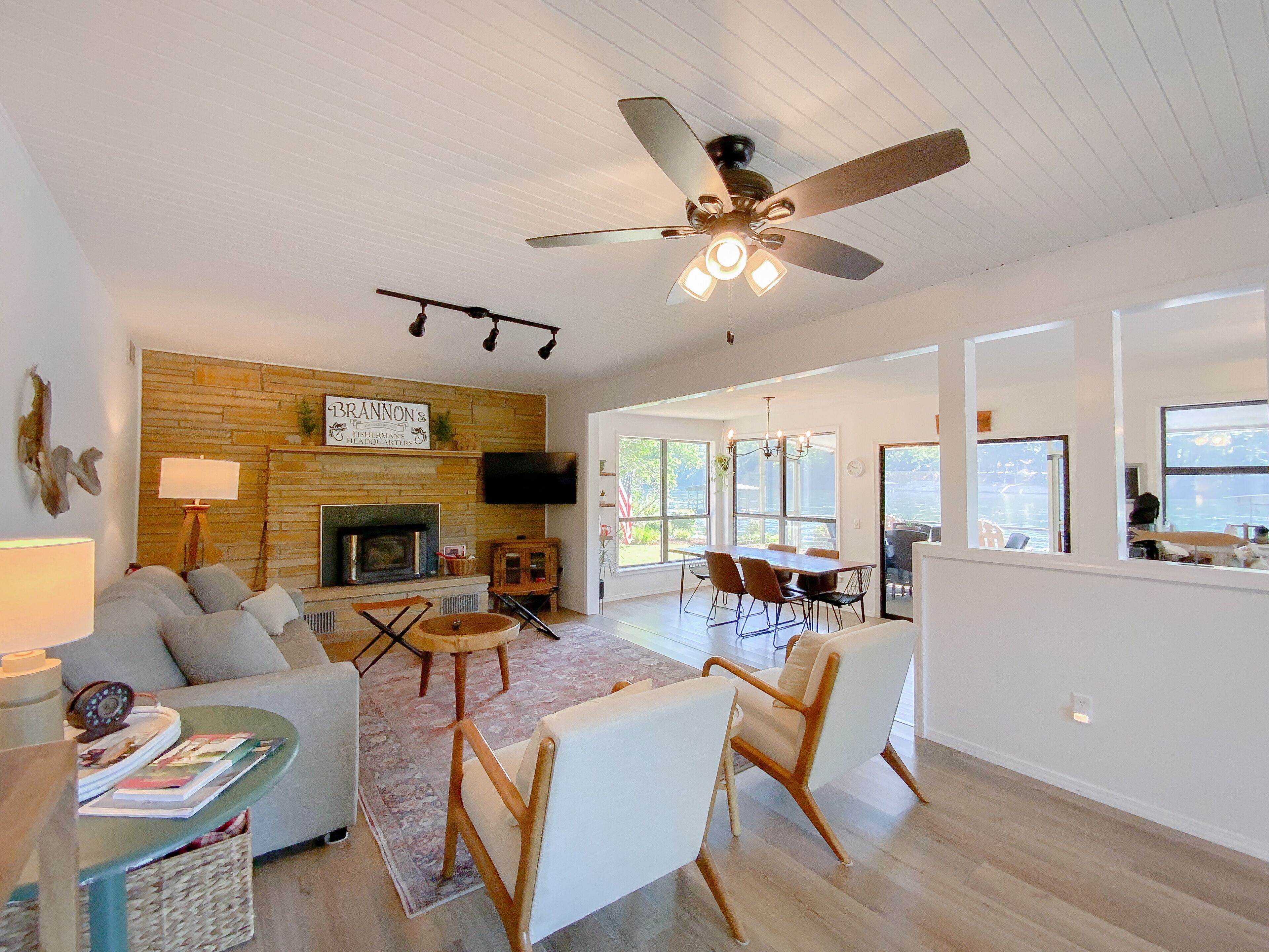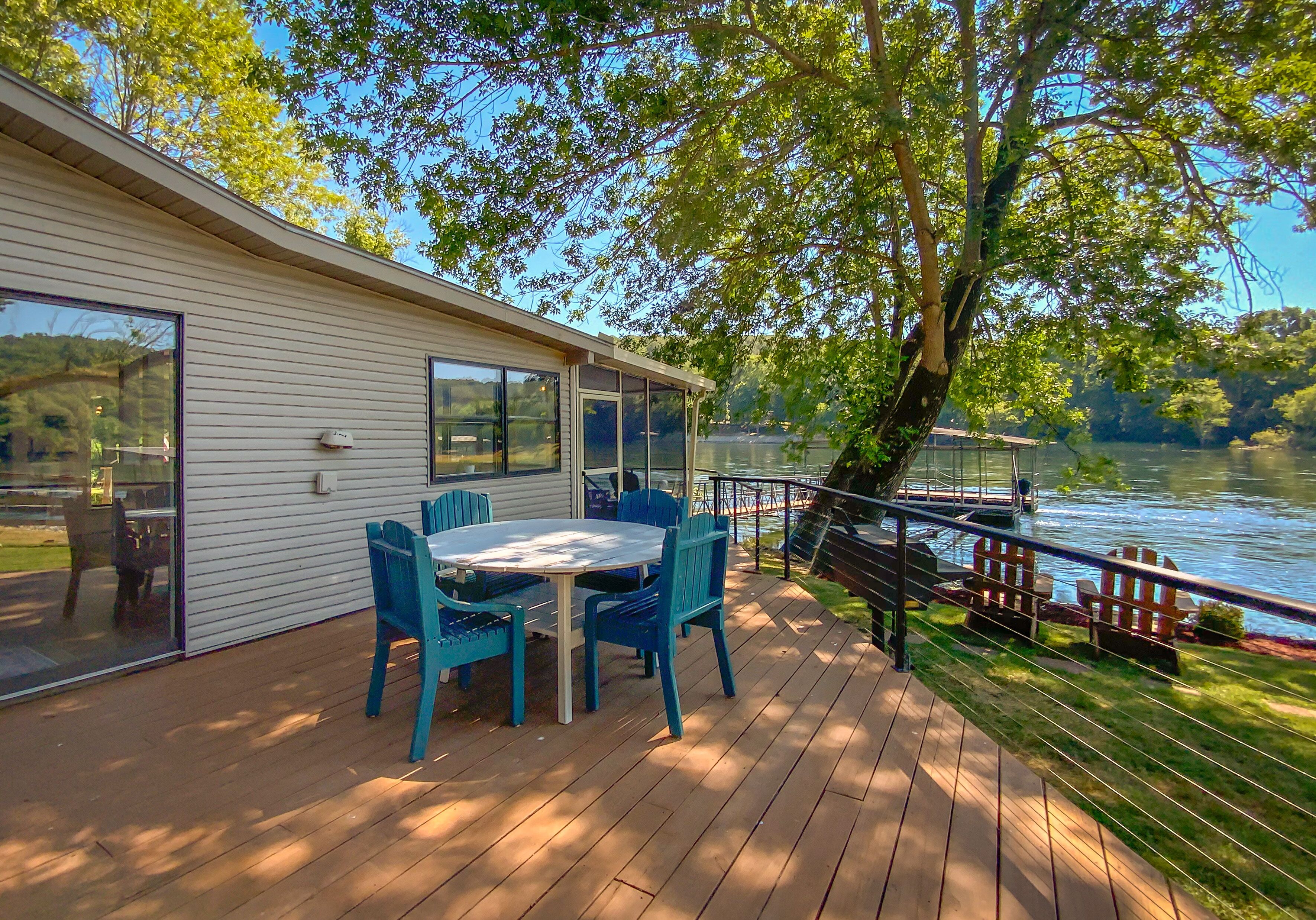 As close to the water as you can get! Updated and relaxing! Check out this private + recently renovated river home in Flippin, Arkansas. Known for some of the best fishing in the world, our cabin in nestled in a private neighborhood, near Wildcat Shoals. Our boat dock allows for convenient pick up and drop off for fishing guides. You are able to dock up for lunch, or to swap out who is fishing. World Class fly fishing up and down the beautiful White River! Bull Shoals Lake offers excellent fishing and boating only 8 miles away. Boats available for rental on the river and lake. The dock is shared with one other family in the area. Our property has been upgraded with bank stabilization - the rock bank allow guests to walk down to the water, and depending on water levels, wade and bank fishing can be easily accessible. Views of the beautiful White River can be seen from almost every room in the house. Offering an open floor plan, guests can enjoy a fully stocked kitchen with extra small appliances for convenience (including a fish fryer, crockpot, blender, and more), a large screened-in porch with lounge chairs to drink coffee and an outdoor dining table for dinners, a beautiful outdoor fireplace to roast s'mores, and a charcoal grill available. Charcoal and firewood available upon request. Rooms are all furnished with luxury linens and and we offer accommodations for kids and babies (crib, high-chair, and toys are available, if needed). Bedroom 1 - king bed (crib available) Bedroom 2 - queen bedBedroom 3 - (2) twin beds - walk thru from Bedroom 2. Offering fiber-optic, high speed wireless internet, and YouTube TV. Wal-Mart in Flippin is a convenient 3 miles away with grocery pick-up available.Fly fishing guides are available upon request, as well as recommendations for restaurants. We are sorry, but no pets allowed, unless first approved by owner.