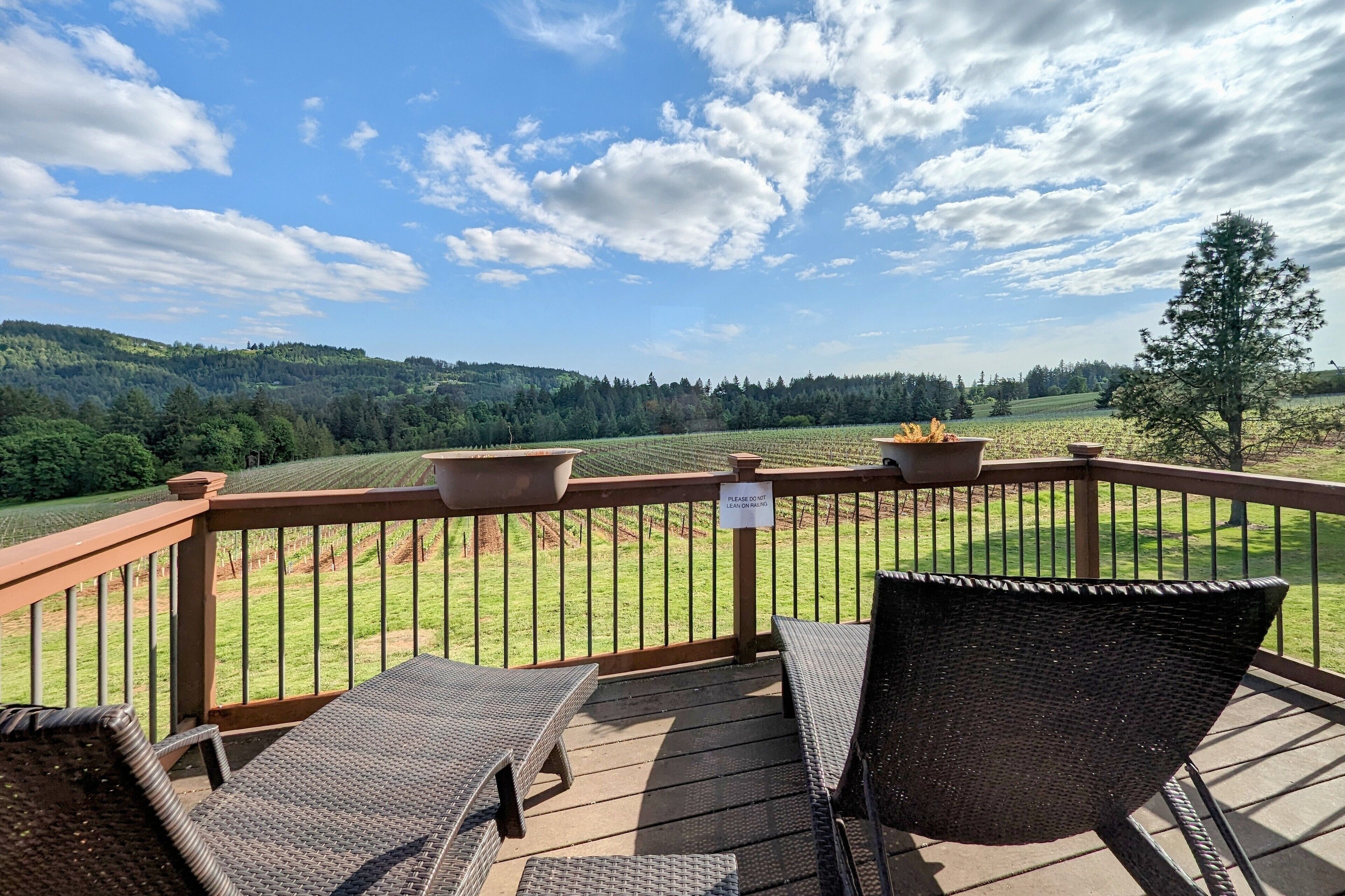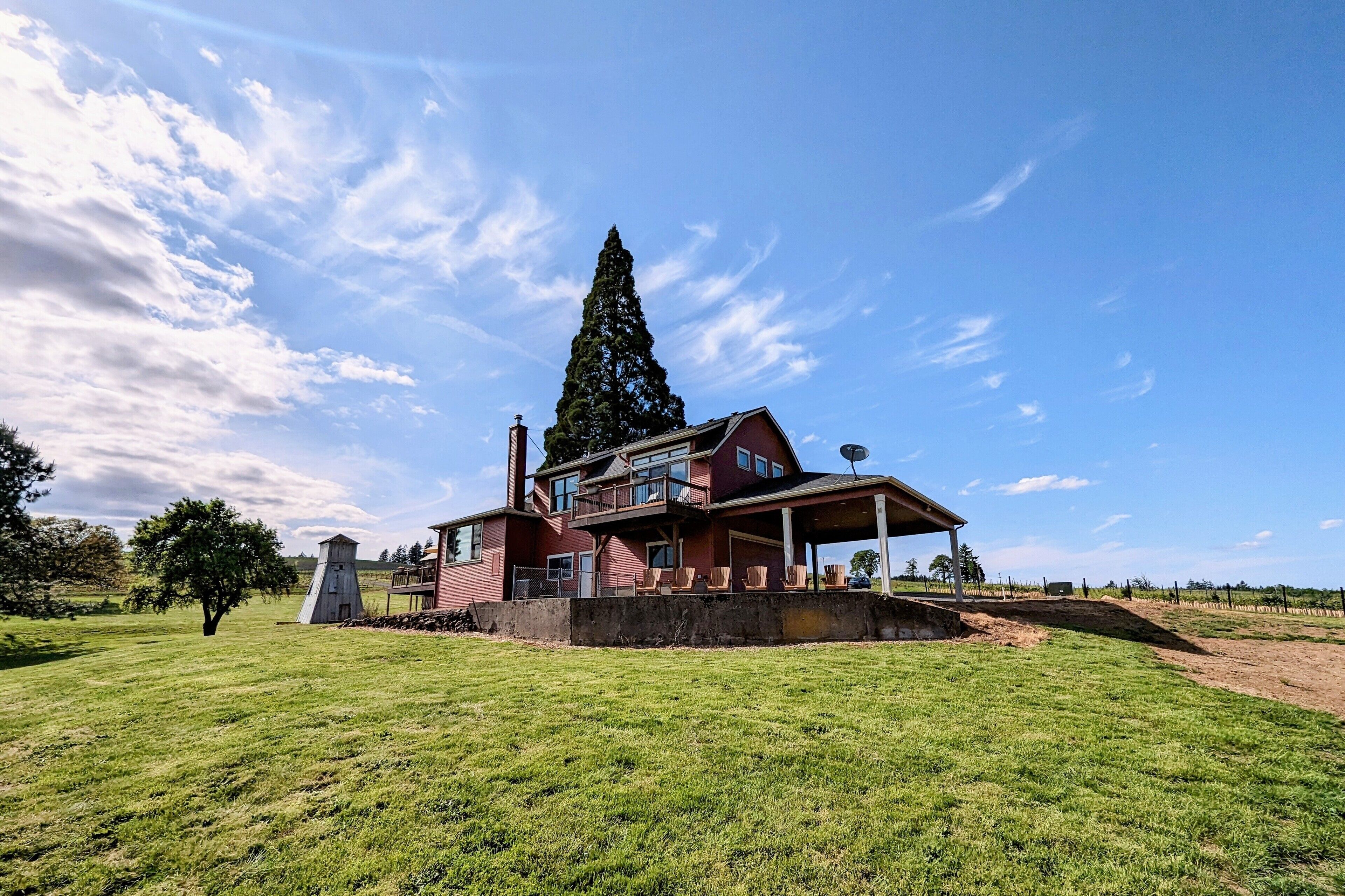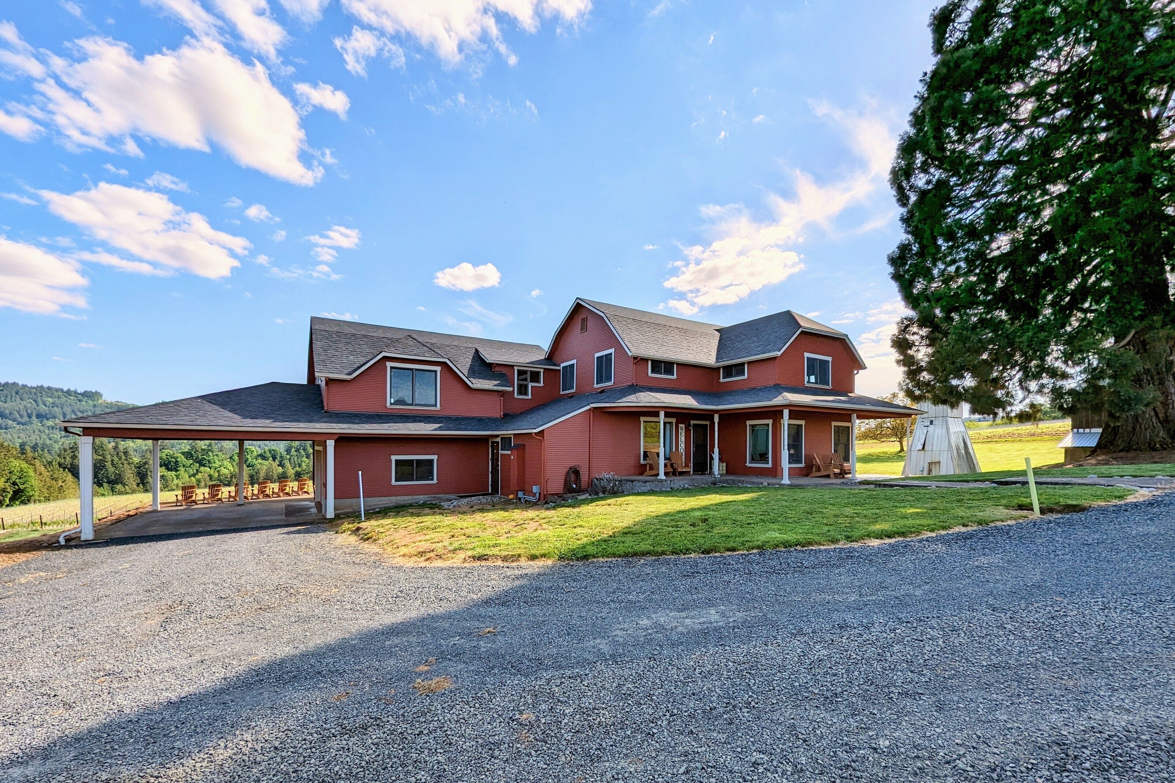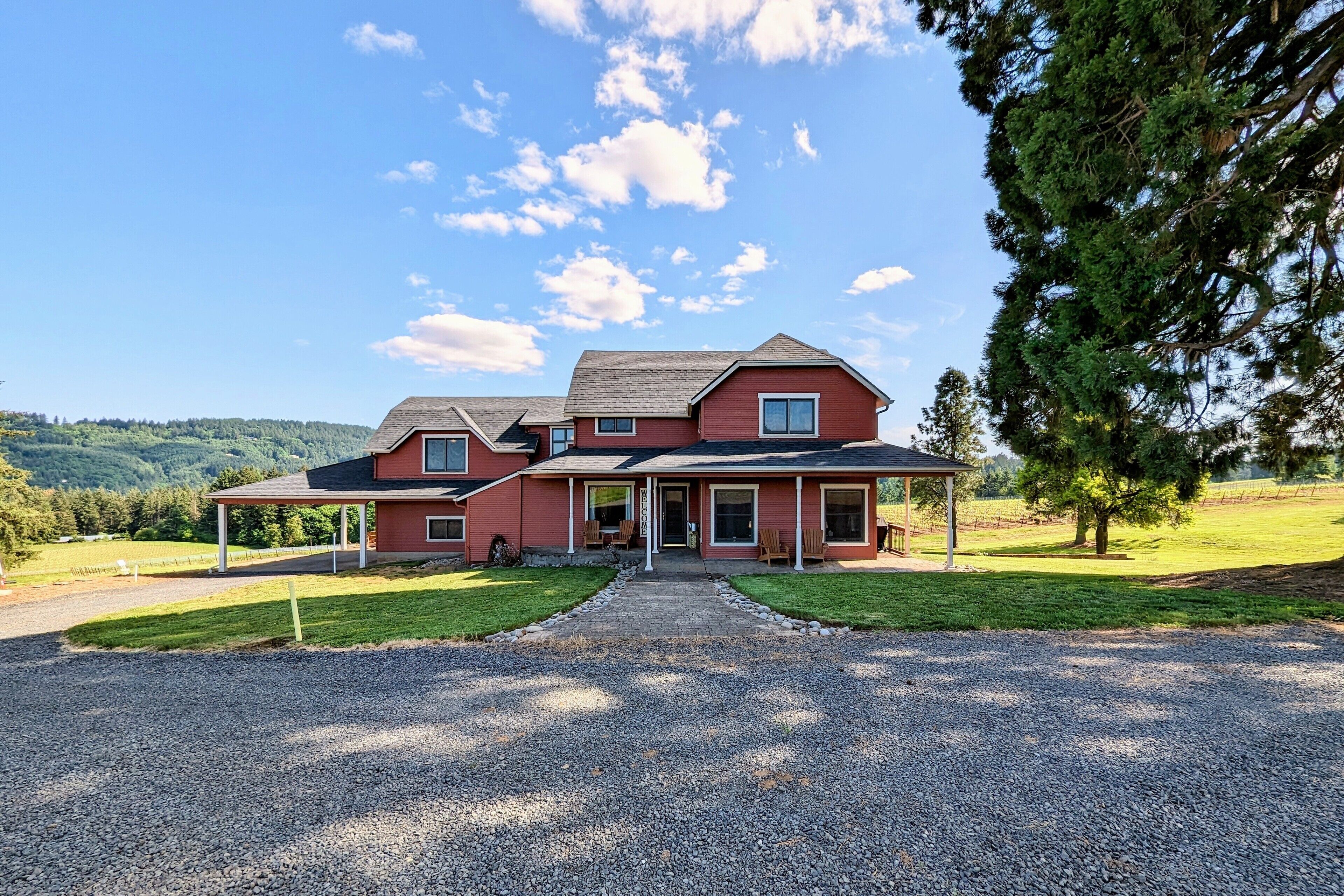 Bell Road Farmhouse - Surrounded by Chehalem Estate Vineyard! Welcome to Bell Road Farmhouse! Old-world charm meets luxury estate in Sherwood, Oregon! The lavish, 3,200-square-foot farmhouse is surrounded by the newly planted Chehalem vineyards. Bell Road Farmhouse sits on 80 sprawling acres, welcoming guests to the enchantments of wine country. This Farmhouse is the perfect place to gather with the family as it offers five bedrooms and three full bathrooms.The entryway will bring you into the mudroom/laundry room before stepping into the cheerful kitchen and dining area. The kitchen is stocked with everything you might need for cooking a delicious family meal. Enjoy it at the breakfast nook, or gather the entire group in the formal dining room, complete with a dining table that seats up to eight—perfect for a family dinner or board games. After a good meal, venture into the cozy, bright living room, grand windows, ample seating, and TV, built for time with loved ones.A spacious queen bedroom is located to the right of the kitchen by the front door. There is another dining room table farm style for game nights, or conversations and laughs!Up the stairs near the living room, you’ll find a landing where the primary suite resides. This suite offers a full bathroom with a jacuzzi soaking tub, two walk-in closets, a king-size bed, and a private balcony. This spacious room features stunning views of sprawling farmland and natural light, each room is outfitted with hotel-quality linens and plush mattresses. The steps outside the room will take you to a loft with an extra large twin-day bed with a trundle. Perfect space for children to be entertained by games, and a smart TV! Through that room, you will find two additional rooms with queen-size beds, along with a shared full bathroom complete with a large standing shower, hairdryers, shampoo, conditioner, luxurious towels, and locally crafted soap bars to help you feel at home during your stay. The staircase will wrap you back around to the front door and queen bedroom on the main level of the home.Outside, Bell Road Farmhouse continues to charm with sprawling lawns. Enjoy dinner on the patio with an outdoor dining area for up to eight and a BBQ. Take a stroll with your morning coffee down the fence line to take in views of the grassy fields. Or cozy up on the porch with a glass of wine at night to soak up the endless views of the night sky.Use our private wine tour service to experience the beauty and unique culture in Oregon’s world-renowned wine country, where every visitor walks away with lifetime memories.Additional family items (baby gate, high chair, pack 'n play, yoga mats, air mattresses, and outdoor games) are available to rent upon request.*Lifestyle Properties would like to assure you that all homes have been aerated, and deep cleaned, and commonly used surfaces have been sanitized prior to your arrival. Our team is committed to following all CDC and WHO guidelines regarding the use of PPE and Cleaning Equipment. You will also have a contactless self-check-in upon arrival.*