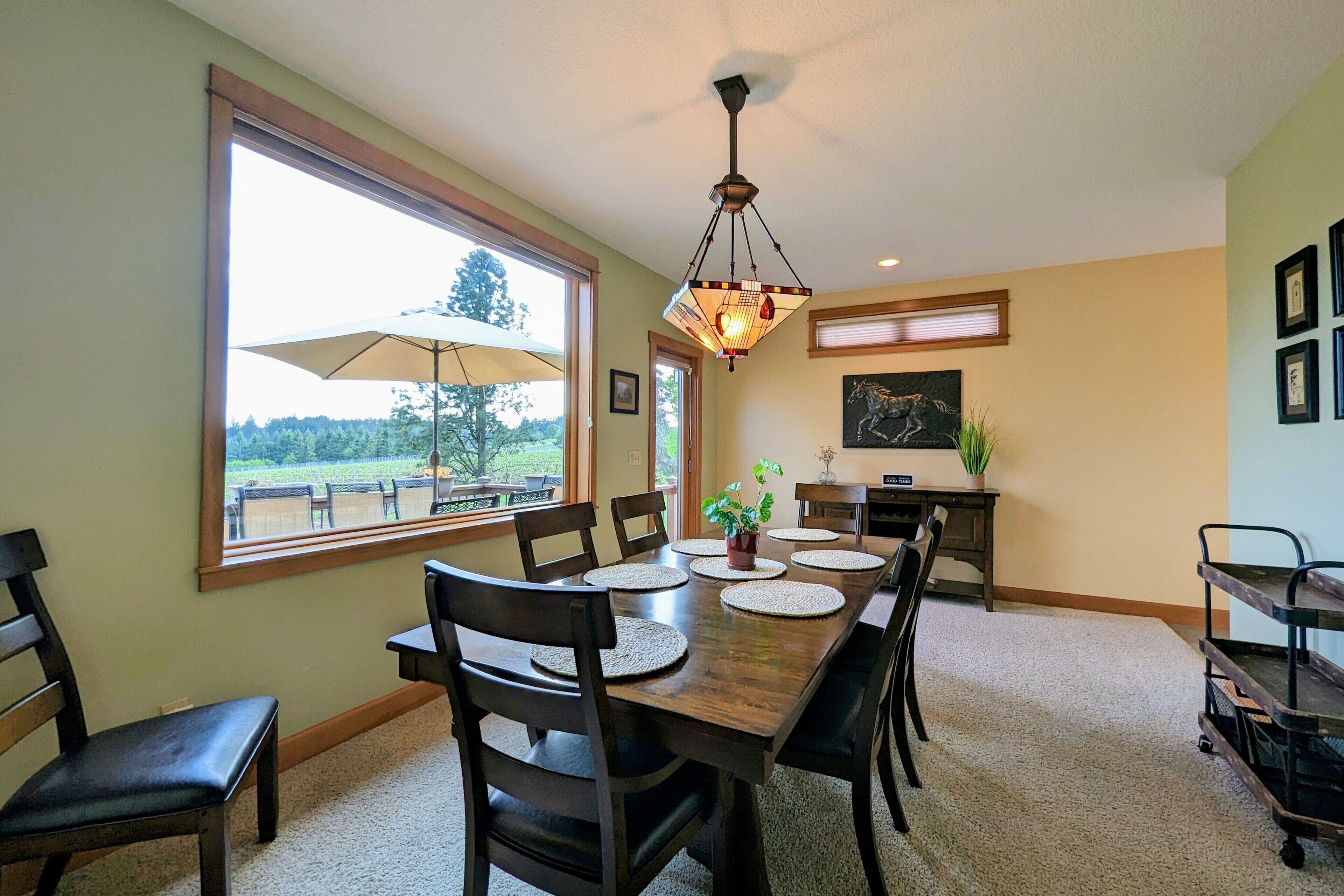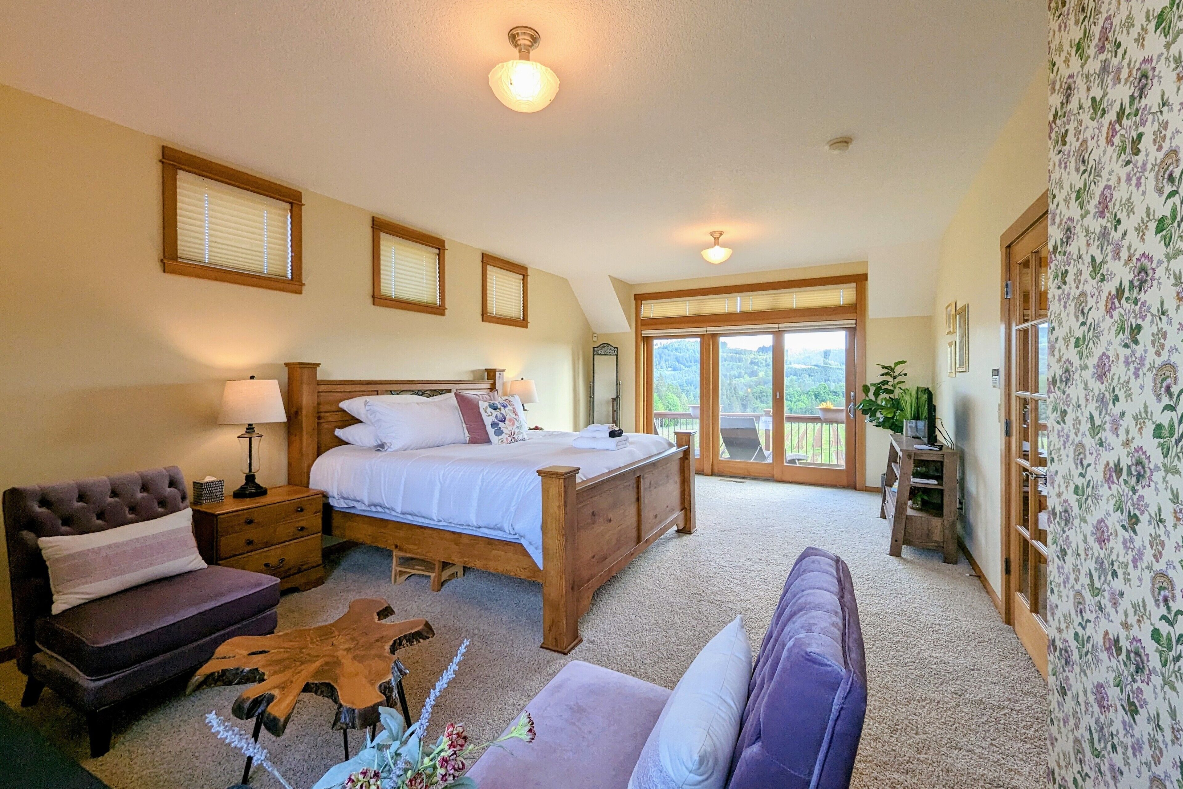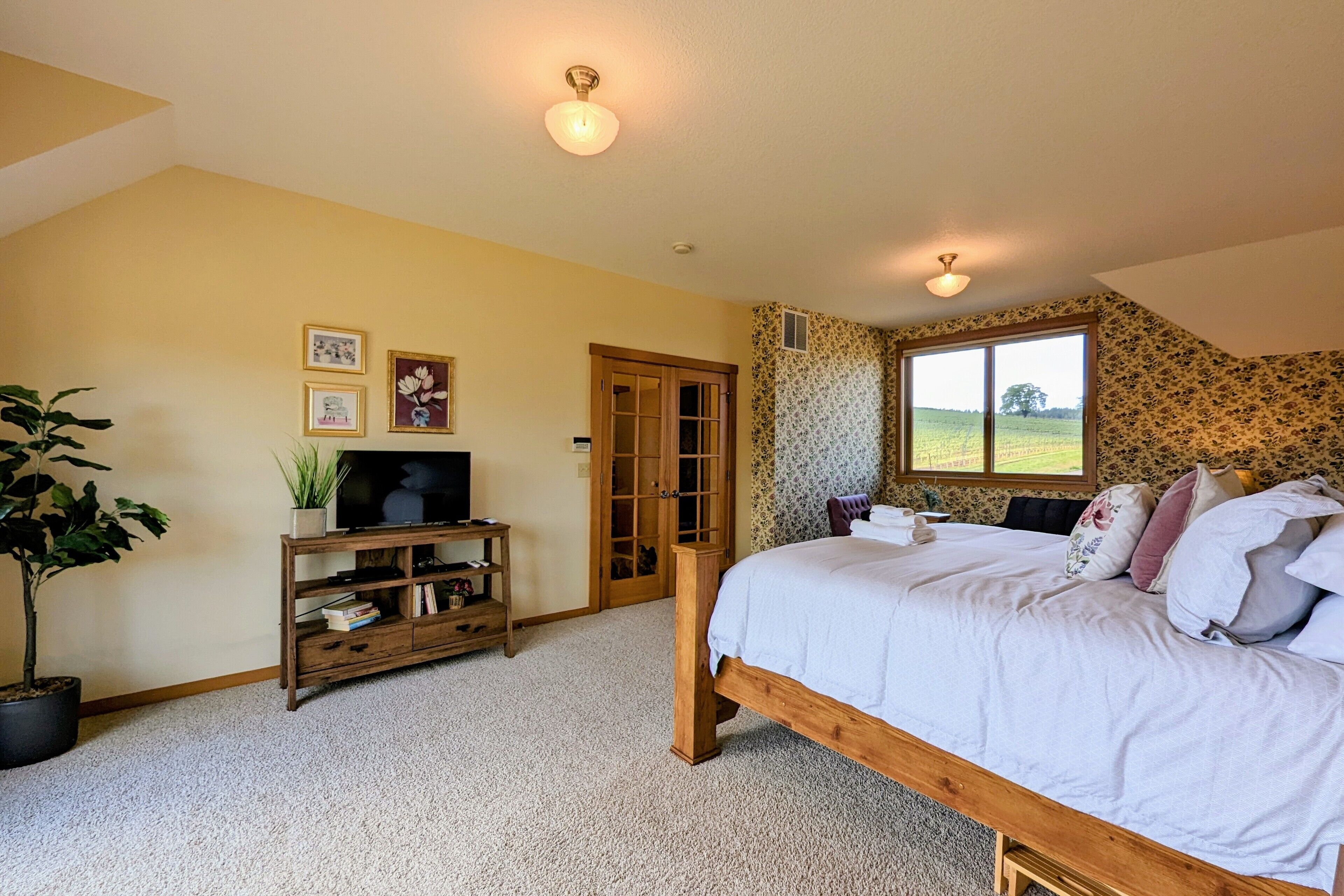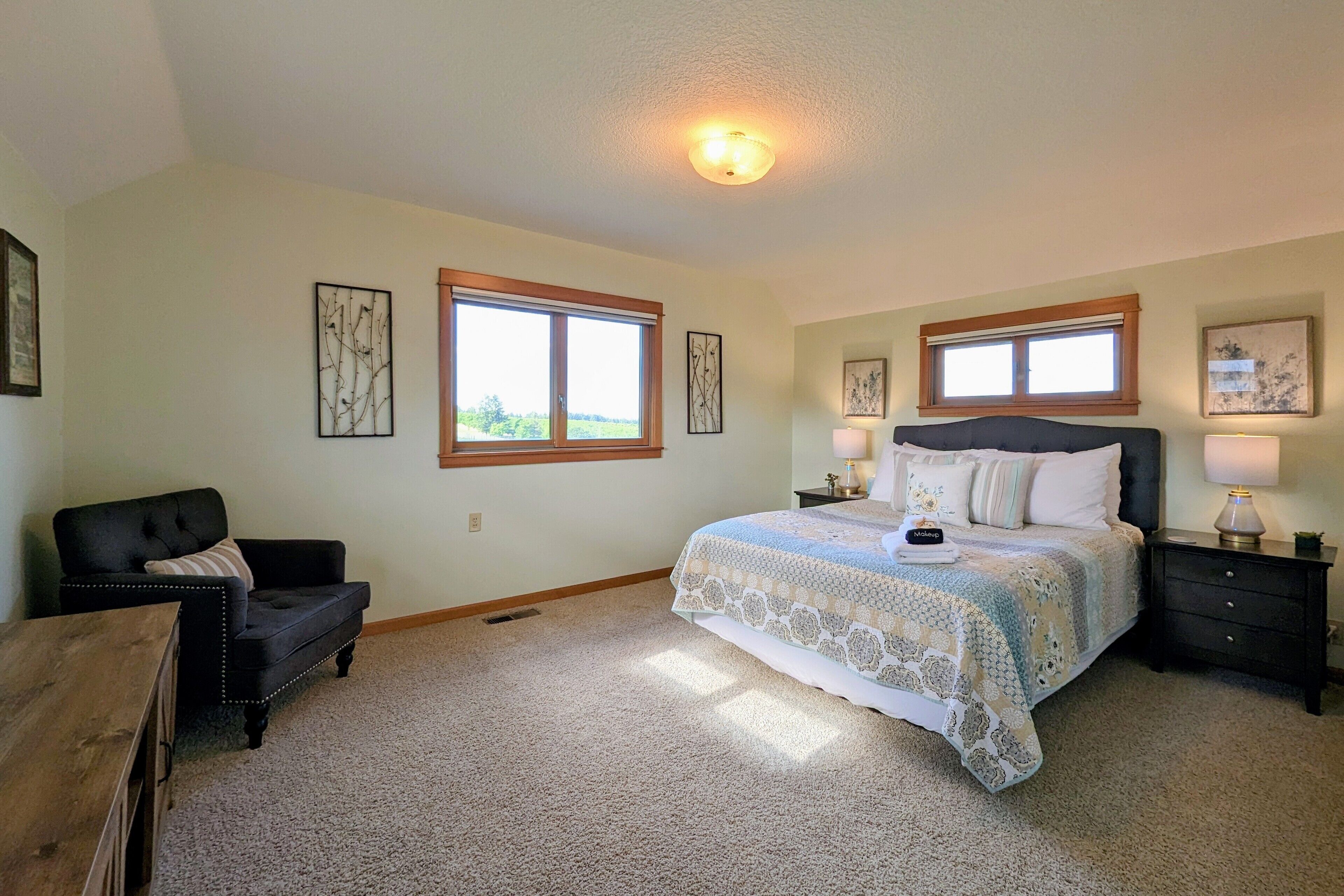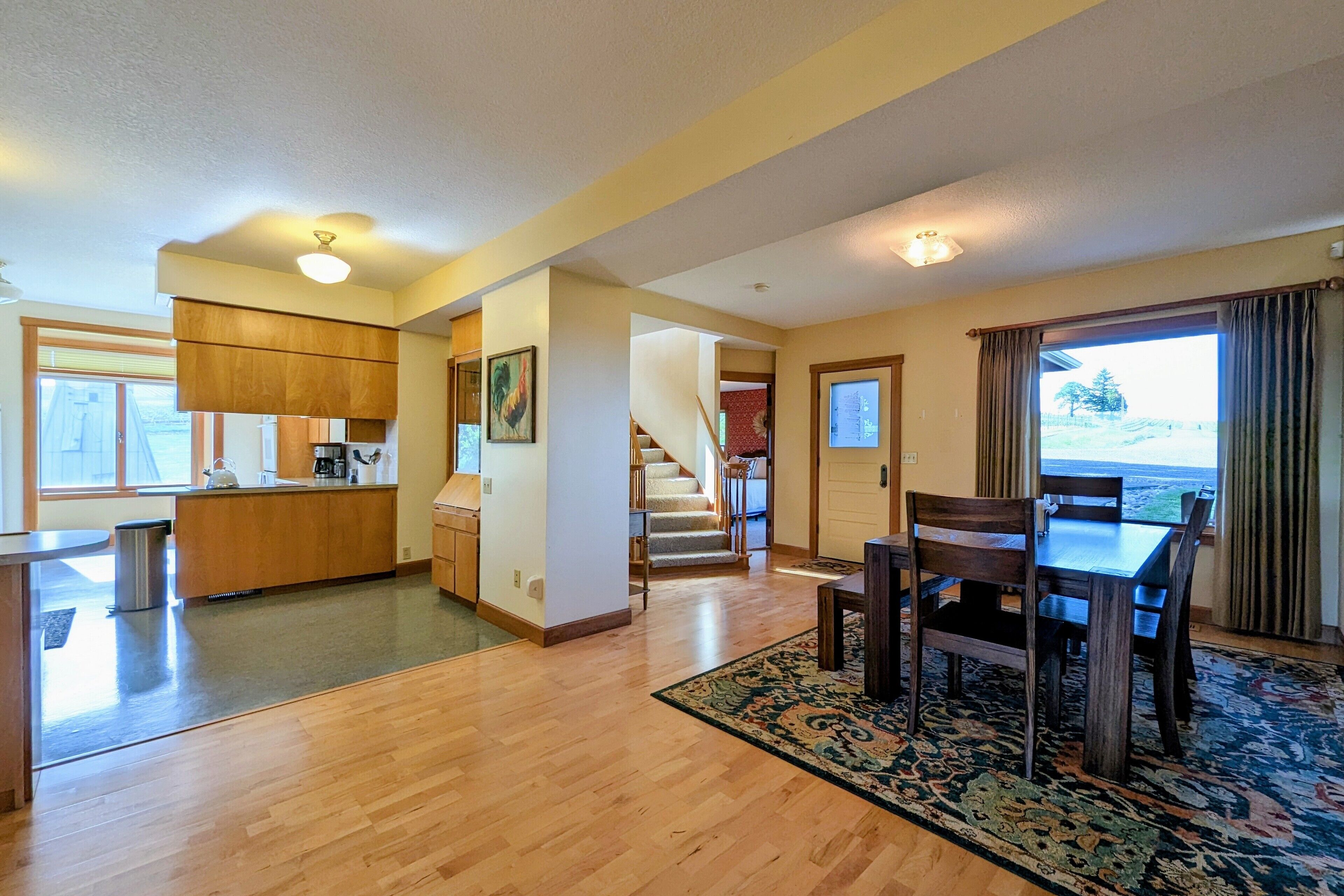 Bell Road Farmhouse - Surrounded by Chehalem Estate Vineyard! Welcome to Bell Road Farmhouse! Old-world charm meets luxury estate in Sherwood, Oregon! The lavish, 3,200-square-foot farmhouse is surrounded by the newly planted Chehalem vineyards. Bell Road Farmhouse sits on 80 sprawling acres, welcoming guests to the enchantments of wine country. This Farmhouse is the perfect place to gather with the family as it offers five bedrooms and three full bathrooms.The entryway will bring you into the mudroom/laundry room before stepping into the cheerful kitchen and dining area. The kitchen is stocked with everything you might need for cooking a delicious family meal. Enjoy it at the breakfast nook, or gather the entire group in the formal dining room, complete with a dining table that seats up to eight—perfect for a family dinner or board games. After a good meal, venture into the cozy, bright living room, grand windows, ample seating, and TV, built for time with loved ones.A spacious queen bedroom is located to the right of the kitchen by the front door. There is another dining room table farm style for game nights, or conversations and laughs!Up the stairs near the living room, you’ll find a landing where the primary suite resides. This suite offers a full bathroom with a jacuzzi soaking tub, two walk-in closets, a king-size bed, and a private balcony. This spacious room features stunning views of sprawling farmland and natural light, each room is outfitted with hotel-quality linens and plush mattresses. The steps outside the room will take you to a loft with an extra large twin-day bed with a trundle. Perfect space for children to be entertained by games, and a smart TV! Through that room, you will find two additional rooms with queen-size beds, along with a shared full bathroom complete with a large standing shower, hairdryers, shampoo, conditioner, luxurious towels, and locally crafted soap bars to help you feel at home during your stay. The staircase will wrap you back around to the front door and queen bedroom on the main level of the home.Outside, Bell Road Farmhouse continues to charm with sprawling lawns. Enjoy dinner on the patio with an outdoor dining area for up to eight and a BBQ. Take a stroll with your morning coffee down the fence line to take in views of the grassy fields. Or cozy up on the porch with a glass of wine at night to soak up the endless views of the night sky.Use our private wine tour service to experience the beauty and unique culture in Oregon’s world-renowned wine country, where every visitor walks away with lifetime memories.Additional family items (baby gate, high chair, pack 'n play, yoga mats, air mattresses, and outdoor games) are available to rent upon request.*Lifestyle Properties would like to assure you that all homes have been aerated, and deep cleaned, and commonly used surfaces have been sanitized prior to your arrival. Our team is committed to following all CDC and WHO guidelines regarding the use of PPE and Cleaning Equipment. You will also have a contactless self-check-in upon arrival.*
