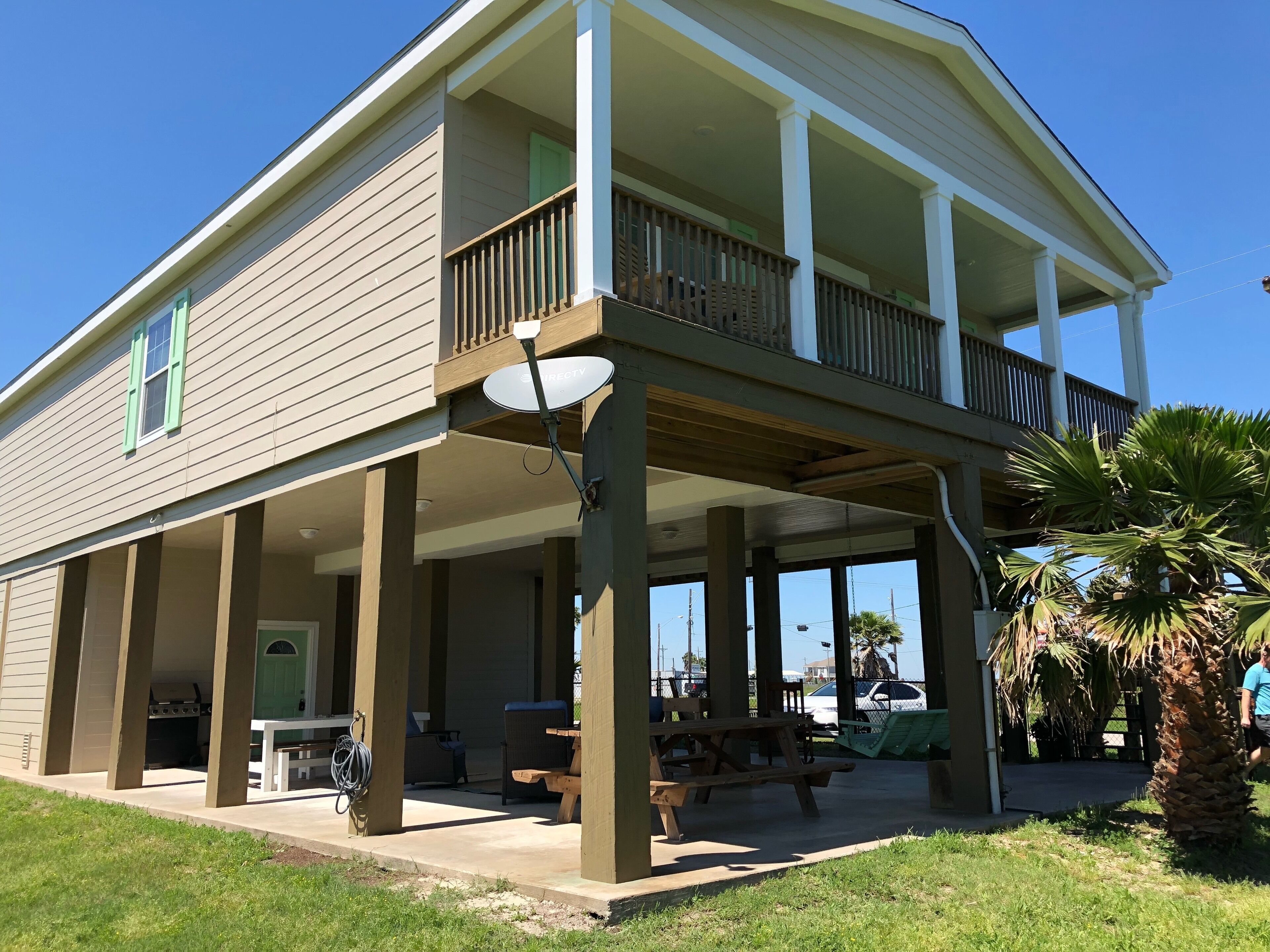Inspired by the Sea - Newly Remodeled 3/2 Sleeps 8 Fenced yard - Pet Friendly Inspired by the Sea is a newly remodeled 3/2 home with lots of elbow-room. This home is conveniently located close to everything and only a short walk to beautiful Crystal Beach. The master bedroom has a king size bed with new memory foam mattress along with a bright master bath en suit. The second and third bedrooms have queen beds. All the bedrooms have smart TV's which will allow you to connect to your Hulu, Netflix, Prime or other accounts. There are two queen sleeper sofas for additional guests. This open floor plan has a large dining area and living room. The kitchen has new granite with all the plates and accessories to prepare your beach feast. Come and relax on the upper decks or enjoy the lower shaded entertainment area with ample seating, eating areas, grill and games. Small to medium sized dogs (up to 40 lbs.) will enjoy the fenced in yard.You'll enjoy the fact that there is a Cargo Lift to help you get your heavy luggage and coolers up to the main floor deck. High speed WiFi too.