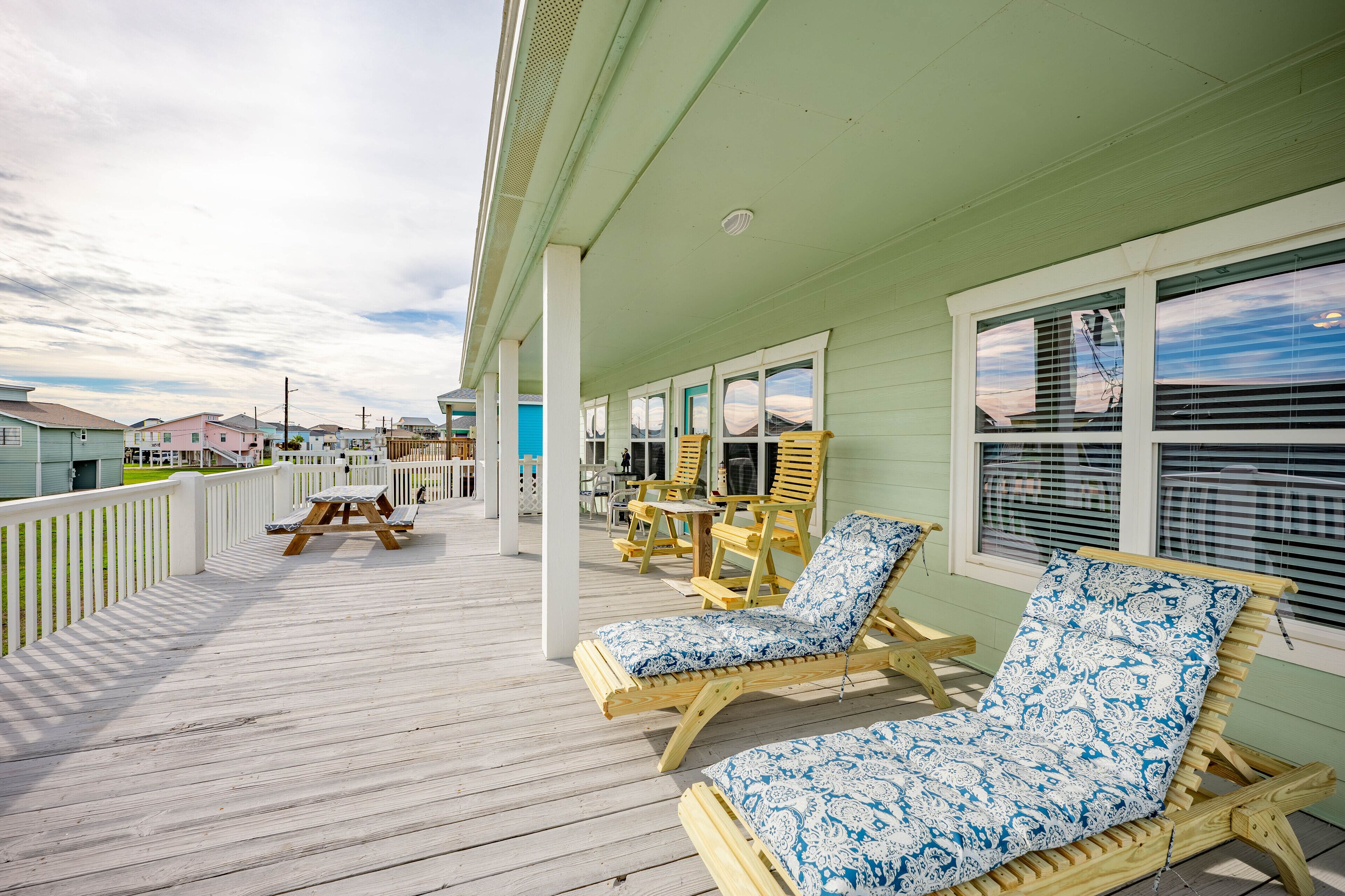 Beach Blessing with ocean view, 3br/2bath sleeps 8 Forget your worries in this spacious and serene space! Enjoy a relaxing getaway in our home with views of the Gulf from the deck and views of the Galveston Bay as well. Wonderful 3 bedroom 2 bath located in a family friendly subdivision. A 2 min walk away from the beach or drive your golf cart over the community golf cart bridge. Pet friendly upon...