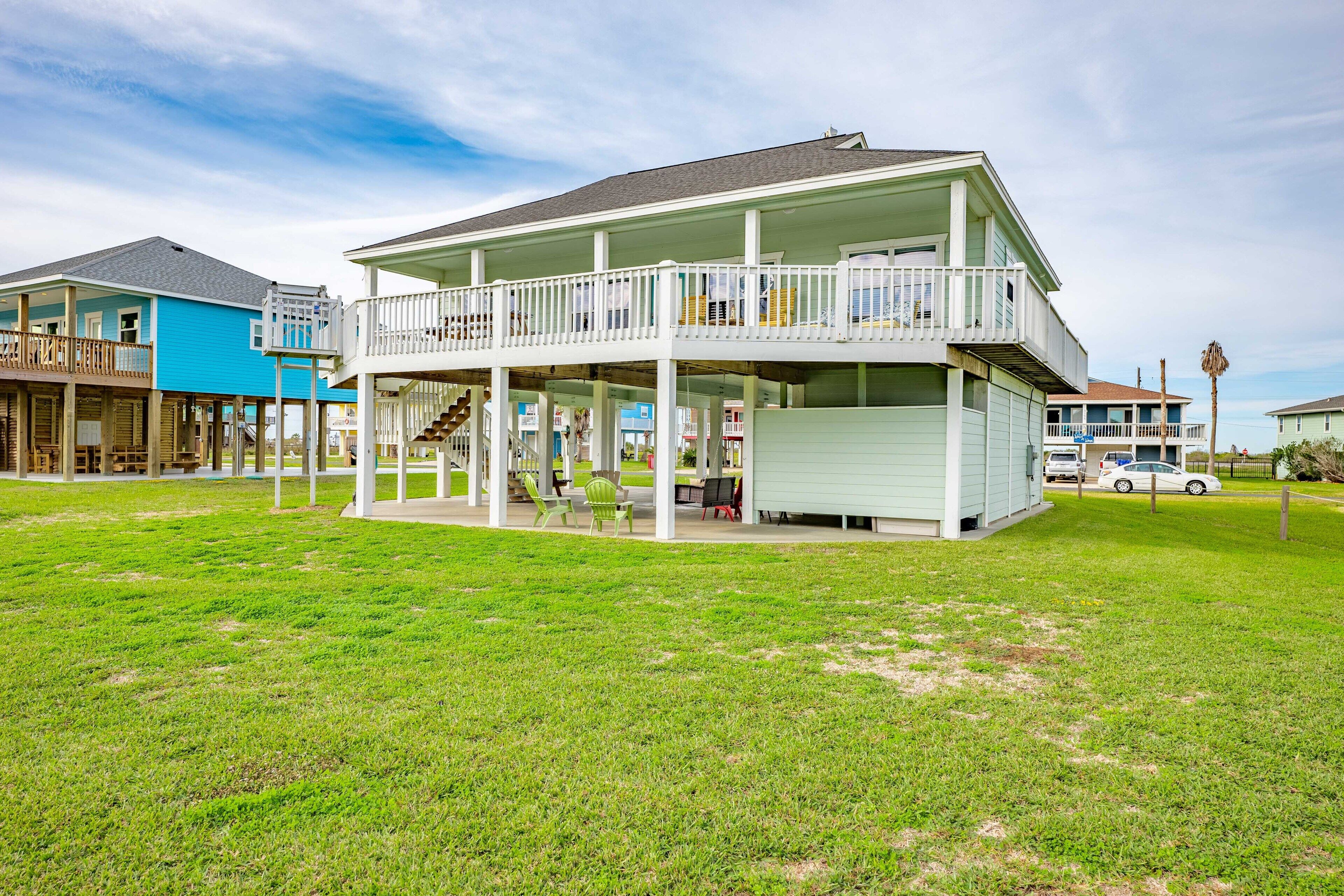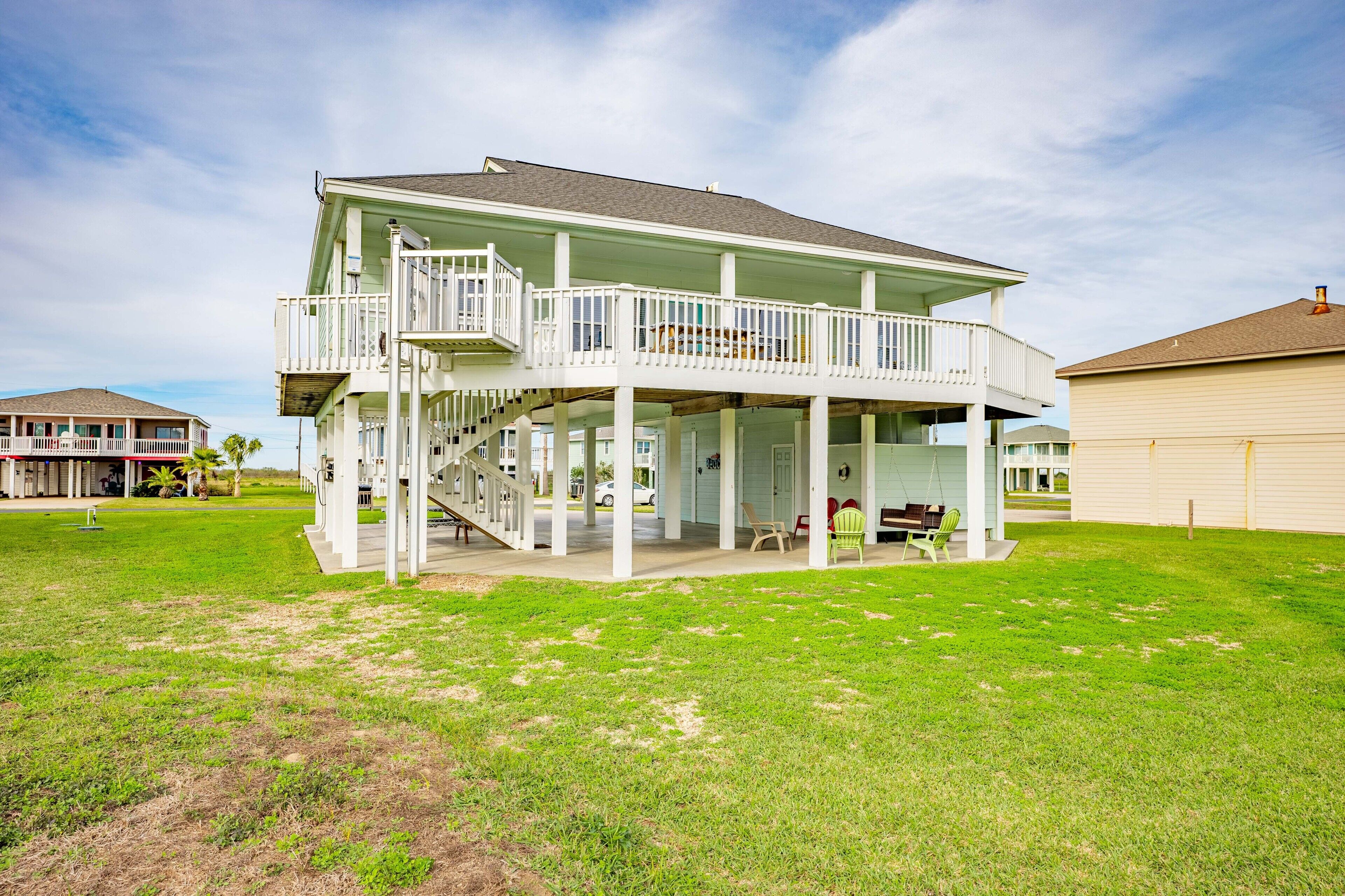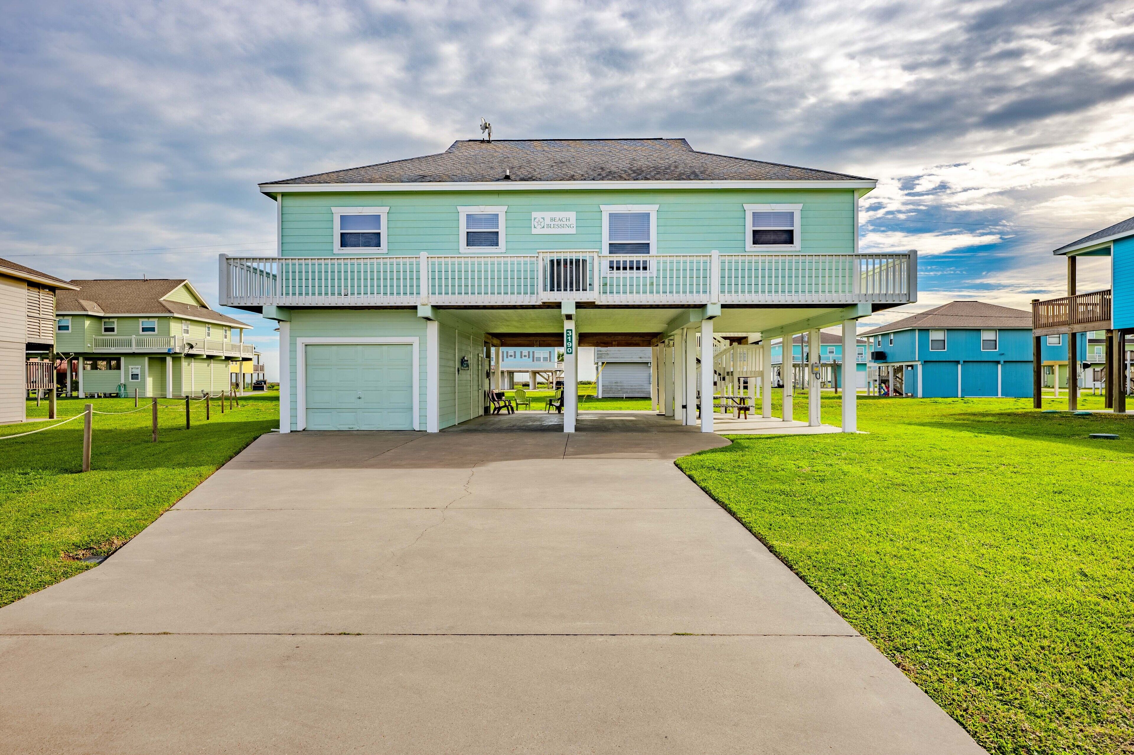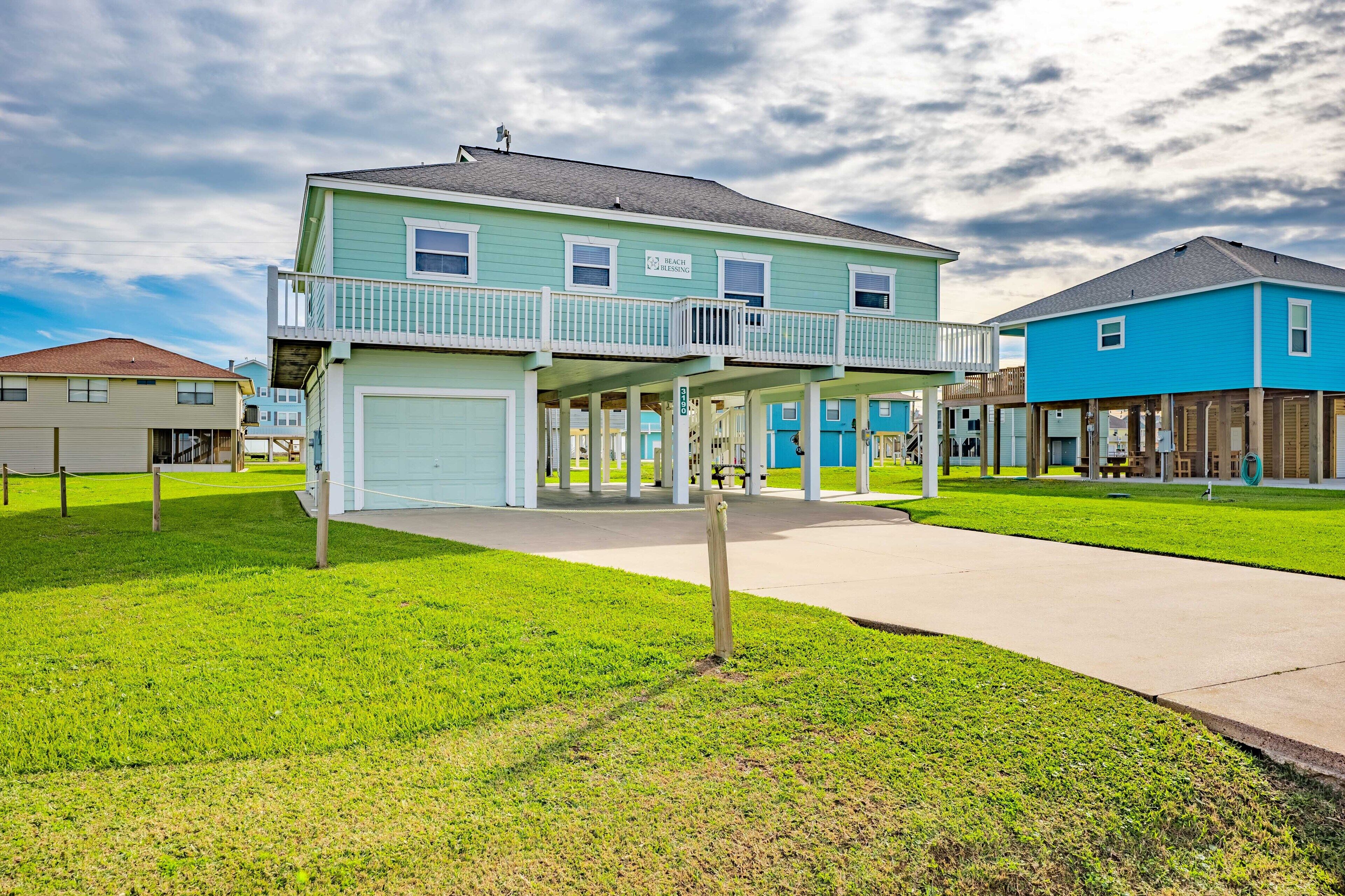 Beach Blessing with ocean view, 3br/2bath sleeps 8 Forget your worries in this spacious and serene space! Enjoy a relaxing getaway in our home with views of the Gulf from the deck and views of the Galveston Bay as well. Wonderful 3 bedroom 2 bath located in a family friendly subdivision. A 2 min walk away from the beach or drive your golf cart over the community golf cart bridge. Pet friendly upon approval by host and one time $80 pet fee.