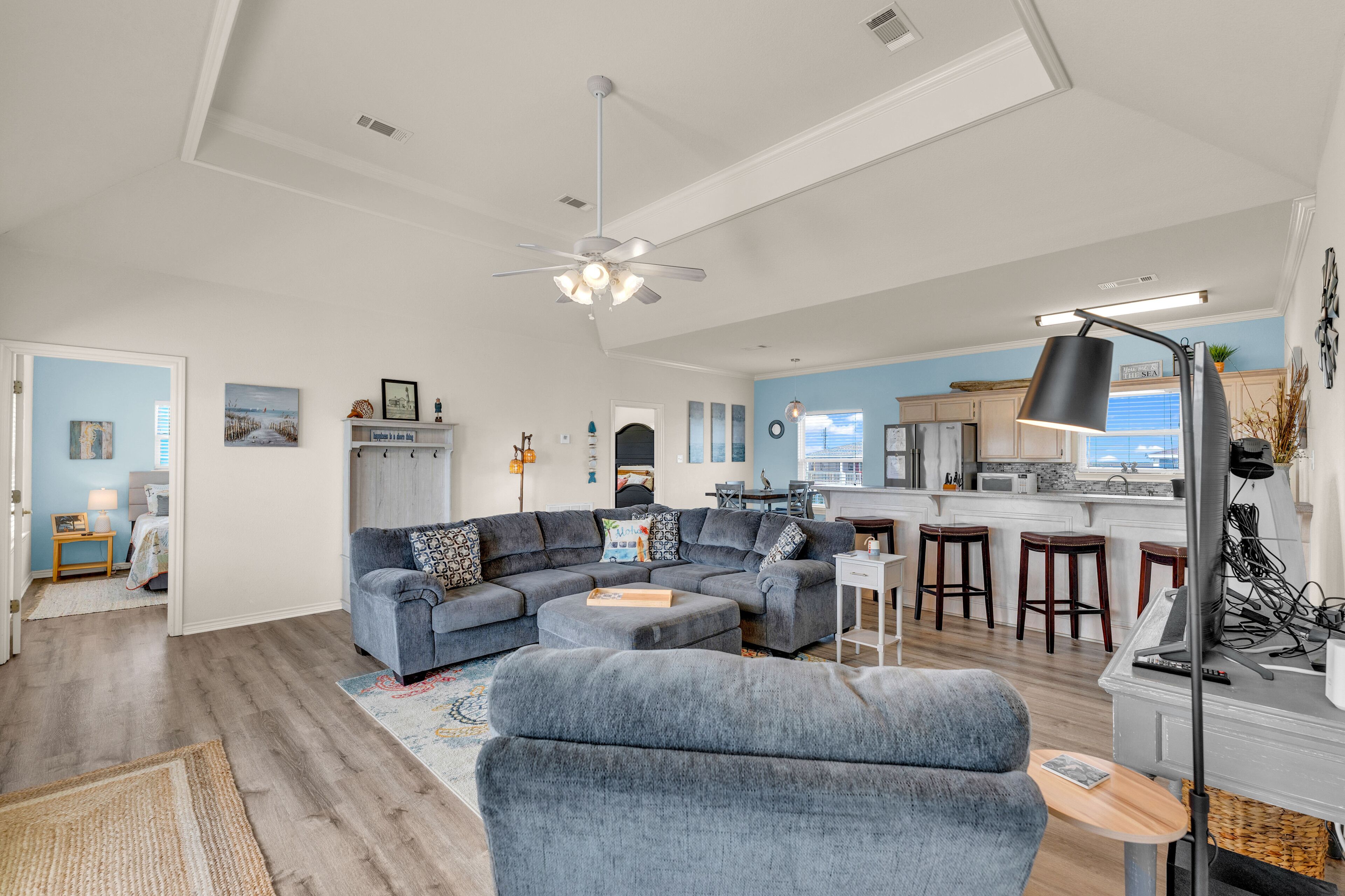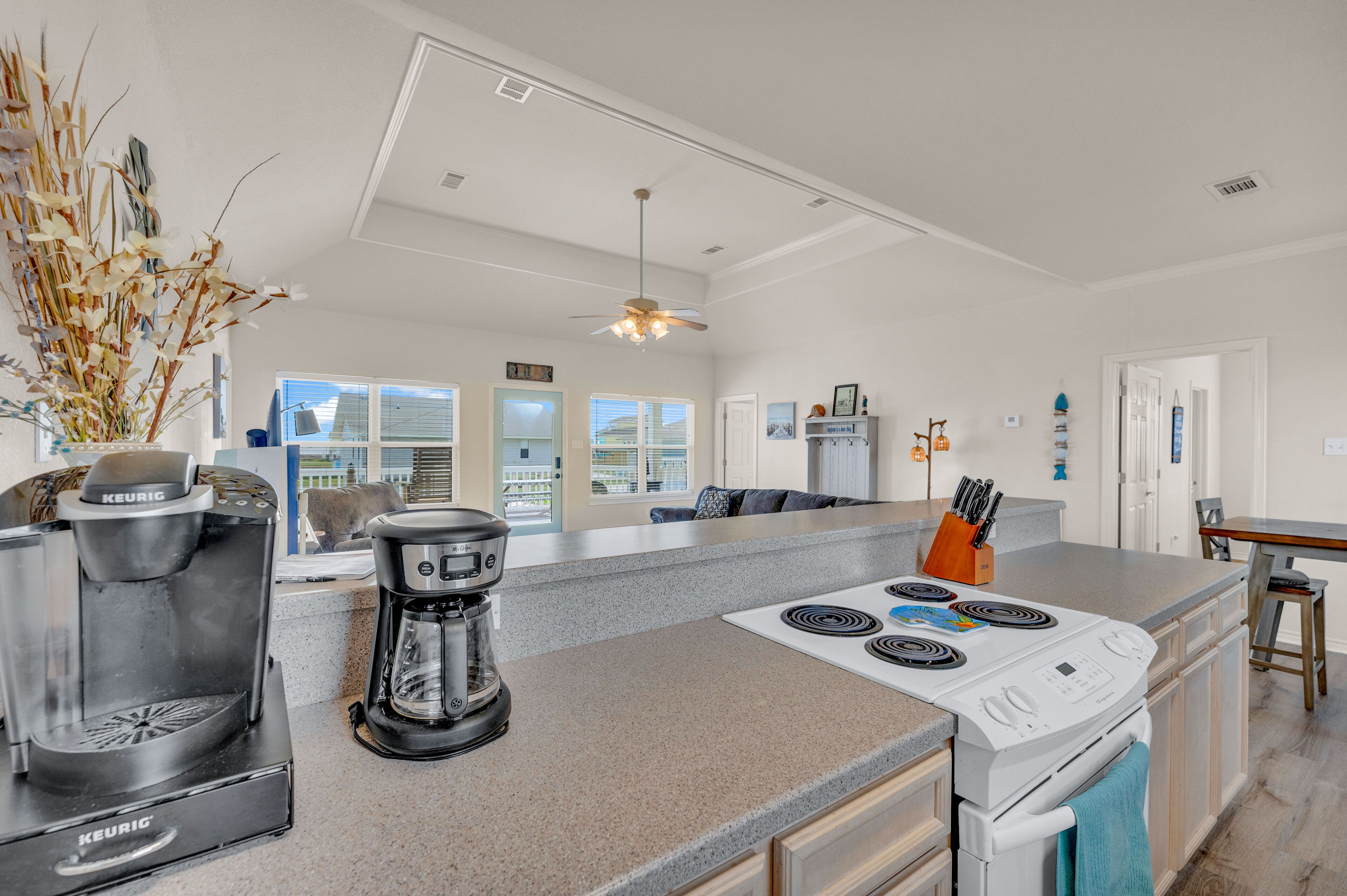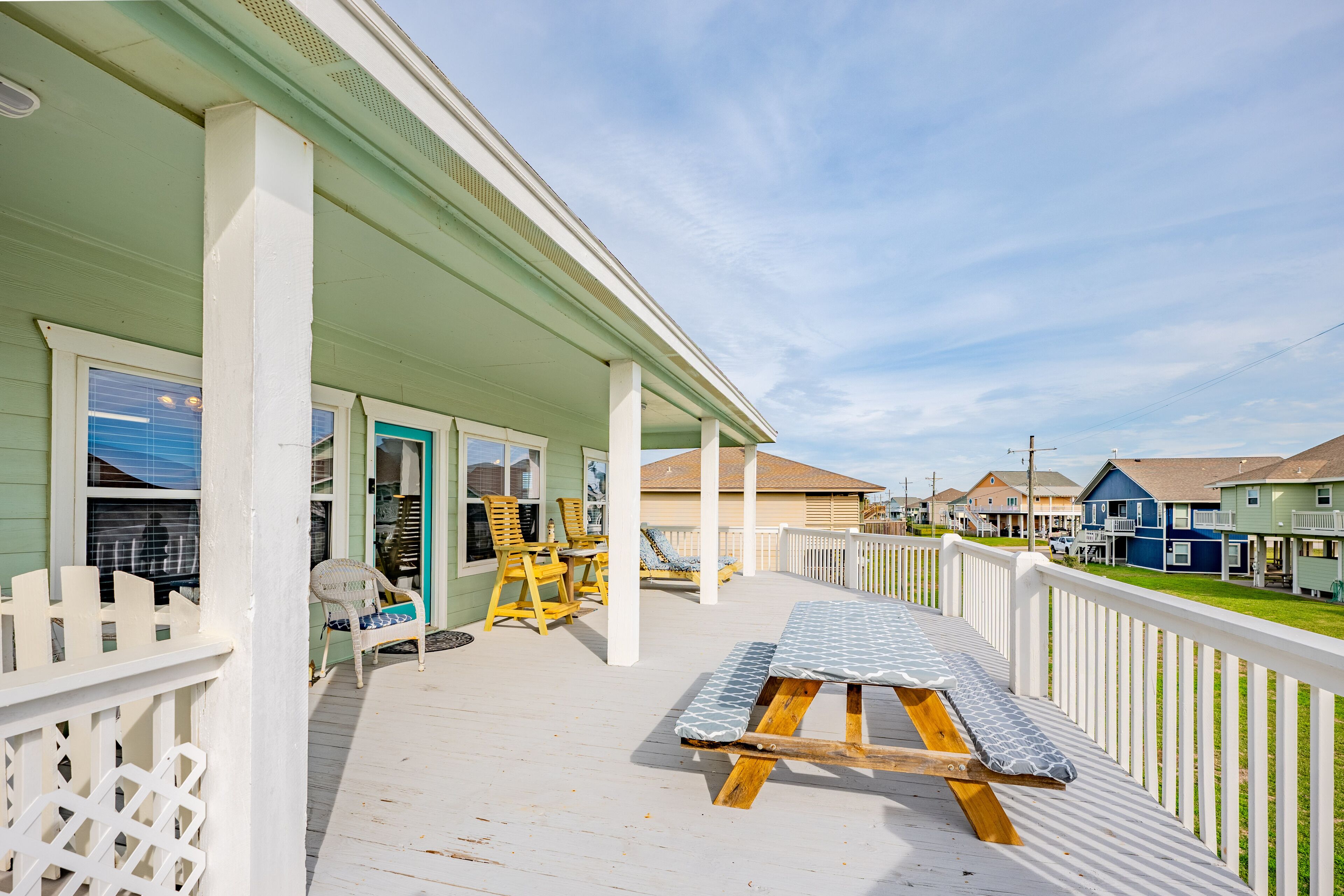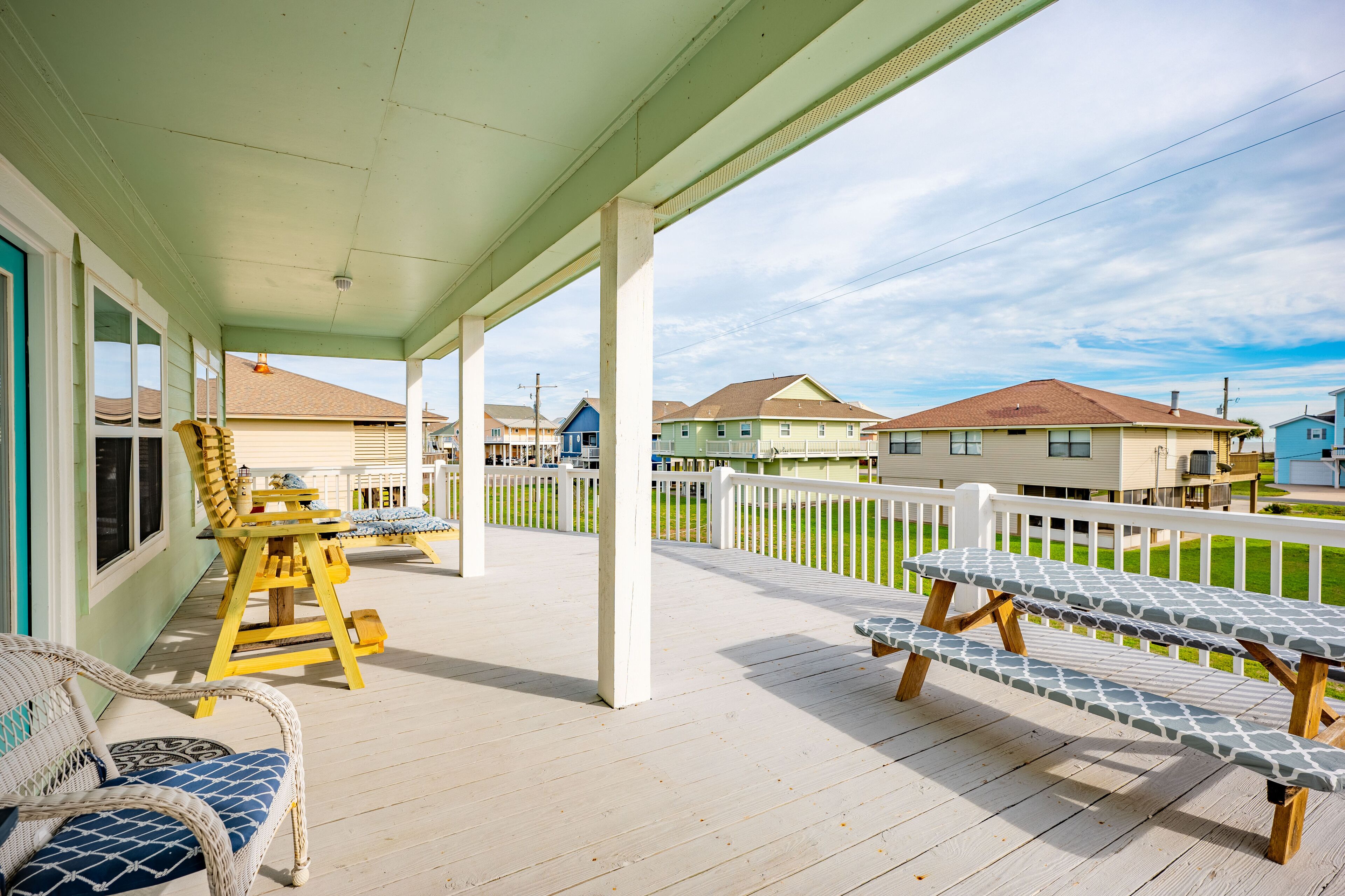 Beach Blessing with ocean view, 3br/2bath sleeps 8 Forget your worries in this spacious and serene space! Enjoy a relaxing getaway in our home with views of the Gulf from the deck and views of the Galveston Bay as well. Wonderful 3 bedroom 2 bath located in a family friendly subdivision. A 2 min walk away from the beach or drive your golf cart over the community golf cart bridge. Pet friendly upon approval by host and one time $80 pet fee.