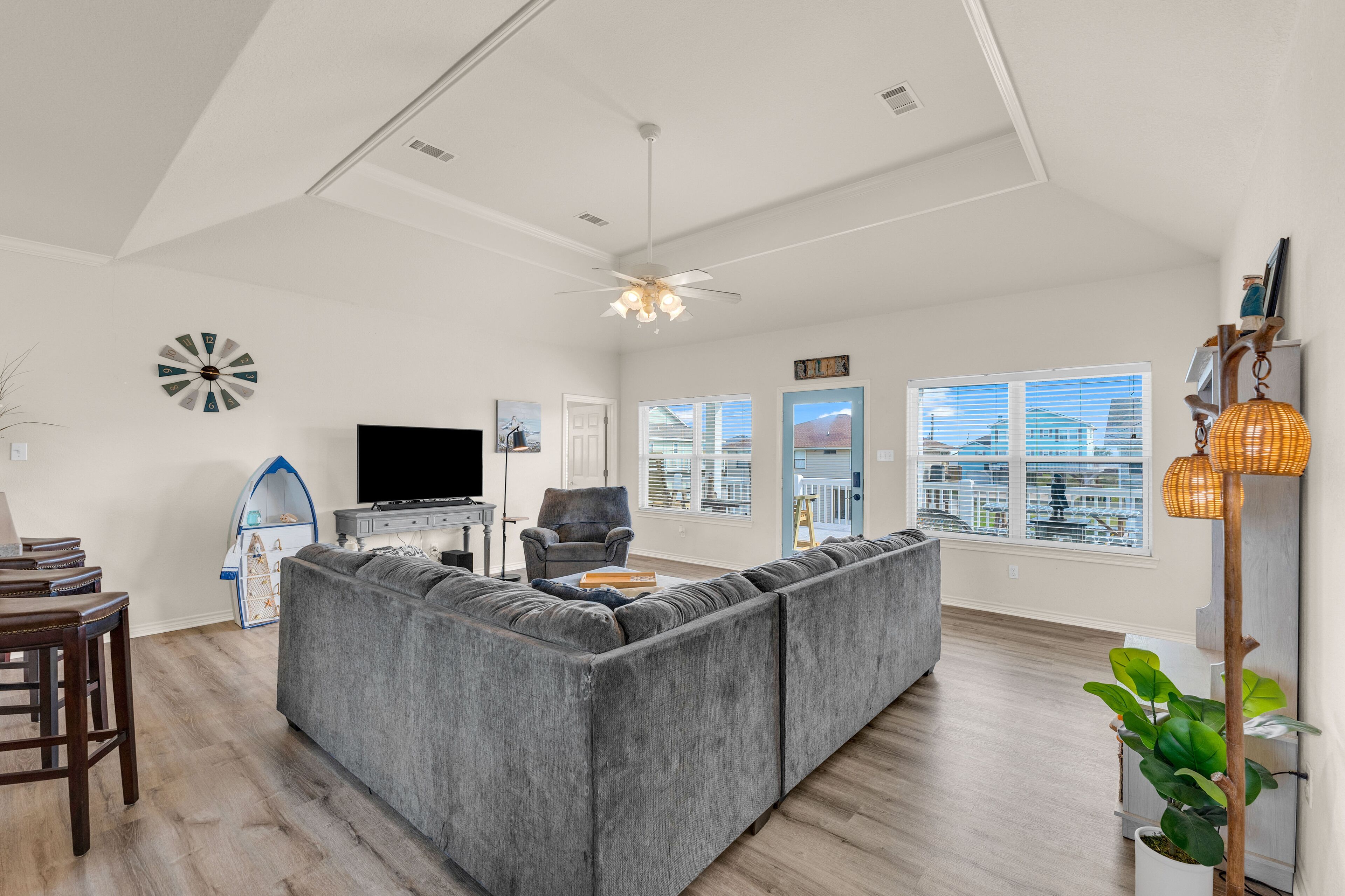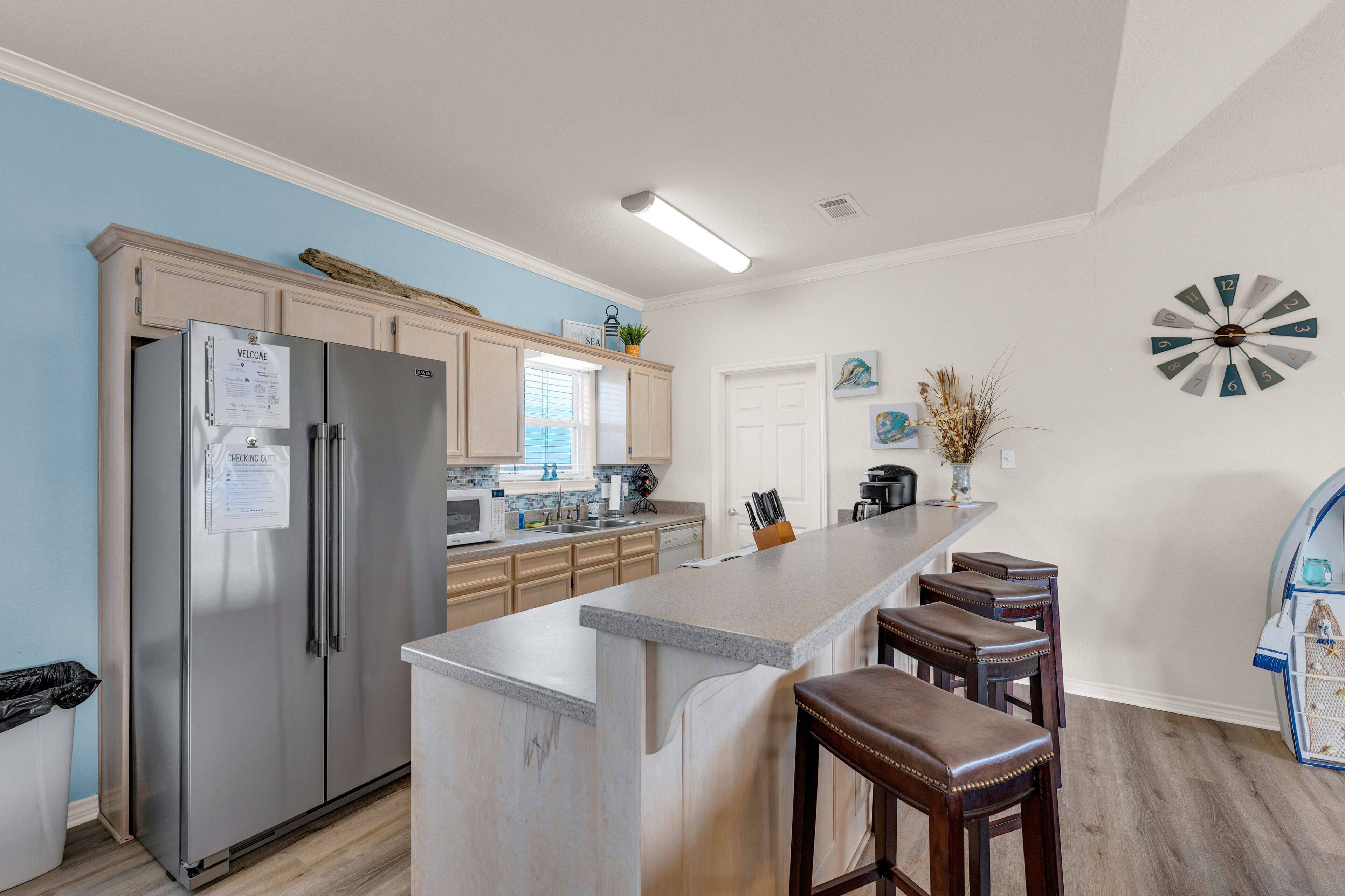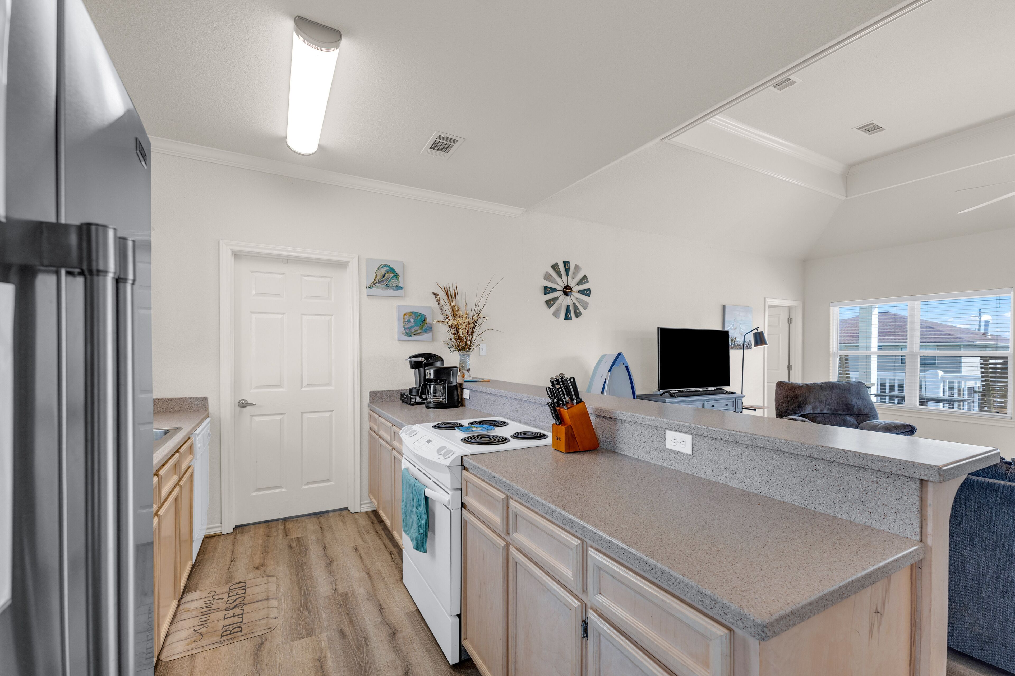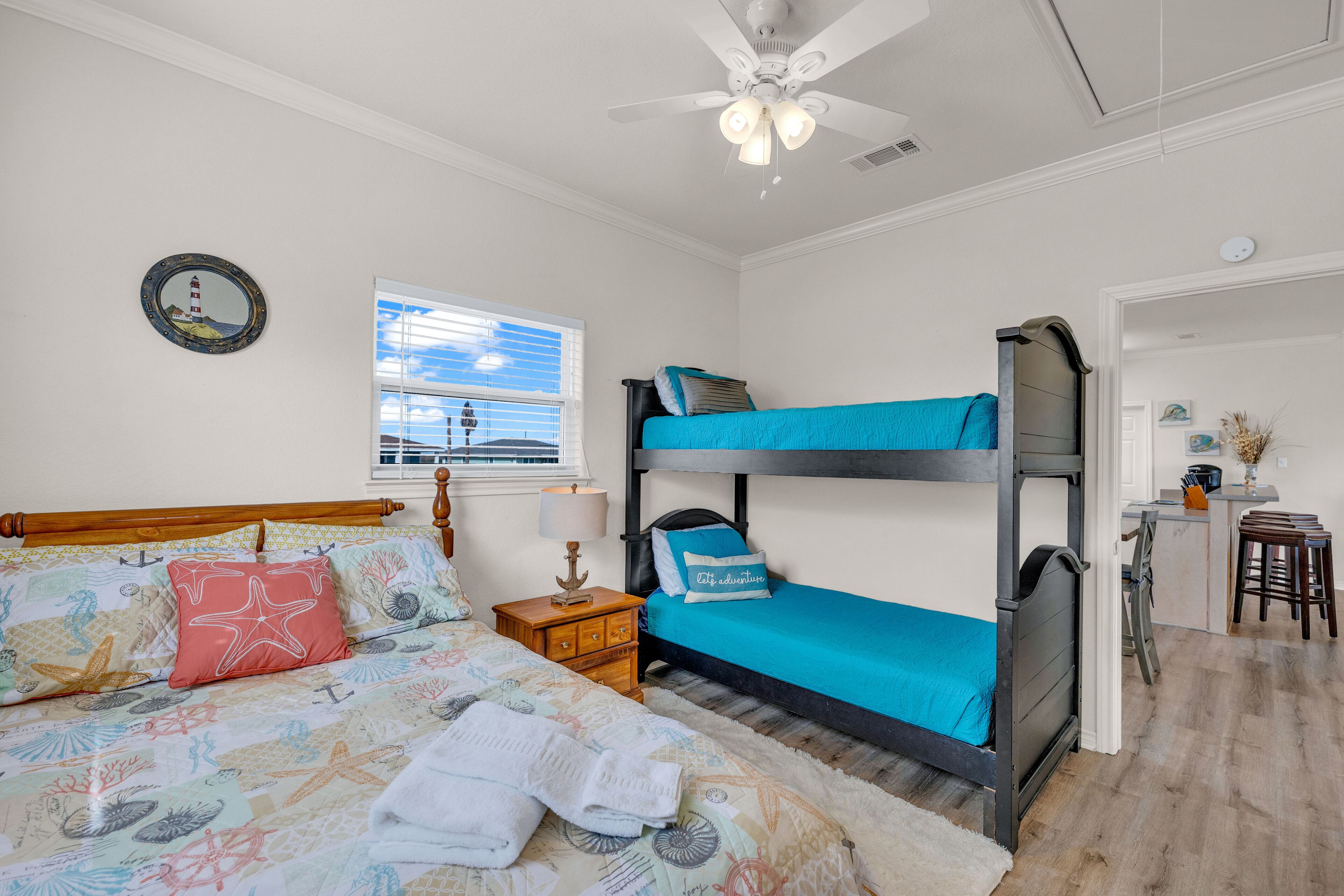 Beach Blessing with ocean view, 3br/2bath sleeps 8 Forget your worries in this spacious and serene space! Enjoy a relaxing getaway in our home with views of the Gulf from the deck and views of the Galveston Bay as well. Wonderful 3 bedroom 2 bath located in a family friendly subdivision. A 2 min walk away from the beach or drive your golf cart over the community golf cart bridge. Pet friendly upon approval by host and one time $80 pet fee.