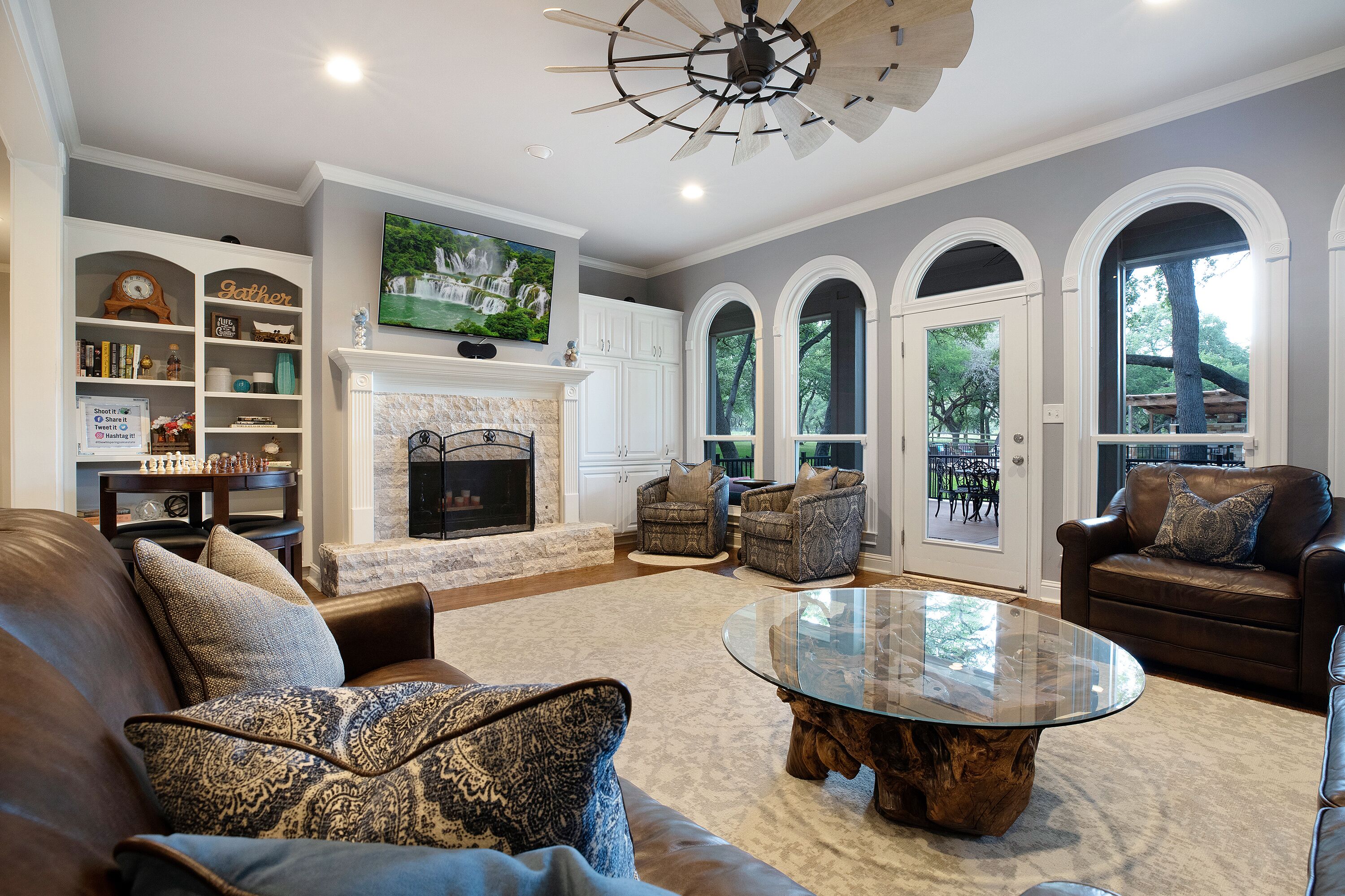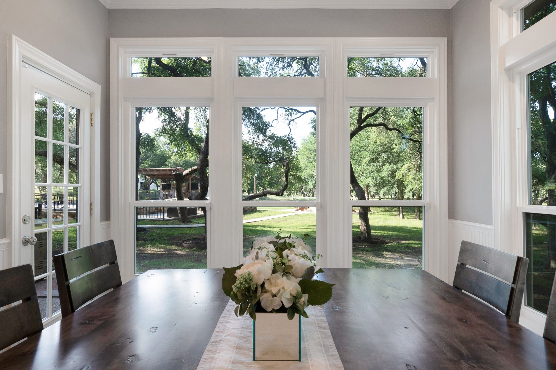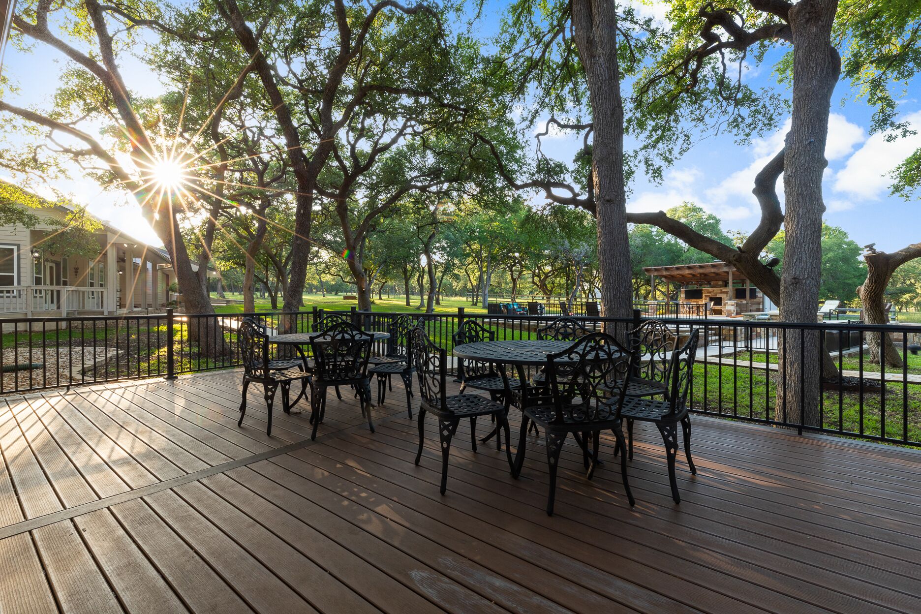 Events at The Whispering Oaks Estate in Dripping Springs on 10 Acres One event with up to 40 guests is included in the booking price.There is an additional $40 per person charge for guest counts between 41 and 80. The extra charge will be added to the booking as an additional payment.• Climate controlled event space• Fruitwood folding chairs• Ten 60 inch round tables• Four banquet tables• Wooden Arbor• Wedding with up to 80 guests (40 guests included in booking price)• Indoor sound system• 3 Glass garage doors in event space• Endless options for outdoor ceremony and cocktail hour• Access to the event space upon check in• Event space has built in bar and vendor space• All vendors are welcome• Bring your own alcohol(All alcohol must be served by a TABC certified bartending service during an event)• Parking lot• LED projector and screen• Commercial refrigerator• Residential refrigeratorLet us host your special event and provide accommodations for your guests during weddings, reunions, birthday parties, retreats, corporate functions and more. Our newly renovated event space is the perfect canvas for your next event. The space includes a wall of glass doors that retract and provide seamless indoor/outdoor entertaining. Our built-in bar area and bar tending services will keep your guests spirits high.The Estate:The Whispering Oaks Estate offers a stunning overnight stay for up to 25 guests in the Texas Hill Country. The Estate is nestled on over 50 acres of gorgeous ranch land with an abundance of Texas Oak trees and wildlife. This French Colonial Equestrian Home is comfortably furnished with elegant farmhouse finishes. The custom chefs kitchen is fully equipped with anything you might need during your stay, and so beautiful that you'll never want to leave. The large outdoor area includes a fenced in pool, hot tub and pool side cabana for year-round enjoyment. * WiFi not high speed.* Only 15 cars allowed to park in the driveway.* ALL cars must park in the parking lot during the event.* NO cars allowed to park in yard/grass.* NO cars are allowed to park on the street.* NO RV's allowed.* Pool is not heated. Hot Tub can be heated year around.**BBQ Grill is Propane - We provide tank you provide gas by refilling tank or doing a tank swap. Must leave new tank if you do the tank swap. You may bring your own tank.Early Check-in is available for a fee:1 hour $2002 hour $4003 hour $600All payments must be made prior to arrival.Late Check out may be available for a fee1 hour $2002 hour $4003 hour $600All payments must be made day before departure