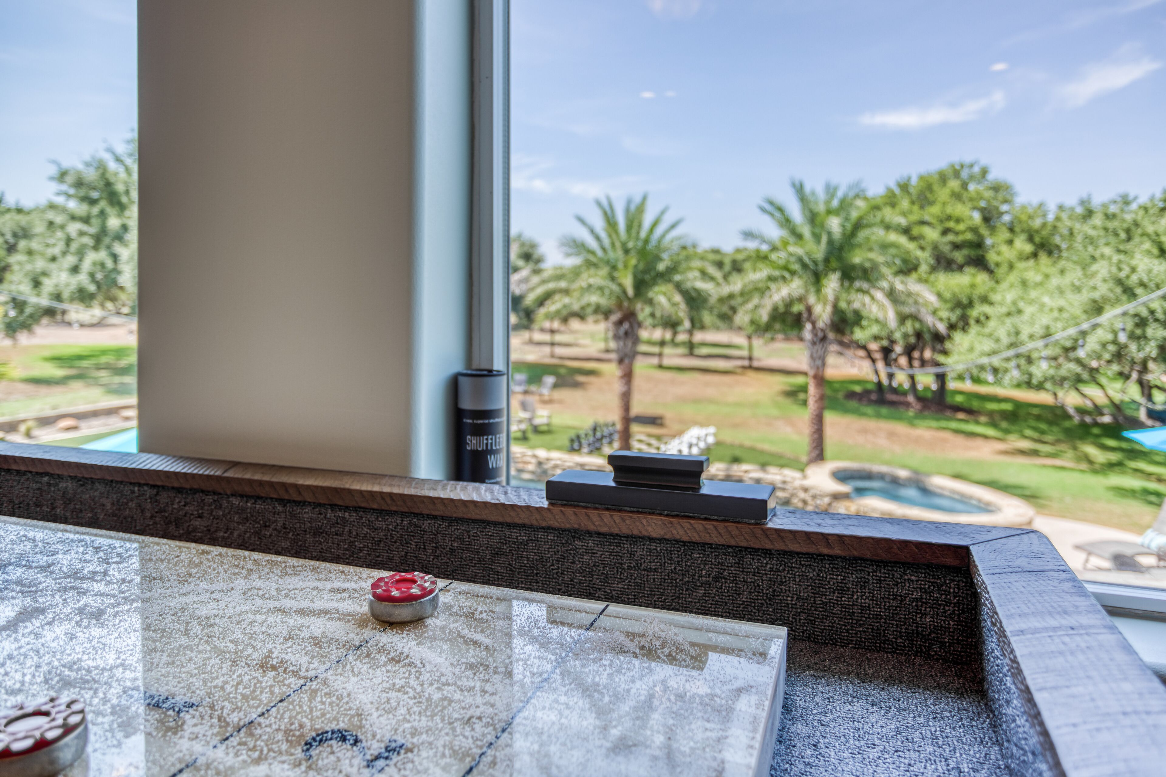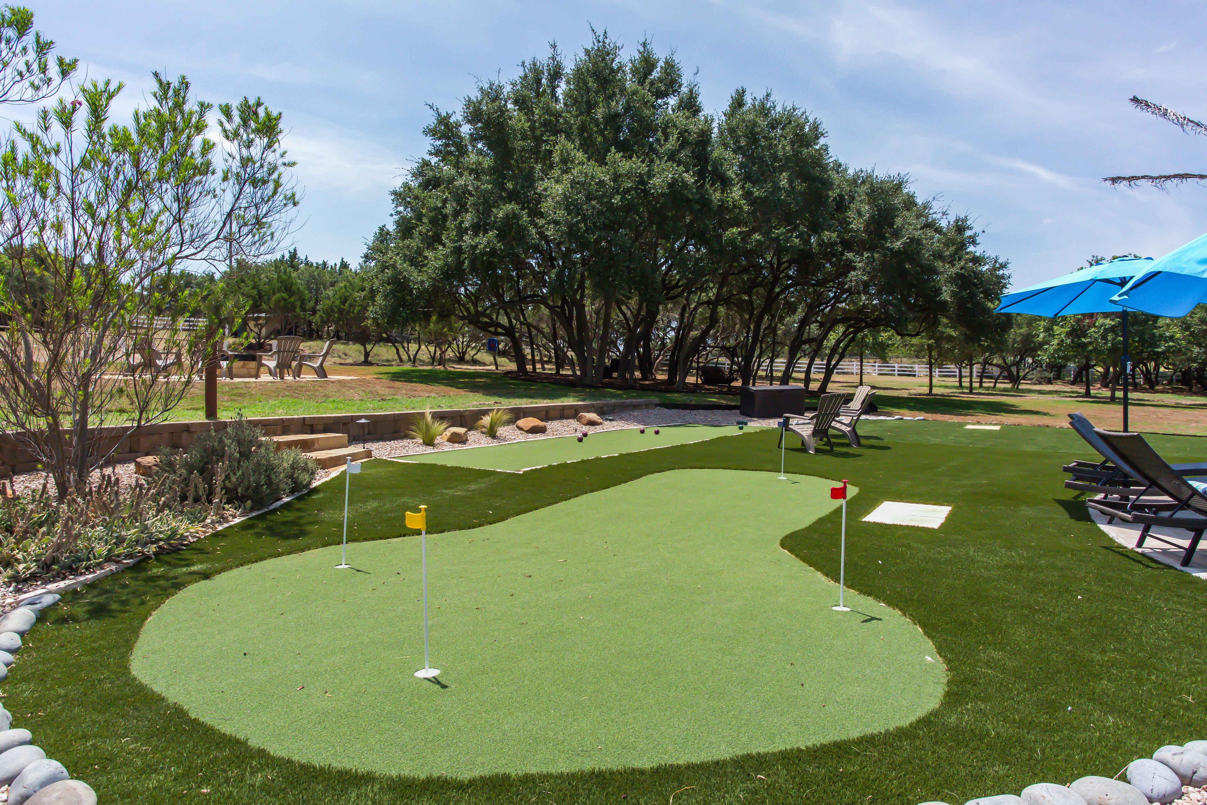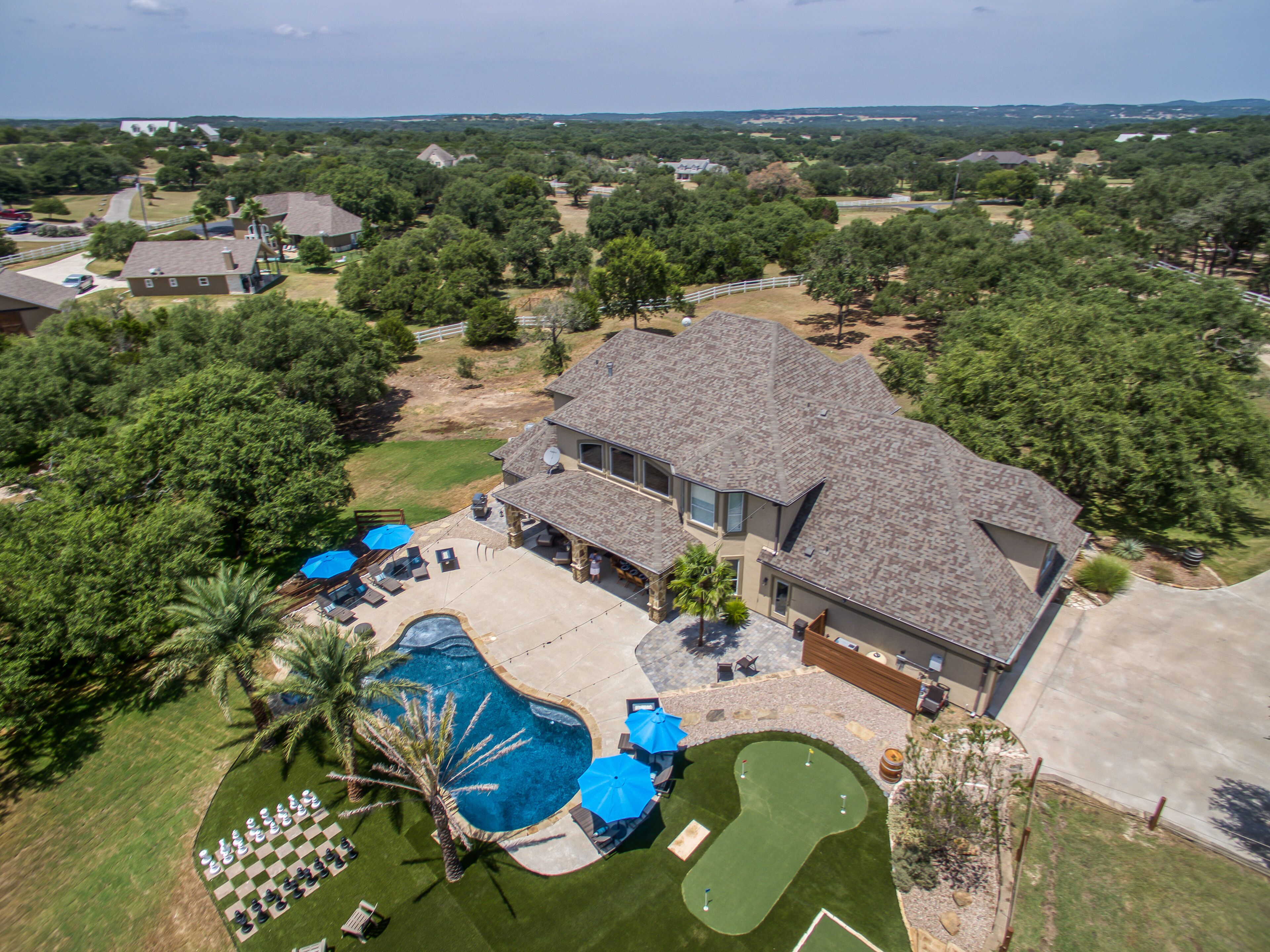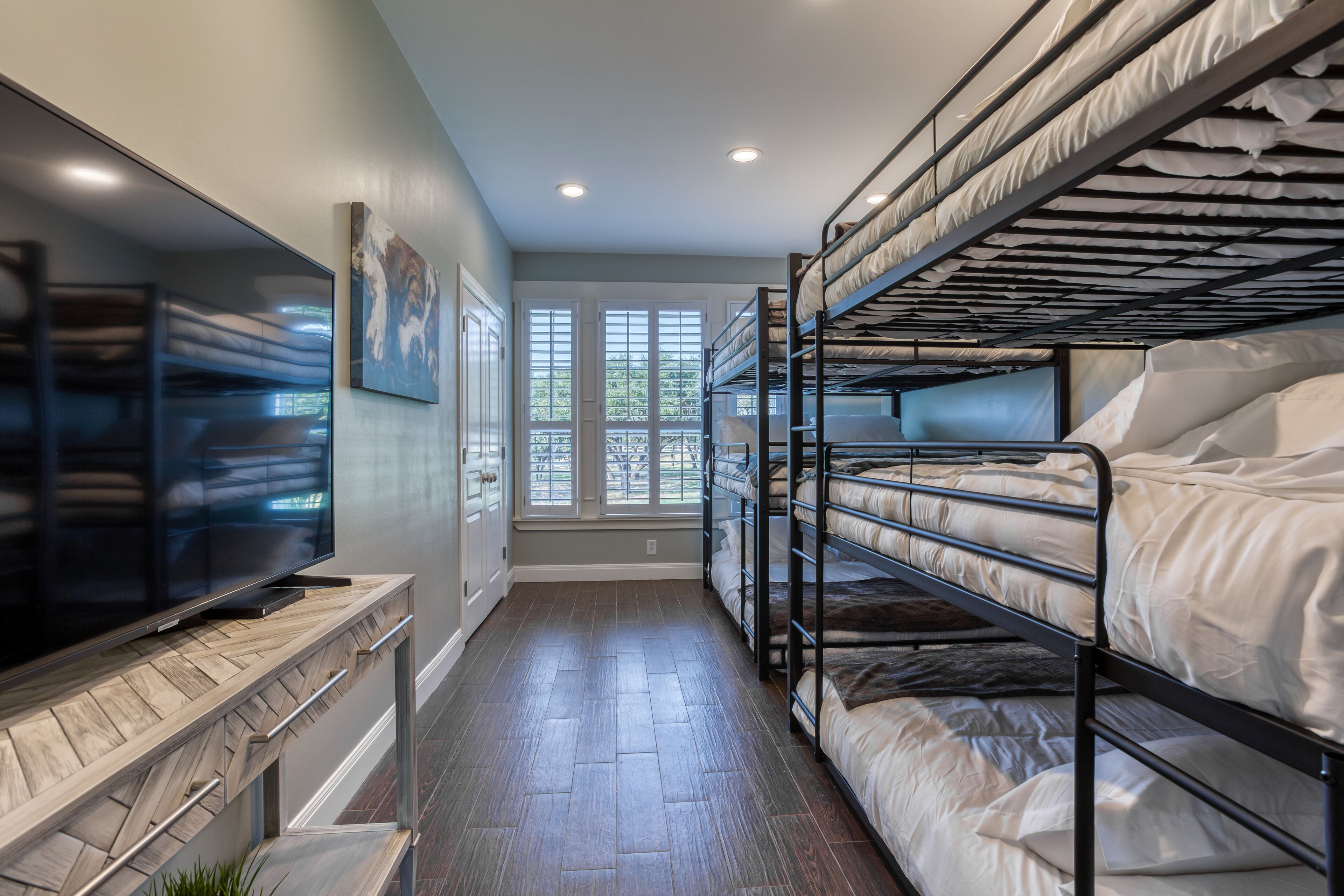 Ranch Estate With Pool and 4 Hole Golf Course! Sleeps 30 - Luxury Vacation Experience! **Please note: there is a temporary 31 night minimum stay for this property.This spectacular Dripping Springs Quit n Time Ranch and Magnolia is situated on five wooded acres in a very private and quiet, gated community of Settlers Ridge. In addition to Dripping Springs being the “wedding capital of Texas,” you will be close to wineries, breweries, restaurants, and about 25 minutes from Austin. Not only is there plenty to do in the area, you will be amazed by all the fun activities available at this property.Perfect for larger groups, are two amazing, contemporary farmhouse style homes on one property. First is the completely remodeled two-story home (main house) offering six bedrooms and four full bathrooms within 4,200 square feet. Second, is a newly built, 2430 square foot, two-story guest house with three bedrooms and three bathrooms. In total, this amazing nine bedroom and seven bathroom deluxe vacation property can easily sleep up to 30 guests in complete luxury.Upon entering through either of the front doors, you will find yourself within the impressive main living space offering the living room, kitchen, and dining areas. The homes professionally decorated with a contemporary ranch theme with tile floors that looks and feels like hardwood throughout.Quit n Time Ranch (Main House)Living Room: The living room offers a large sectional and two comfortable chairs with a plethora of entertainment options, including the 65” Smart TV that comes with 150+ premium Direct TV stations (including an NFL package), a Sonos Soundbar system, and DVD player. There are large windows for plenty of natural light and access to the backyard oasis.Kitchen: Completely renovated, this kitchen is a gourmet's dream and offers high-end, stainless-steel appliances, including a large refrigerator, dual convection ovens, and a 6-burner electric cooktop. It is fully stocked with everything needed to prepare and enjoy any snack or amazing meals. And for coffee lovers, you will have a choice of a drip or Keurig coffee maker to start your day. There is also seating for ten at the kitchen bar and massive center island.Dining area(s): Adjacent to the kitchen is a dining area with seating for six and seating for six at the breakfast nook table. Combining all these areas (including the kitchen bar), you will have seating for 22 guests!Bedrooms and Bathrooms:All bedrooms are outfitted with Tribe Living luxury mattresses and linens, white duvet covers, and a choice of a high-end down alternative or memory foam pillows, complemented with luxury bath towels for a true resort experience. Every room also features a smart TV with 150+ premium DirecTV channels including the NFL package!Grand Master Suite (Main level) — King size bed, 55” HD Smart TV (DirecTV with premium channels), the “look and feel of hardwood” tile flooring, a desk with a printer, and backyard access. The full master bath offers double granite counter sinks, a makeup vanity, water closet, a large soaking tub, and separate shower, and plenty of natural light.Queen Bunk Room (Main Level) — Two sets of triple luxury queen bunk beds to sleep up to 12 guests; 55” HD Smart TV with DirecTV and premium channels, hardwood-like tile flooring, and access to the newly renovated full bathroom a tiled tub/shower combo.King Bedroom 3 (Upper Level) — King bed, 55” HD Smart TV with premium DirecTV channels, and a Jack-n-Jill full bathroom shared with king bedroom 4, offering double sinks and a tile shower.King Bedroom 4 (Upper Level) — King bed, 55” HD Smart TV with 150+ premium DirecTV channels, and a shared Jack-n-Jill full bathroom.King Bedroom 5 (Upper Level) — King bed, 55” HD Smart TV with premium DirecTV channels, and private access to a full shared bathroom with a tub and shower combination.Bedroom 6 Bunk Room (Upper Level) — Two sets of triple twin bunk beds, 55” HD Smart TV with premium Direct TV channels, and access to the full shared bathroom.Additional Upper-Level Rooms/FeaturesTheater/Movie Room — This media room features seating for twelve to fourteen guests with two rows of plush and fully automated movie theater layback seating. There is a high-boy café style table with additional seating for four to six people, which is also a terrific game table. Enjoy movies and shows on the 85” HD Smart TV with 150+ premium Direct TV stations and NFL package, plus full Sonos surround sound system, DVD, Apple TV, and Xbox One.Game Room — Enjoy playing for hours on the custom pool table and matching 14-foot shuffleboard table overlooking the backyard. There is a 65” HD Smart TV with 150+ premium Direct TV stations and NFL package, plus Sonos, DVD, Apple TV, and Xbox One.Backyard Oasis Outdoor FeaturesThe multitude of outdoor activities and features this home offers will provide you a true luxury vacation experience. There is a 3-hole putting green, 4-hole par 3 golf course (about 40-yards per hole), basketball hoop, bocce ball court, cornhole, horseshoes, outdoor chessboard, practice roping steer, kids swing and baby swing, and BBQ area with two Weber grills.Main yard/pool area — The pool is spectacular with its depth of 10 feet and a soothing stone waterfall. There is an attached 12-seat hot tub — both surrounded by decorative stone decking. A regulation-size basketball hoop for the pool has also been added. The pool can be heated upon request prior to arrival up to a temperature of 82 degrees for a fee of $235 per day. Due to unpredictable outdoor temperatures and conditions mainly during fall and winter months, the pool cannot be heated October 1-March 31There are multiple seating areas including: Eight lounge chairs and two fire pits settled on the surrounding decks, along with table and chairs 10-seat outdoor dining table, plus lounge area with couch and chairs — all covered and includes ceiling fans and outdoor speakers. There's also