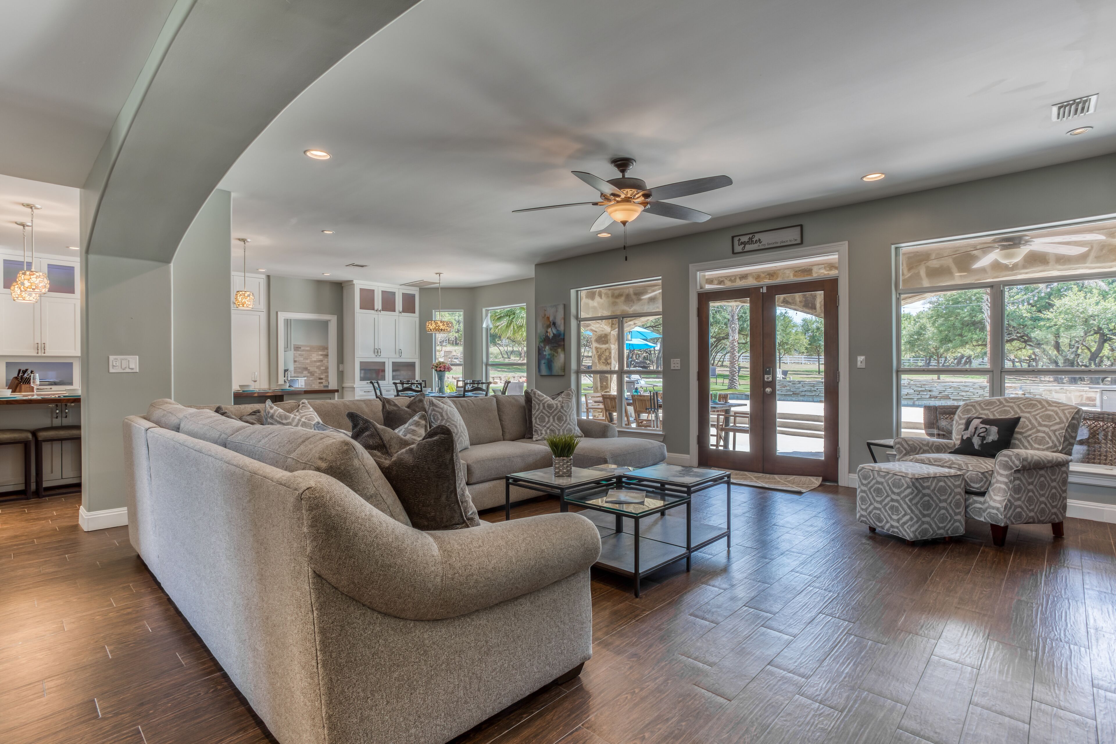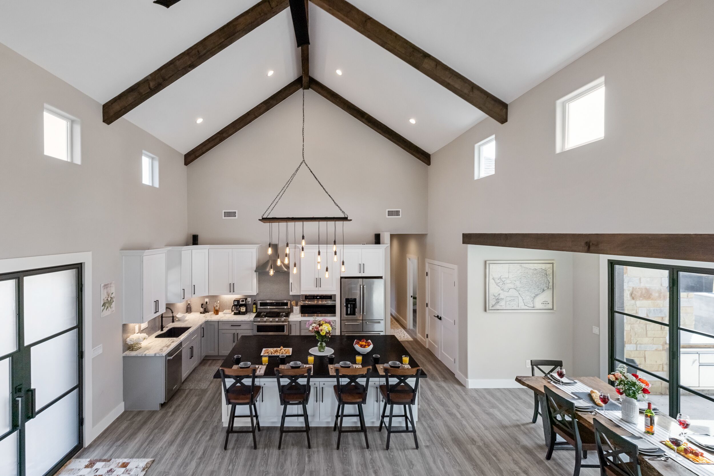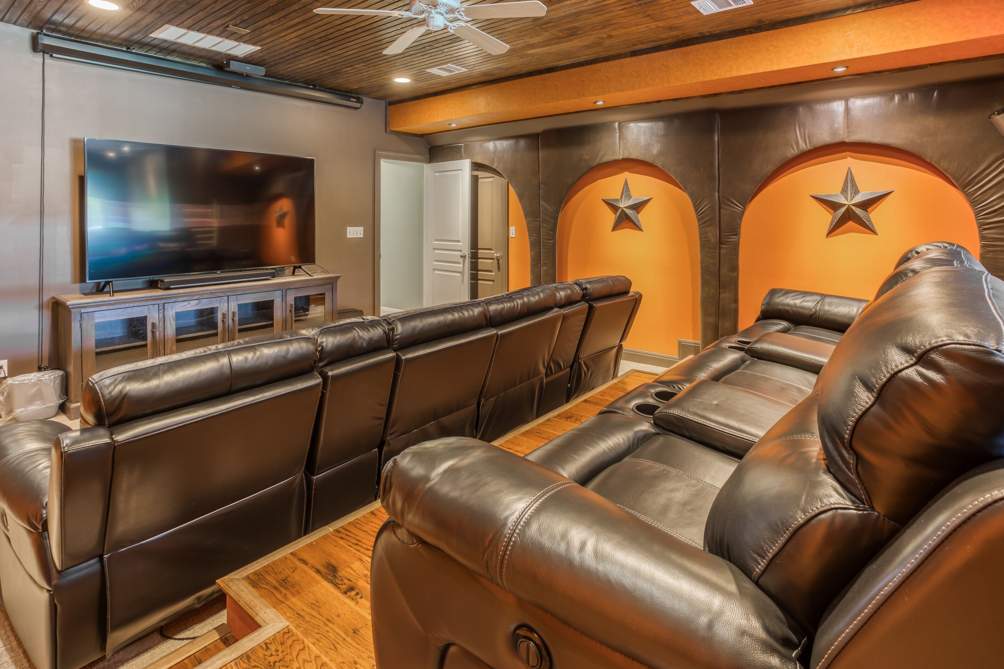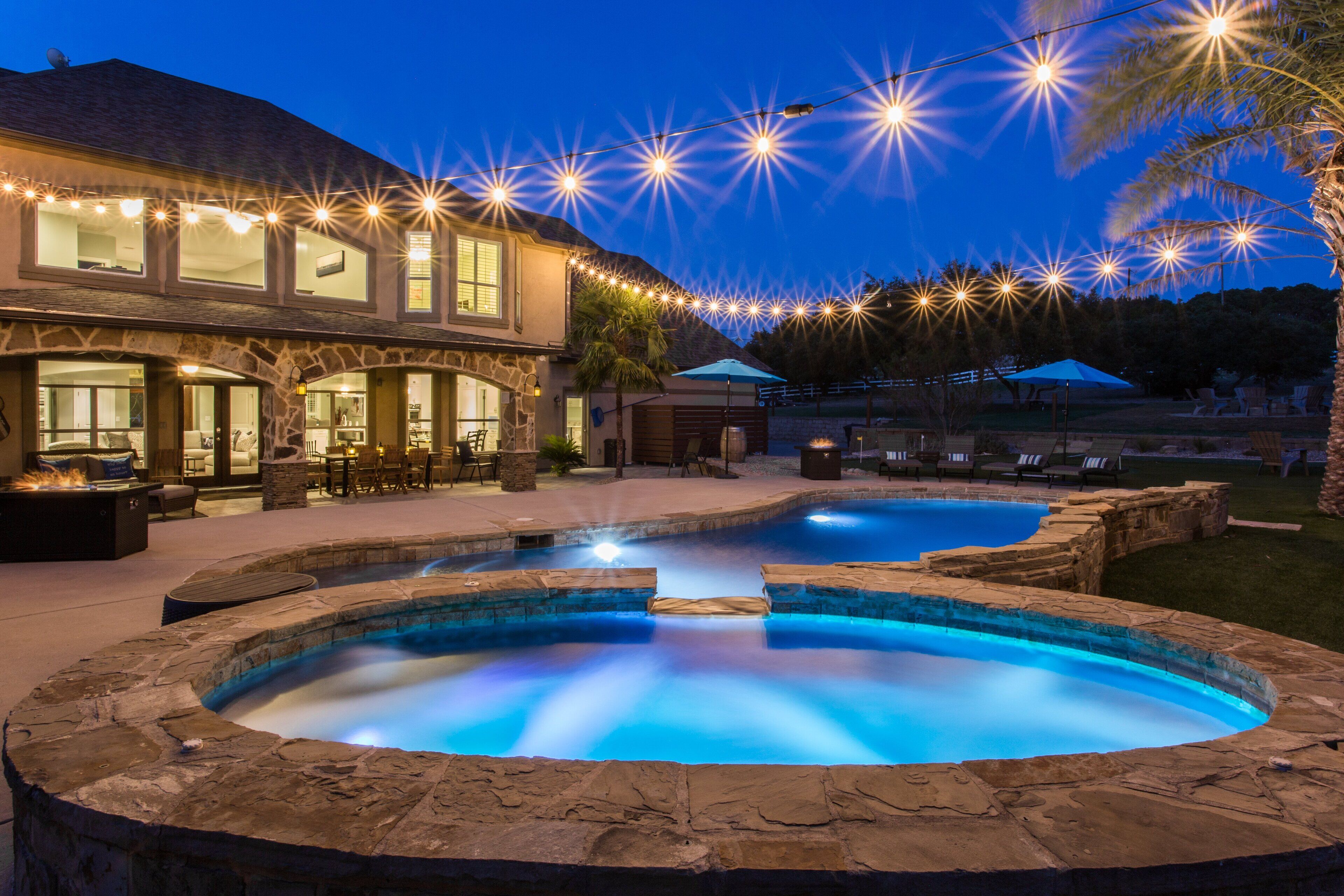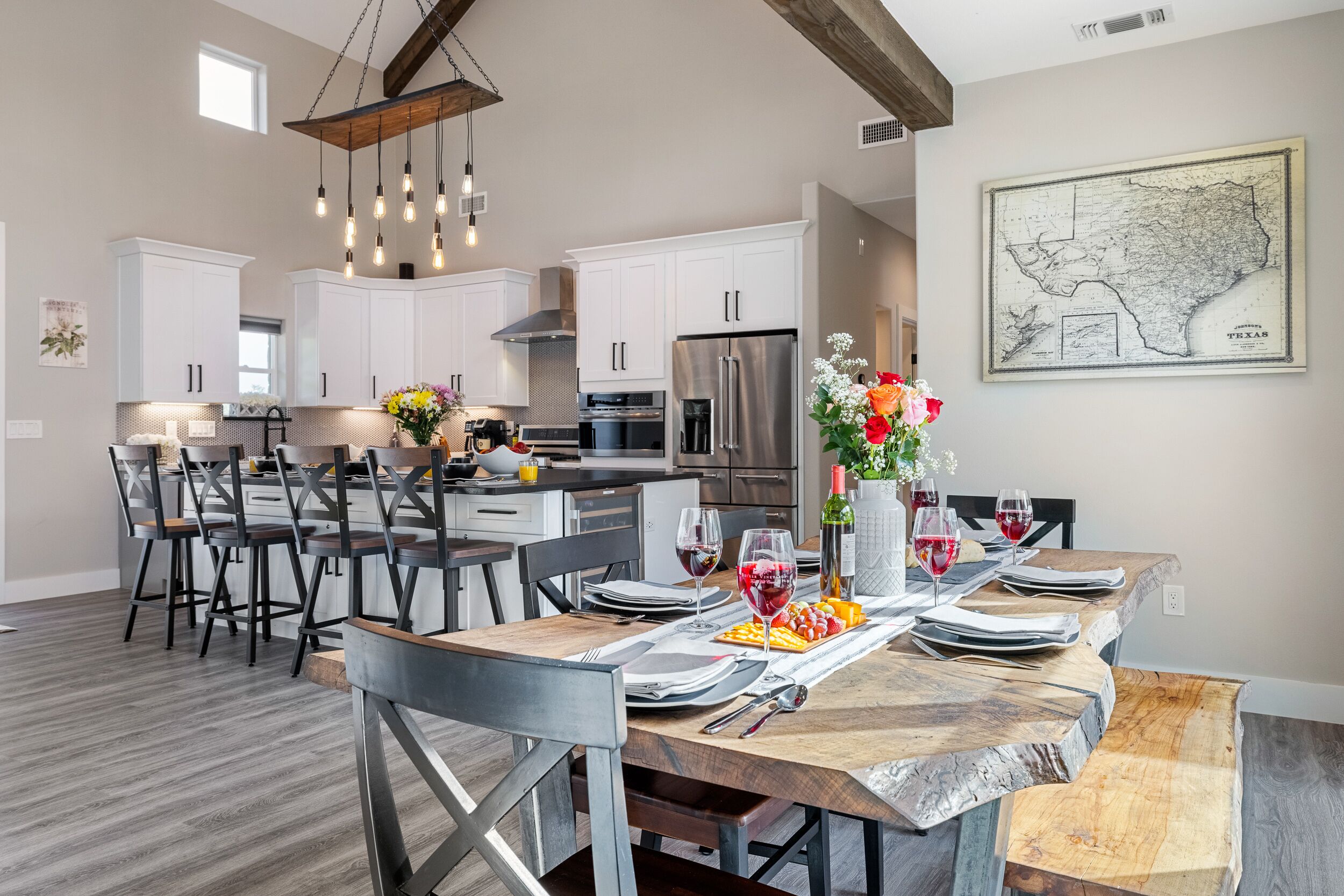 Ranch Estate With Pool and 4 Hole Golf Course! Sleeps 30 - Luxury Vacation Experience! **Please note: there is a temporary 31 night minimum stay for this property.This spectacular Dripping Springs Quit n Time Ranch and Magnolia is situated on five wooded acres in a very private and quiet, gated community of Settlers Ridge. In addition to Dripping Springs being the “wedding capital of Texas,” you will be close to wineries, breweries, restaurants, and about 25 minutes from Austin. Not only is there plenty to do in the area, you will be amazed by all the fun activities available at this property.Perfect for larger groups, are two amazing, contemporary farmhouse style homes on one property. First is the completely remodeled two-story home (main house) offering six bedrooms and four full bathrooms within 4,200 square feet. Second, is a newly built, 2430 square foot, two-story guest house with three bedrooms and three bathrooms. In total, this amazing nine bedroom and seven bathroom deluxe vacation property can easily sleep up to 30 guests in complete luxury.Upon entering through either of the front doors, you will find yourself within the impressive main living space offering the living room, kitchen, and dining areas. The homes professionally decorated with a contemporary ranch theme with tile floors that looks and feels like hardwood throughout.Quit n Time Ranch (Main House)Living Room: The living room offers a large sectional and two comfortable chairs with a plethora of entertainment options, including the 65” Smart TV that comes with 150+ premium Direct TV stations (including an NFL package), a Sonos Soundbar system, and DVD player. There are large windows for plenty of natural light and access to the backyard oasis.Kitchen: Completely renovated, this kitchen is a gourmet's dream and offers high-end, stainless-steel appliances, including a large refrigerator, dual convection ovens, and a 6-burner electric cooktop. It is fully stocked with everything needed to prepare and enjoy any snack or amazing meals. And for coffee lovers, you will have a choice of a drip or Keurig coffee maker to start your day. There is also seating for ten at the kitchen bar and massive center island.Dining area(s): Adjacent to the kitchen is a dining area with seating for six and seating for six at the breakfast nook table. Combining all these areas (including the kitchen bar), you will have seating for 22 guests!Bedrooms and Bathrooms:All bedrooms are outfitted with Tribe Living luxury mattresses and linens, white duvet covers, and a choice of a high-end down alternative or memory foam pillows, complemented with luxury bath towels for a true resort experience. Every room also features a smart TV with 150+ premium DirecTV channels including the NFL package!Grand Master Suite (Main level) — King size bed, 55” HD Smart TV (DirecTV with premium channels), the “look and feel of hardwood” tile flooring, a desk with a printer, and backyard access. The full master bath offers double granite counter sinks, a makeup vanity, water closet, a large soaking tub, and separate shower, and plenty of natural light.Queen Bunk Room (Main Level) — Two sets of triple luxury queen bunk beds to sleep up to 12 guests; 55” HD Smart TV with DirecTV and premium channels, hardwood-like tile flooring, and access to the newly renovated full bathroom a tiled tub/shower combo.King Bedroom 3 (Upper Level) — King bed, 55” HD Smart TV with premium DirecTV channels, and a Jack-n-Jill full bathroom shared with king bedroom 4, offering double sinks and a tile shower.King Bedroom 4 (Upper Level) — King bed, 55” HD Smart TV with 150+ premium DirecTV channels, and a shared Jack-n-Jill full bathroom.King Bedroom 5 (Upper Level) — King bed, 55” HD Smart TV with premium DirecTV channels, and private access to a full shared bathroom with a tub and shower combination.Bedroom 6 Bunk Room (Upper Level) — Two sets of triple twin bunk beds, 55” HD Smart TV with premium Direct TV channels, and access to the full shared bathroom.Additional Upper-Level Rooms/FeaturesTheater/Movie Room — This media room features seating for twelve to fourteen guests with two rows of plush and fully automated movie theater layback seating. There is a high-boy café style table with additional seating for four to six people, which is also a terrific game table. Enjoy movies and shows on the 85” HD Smart TV with 150+ premium Direct TV stations and NFL package, plus full Sonos surround sound system, DVD, Apple TV, and Xbox One.Game Room — Enjoy playing for hours on the custom pool table and matching 14-foot shuffleboard table overlooking the backyard. There is a 65” HD Smart TV with 150+ premium Direct TV stations and NFL package, plus Sonos, DVD, Apple TV, and Xbox One.Backyard Oasis Outdoor FeaturesThe multitude of outdoor activities and features this home offers will provide you a true luxury vacation experience. There is a 3-hole putting green, 4-hole par 3 golf course (about 40-yards per hole), basketball hoop, bocce ball court, cornhole, horseshoes, outdoor chessboard, practice roping steer, kids swing and baby swing, and BBQ area with two Weber grills.Main yard/pool area — The pool is spectacular with its depth of 10 feet and a soothing stone waterfall. There is an attached 12-seat hot tub — both surrounded by decorative stone decking. A regulation-size basketball hoop for the pool has also been added. The pool can be heated upon request prior to arrival up to a temperature of 82 degrees for a fee of $235 per day. Due to unpredictable outdoor temperatures and conditions mainly during fall and winter months, the pool cannot be heated October 1-March 31There are multiple seating areas including: Eight lounge chairs and two fire pits settled on the surrounding decks, along with table and chairs 10-seat outdoor dining table, plus lounge area with couch and chairs — all covered and includes ceiling fans and outdoor speakers. There's also