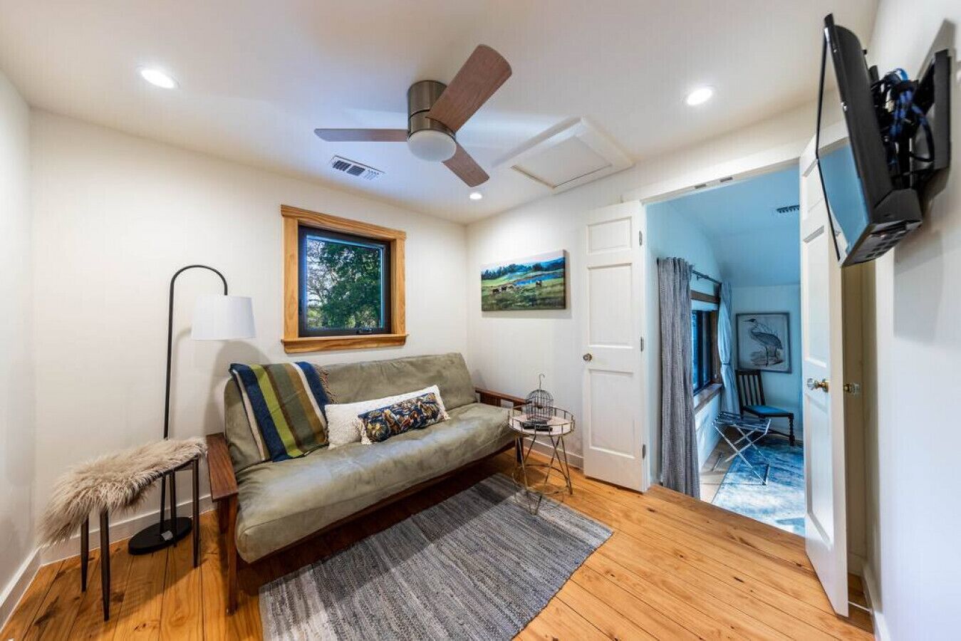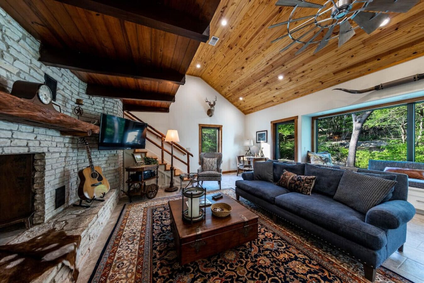River Run - Luxurious Adults Only Riverfront Oasis River Run is nestled on 2 private acres with direct views and access to the Blanco River in the backyard. The home has been thoughtfully remodeled from top to bottom with luxurious finishes and decor as an adults only oasis. Enjoy a short half-mile walk into downtown Wimberley where you can spend your afternoon exploring shops and restaurants or take some time to relax and sample some wine while listening to live music.When you enter this split level home you will head down a few stairs to enter an open layout which encompasses the great room, dining, and kitchen spaces. The bedrooms and bathrooms are located on the top floor. The first room offers two double beds, a flat screen TV and large picture windows surrounded by nature. Right down the hall is a half bathroom followed by a full bathroom and the master suite. The master suite is equipped with a king size bed, flat screen TV, and large picture windows facing the Blanco River. There is a bonus seating area with futon off the master bedroom. All bedrooms have both pulldown shades and curtains and closets. This property has several outdoor seating areas both covered and uncovered. Directly outside of the kitchen is a covered patio seating area with ceiling fan and surrounded by cafe lights. The whole house sound system extends to the covered patio. From the patio you can head down the property to an open air seating platform over looking the river. Both the covered patio and open air space are excellent places to observe the local deer feeding (deer feed provided). If you continue towards the river from the open air seating area you'll come across the properties large fire pit, the perfect gathering place to relax and watch the river go by. A short walk from the fireplace are two sets of stairs with two separate easy access points into the river.Guests have full access to the entire property.Please do not hesitate contact us directly at 833-STAY-HCC (782-9422) if you need anything during your stay. We are available 24/7.This property is the best of both worlds as it offers both a private verdant sanctuary and a location that can't be beat. You'll have plenty of room to breath on this two acre oasis with your own exclusive Blanco River access. Or, if you want to explore, the shops, restaurants, and tasting rooms of downtown Wimberley you're just a few minutes away by foot and even less by auto.You can take a short walk or drive to the nearby Wimberley town square. In the teen square you will find many shops and restaurants. You will need transportation if you choose to venture outside of the town square to one of the many wineries/breweries. Uber and Lyft are not generally available in the area but we can help you coordinate a limo van or other transportation for a day outing with enough advanced notice. If you are interested in transportation services please contact us directly and with as much notice as possible to help us accommodate your request.All guests will be required to provide a valid credit card to be placed on file during their stay. In lieu of charging a damage deposit, a temporary hold will be placed on a credit card in the amount of $250 upon arrival for incidentals. This hold will automatically be released 7 days after your departure unless damages, excessive cleaning, or a violation of the house rules are discovered upon inspection. Please note once we release the hold, it is dependent upon your financial institution upon your financial institution regarding how long it takes for for the release of funds to process. If you choose to provide a debit card for this hold, please make sure you plan accordingly.Guest manual located on top of desk downstairs.House is not suitable for children. No animals or day guests (visitors).