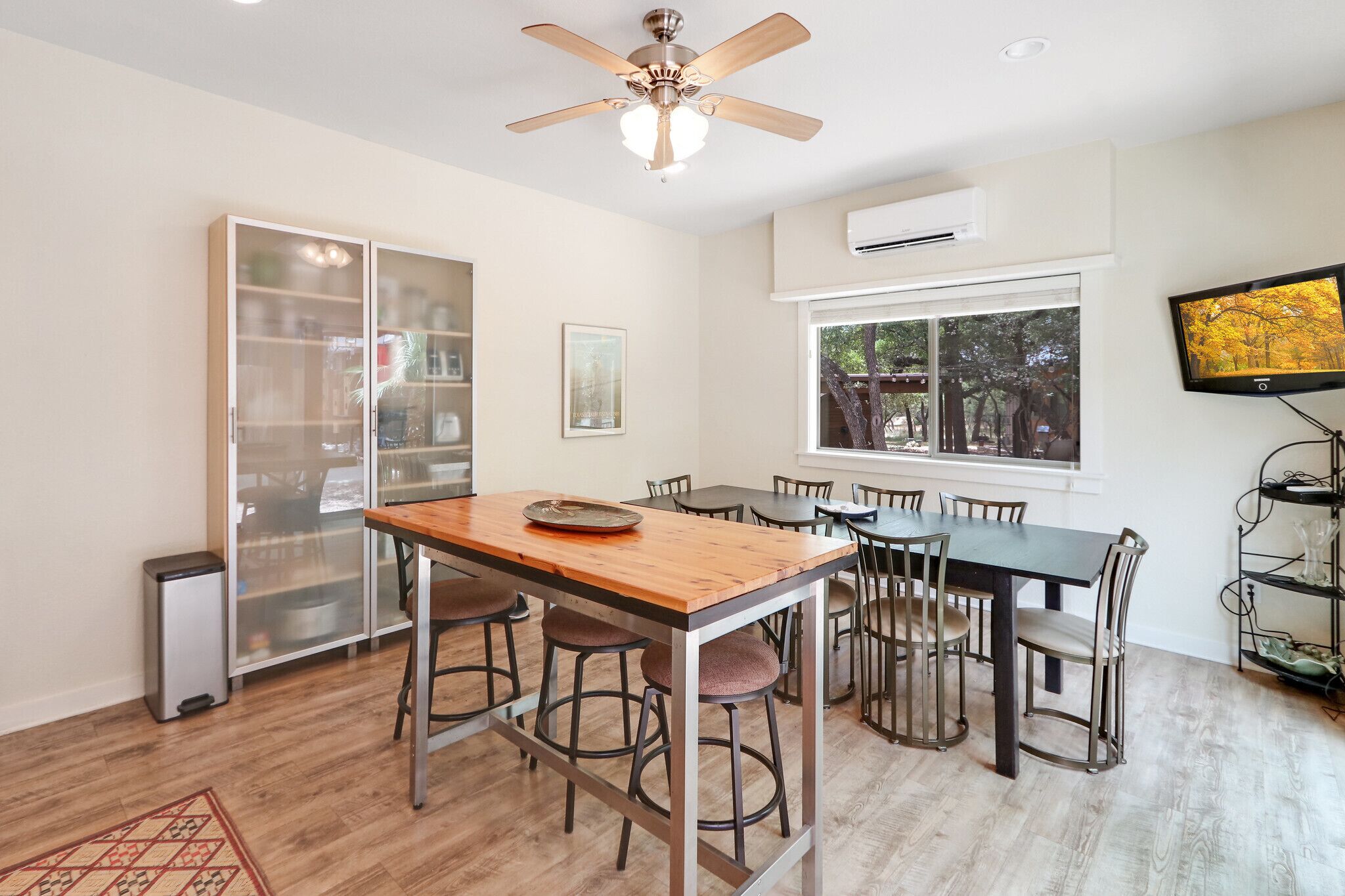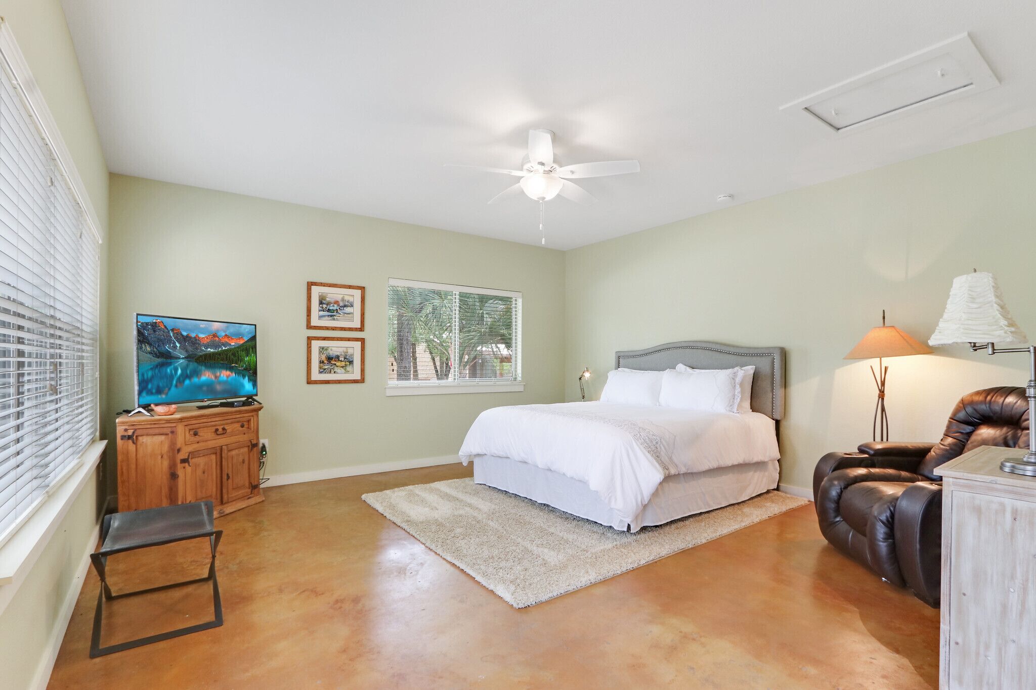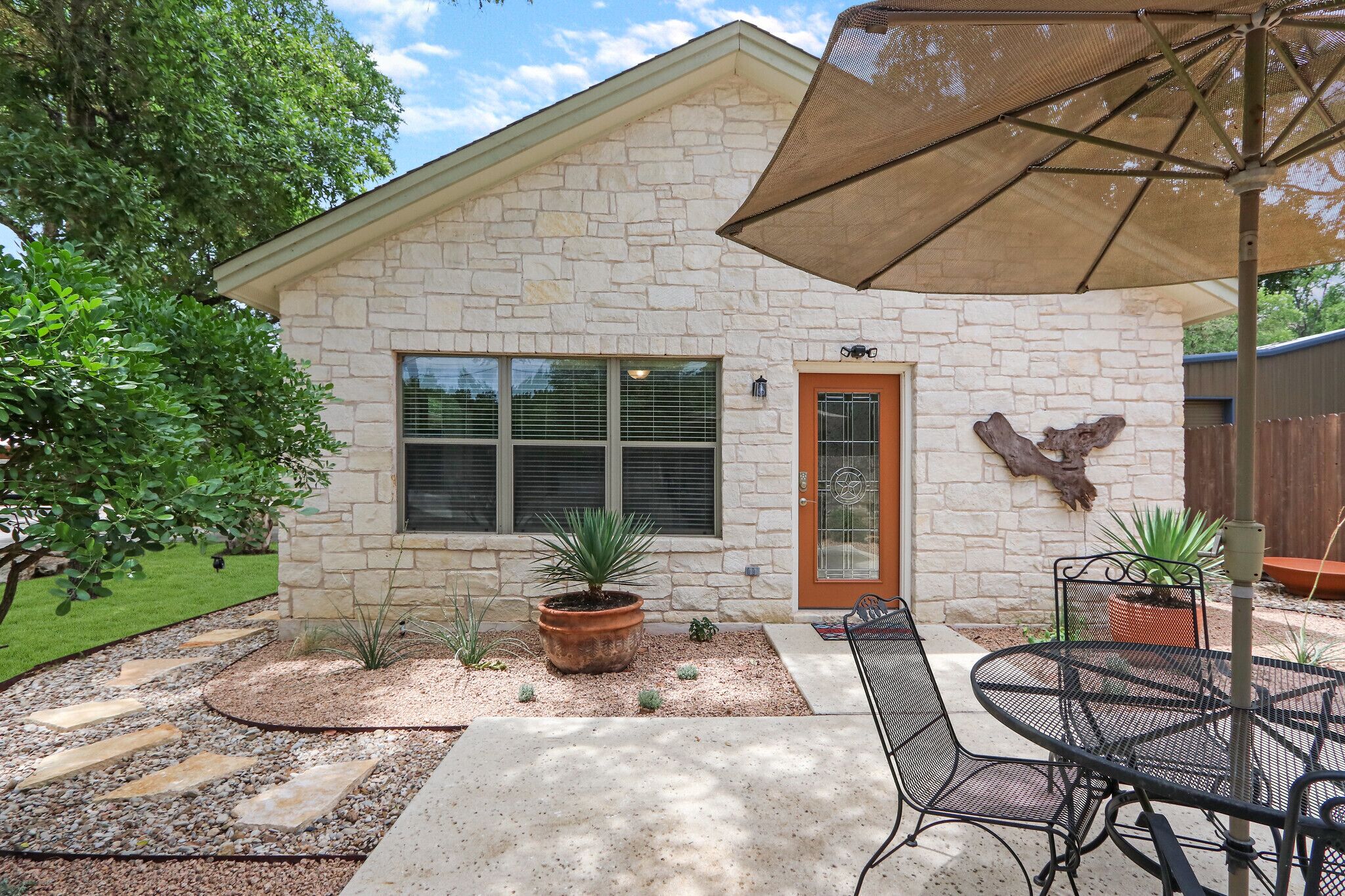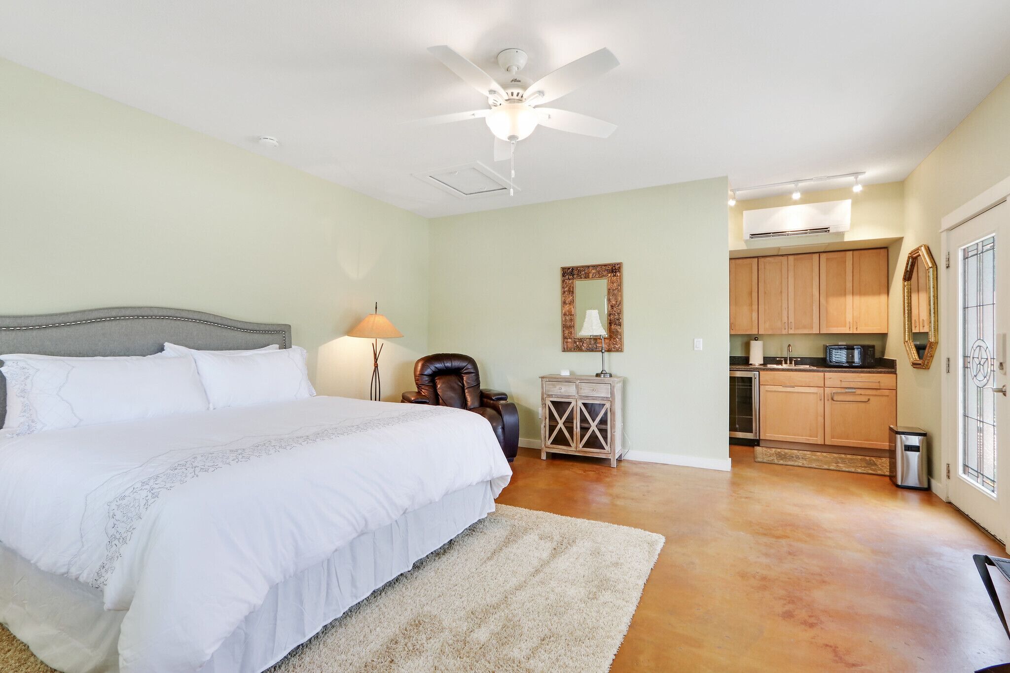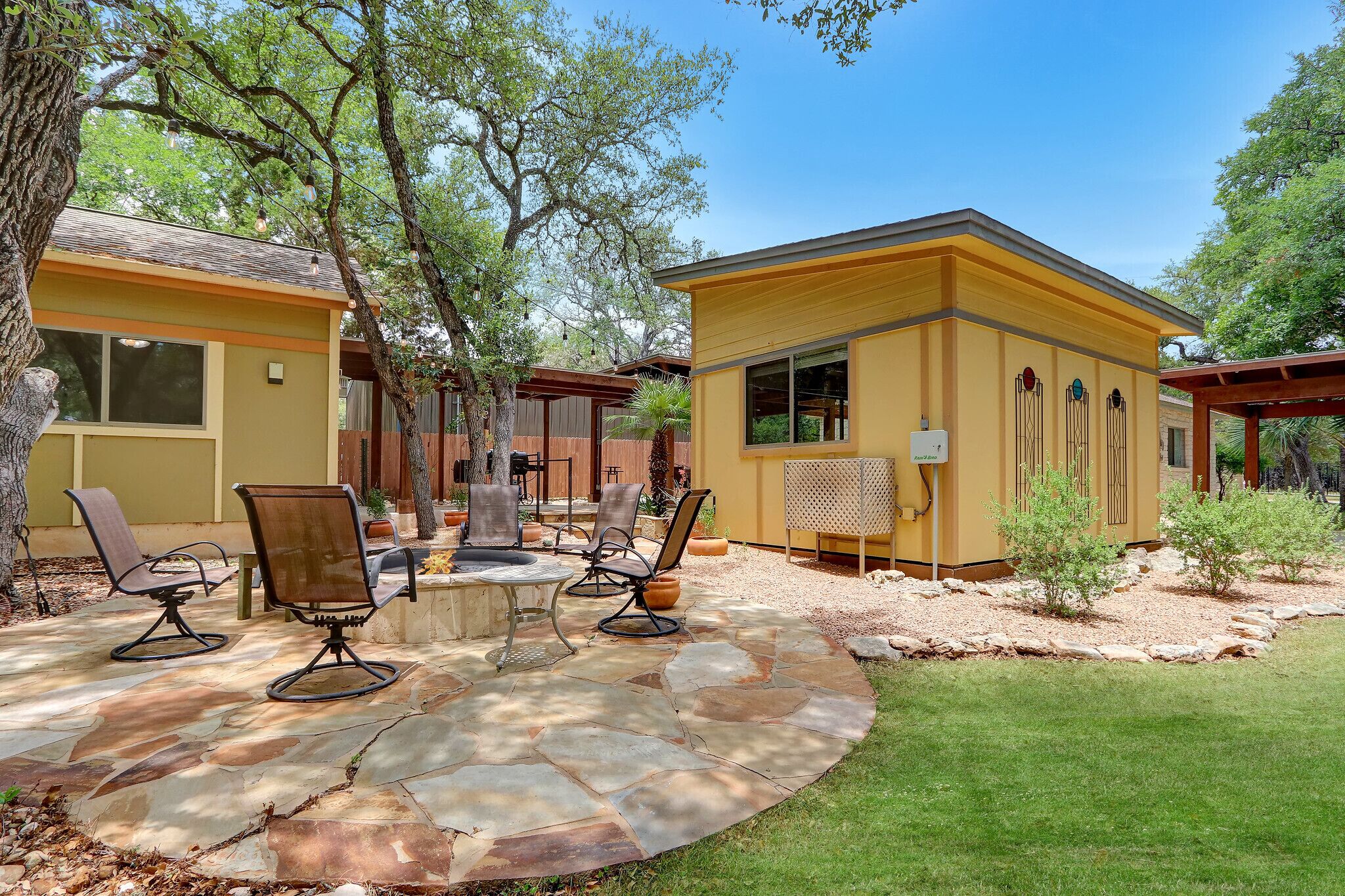 Three Sisters- Casita 1 I Pet Friendly couples retreat in Wimberley Arrive at this hidden little retreat that hosts Three Sister Casitas each sleeping up to two guests. Three Sisters (Trois Soeurs) Casitas are conveniently located in downtown Wimberley within walking distance to the well-known Market Days. This darling one room casita offers a master bedroom with a kitchenette, a luxurious king-sized bed, and a flatscreen TV. Guests have shared access to a fully stocked Communal kitchen, 3 putting greens, a large fire pit, grill, and so much more. For larger parties Sisters Two & Sister Three are also available. * An added bonus: Furry friends are welcome for an additional fee. Sister One, located in the front of the property greets guests with a limestone rock exterior mixing perfectly with the lush grassy yard, rock-filled landscaping, and a private patio with dining area perfect for enjoying a glass of wine or a romantic meal for two. Step inside to a romantic suite perfect for just two. Find clean lines and an open floor plan, making for a comfortable and spacious space . Sleep soundly on a roomy a king- bed with soft comfortable linens, enjoy a movie or a favorite sports team on the flatscreen TV. Freshen up after a day of shopping for a night on the town in the roomy bathroom featuring a walk-in shower with plenty of storage and counter space for two. Store drinks or leftovers in the kitchenette that includes a minifridge, microwave, and Keurig coffee pot perfect for enjoying your morning cup of coffee and a quick breakfast. For those chefs, a Communal kitchen is available. Find a shared kitchen space between casita two and three that is nothing short of spacious and well stocked! Featuring a full range stainless steel oven, microwave, refrigerator, and dishwasher, as well as a storage closet containing all necessary utensils, the kitchen is stocked to prepare your favorite meals! Relax at the nearby indoor dining tables, enjoying refreshments and conversations with accompanying guests, or feast while watching movies at the wall mounted flatscreen TV placed in the room.The outdoor space at the Casitas is unmatched! Relax around the communal fire pit, which offers plenty of seating perfect for roasting s’mores, or late-night conversations under the stars. The golf green offers tee boxes at 25, 50, 75, and 100 yards perfect for a friendly competition with friends or family while taking in the lovely hill country views! After hitting a few balls kick back with a cool beverage at the covered seating area just off the green with a fireplace, and seating.With Wimberley just out your back door visit the delicious restaurants as well as the charming shops in the downtown square. Enjoy swimming or hiking at the famous Jacobs Well, Rappelling at Zipline Adventures, or a day of water fun at Blue hole Regional Park. Looking for an outing for the day? Take a drive to Canyon Lake and rent a boat or jet skis for a fun afternoon on the water. Check out the music calendar at Whitewater Amphitheater and rock out at a concert! Explore New Braunfels and Gruene and enjoy fabulous restaurants and live music. A day of tubing, kayaking, and rafting on the Guadalupe River is always fun. Families and children will especially love Schlitterbahn Water Park and Landa Park. Visit the over 240 shops at the San Marcos Outlet for an endless day of shopping.**The health and safety of our guests is paramount. Cleanliness is always our top priority. We offer a 24-hour guest service contact number for emergencies and messages will be answered promptly. Arrive after 4:00 pm when it is convenient for you for an easy and contactless check-in.Please note – Rates are based on the number of guests entered in the reservation quote – any additional guests may incur additional charges. The occupancy listed is the max occupancy this property can accommodate.A maximum of 2 dogs weighing 25 pounds or less are allowed at pet friendly properties. Please confirm the property you are interested in is designated as pet friendly prior to booking if you plan to bring your dog(s). Please note that a $25 per pet per night fee will be added to your reservation if you choose to bring your furry friend.