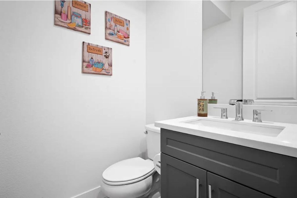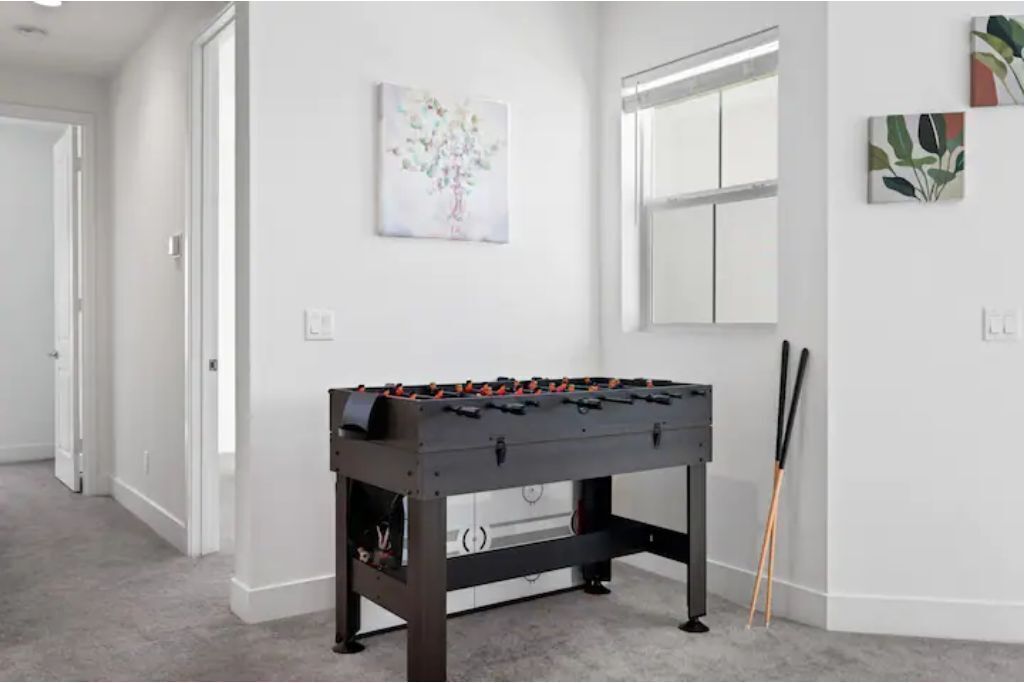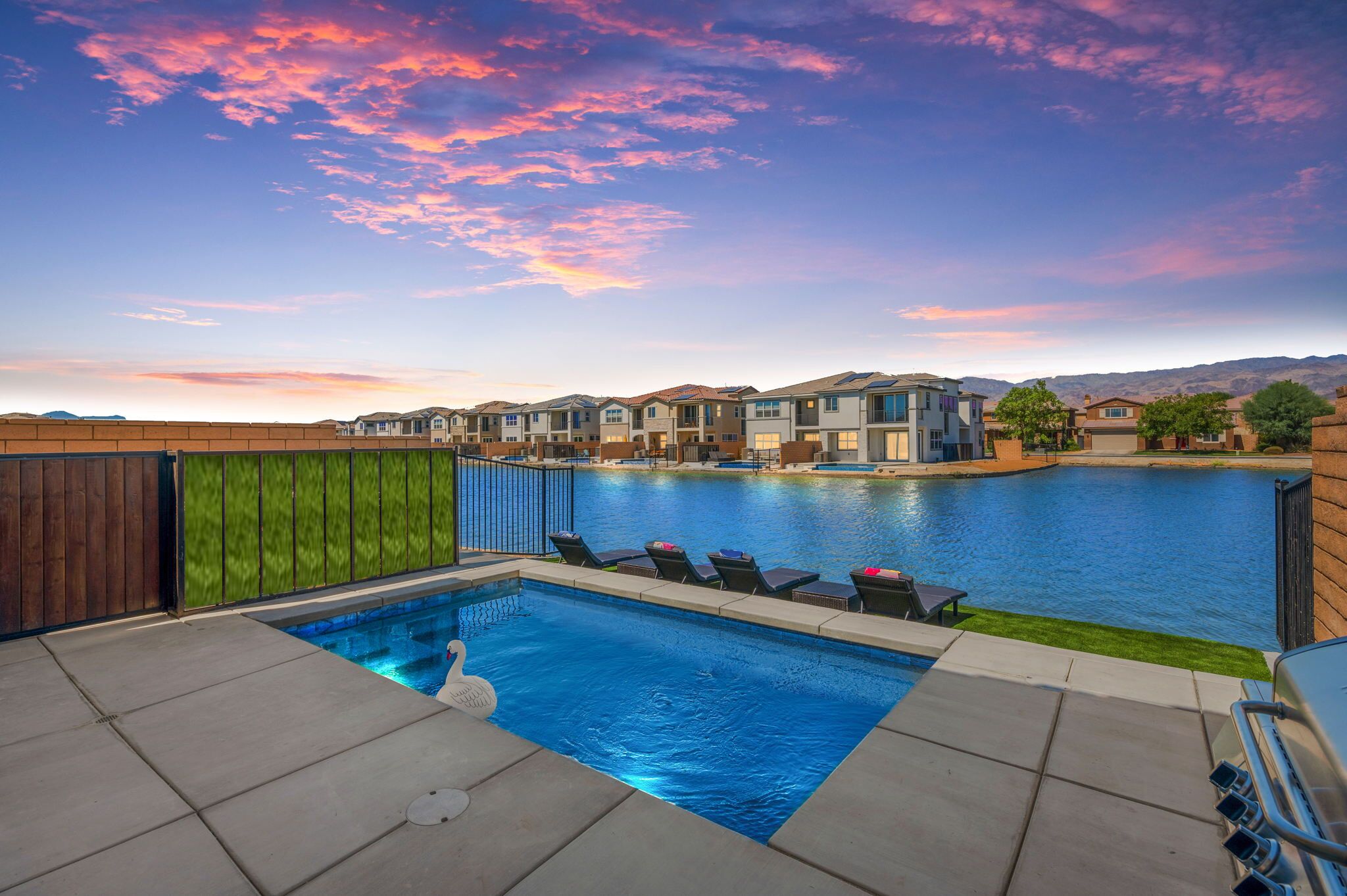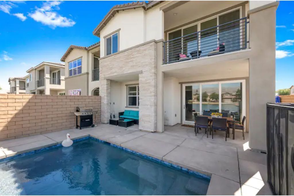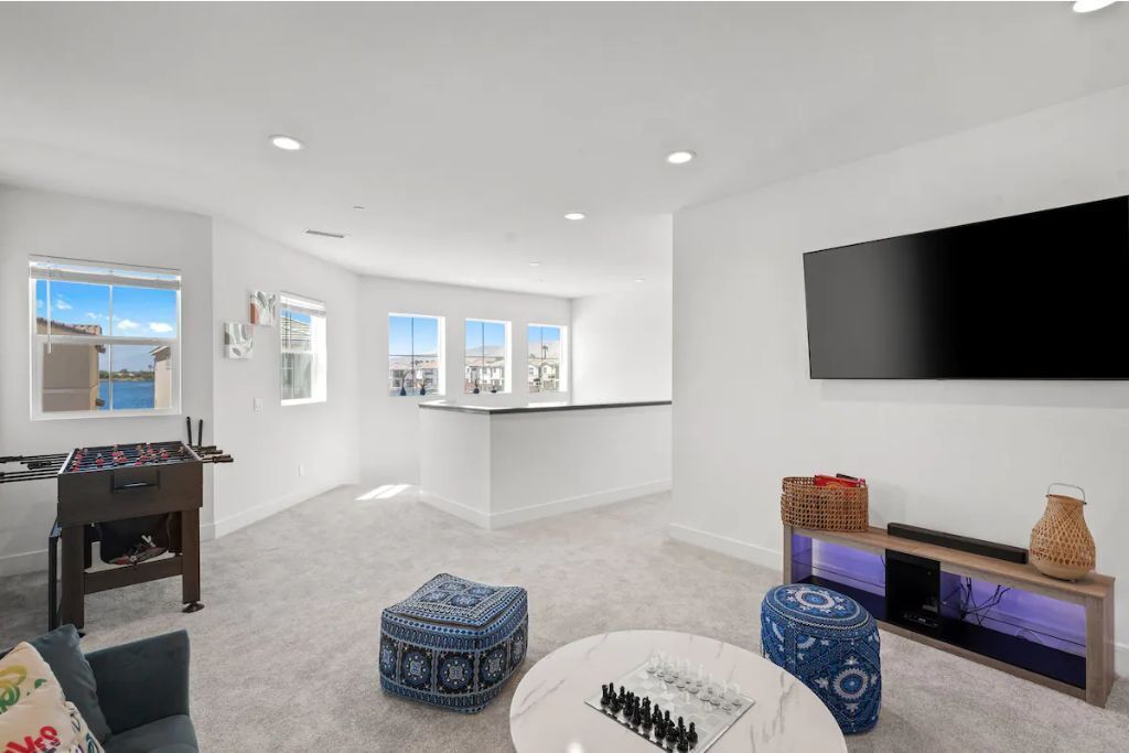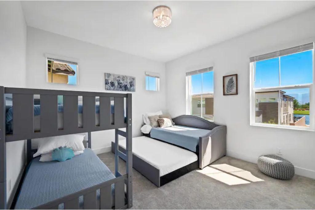 Lakefront Luxury Villa 4 bedroom+loft with Pool Newly built luxury lake house in a peaceful gated community. This elegant two story home features 4 bedrooms+loft, 4.5 bathrooms, a game room, a large chef's kitchen, a specious living and dining area. The house truly defines peace and serenity where you can unwind and enjoy your time with your loved ones. It is decorated tastefully with an edgy/modern, comfortable feel. Soak in the lake views and the breathtaking sunsets in the cozy backyard with heated pool(w/spa jets) and outdoor dining.The spaceEach bedroom has a separate bathroom with a shower or a tub. One bedroom, with a queen bed, is located in the first level accessible for guests who have difficulty going up the stairs. The large sofa in the living room also provides a comfortable sleeping arrangement. On the second level we have the master bedroom with a king bed, large bathroom with a tub, a walk in closet and a large patio with breathtaking lake views where you can enjoy your morning coffee or the sunset views. Two other bedrooms are located on the second level, one with a queen bed + floor mattress and the second one is a lakeview room with a bunkbed and a twin 2 level trundle daybed. Lastly, the loft is used as a game room where you will find pool table, table tennis, darts, etc. This room also features a sofa bed which can accommodate sleeping arrangements for 1-2 children.License number31955