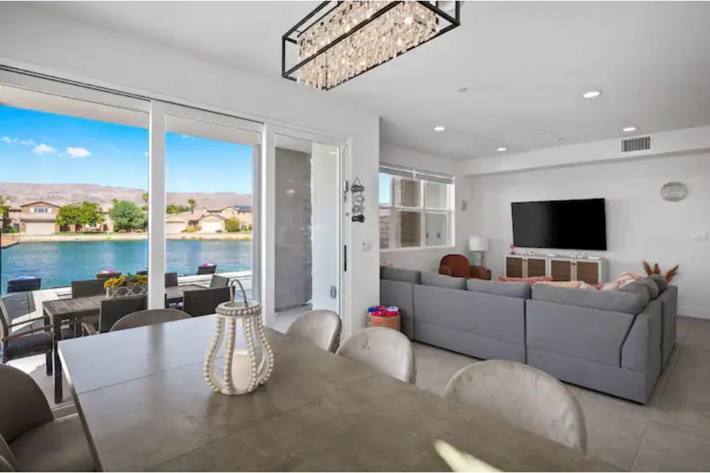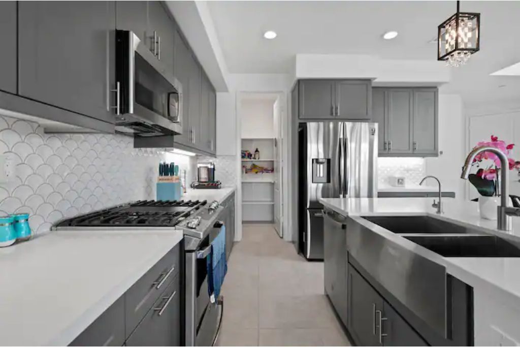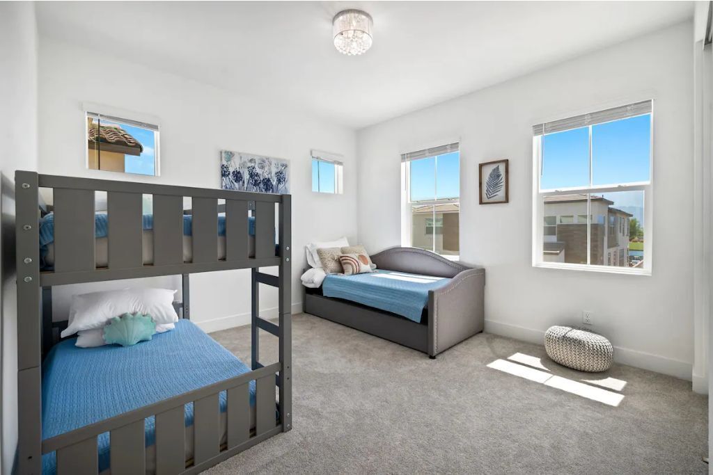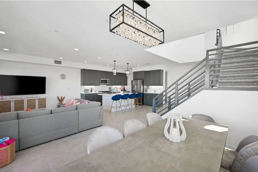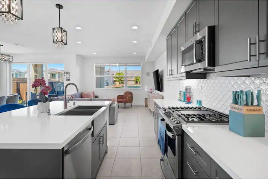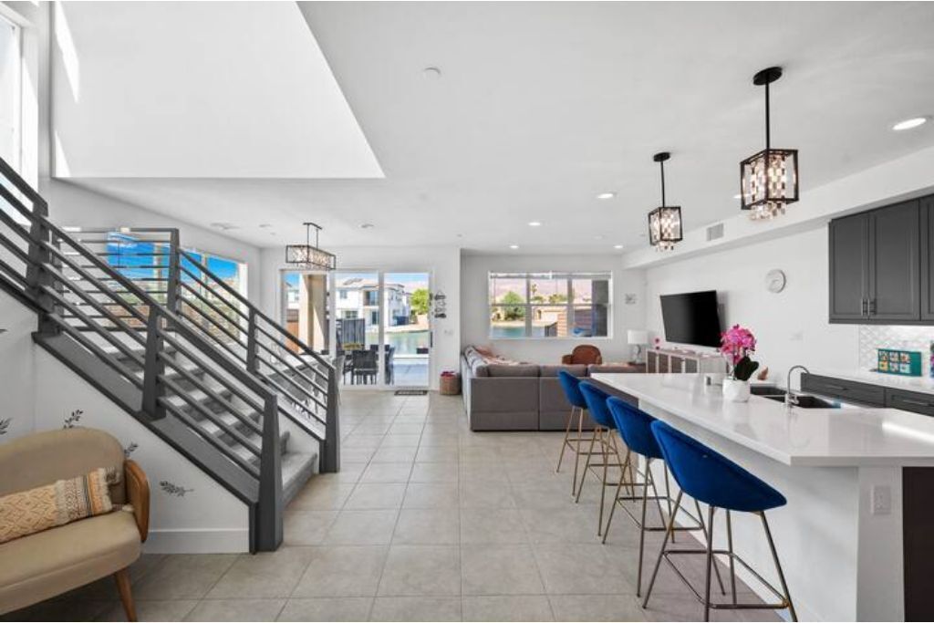 Lakefront Luxury Villa 4 bedroom+loft with Pool Newly built luxury lake house in a peaceful gated community. This elegant two story home features 4 bedrooms+loft, 4.5 bathrooms, a game room, a large chef's kitchen, a specious living and dining area. The house truly defines peace and serenity where you can unwind and enjoy your time with your loved ones. It is decorated tastefully with an edgy/modern, comfortable feel. Soak in the lake views and the breathtaking sunsets in the cozy backyard with heated pool(w/spa jets) and outdoor dining.The spaceEach bedroom has a separate bathroom with a shower or a tub. One bedroom, with a queen bed, is located in the first level accessible for guests who have difficulty going up the stairs. The large sofa in the living room also provides a comfortable sleeping arrangement. On the second level we have the master bedroom with a king bed, large bathroom with a tub, a walk in closet and a large patio with breathtaking lake views where you can enjoy your morning coffee or the sunset views. Two other bedrooms are located on the second level, one with a queen bed + floor mattress and the second one is a lakeview room with a bunkbed and a twin 2 level trundle daybed. Lastly, the loft is used as a game room where you will find pool table, table tennis, darts, etc. This room also features a sofa bed which can accommodate sleeping arrangements for 1-2 children.License number31955